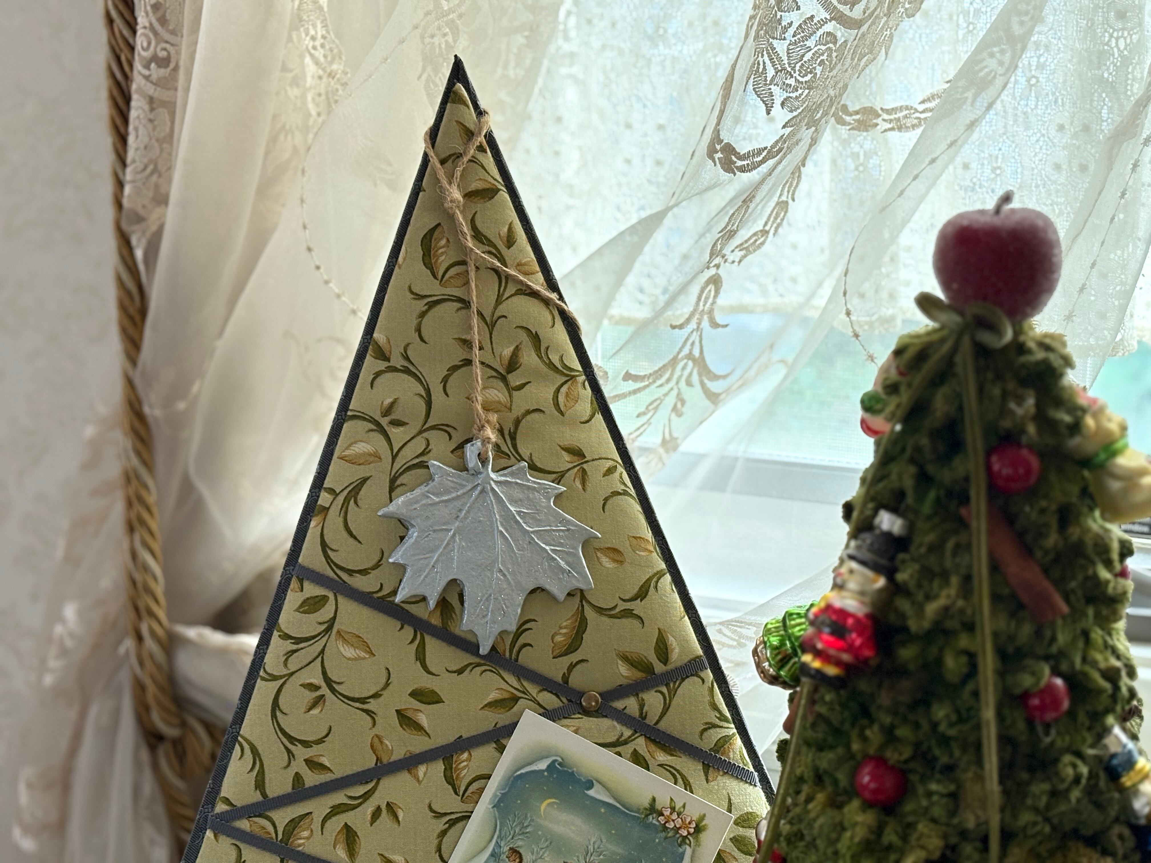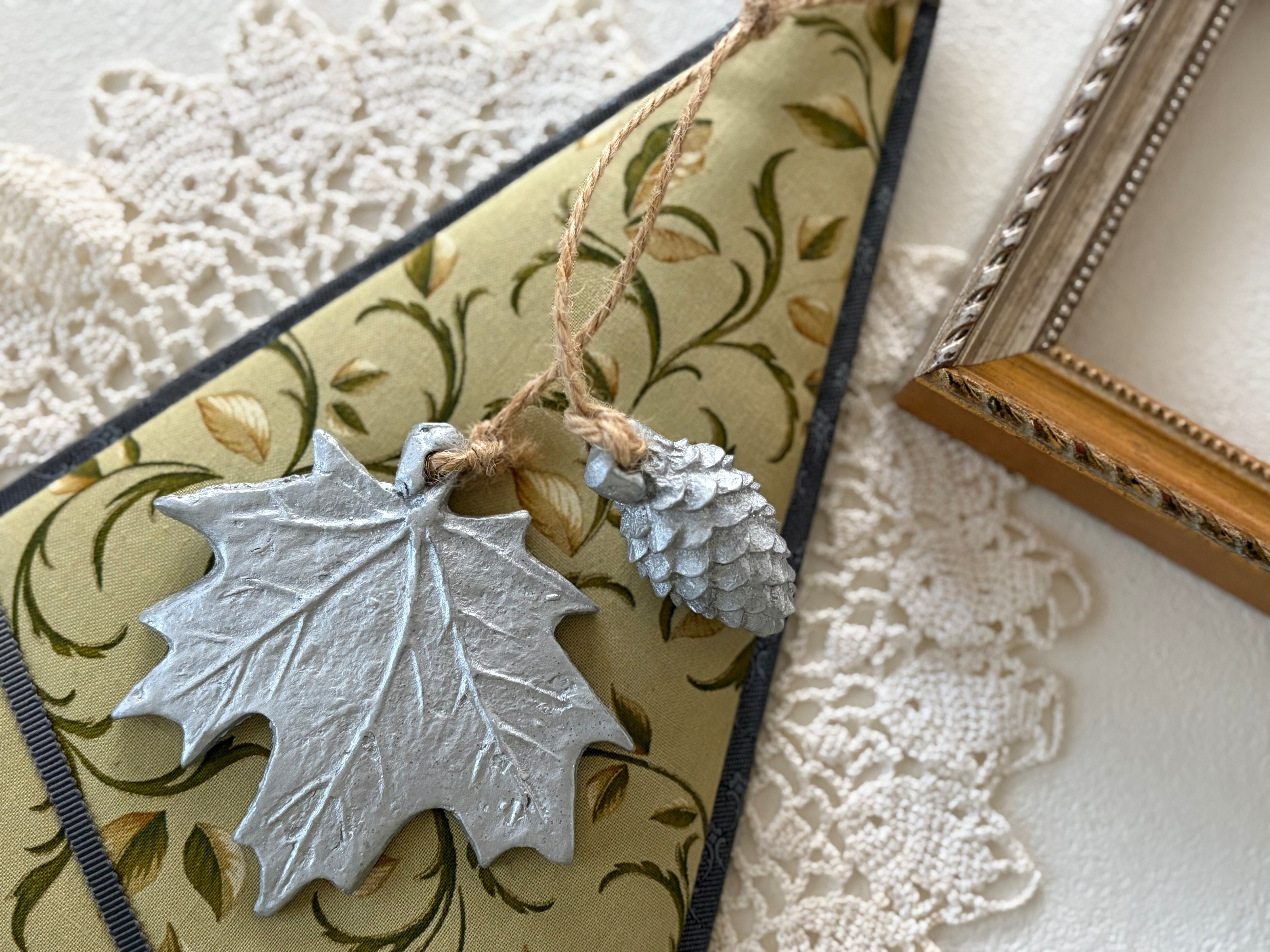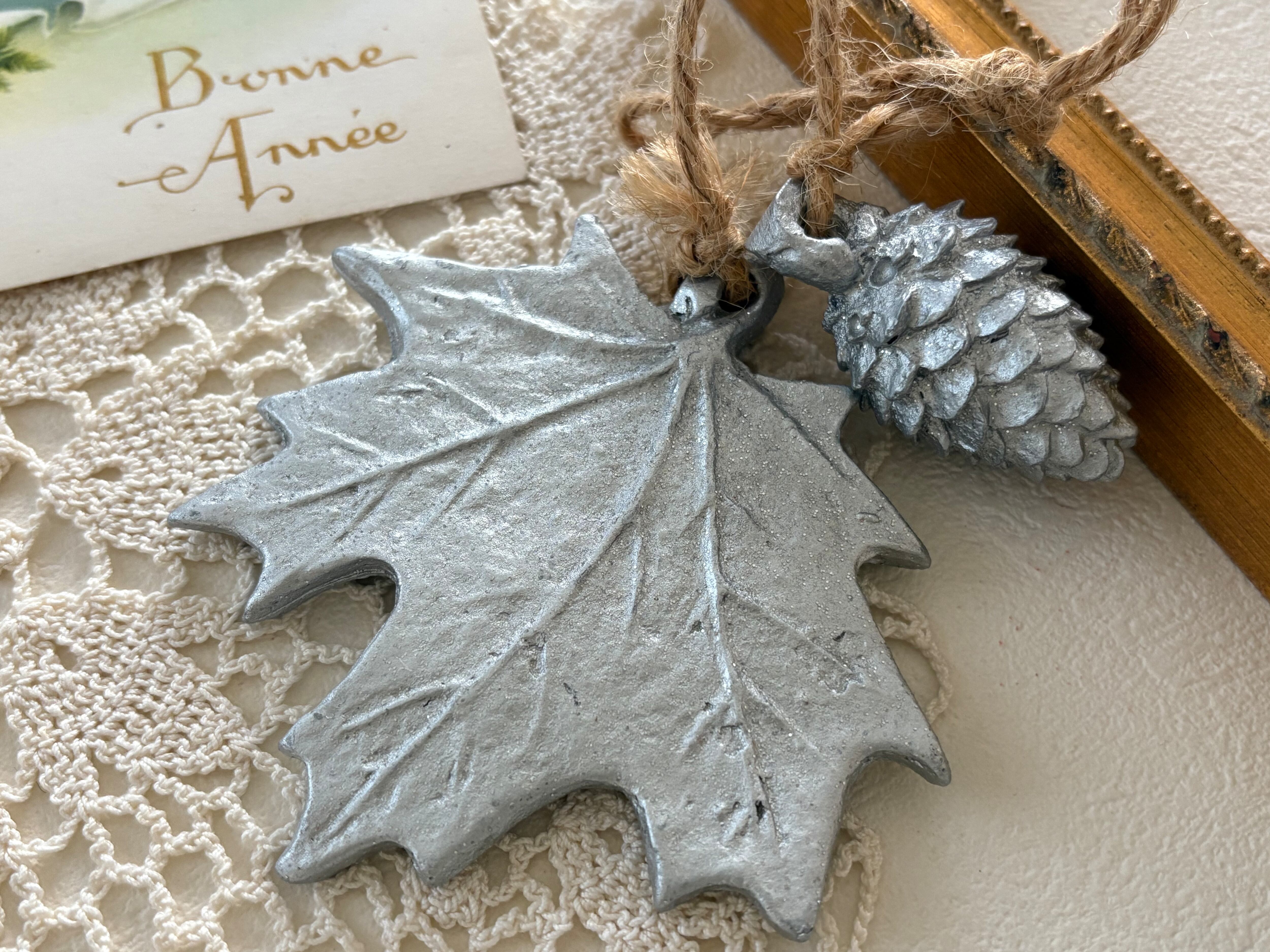 シルバーカラーのリーフと松ぼっくりのクリスマスオーナメントになります。