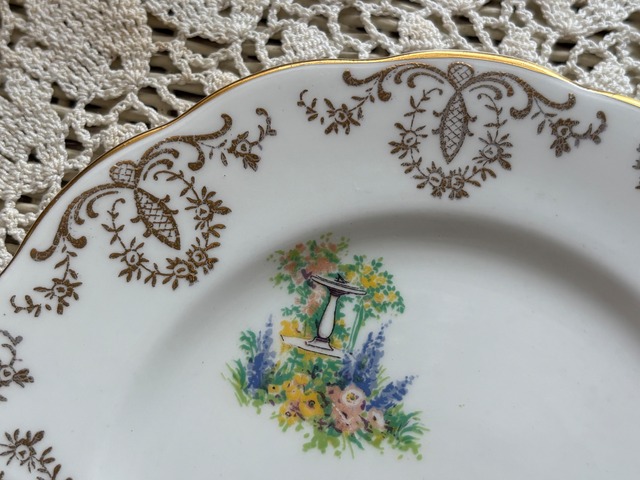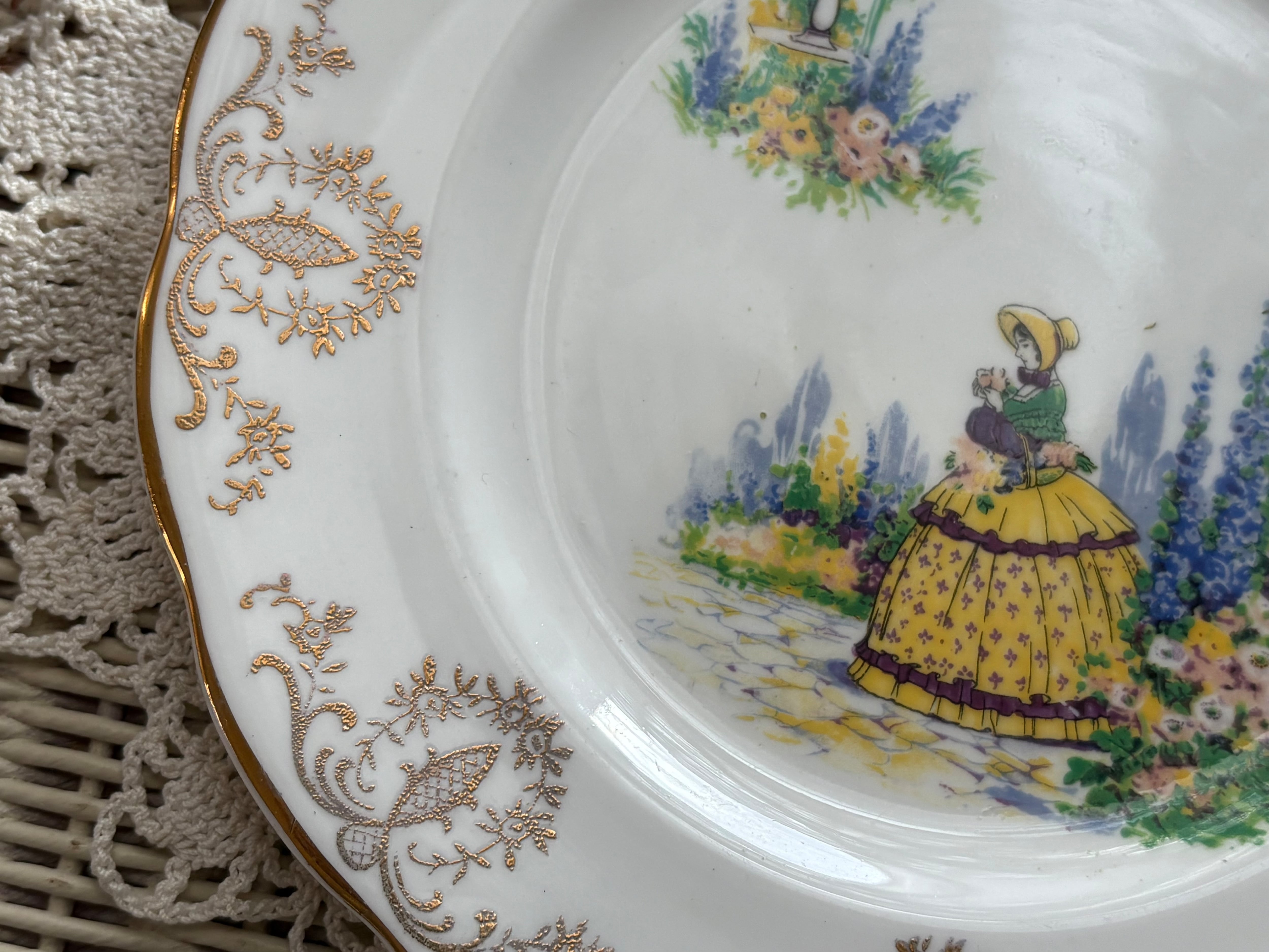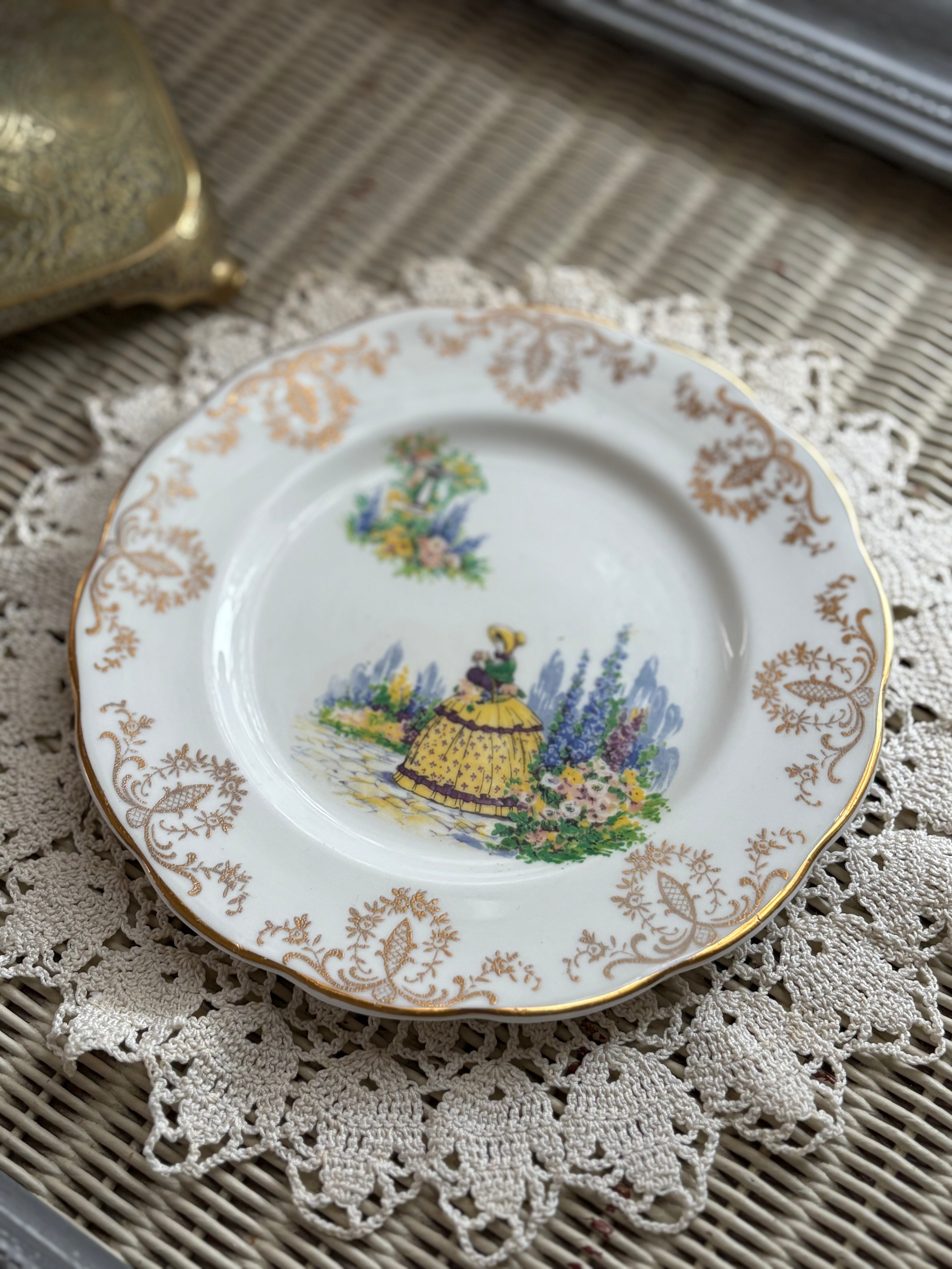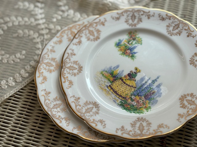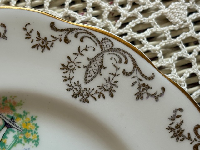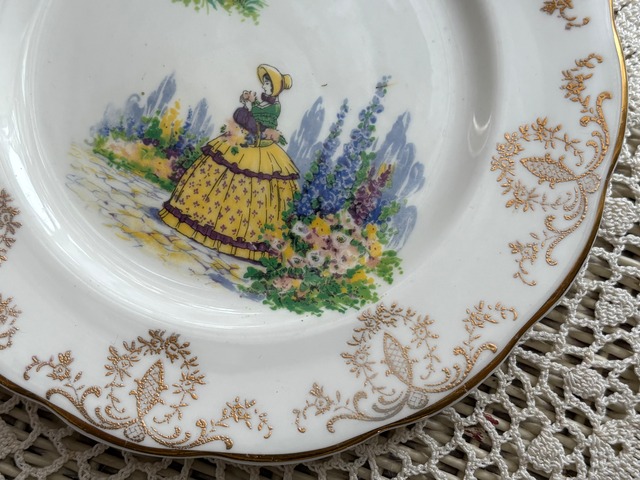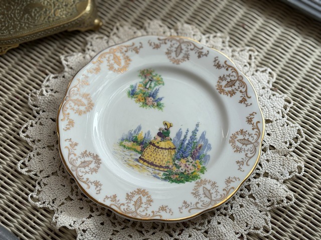 英国Vintage Pall Mall Ware ポール・モール ウェア クリノリンレディ ケーキプレート ② 金彩 貴婦人 お庭 テーブルウェア