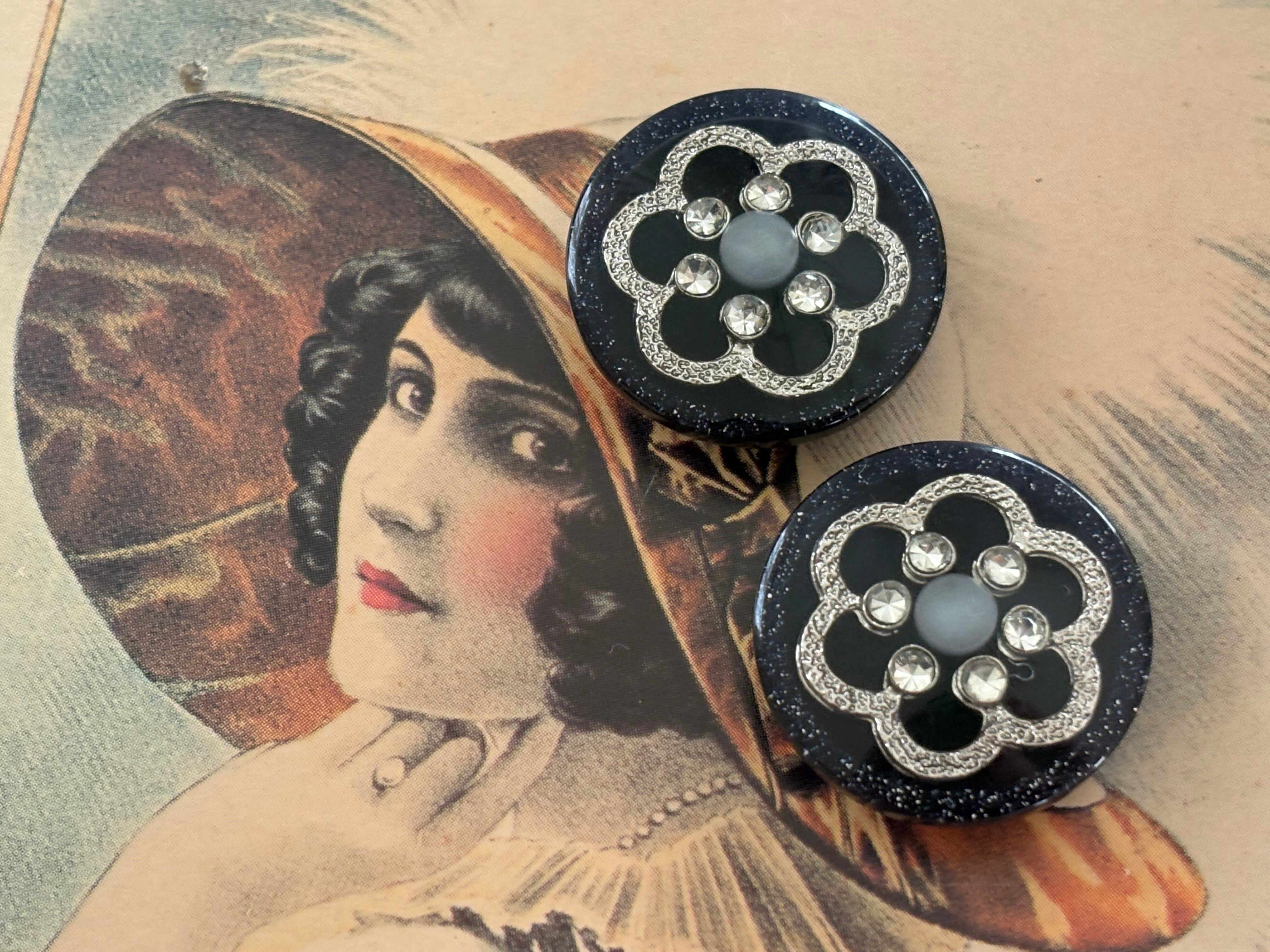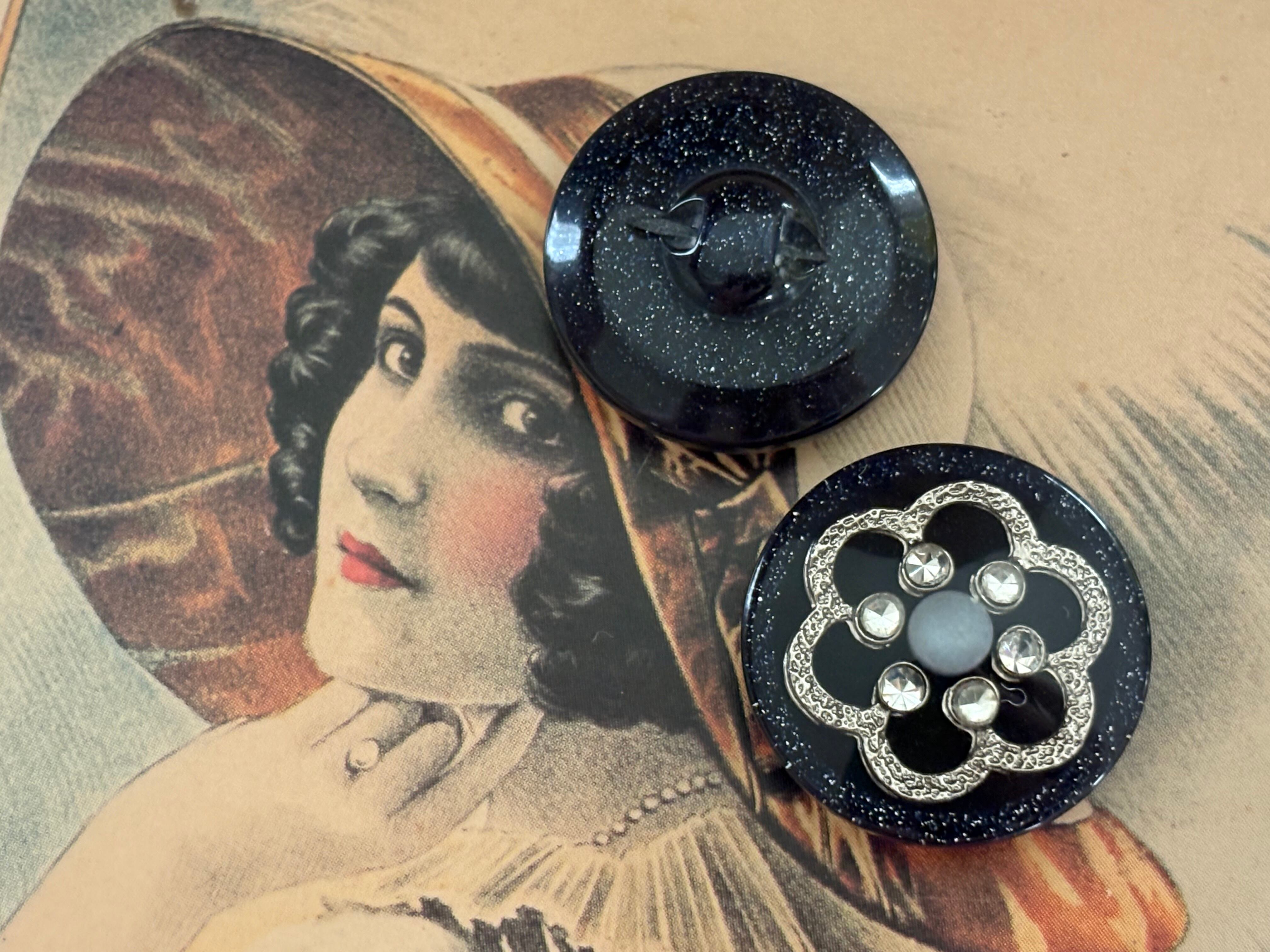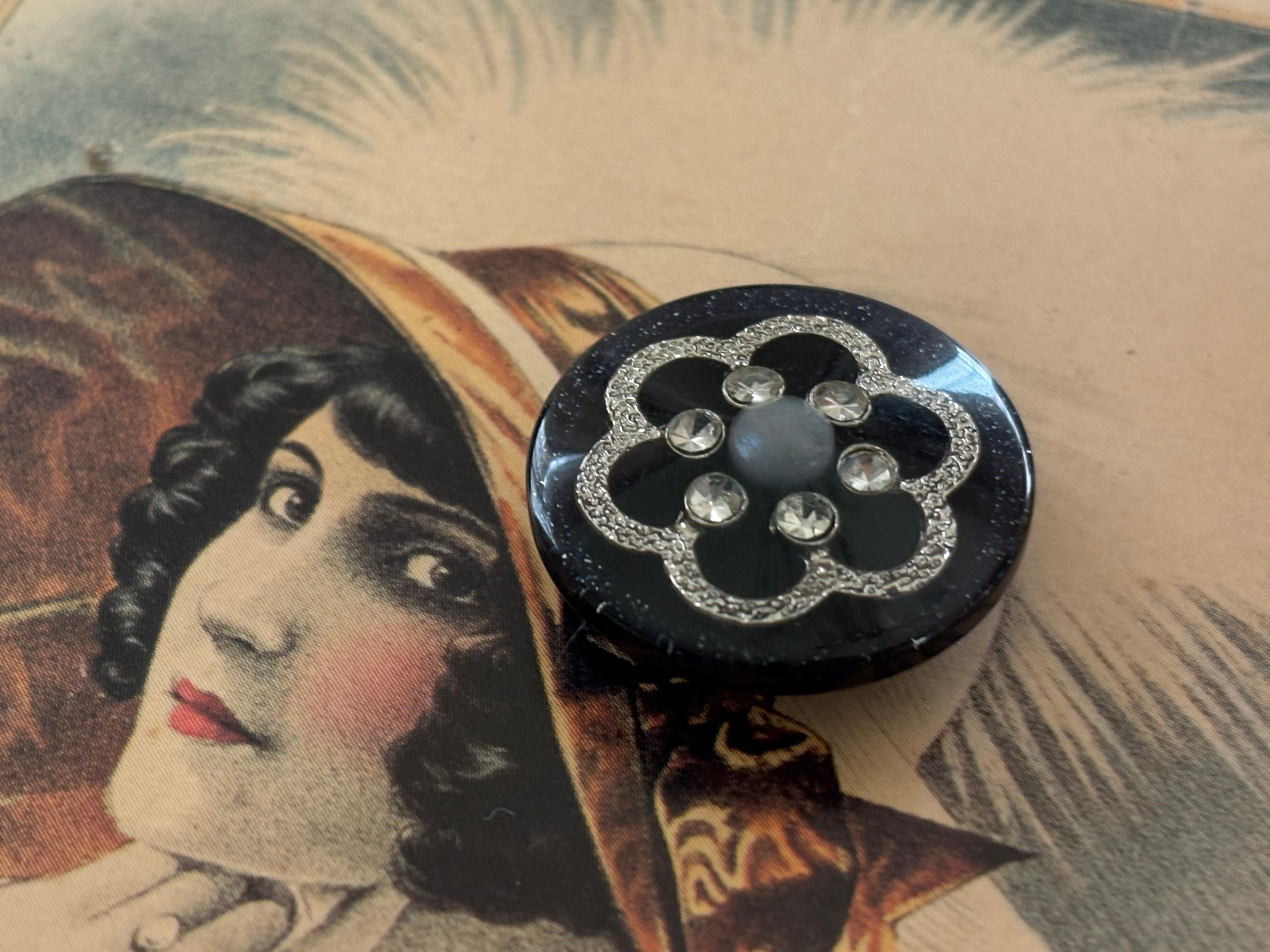 Japanese Vintage ボタン ブラック×シルバー 22mm フラワー グリッター ストーン レトロ アクセサリーパーツ 装飾材 カルトナージュ