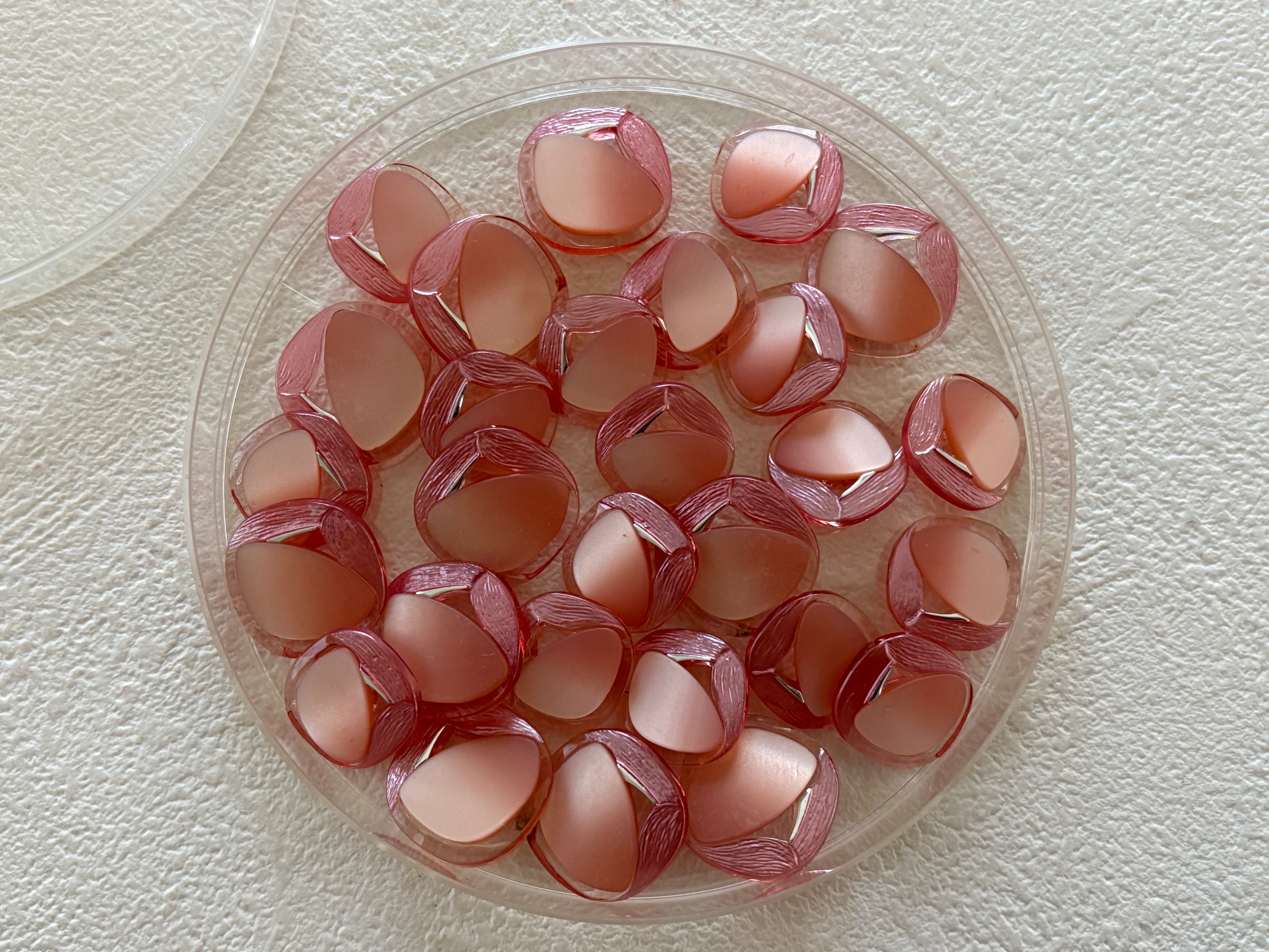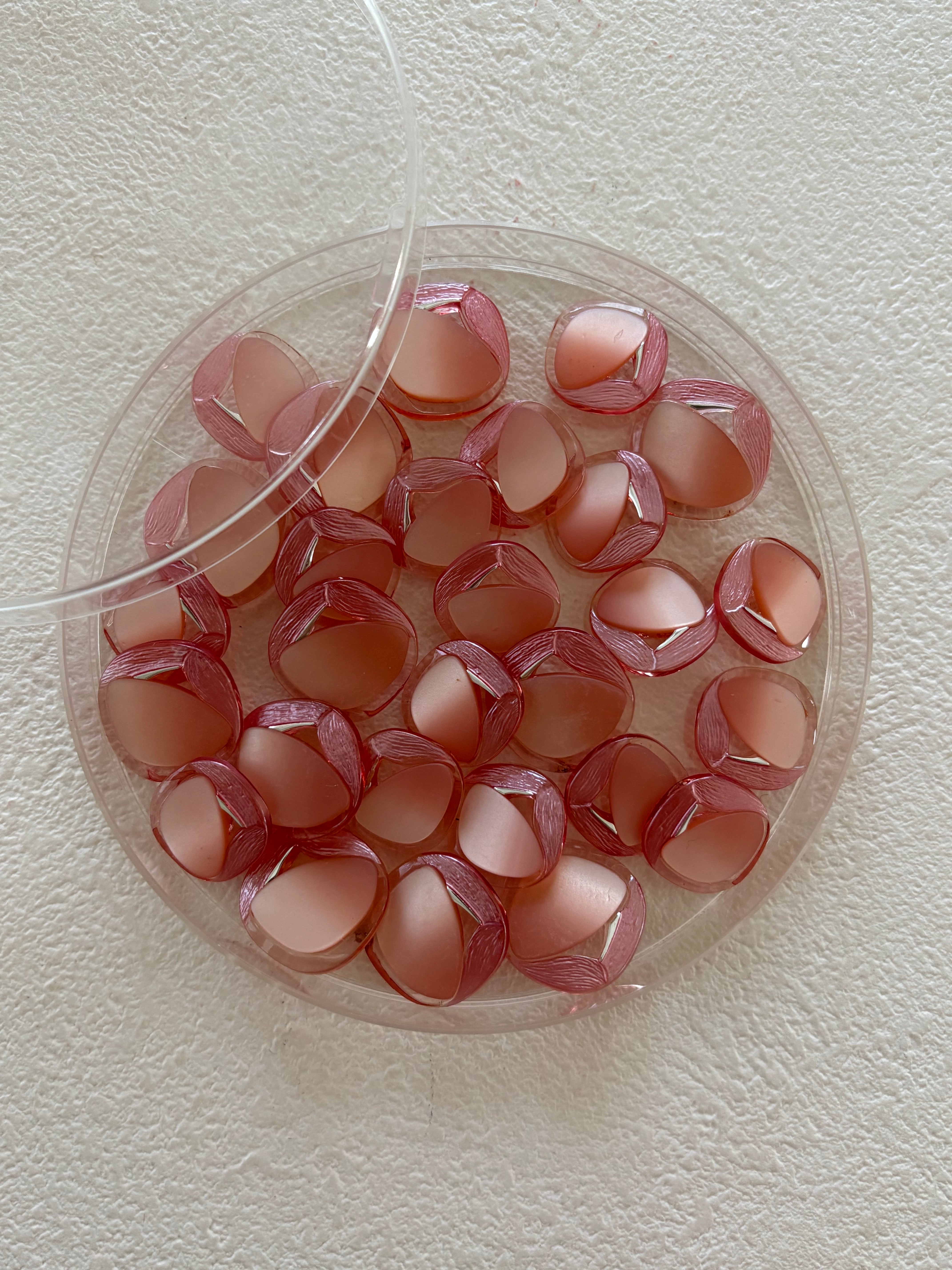 ピンクのクリアカラー、メタリックピンクの塗装がほど押された台座にマットなピンク色のカボション、