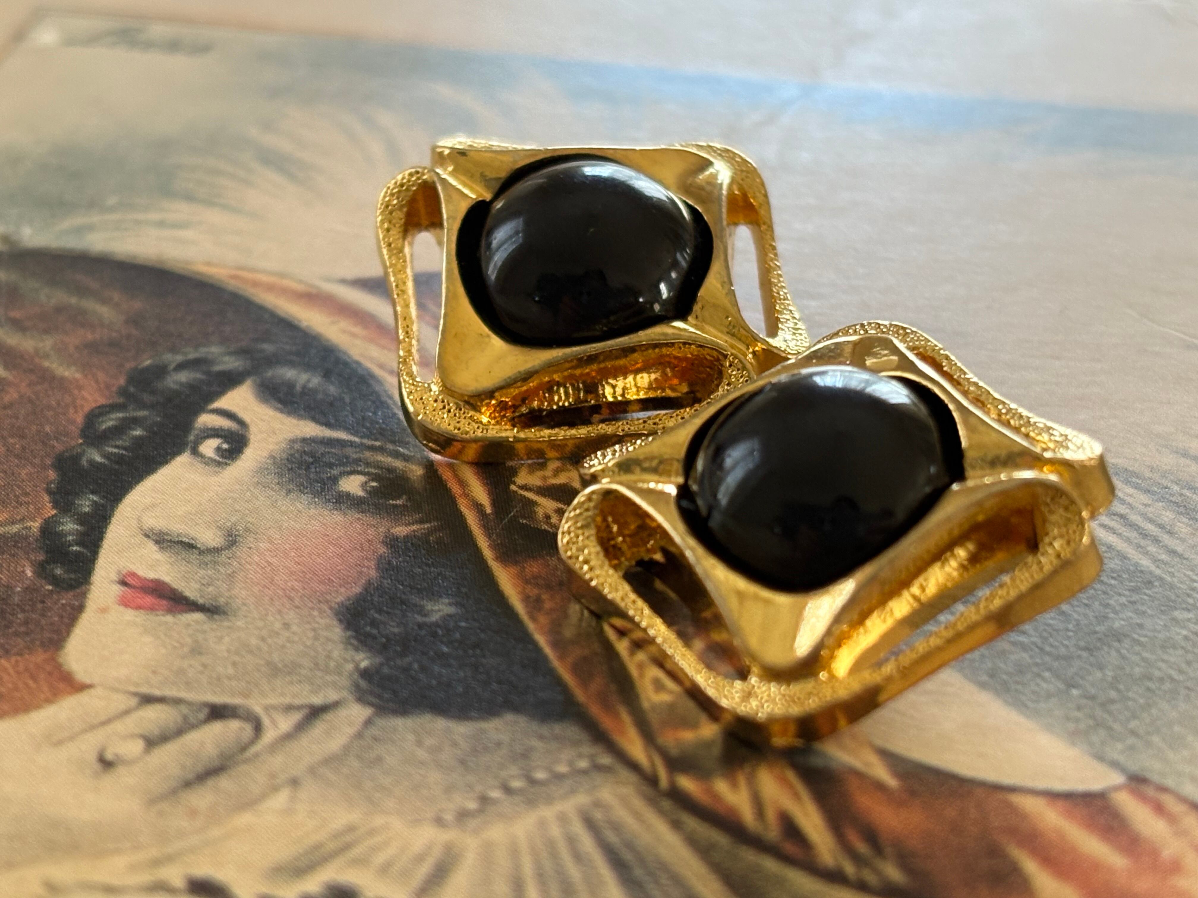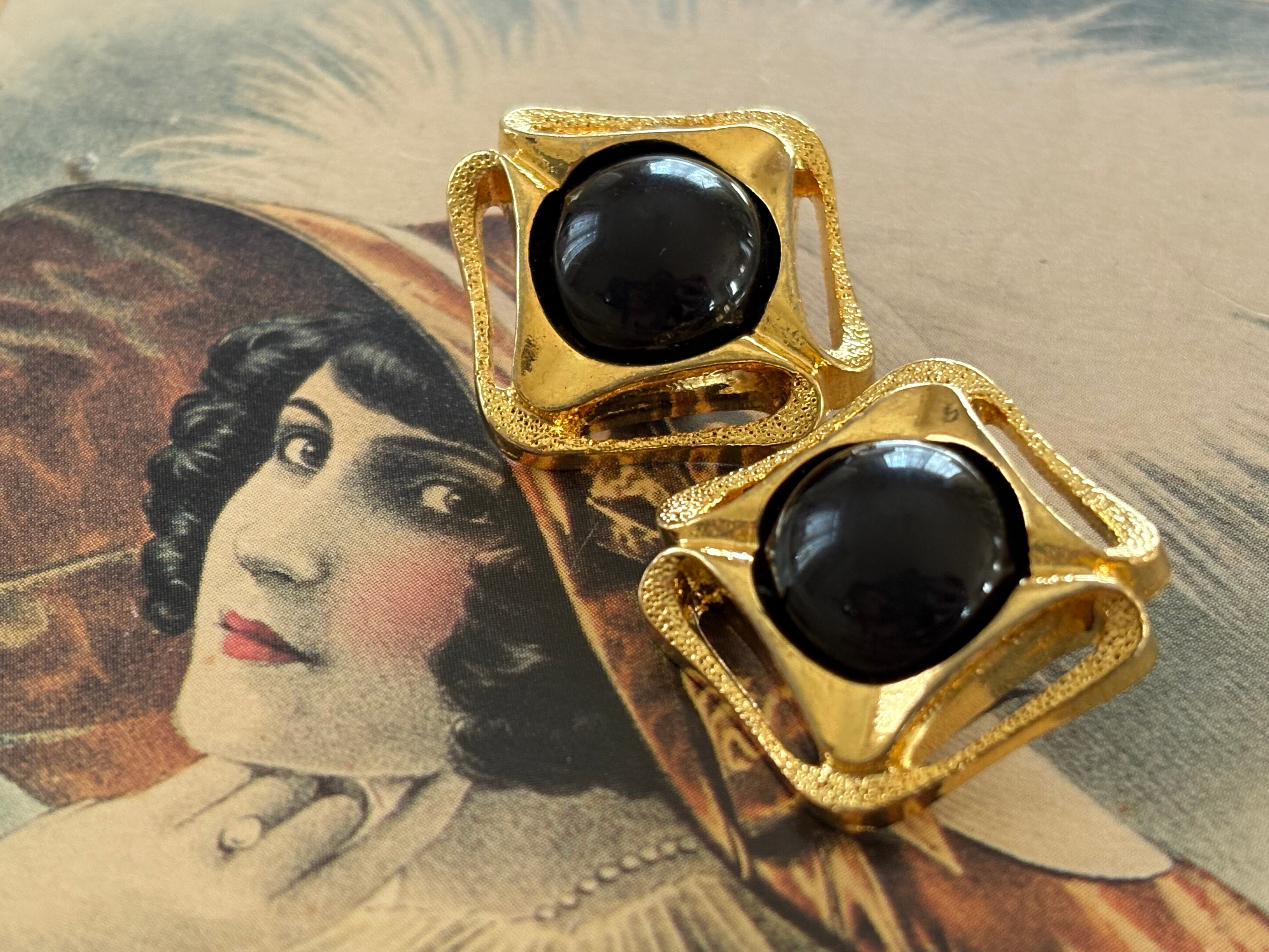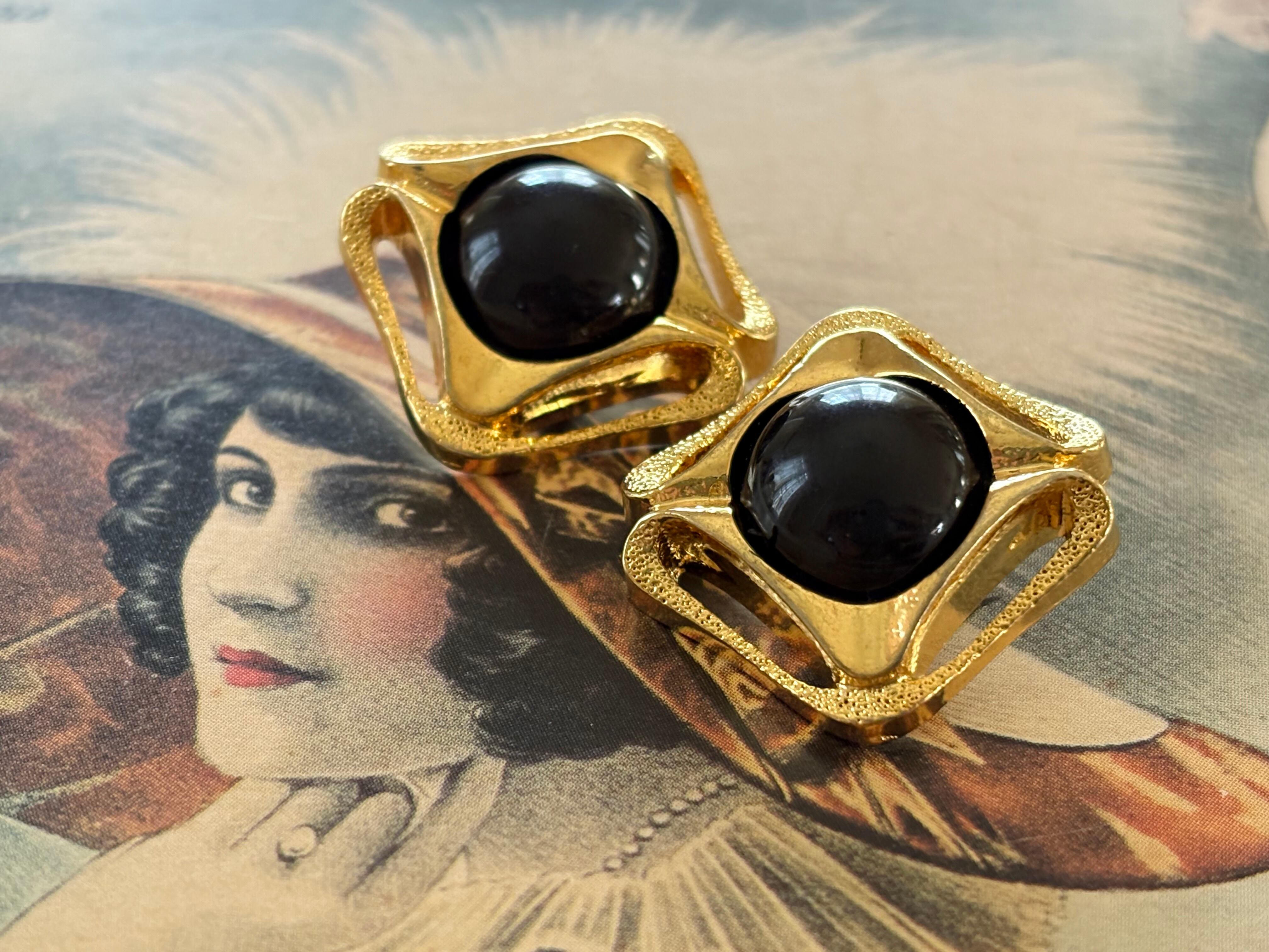 ゴールドの透かしの台座の中央にブラックカラーのカボションが設置されています。