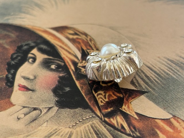 画像の様に高さのあるデコラティブなメタル製の台座にパール調のカボション、4粒の美しく輝くストーンが設置されています。