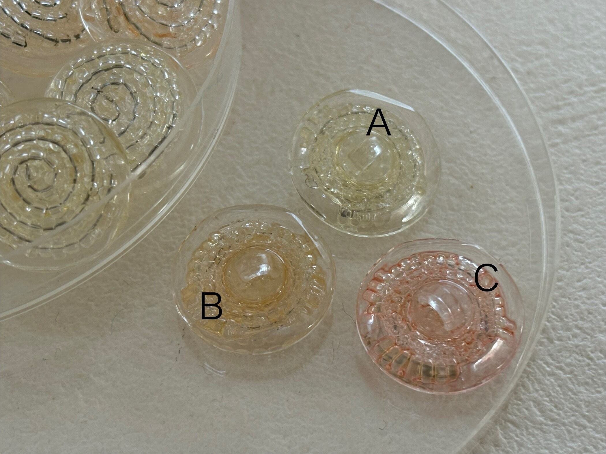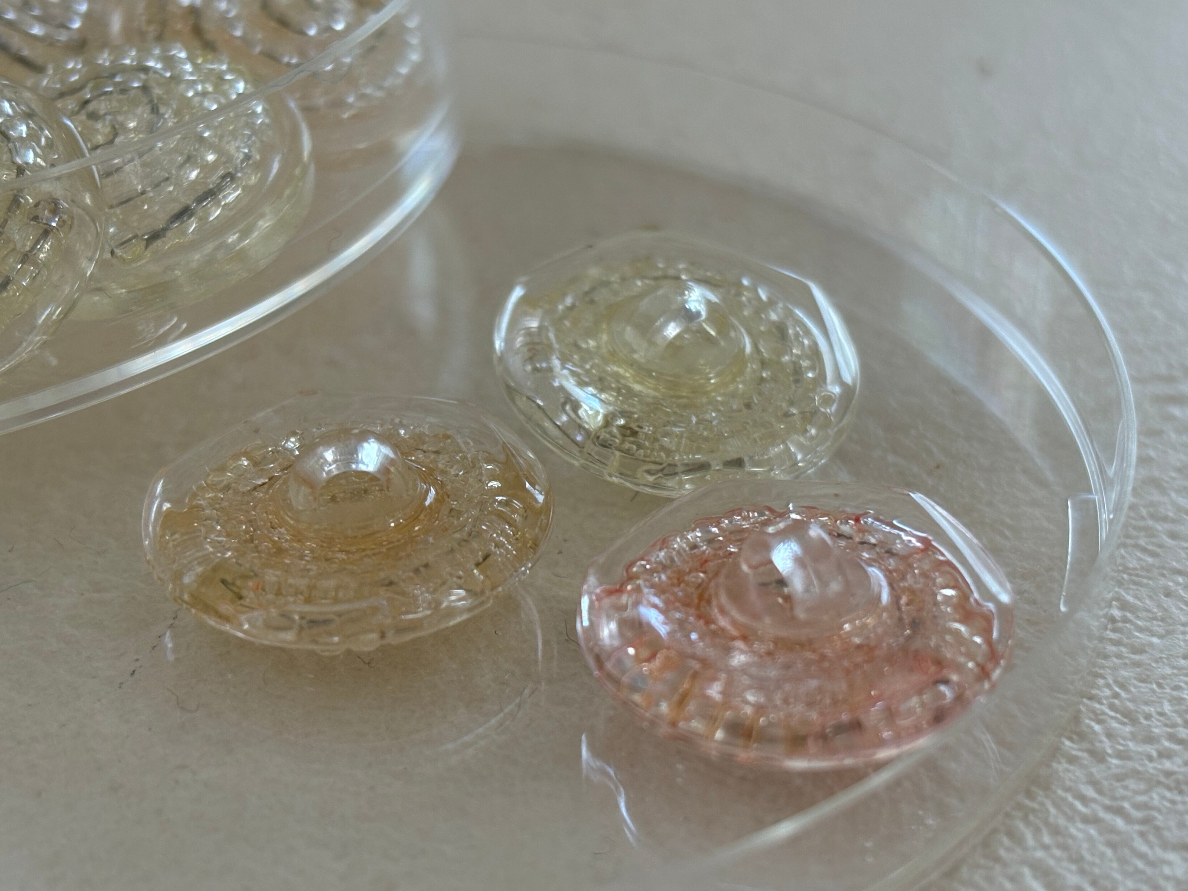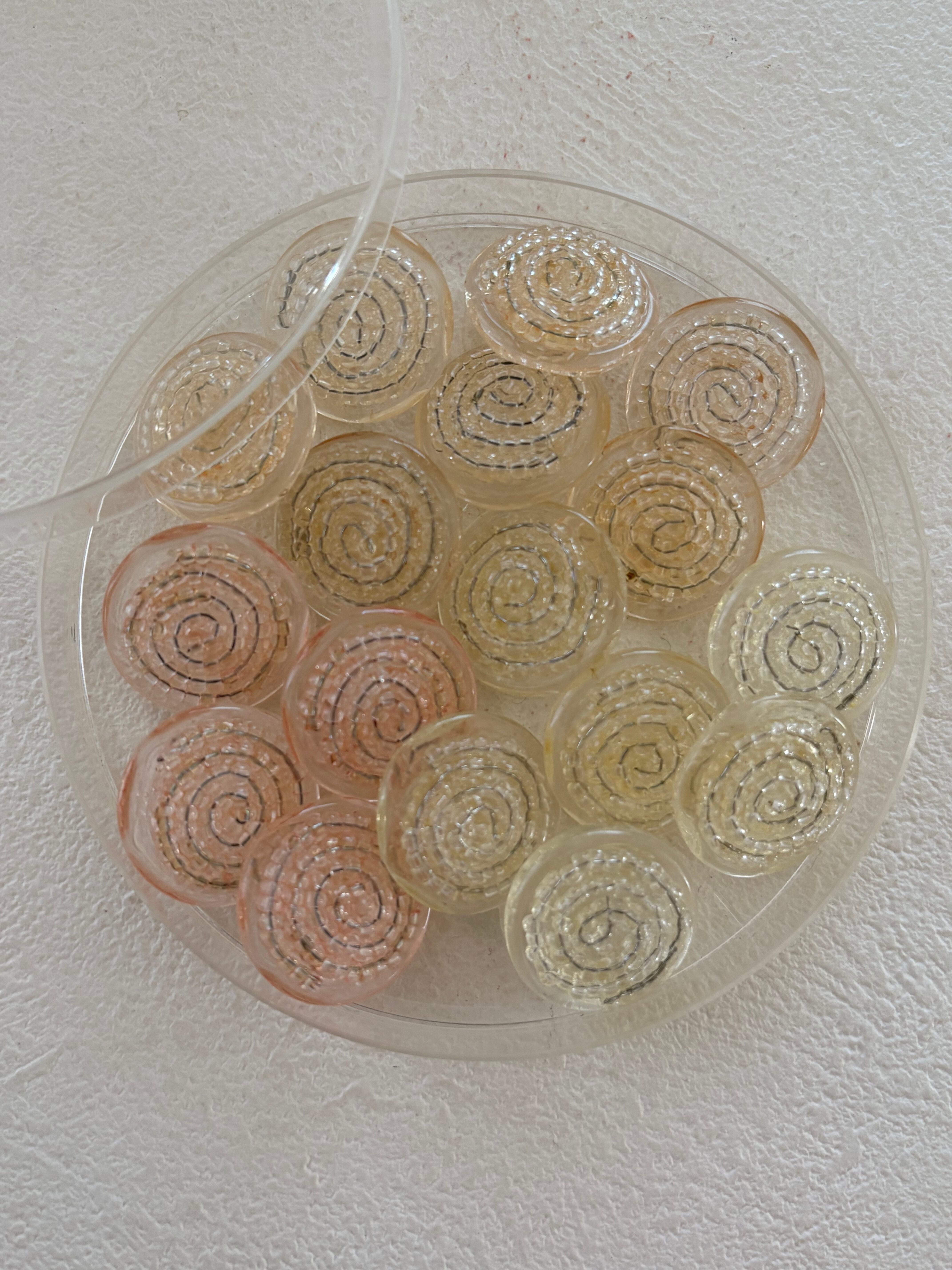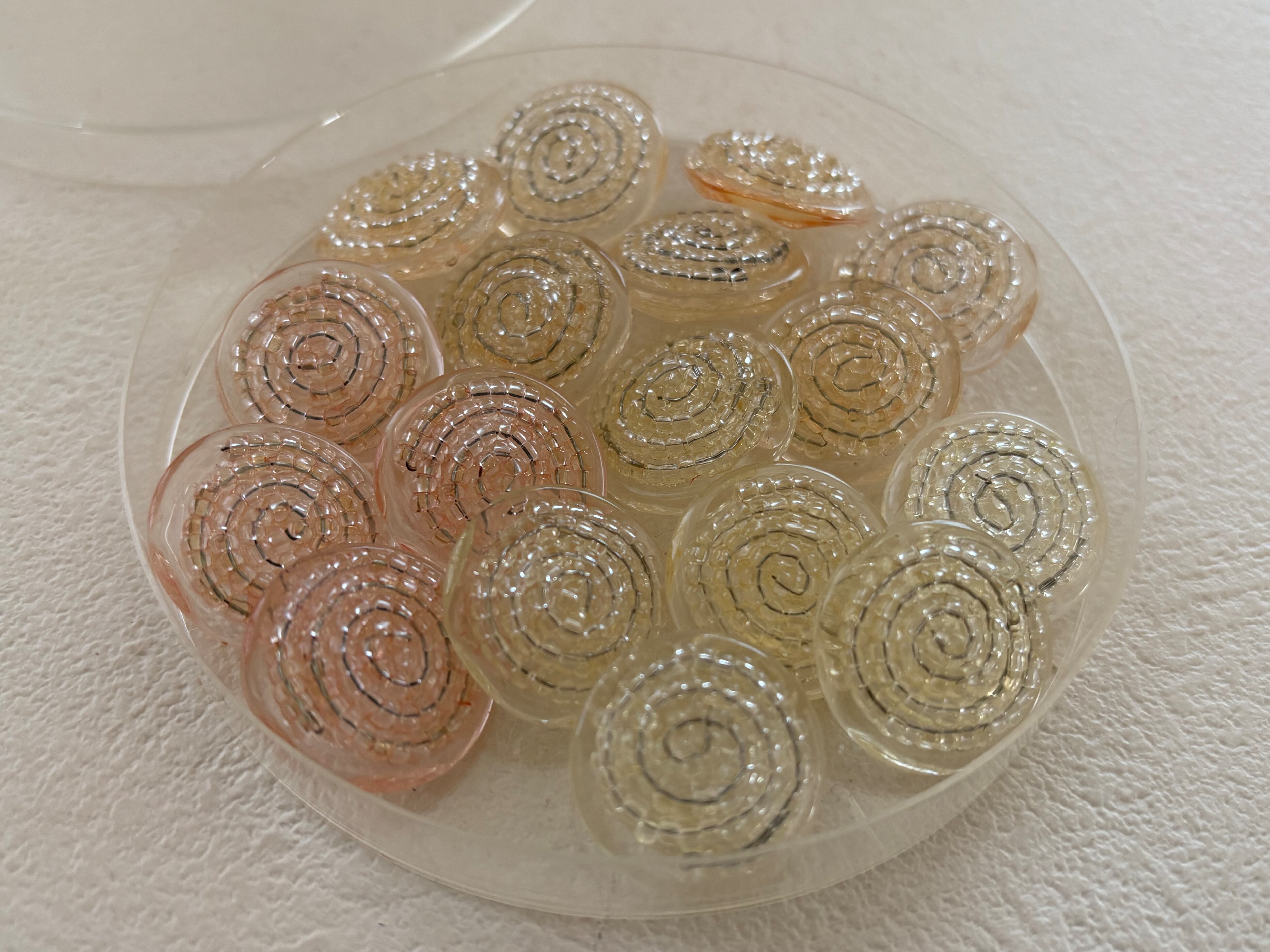 プラスチックボタンの表面に渦状にガラスビーズのデコレーションが施されています。