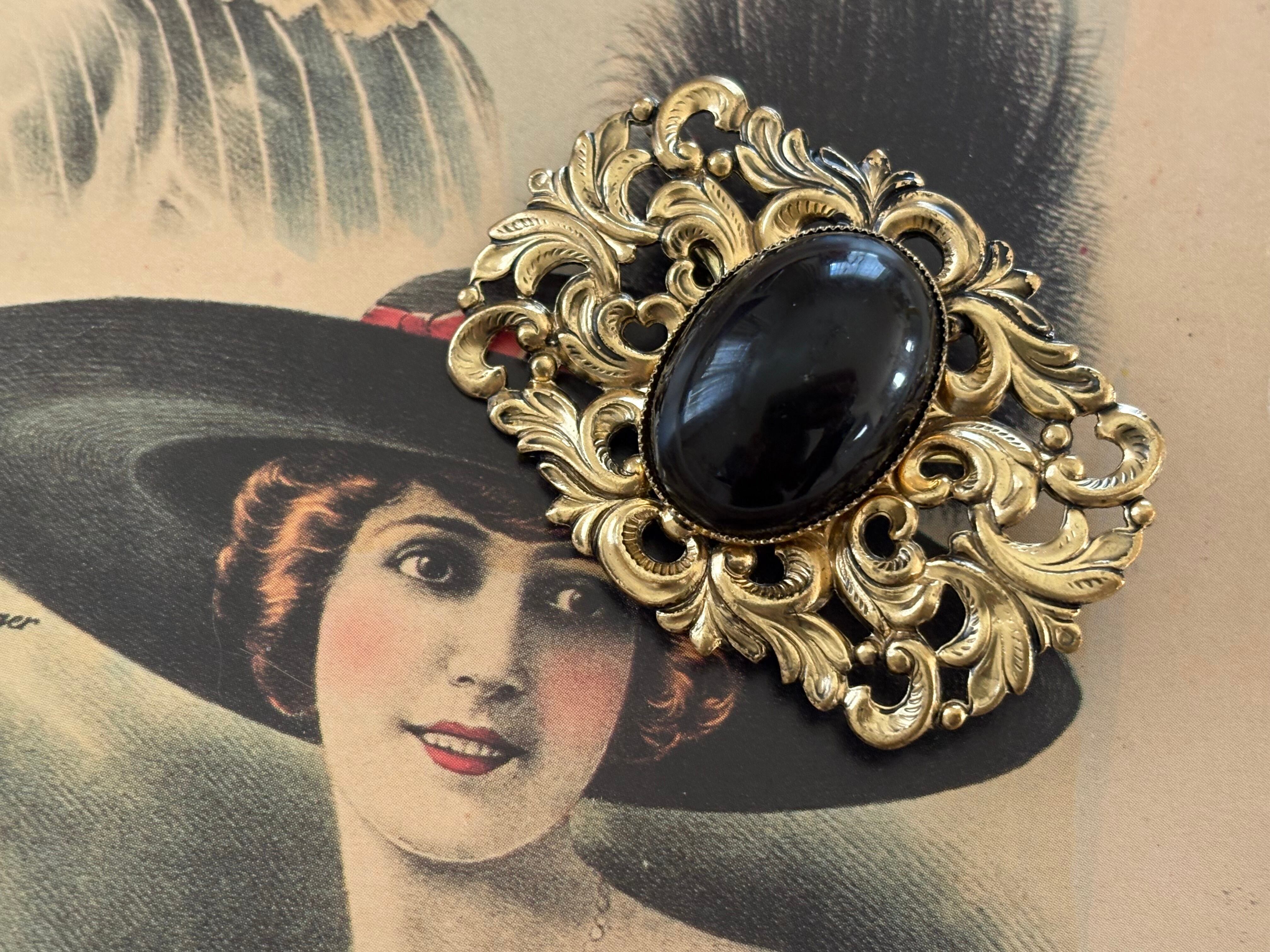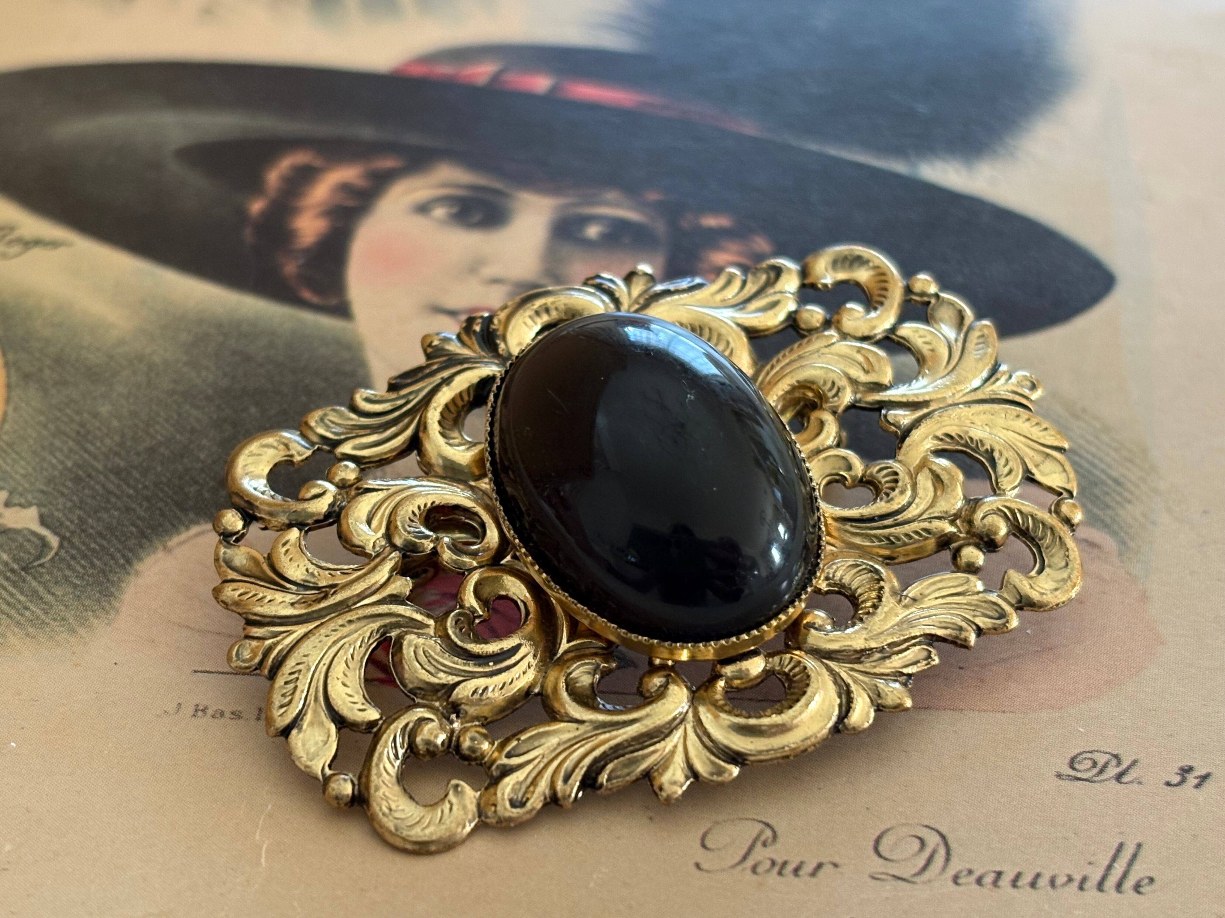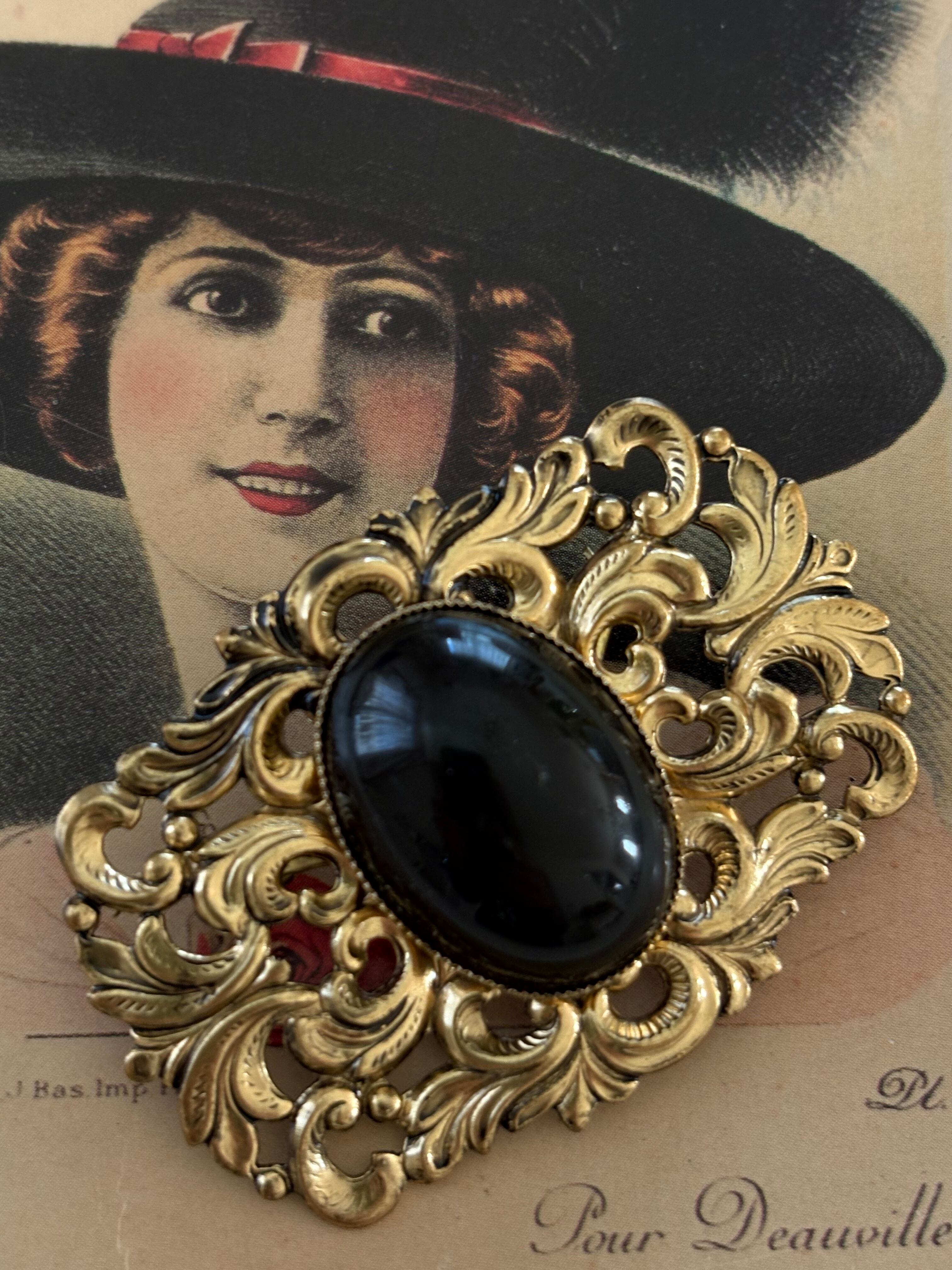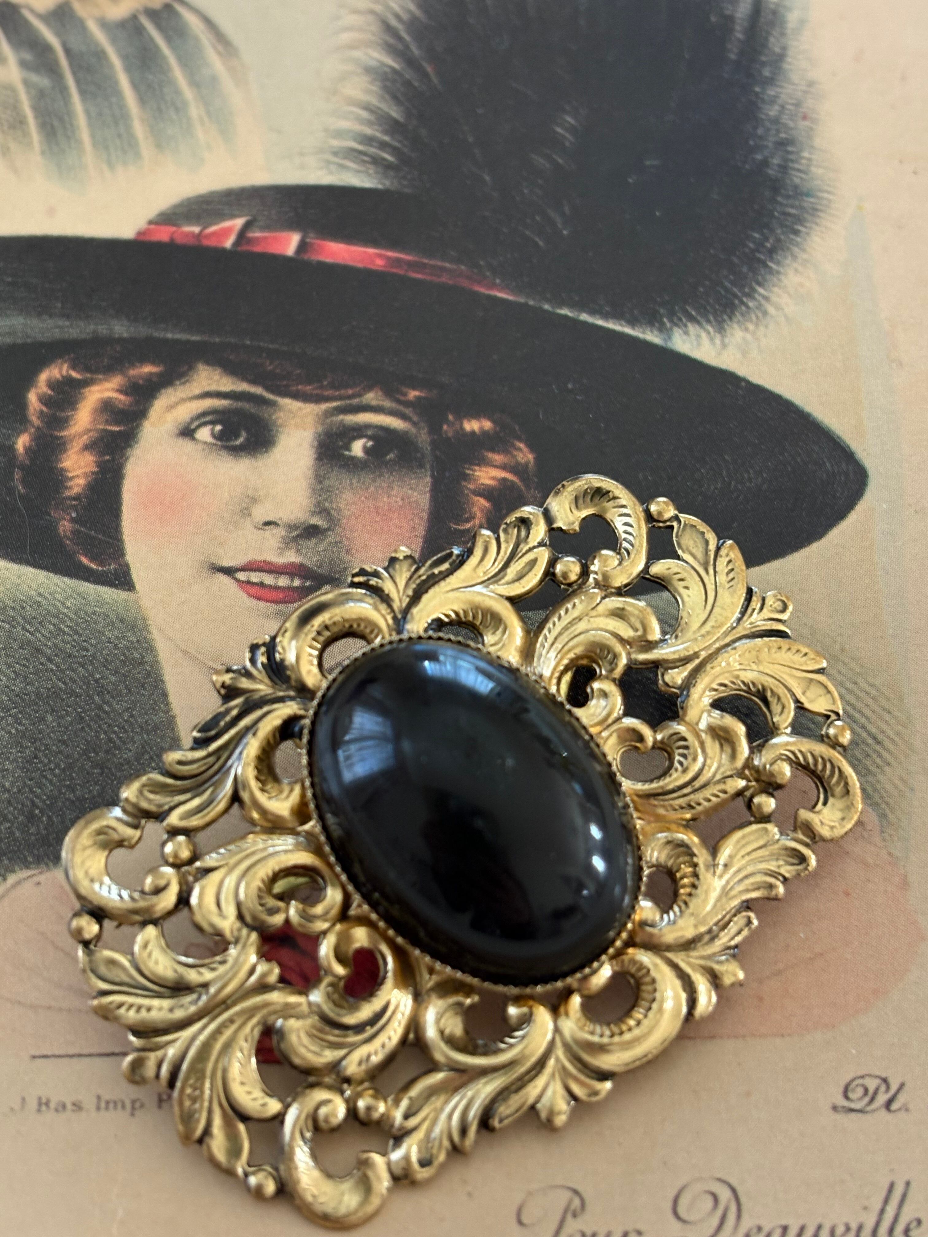 デコラティブでクラシカルな美しい透かしのメタルの台座に大きなブラックカラーのカボションがセッティングされています。