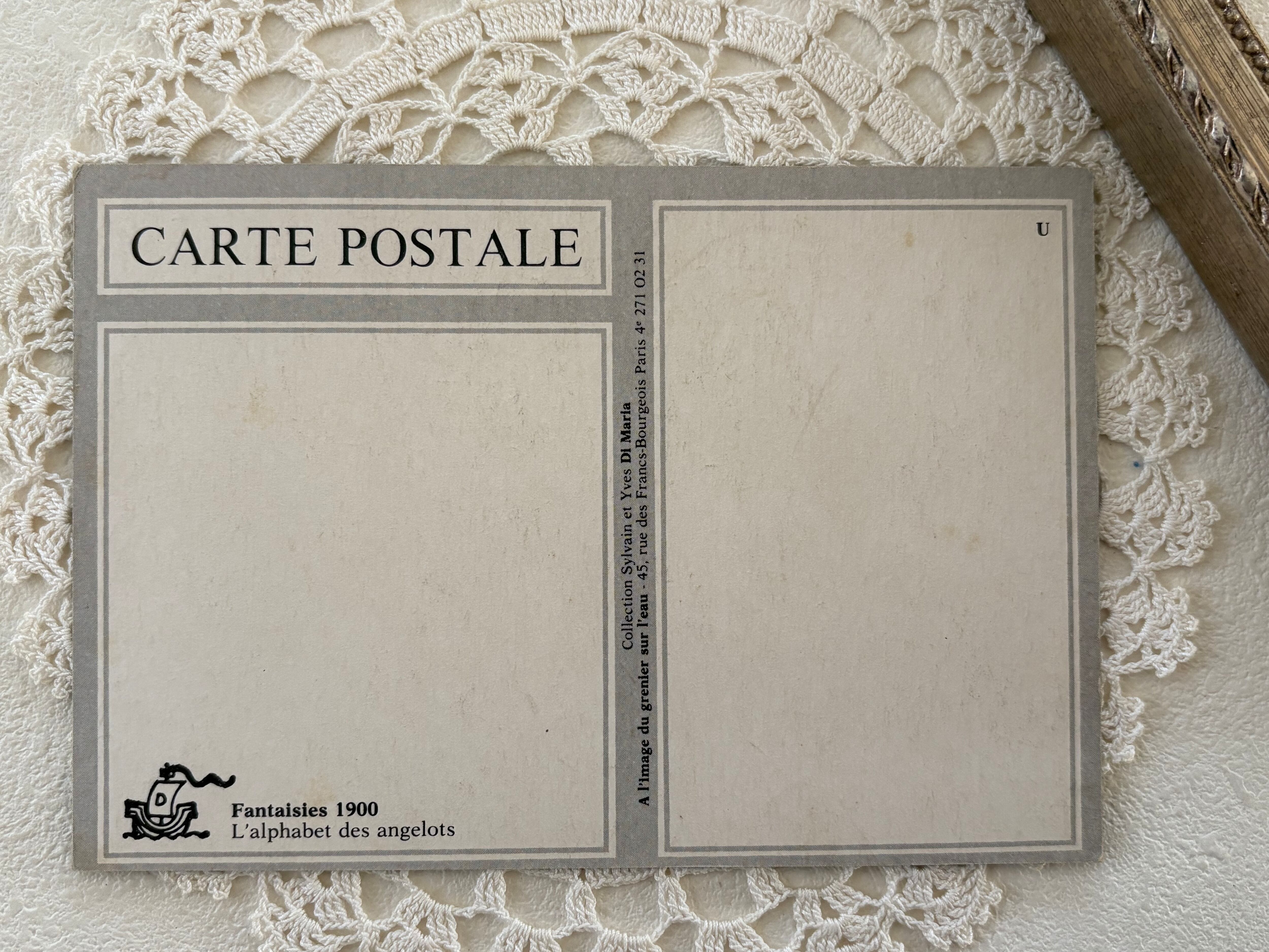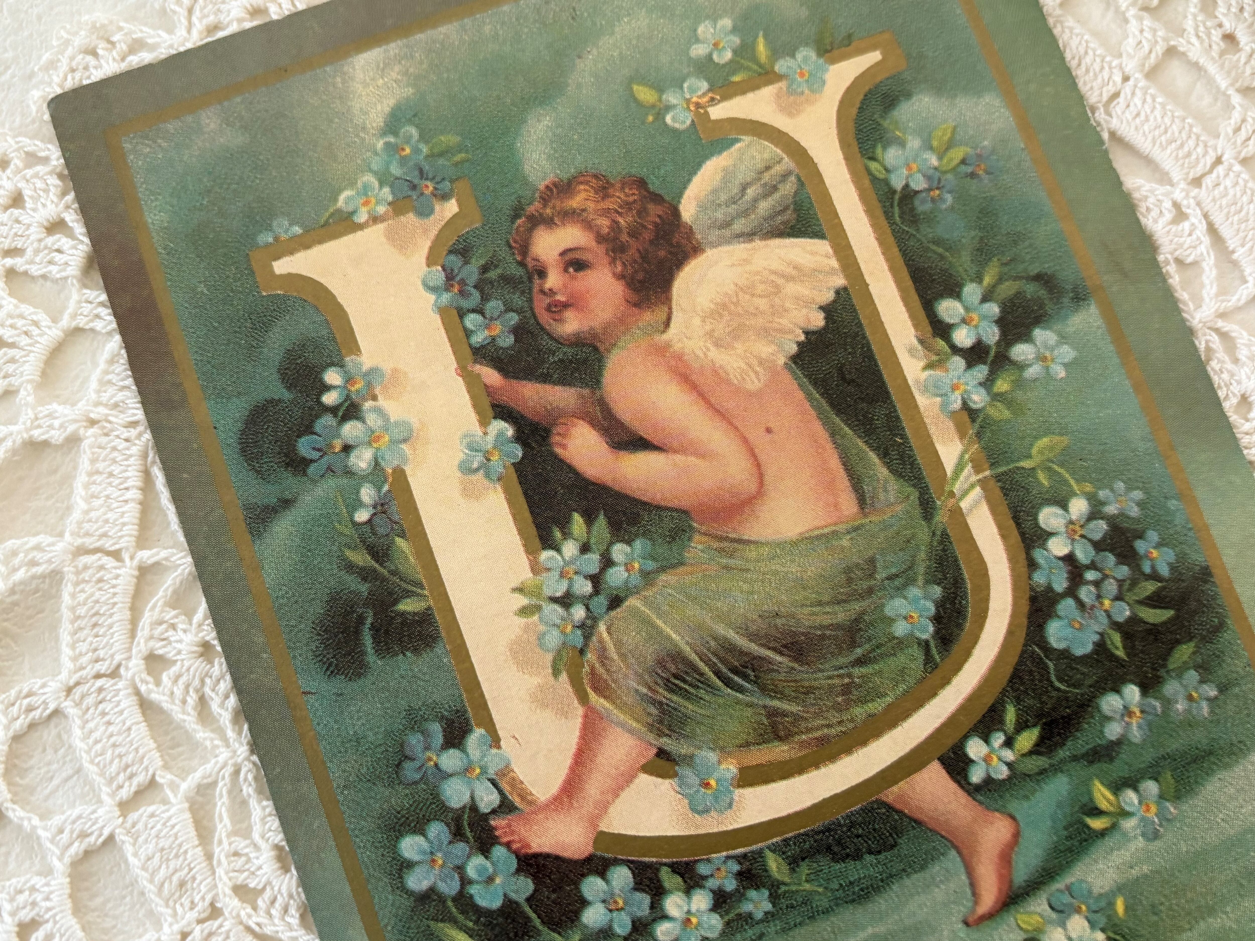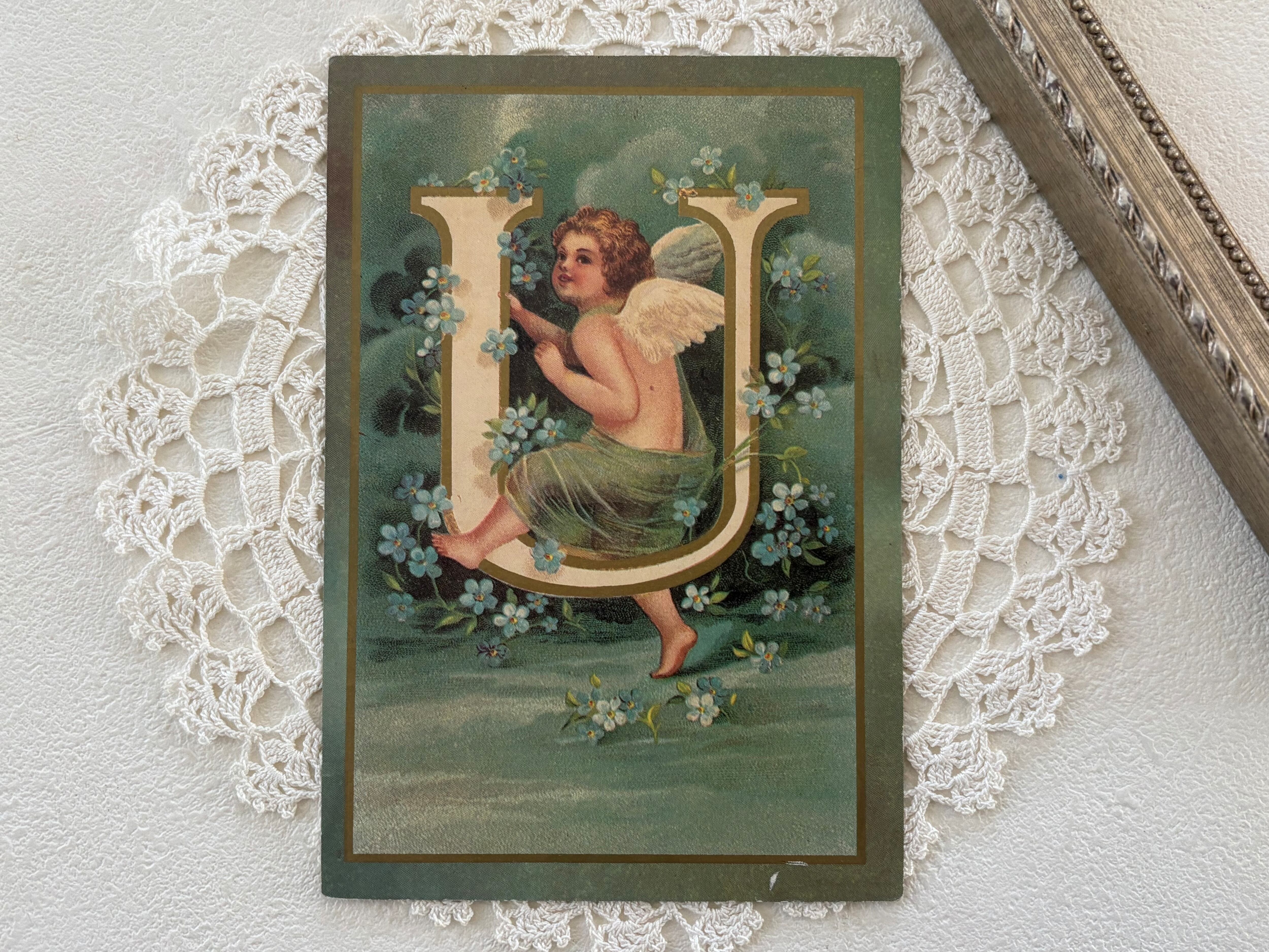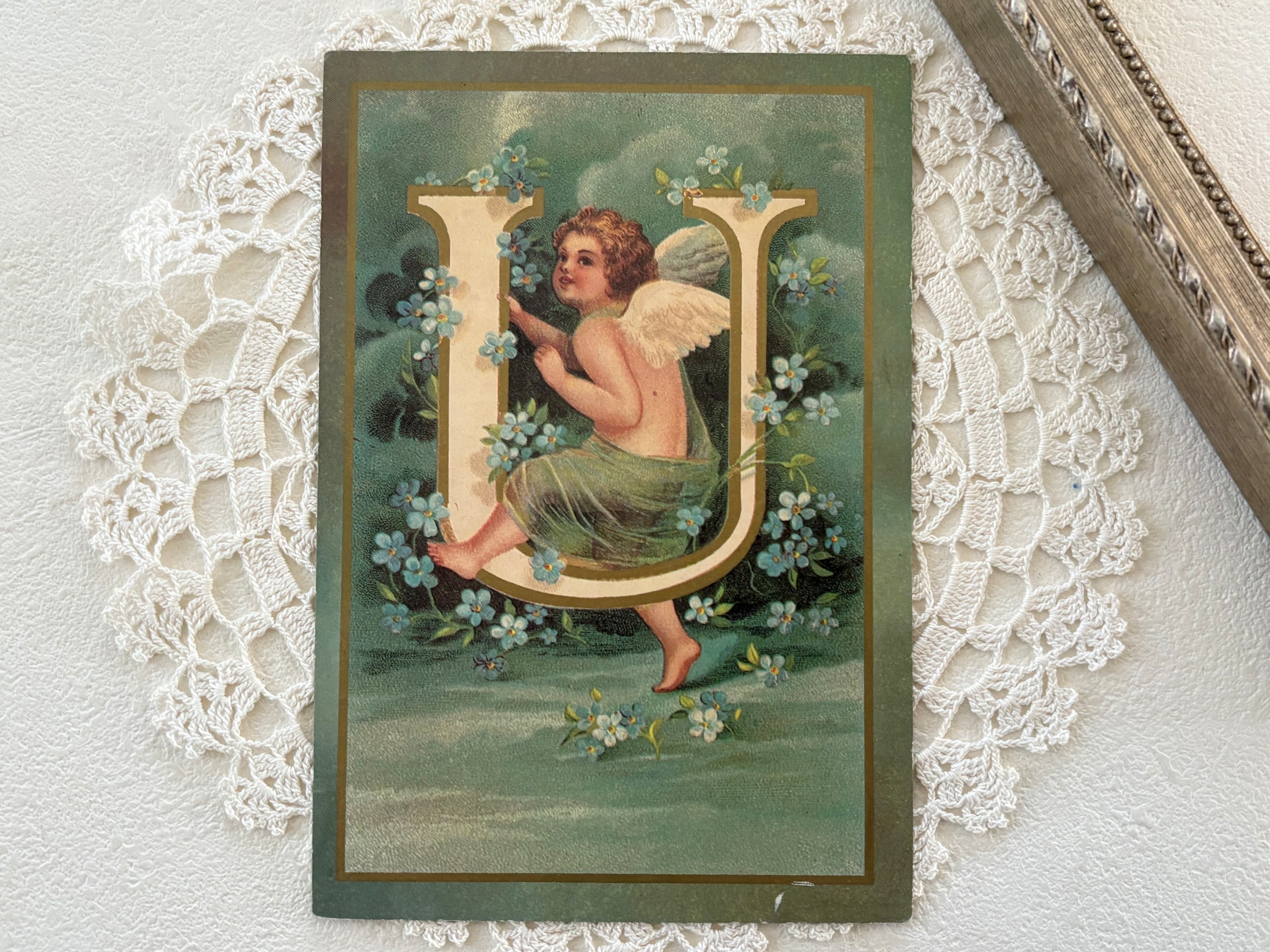 フランス Vintage ポストカード 天使とアルファベット U 勿忘草 額装 インテリア. クリスマス Noel