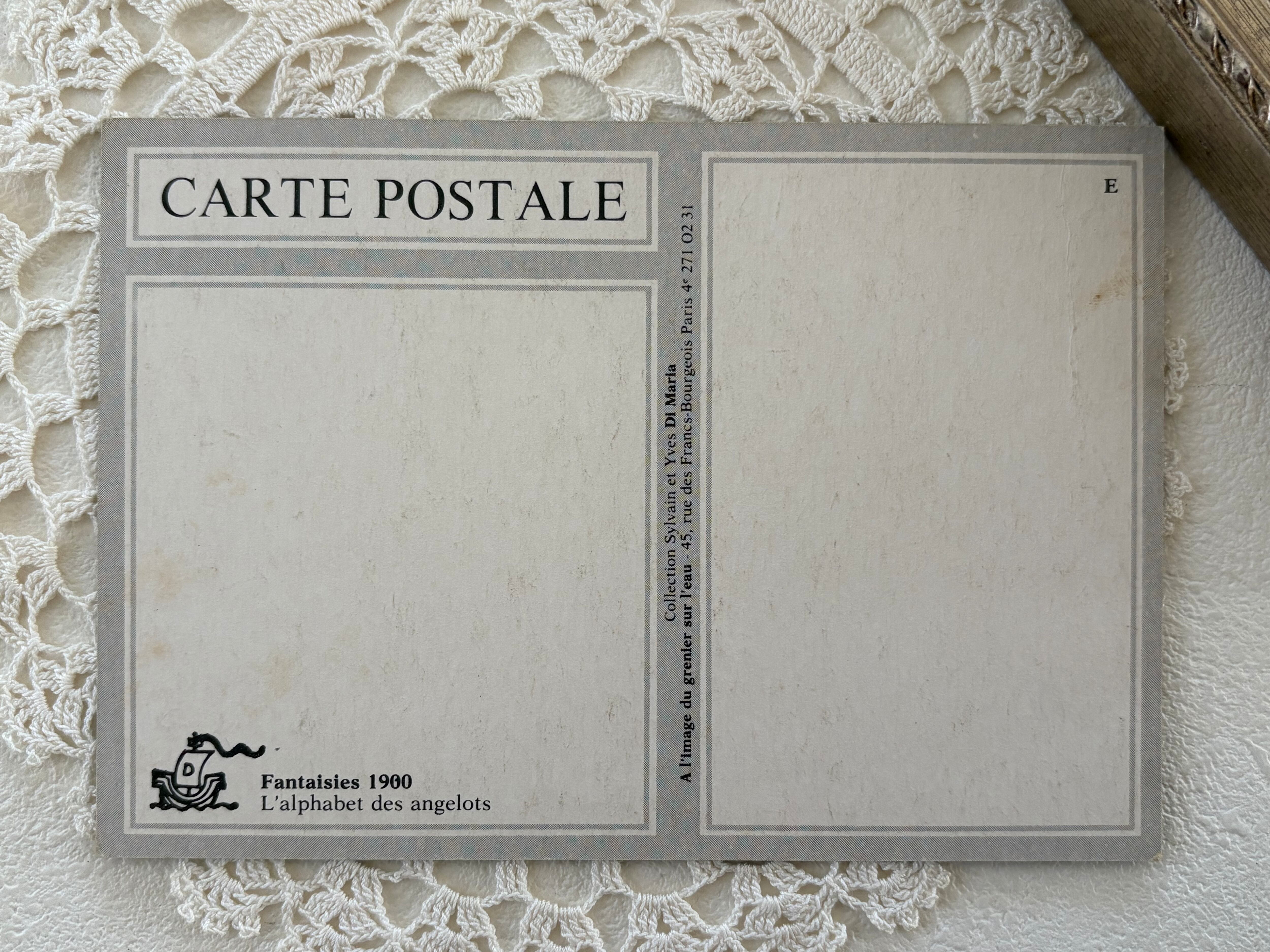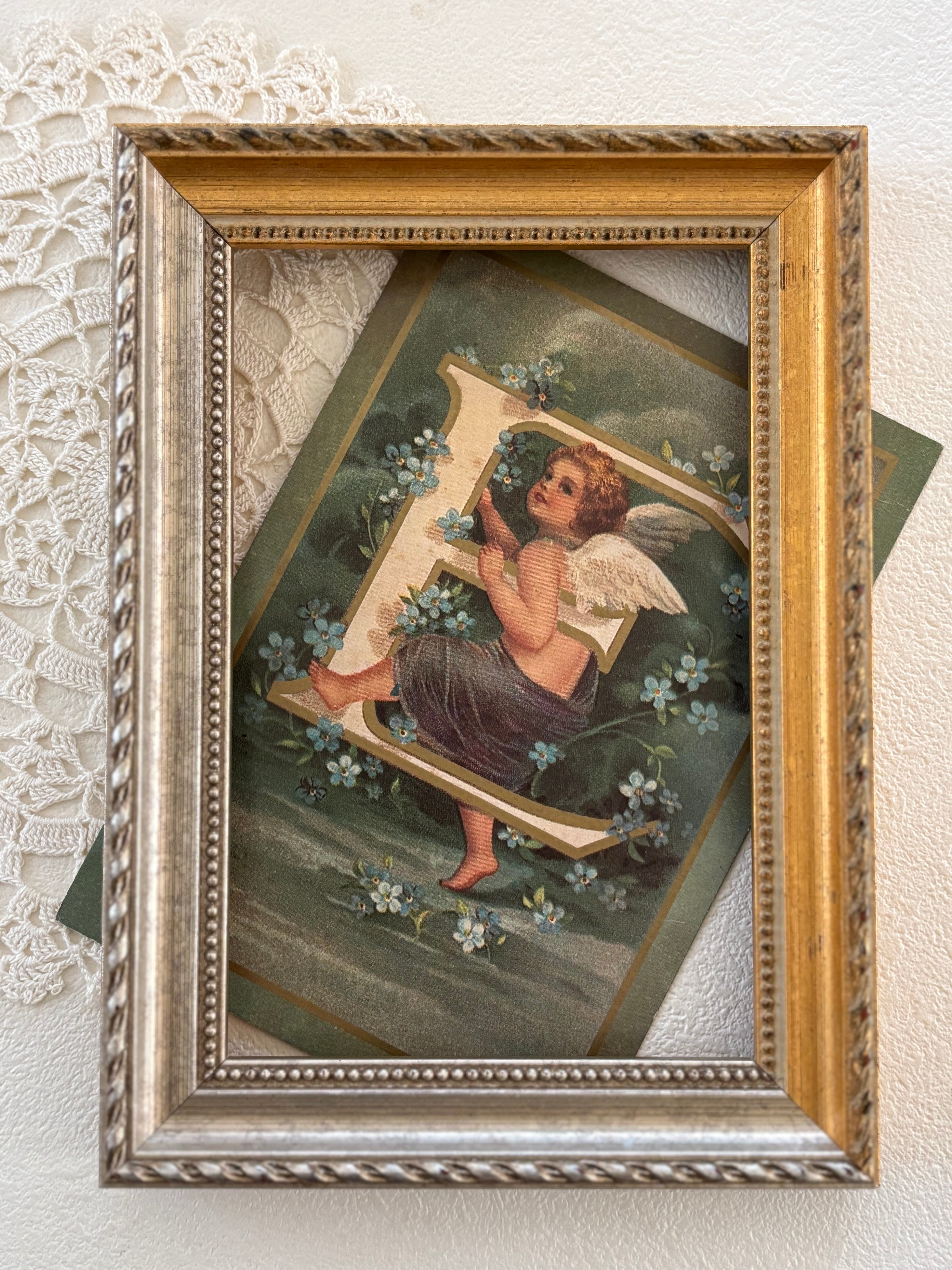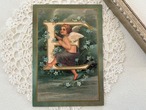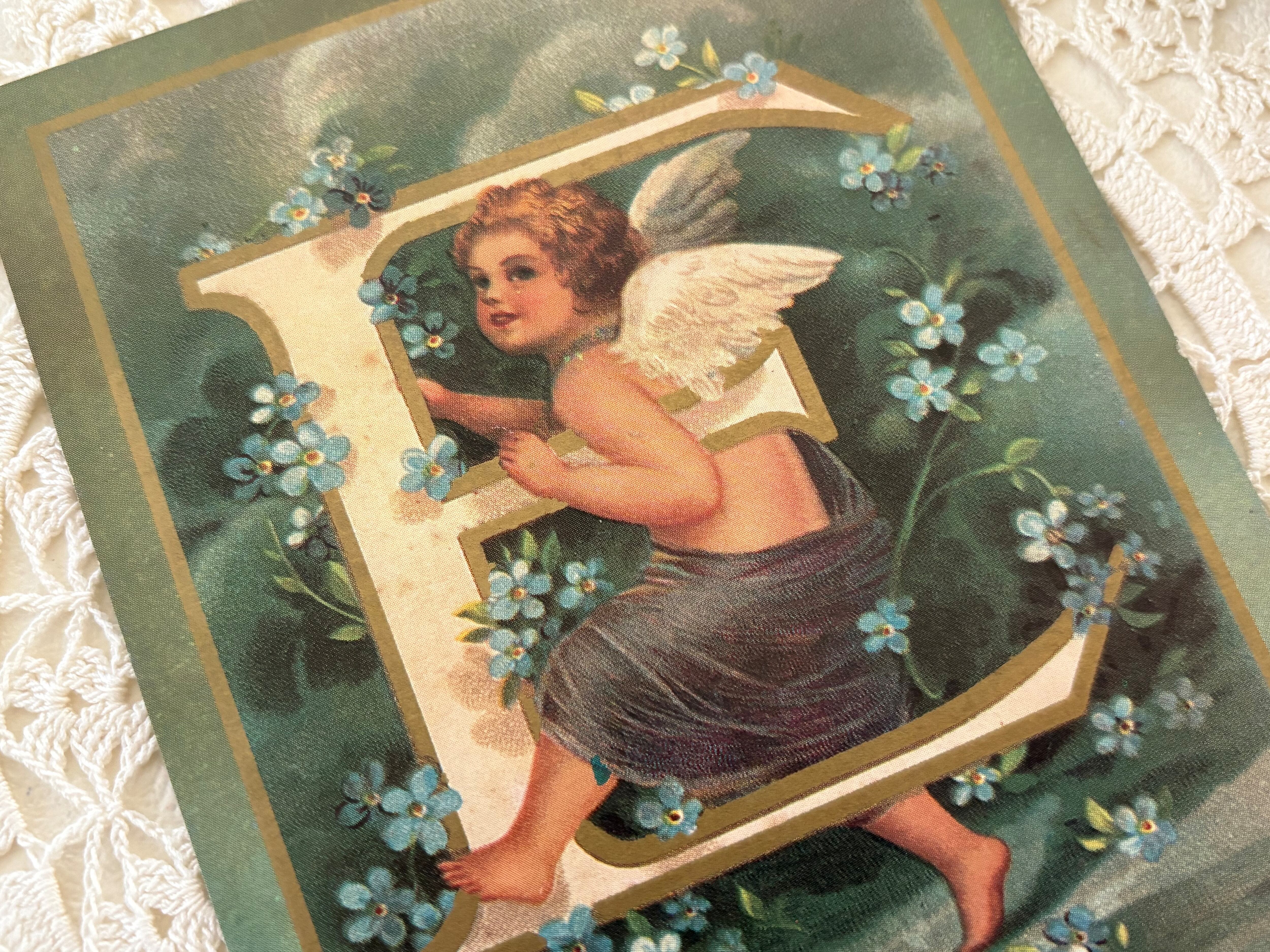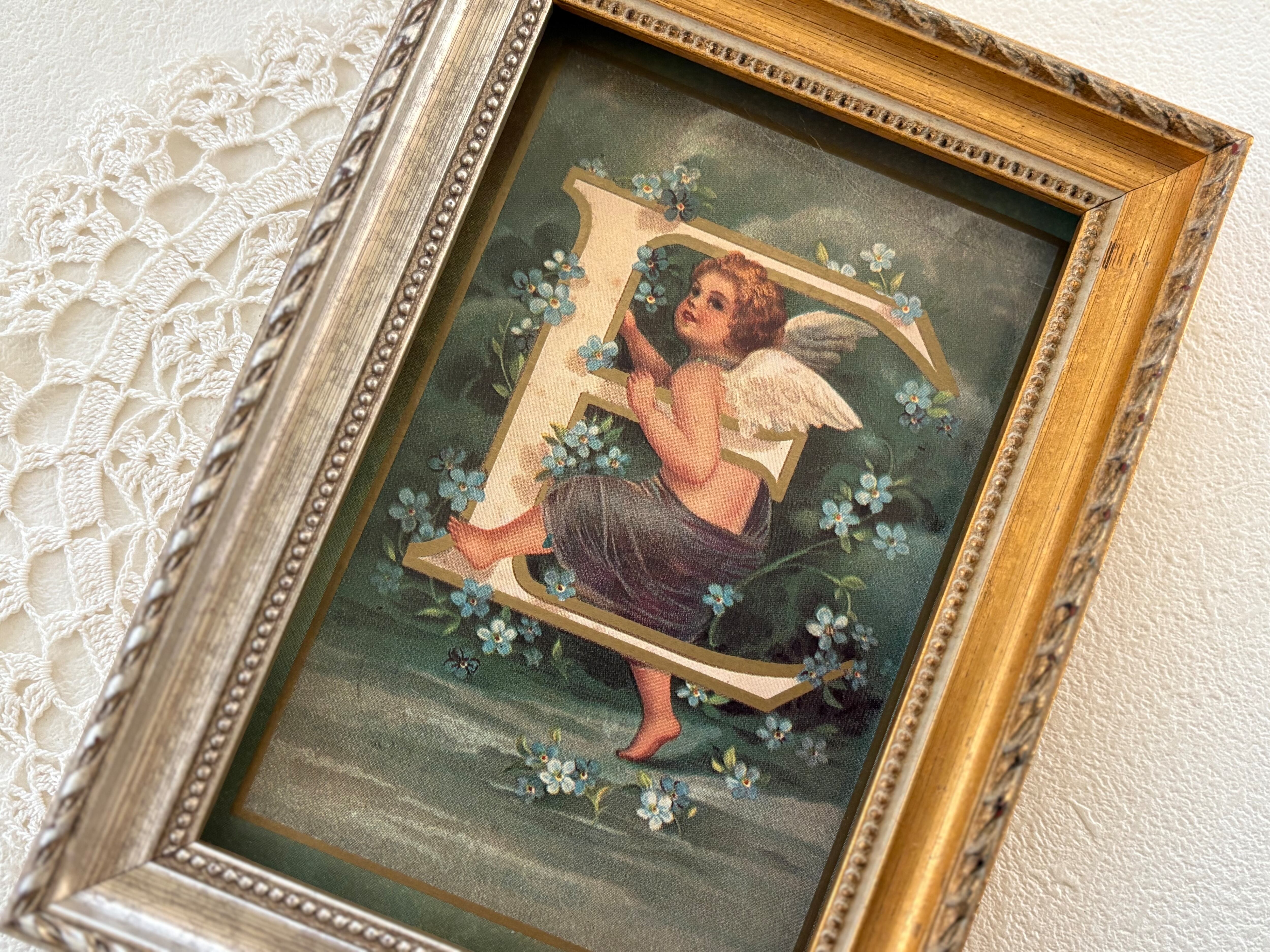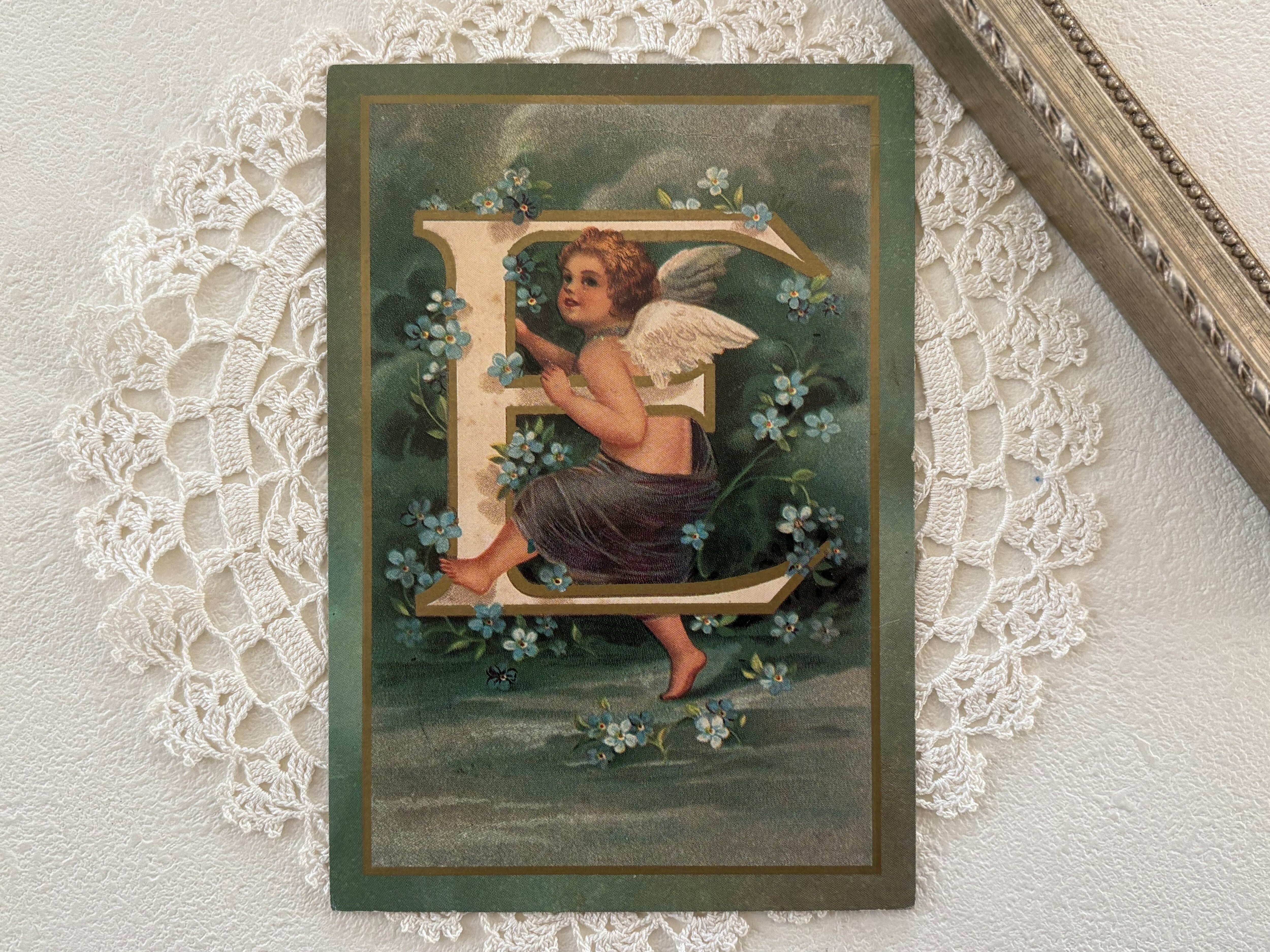 フランス Vintage ポストカード 天使とアルファベットE 勿忘草 額装 インテリア クリスマス Noel
