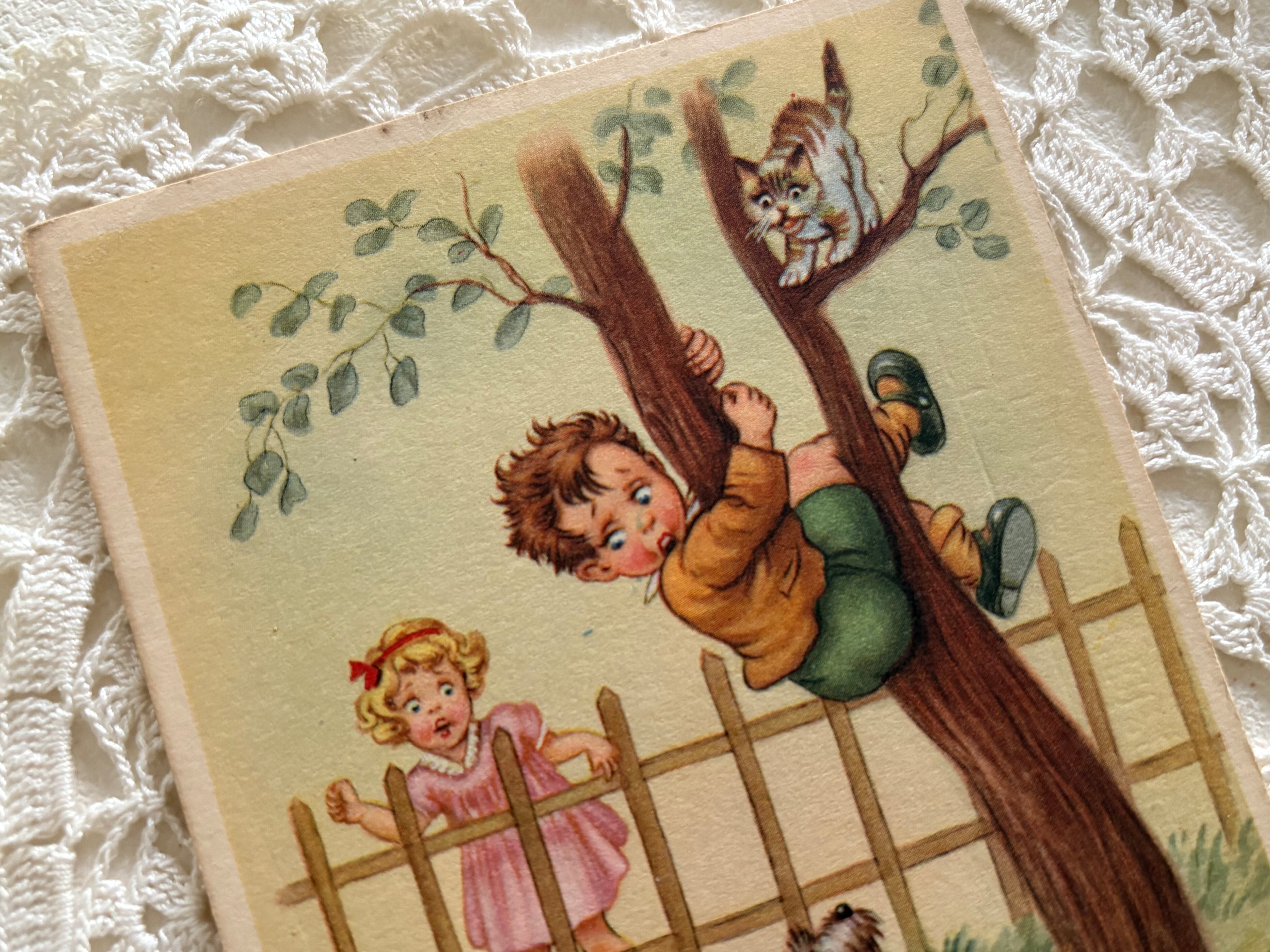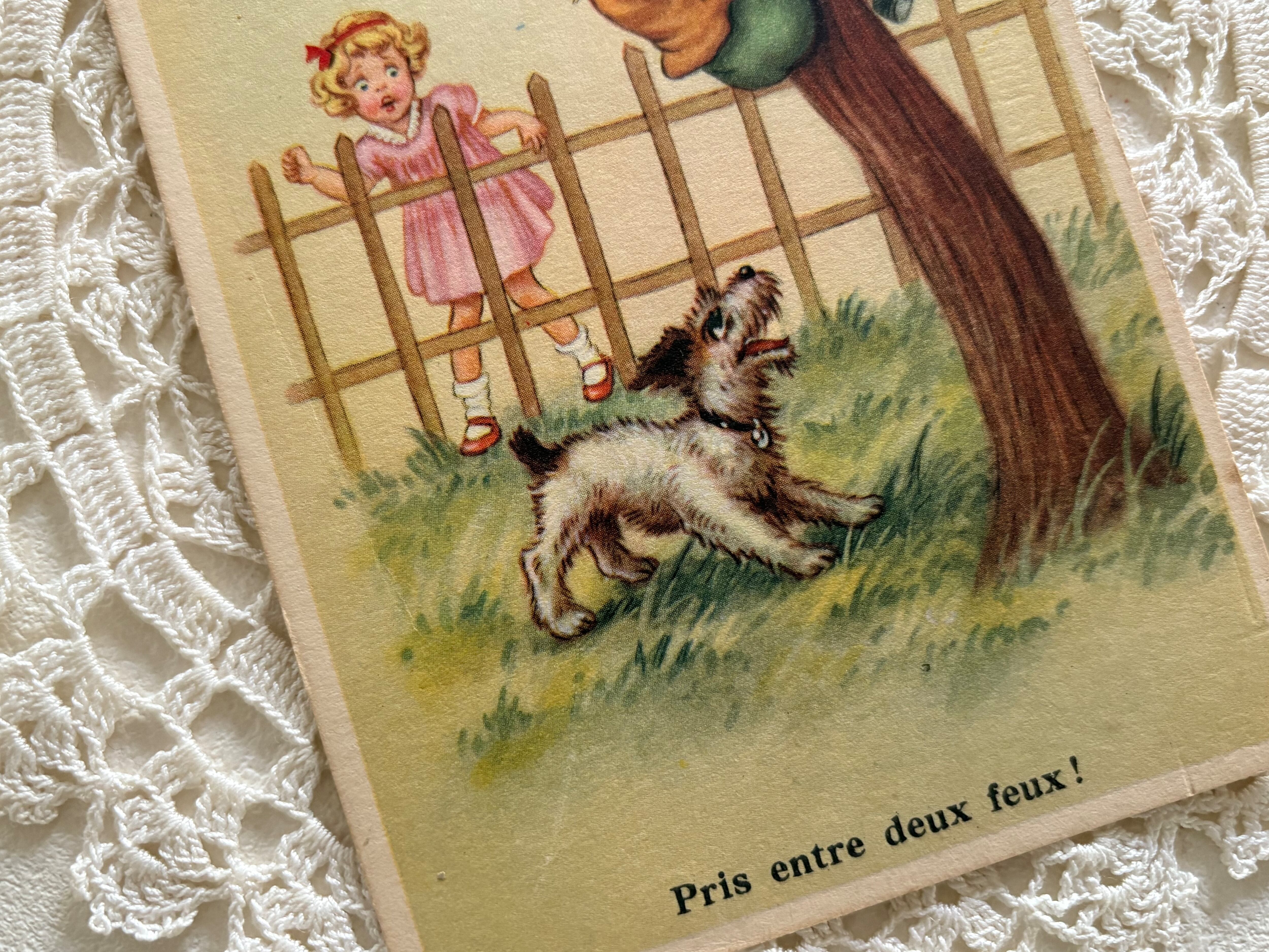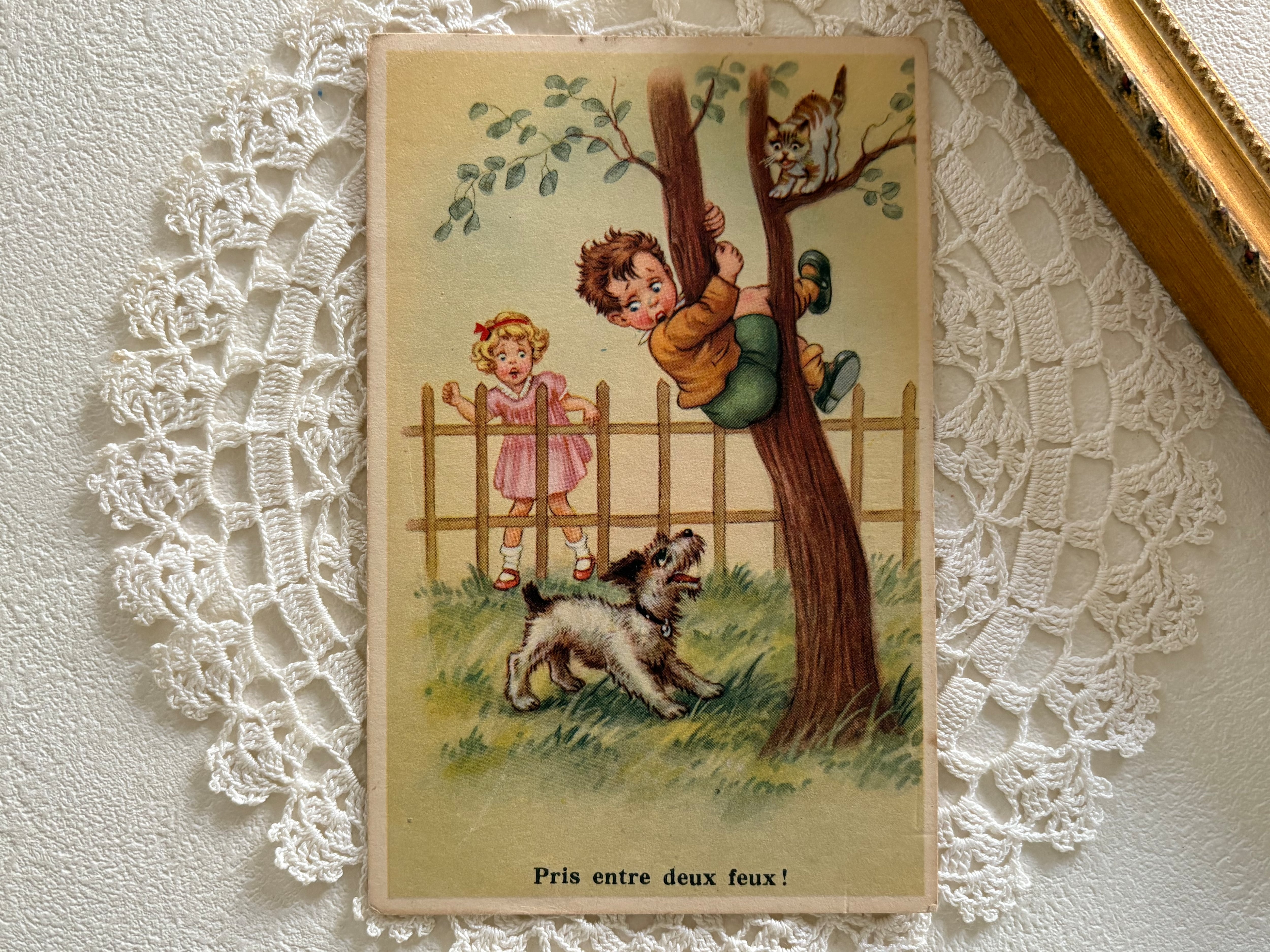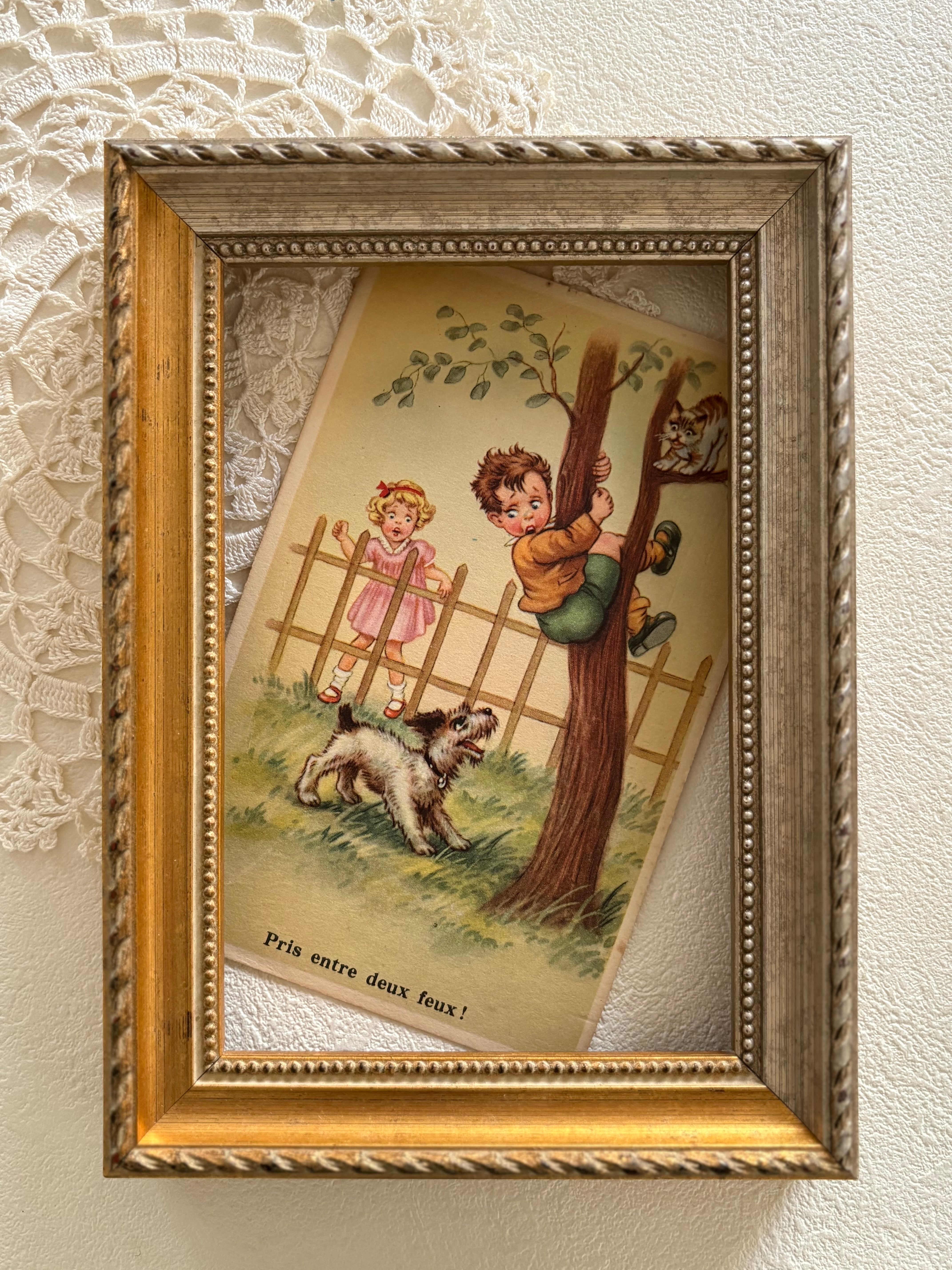 アンティークポストカード. 犬から逃げる男の子 ねこ フランス 額装 インテリア コレクション