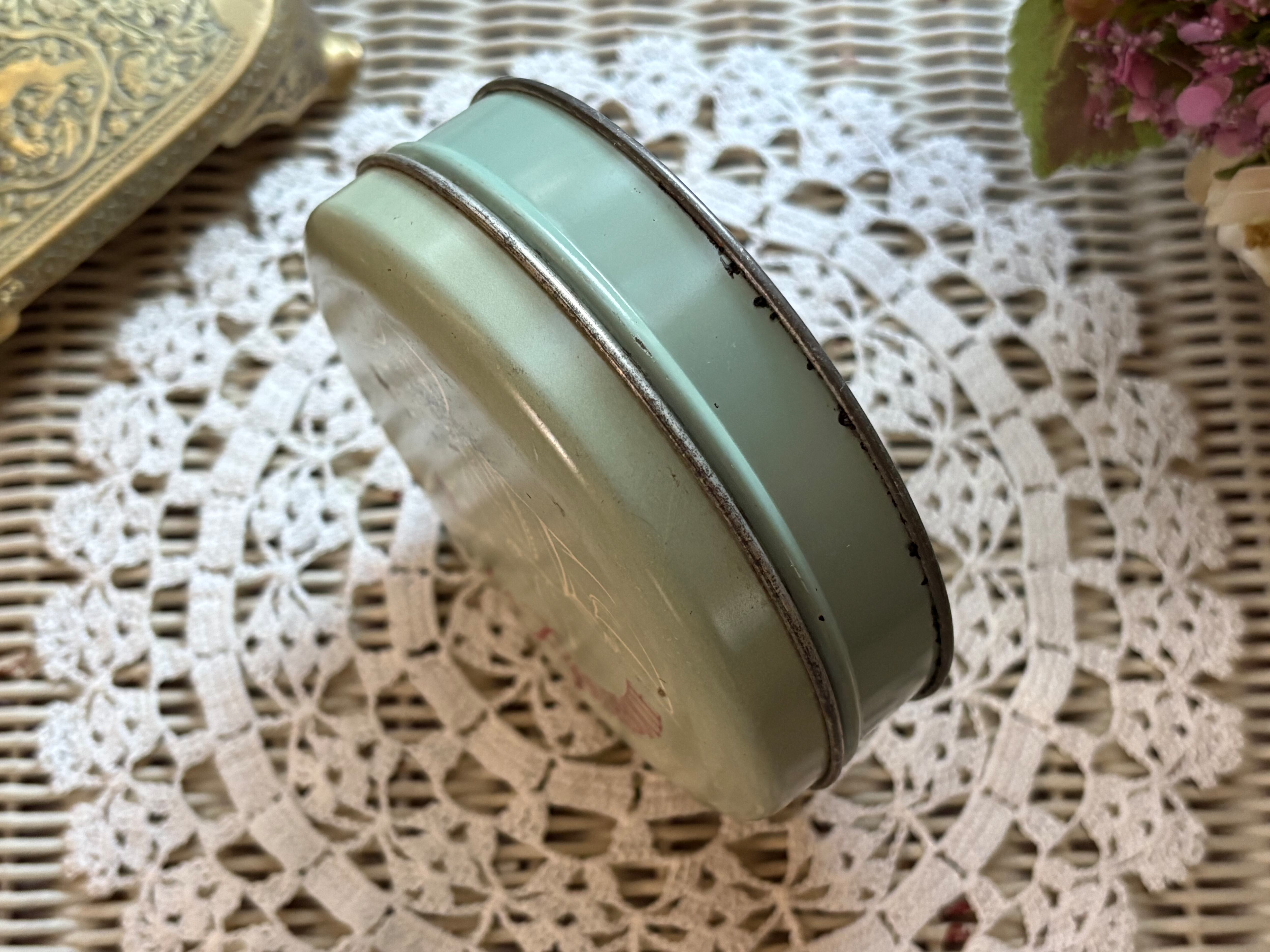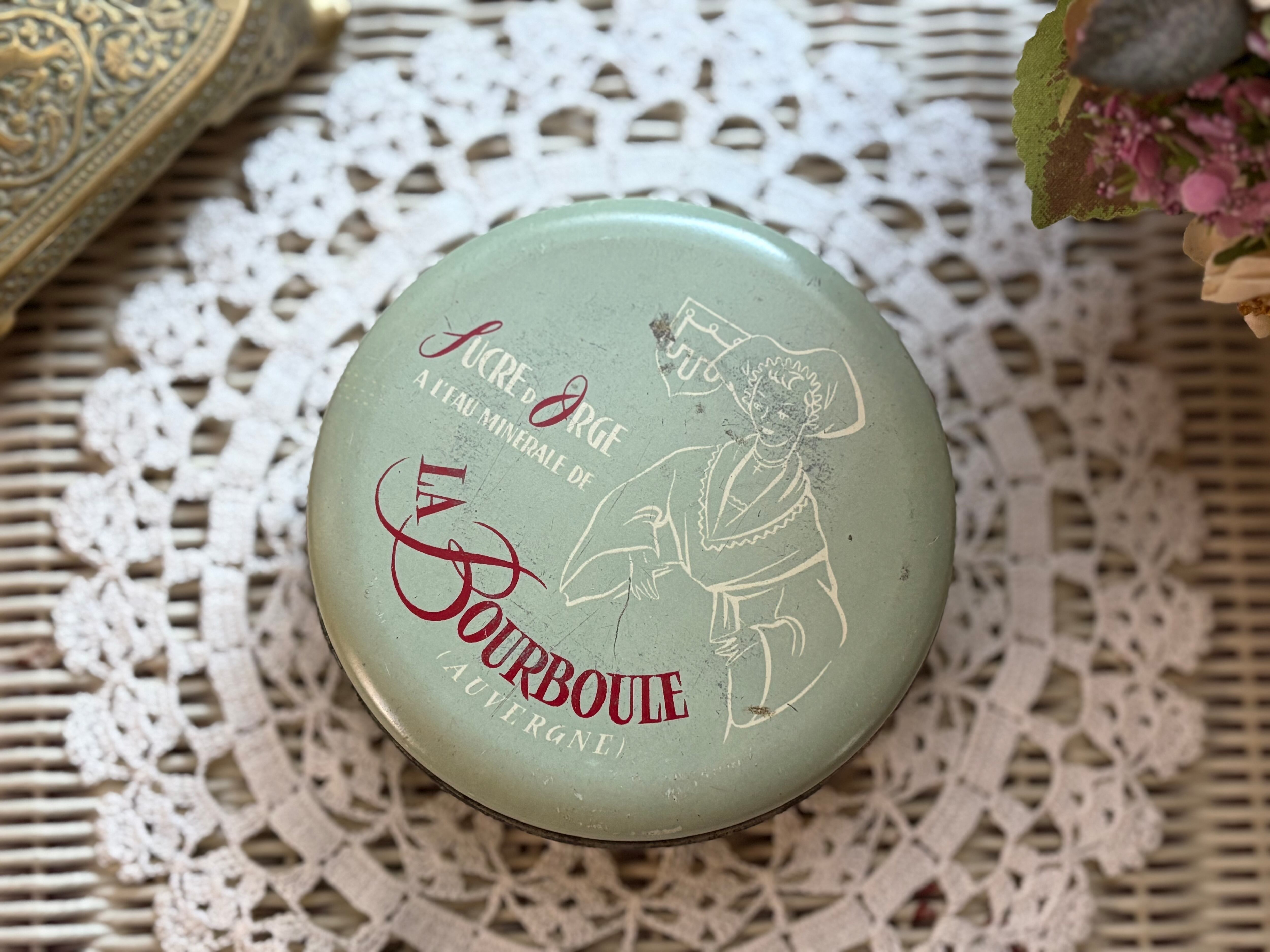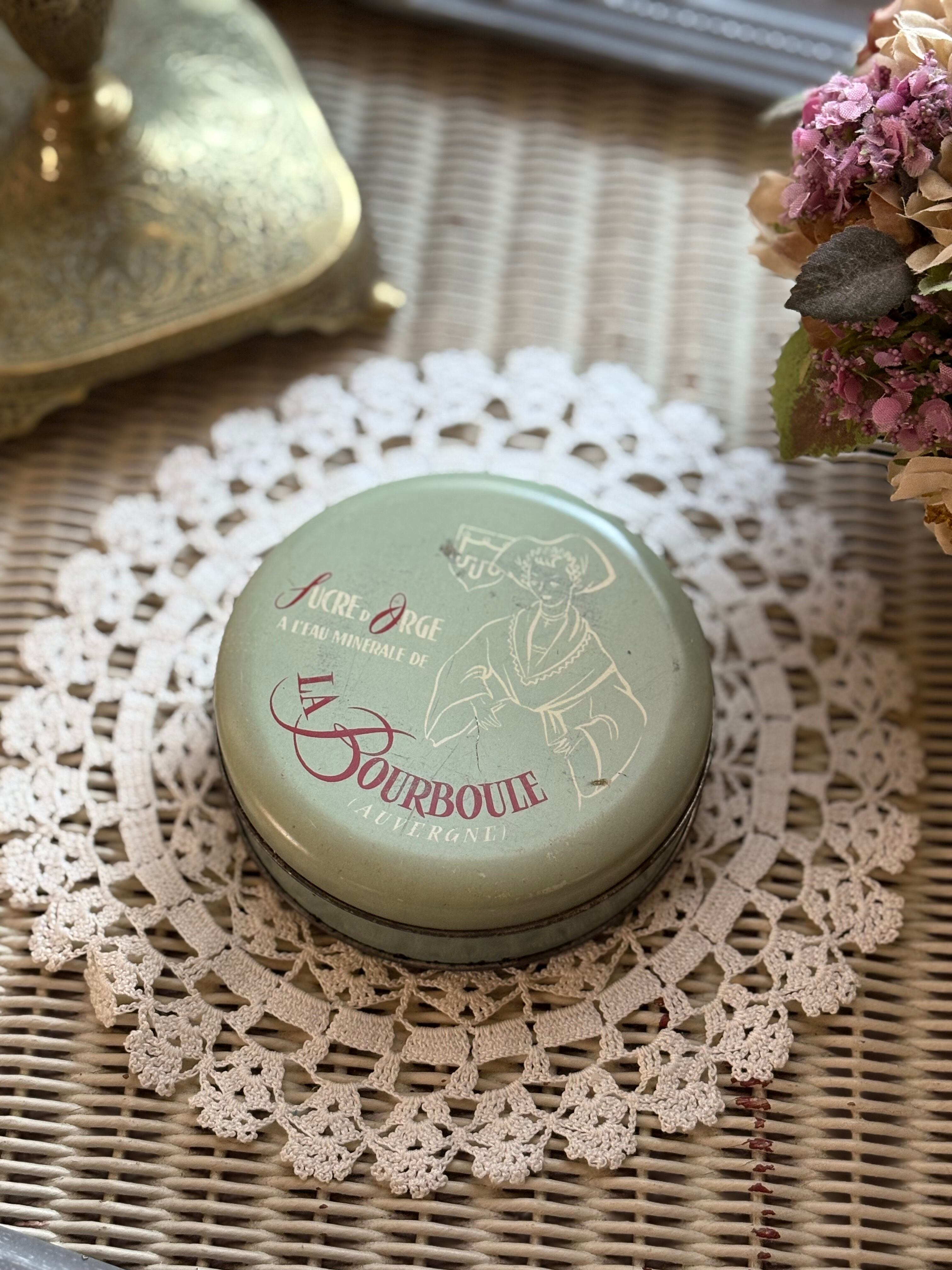 フランスVintage sucre d'orge キャンディー Tin缶 くすみブルー 9.3cm 小物入れ ディスプレイ インテリア小物 撮影小物