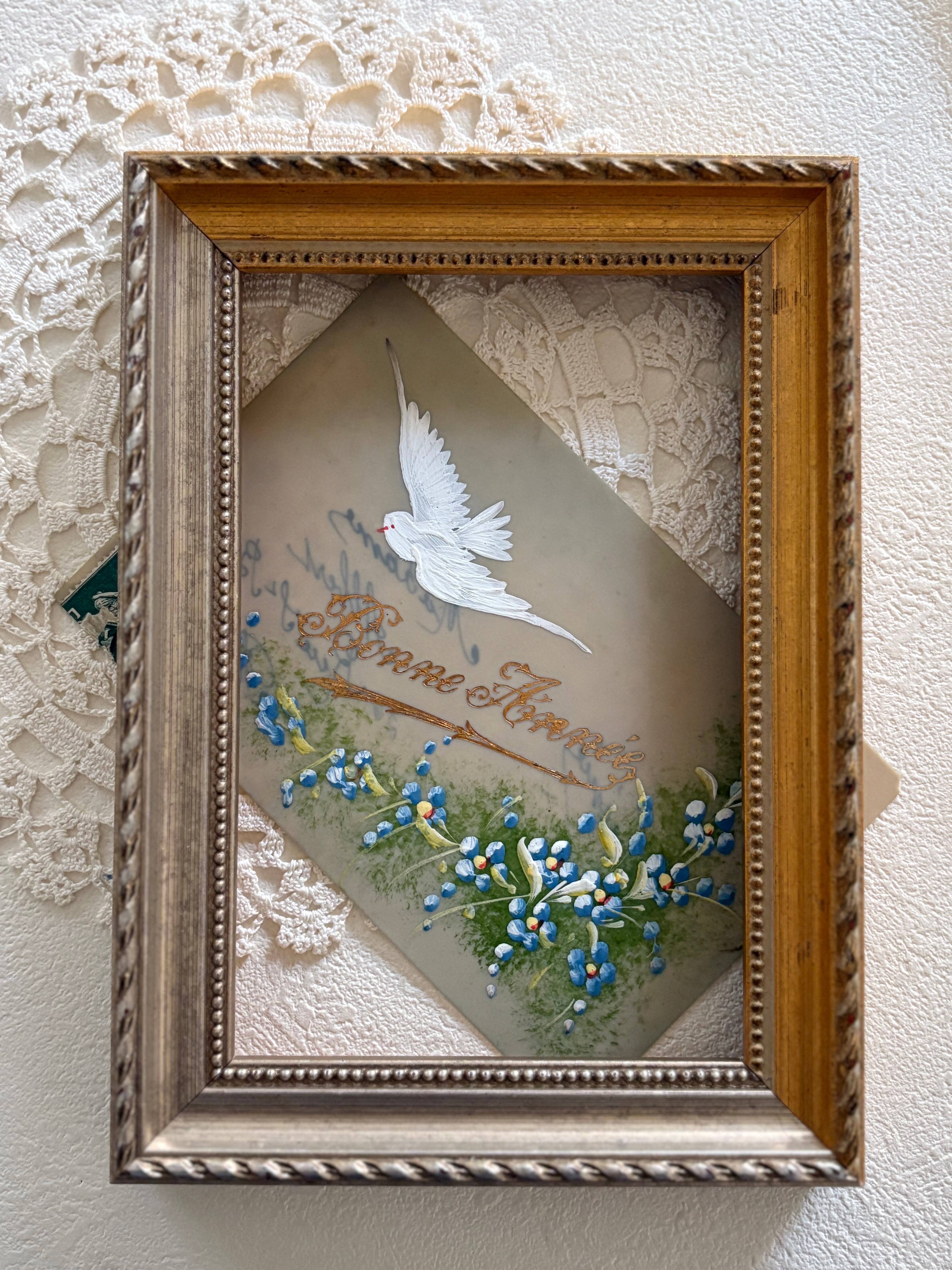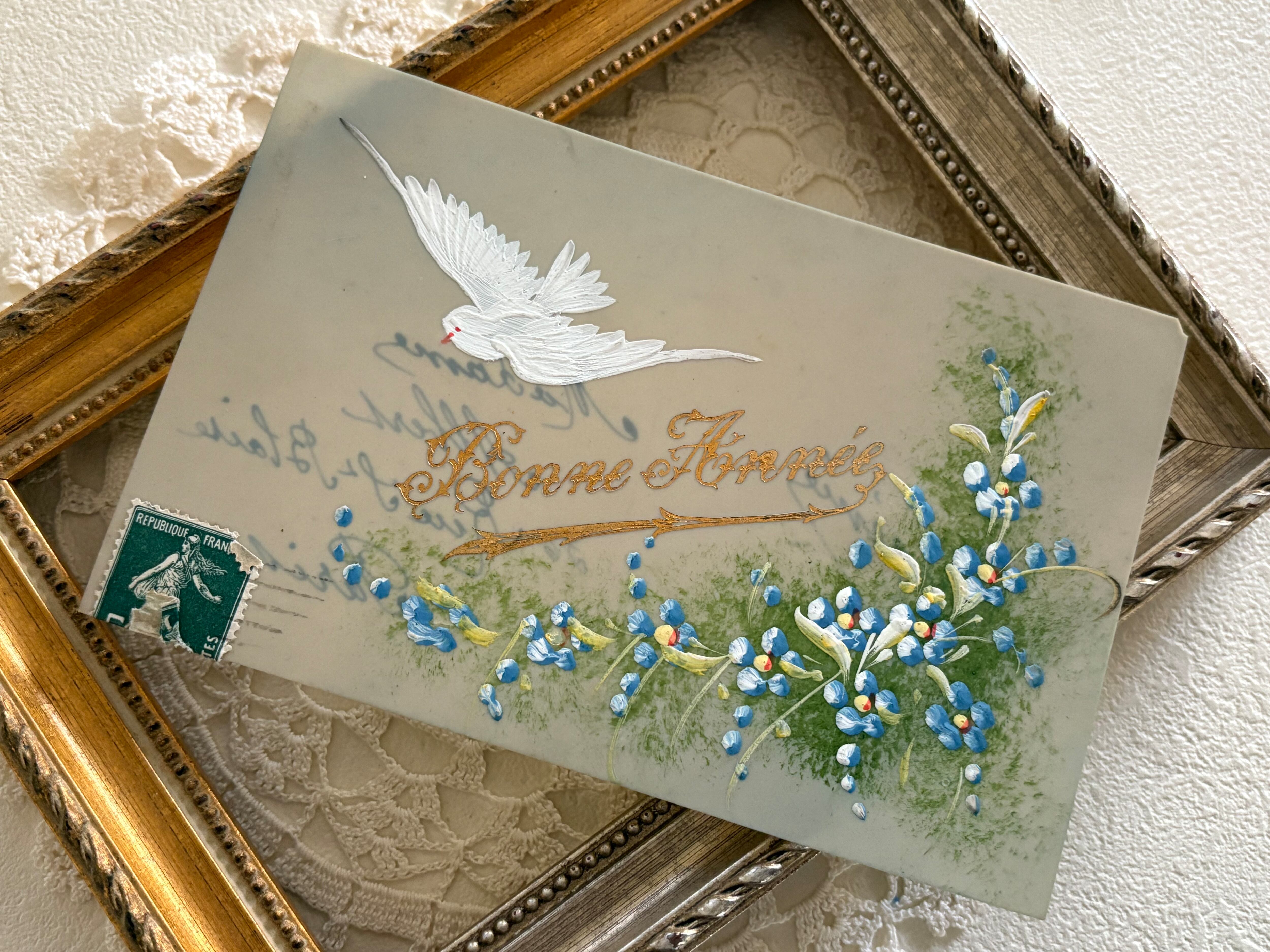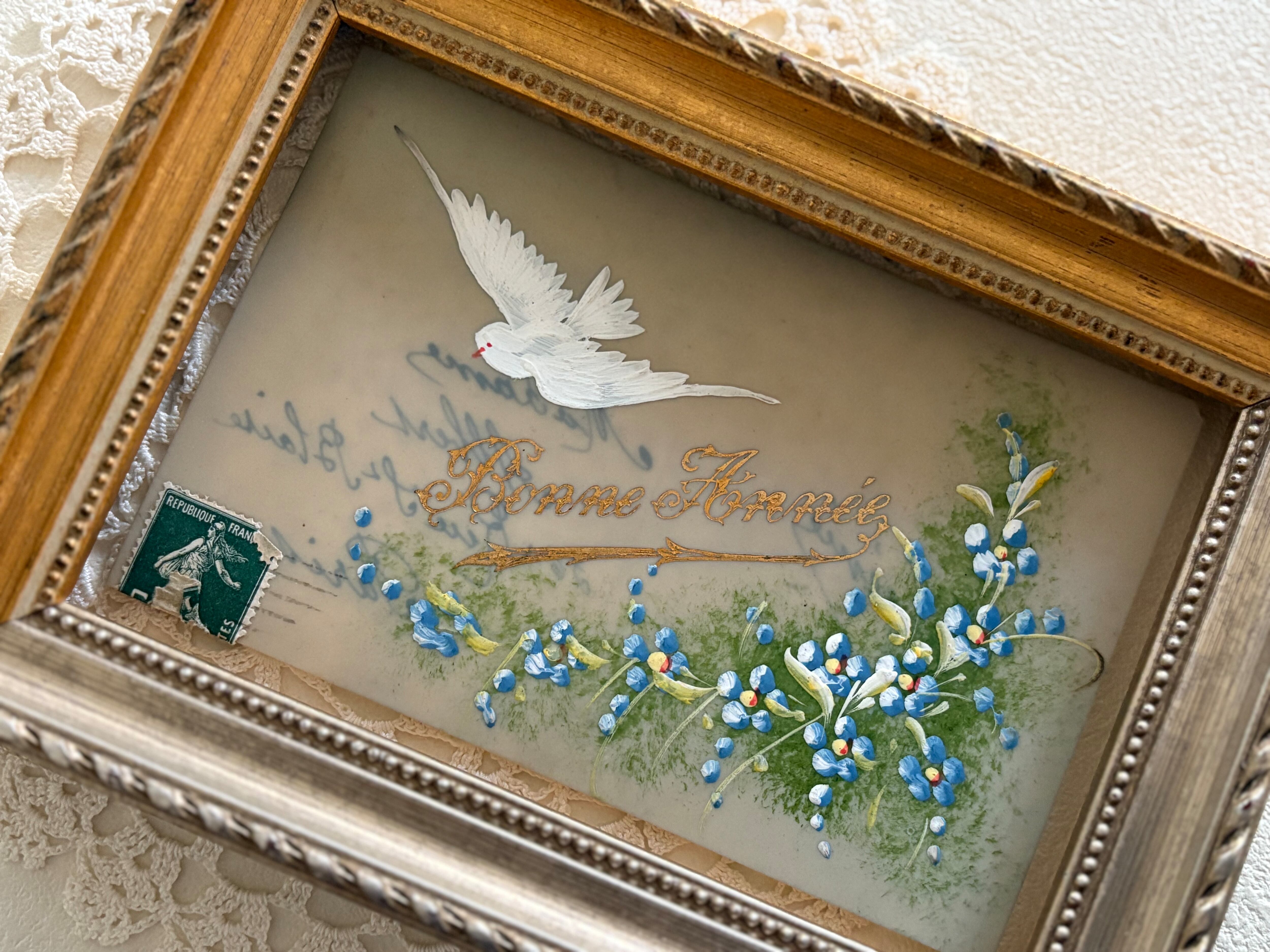 フランスアンティーク ポストカード 勿忘草 白鳩 Bonne Annee セルロイド 額装 インテリア 撮影小物 コレクション