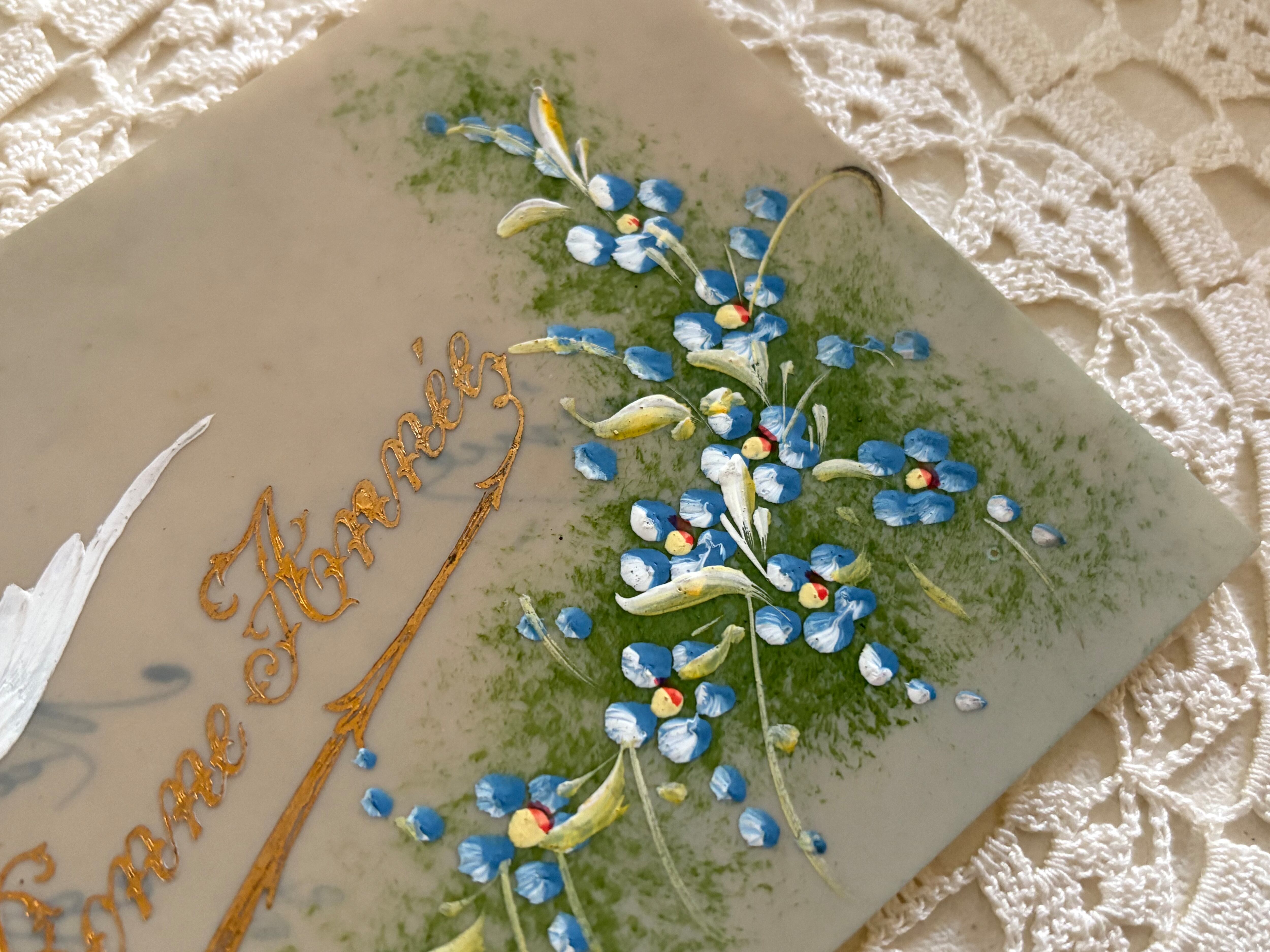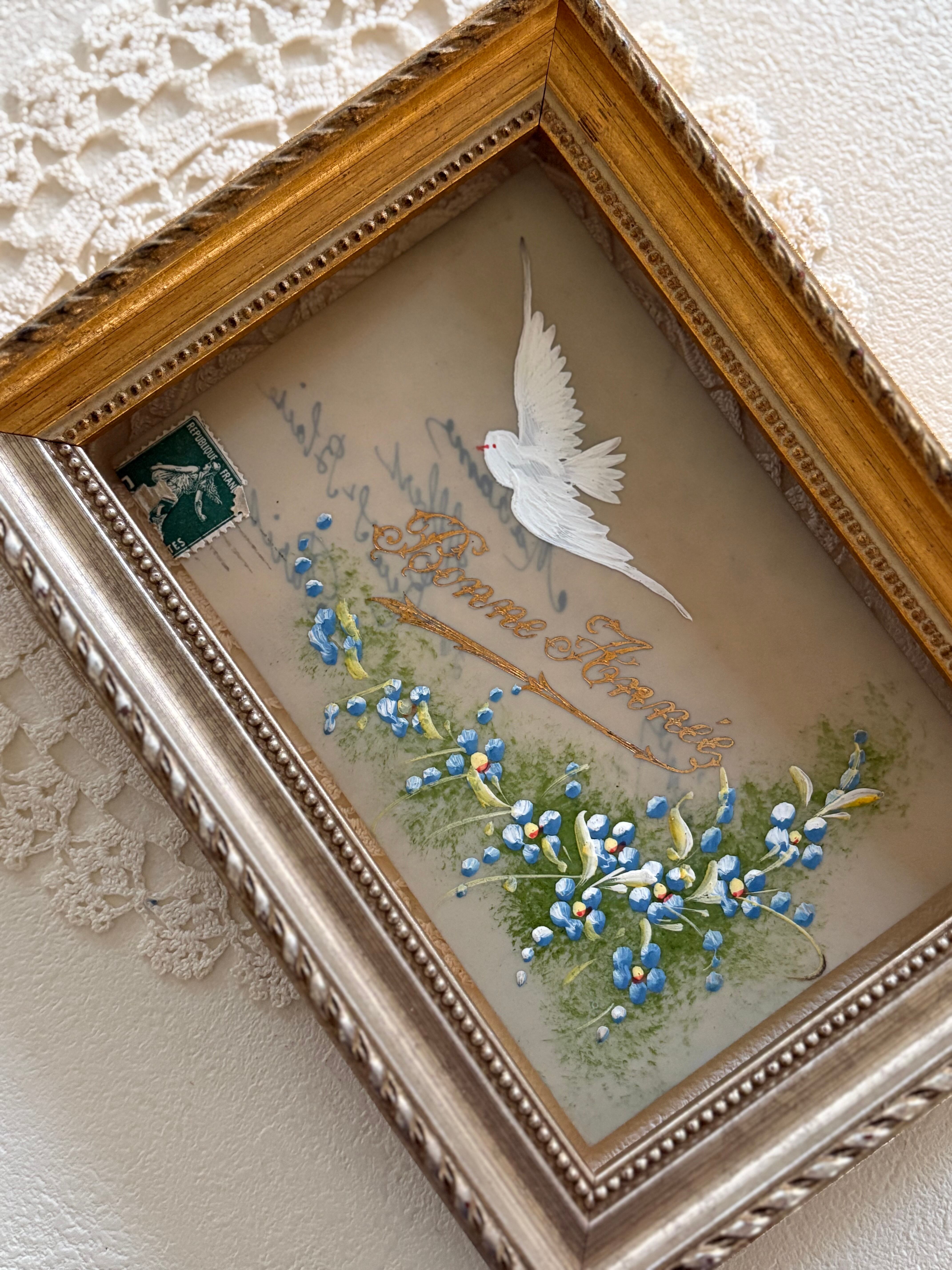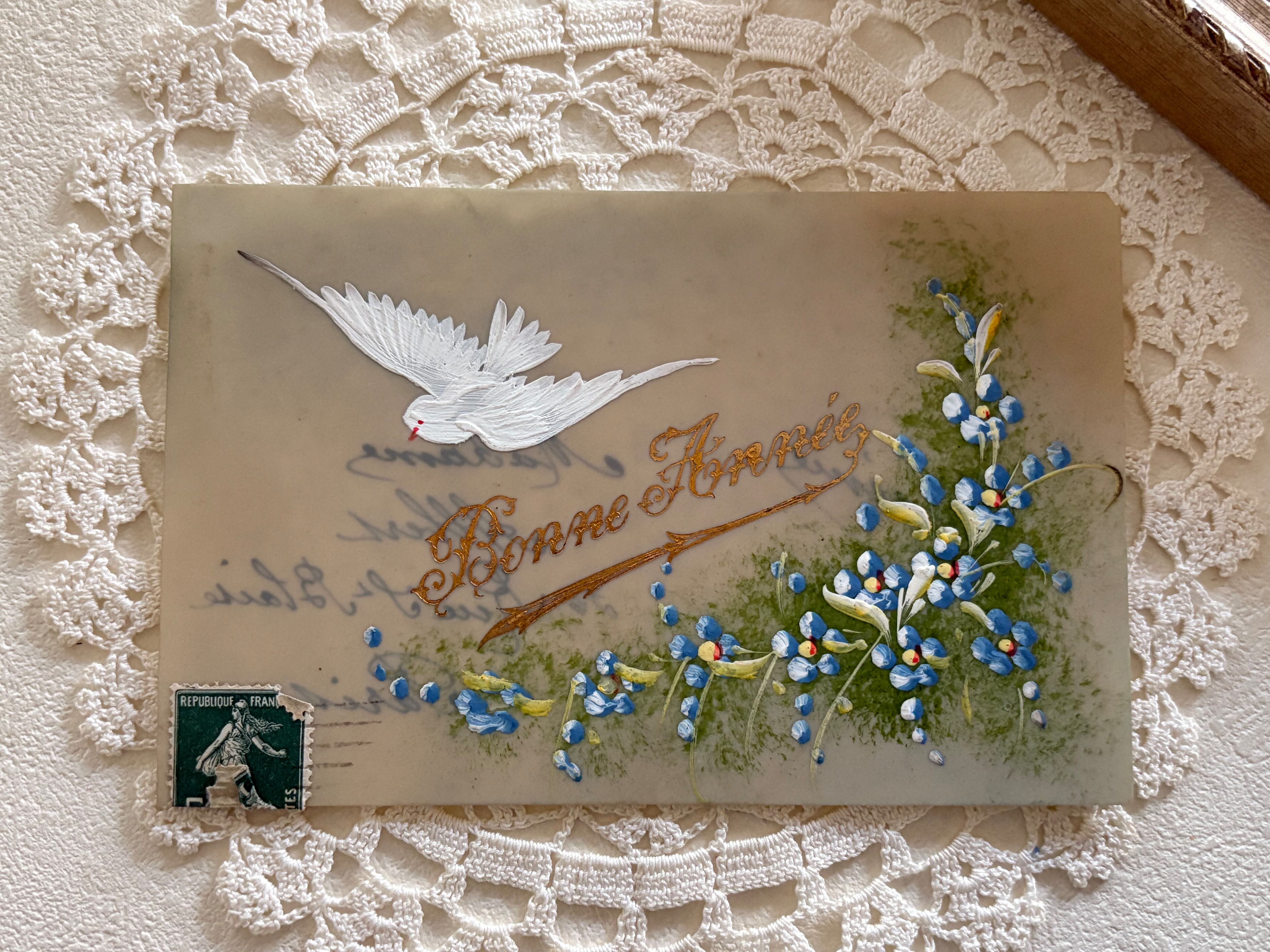 フランスアンティーク ポストカード 勿忘草 白鳩 Bonne Annee セルロイド 額装 インテリア 撮影小物 コレクション