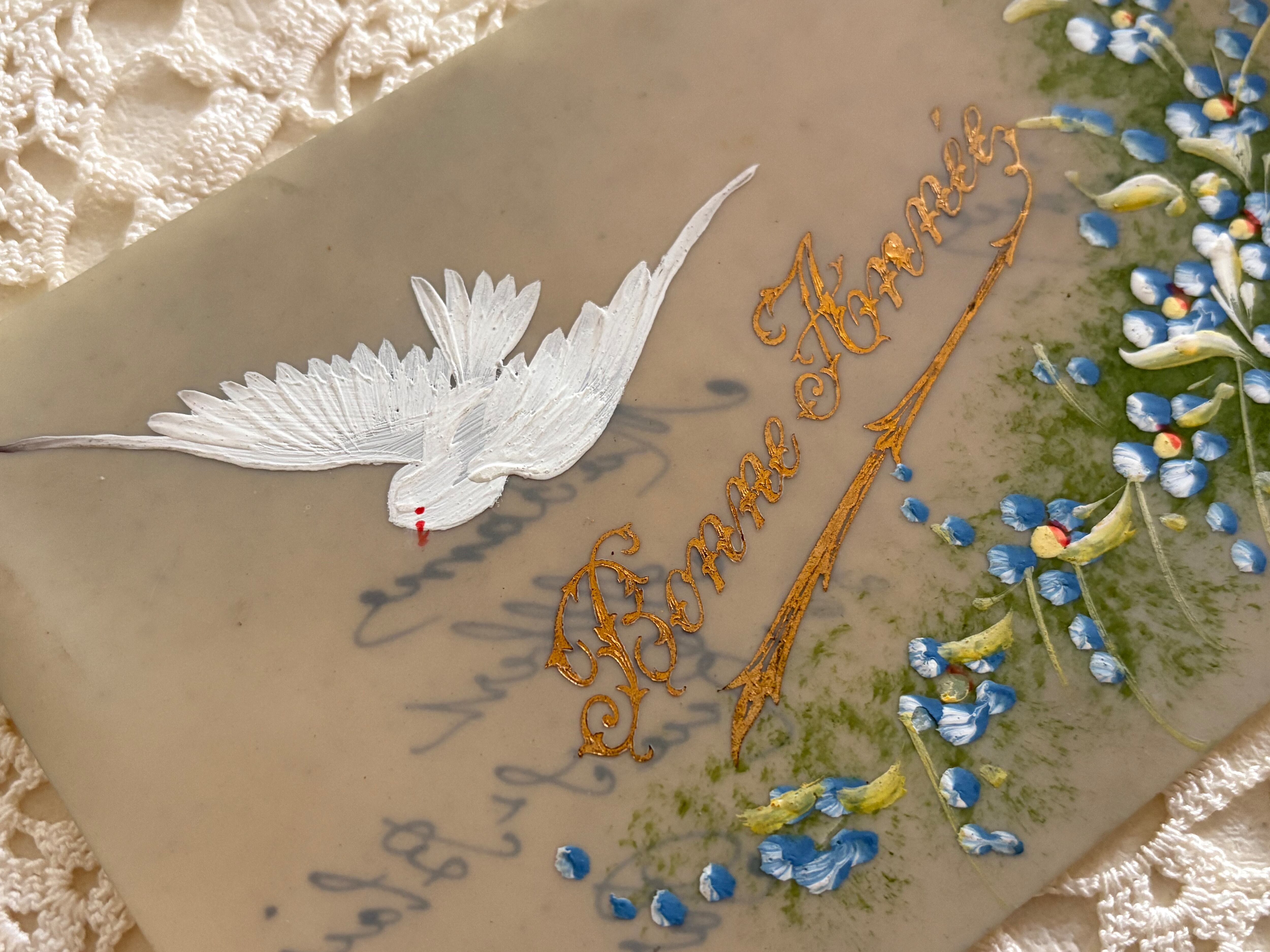 ハンドペイントで繊細なタッチで勿忘草、白鳩が描かれています。