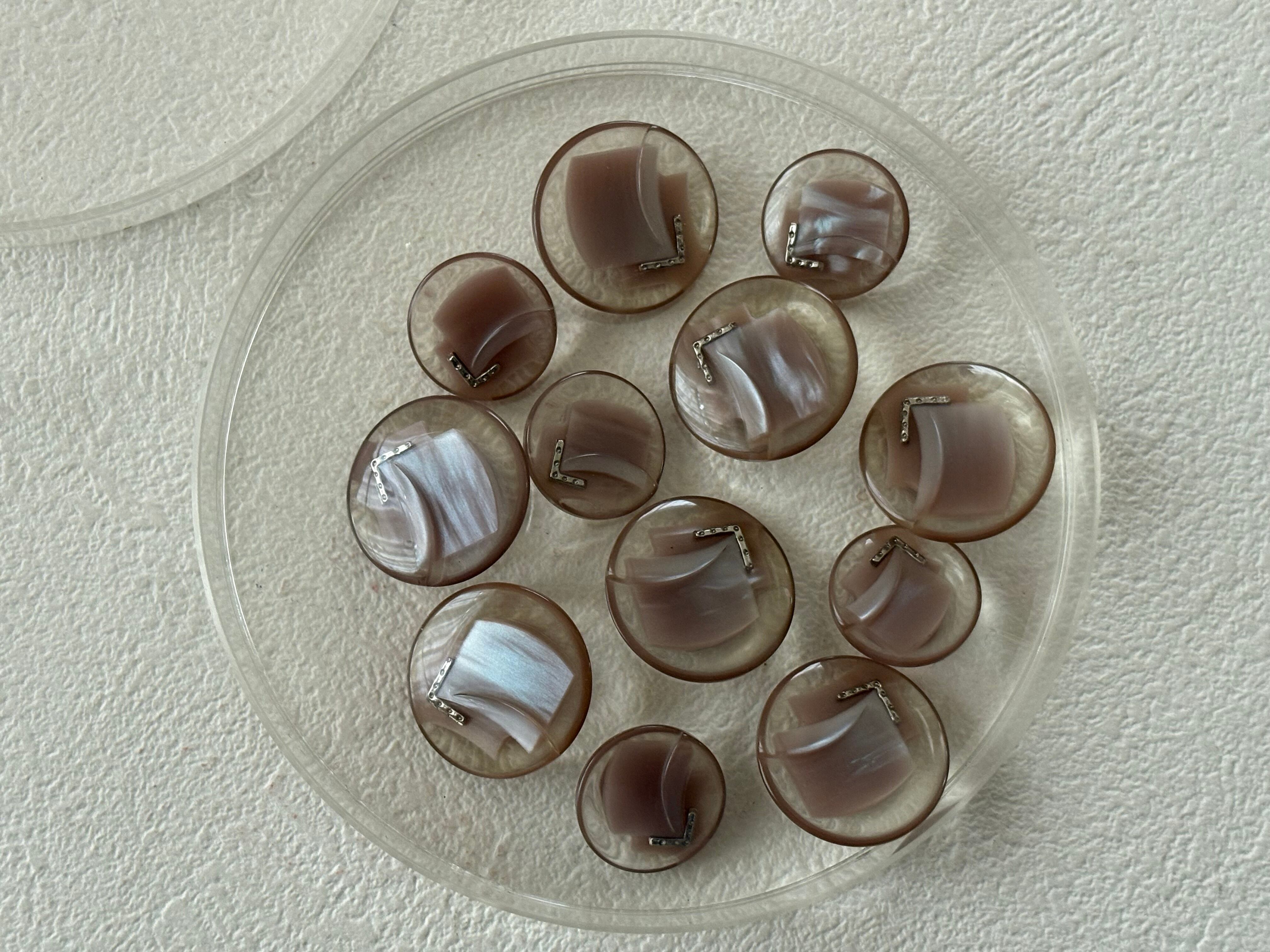 クリアカラーに艶やかでシェルのような輝きのくすみピンク、くすみパープルのような色合いのボタン。