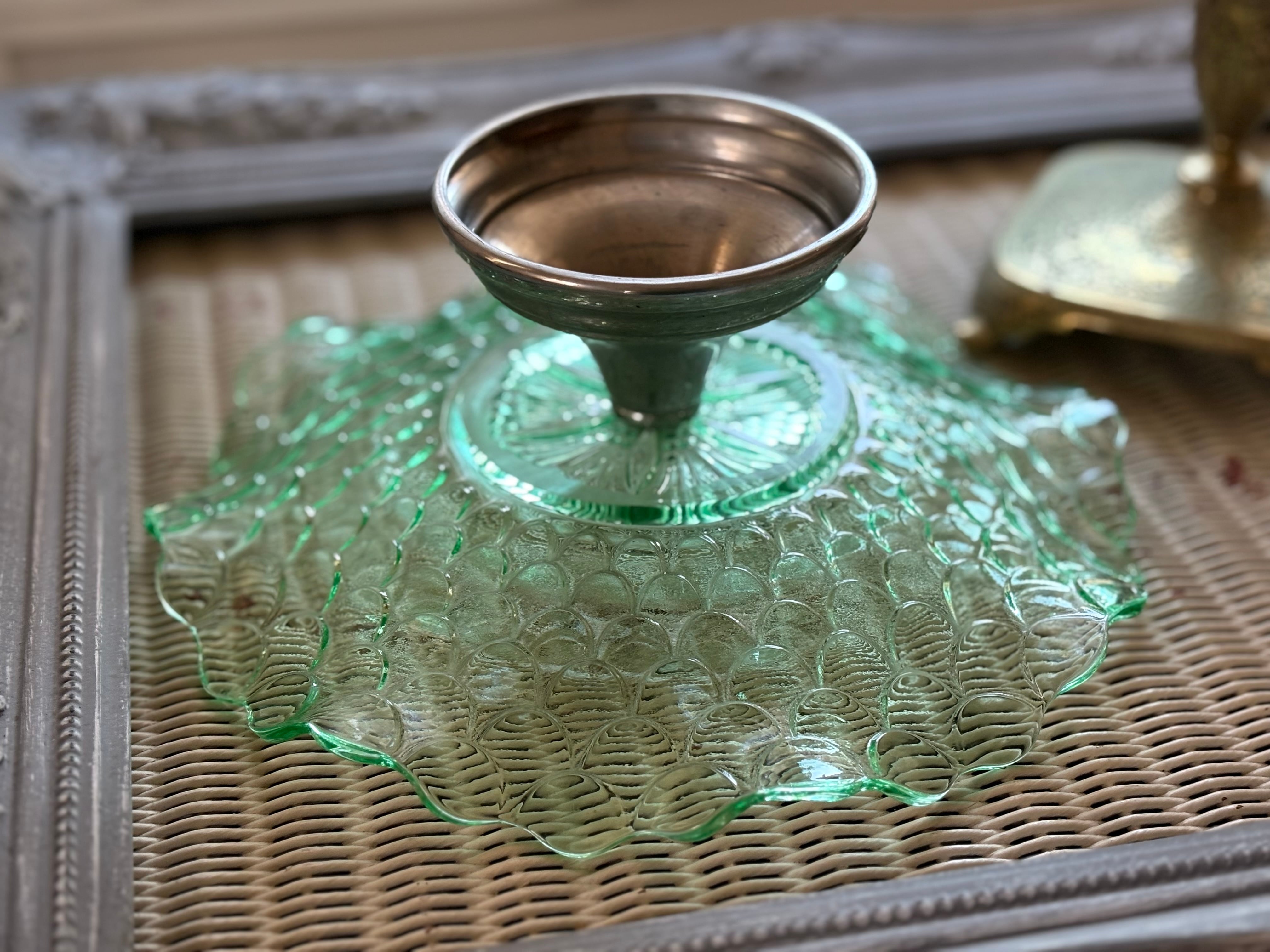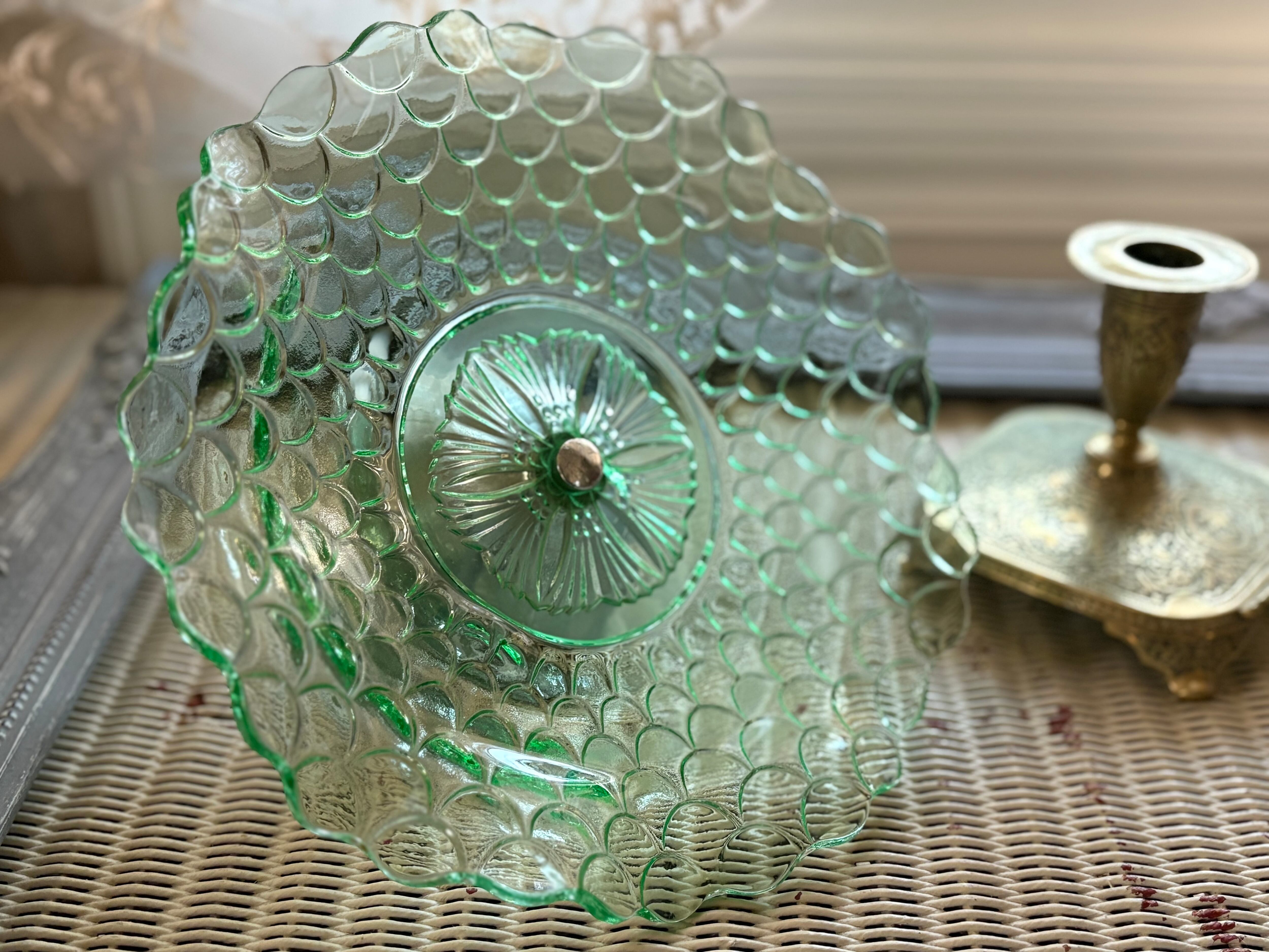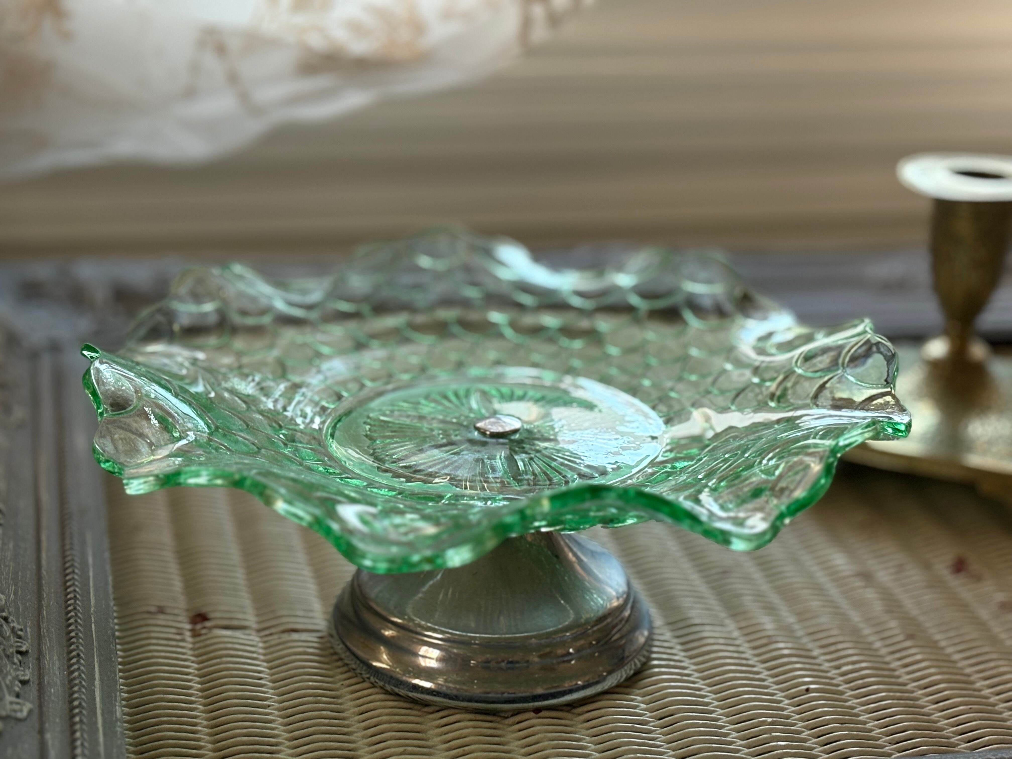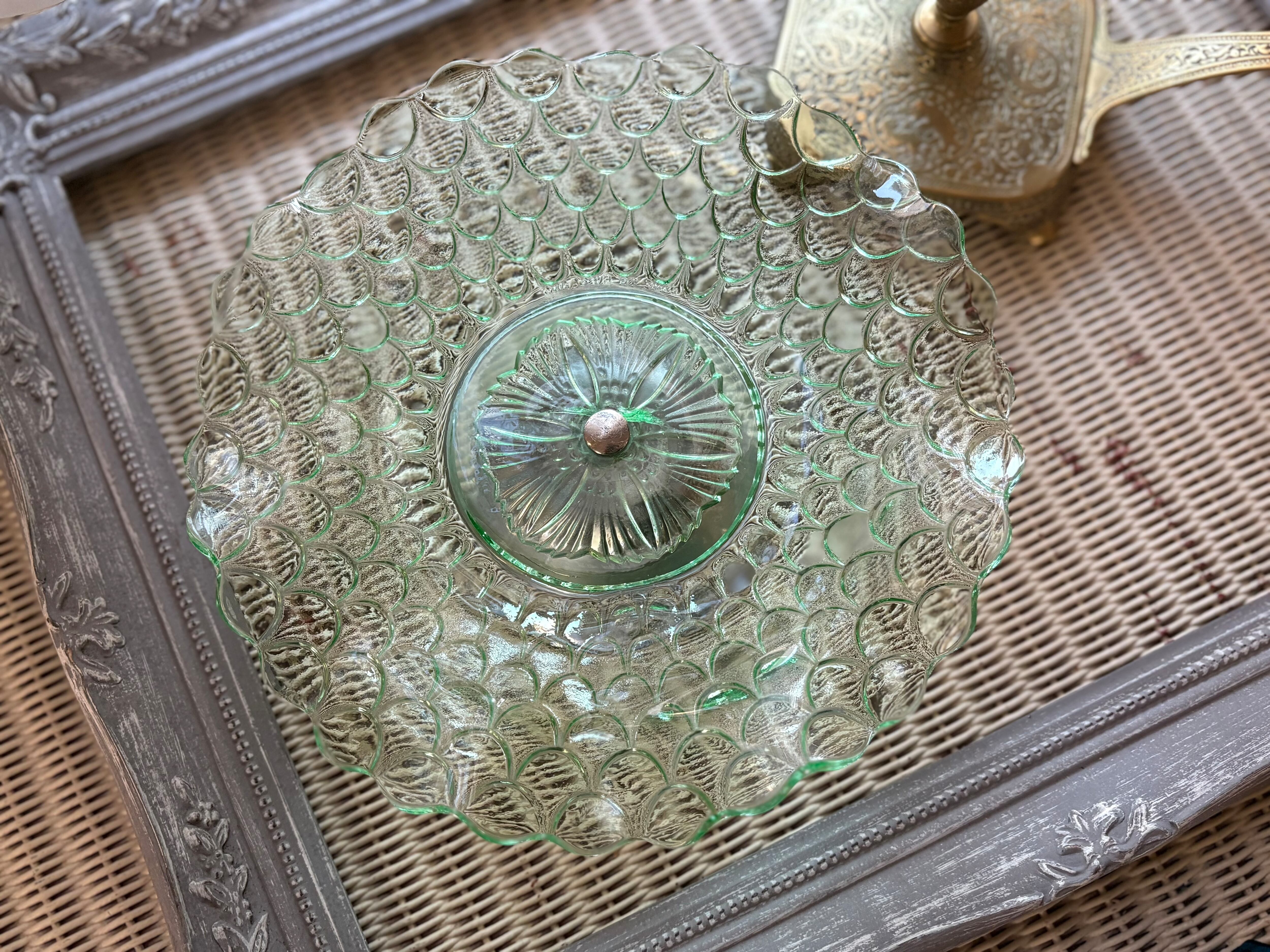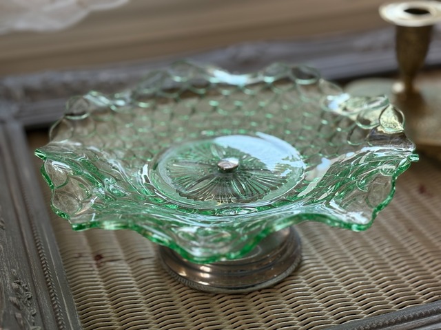 英国アンティーク グリーン グリーンガラスのケーキスタンド コンポティエ 緑色 1940年代 インテリア小物 撮影小物 店舗什器