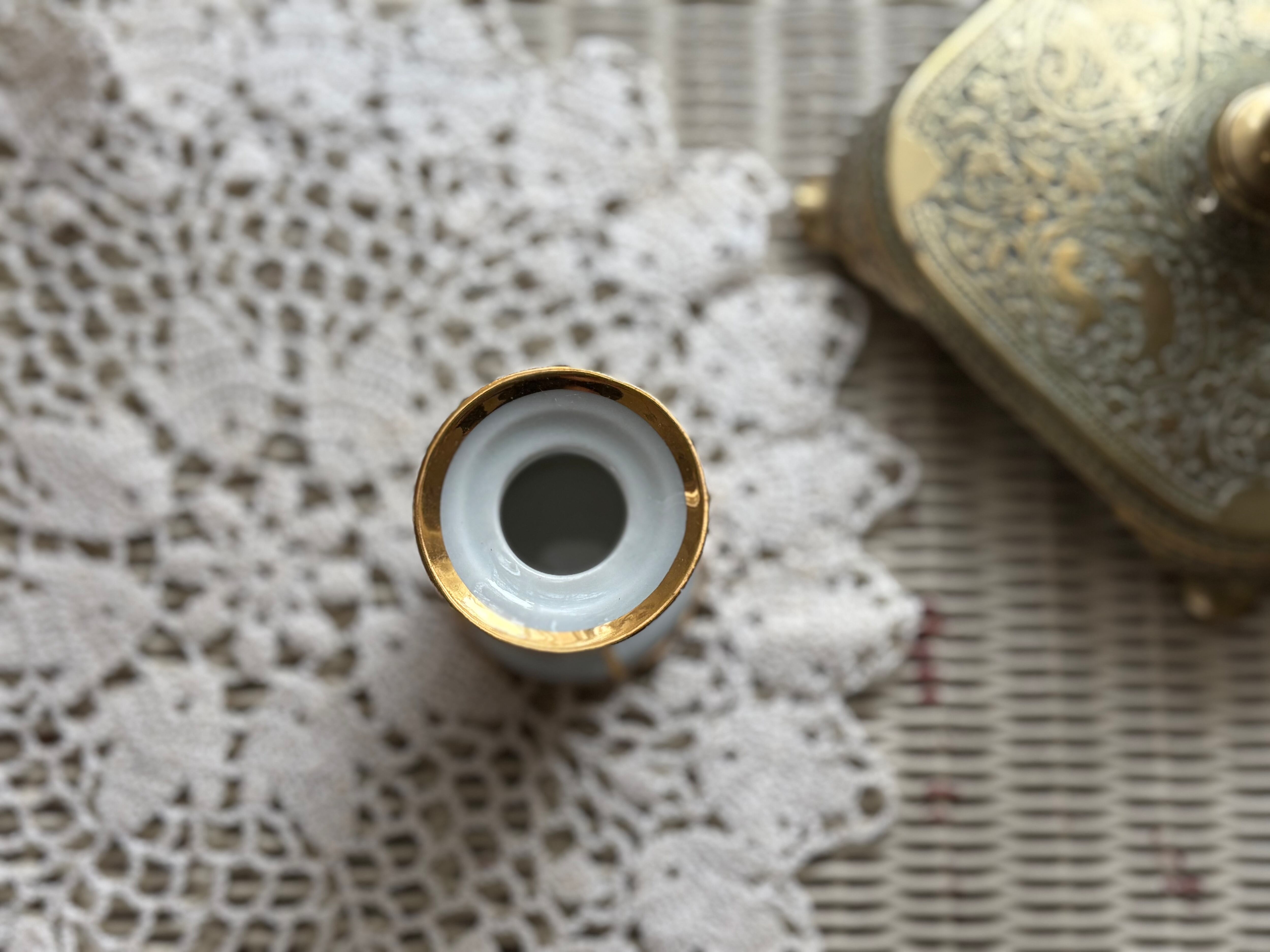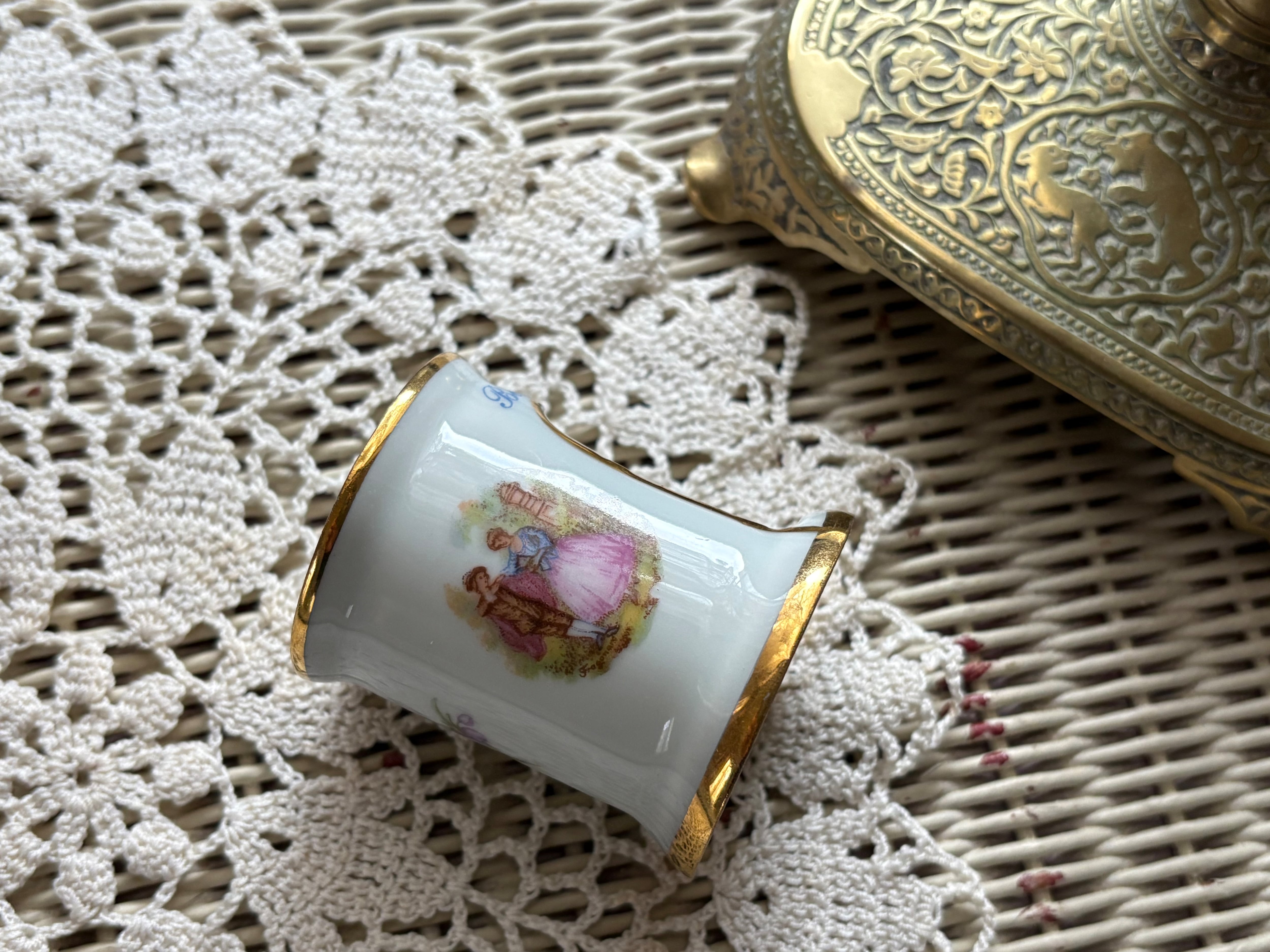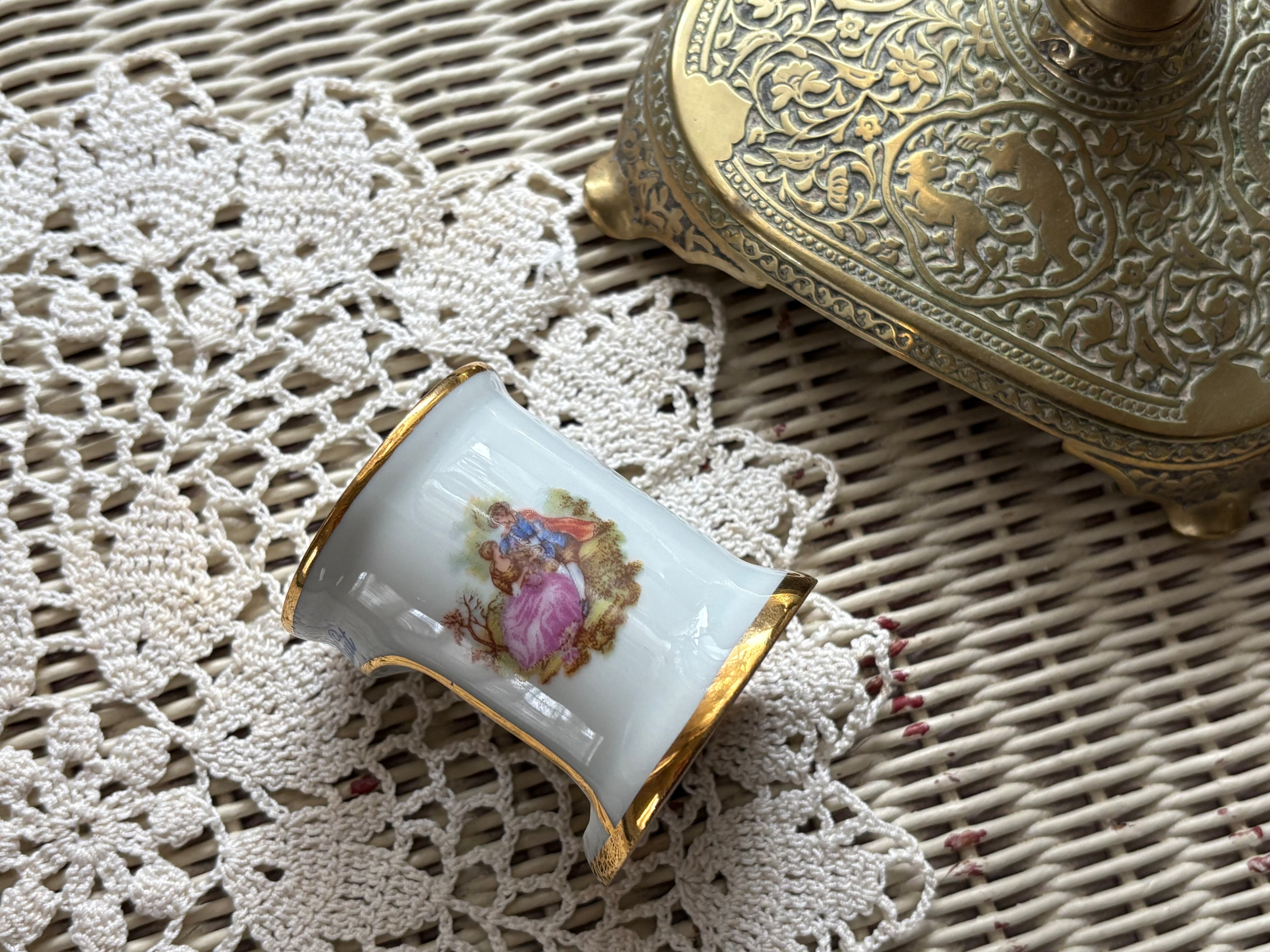 表面には画像の様なフラゴナールのカップル画がモチーフになっています。金彩が美しくミニチュアながらに華やかで目をひくデザイン。