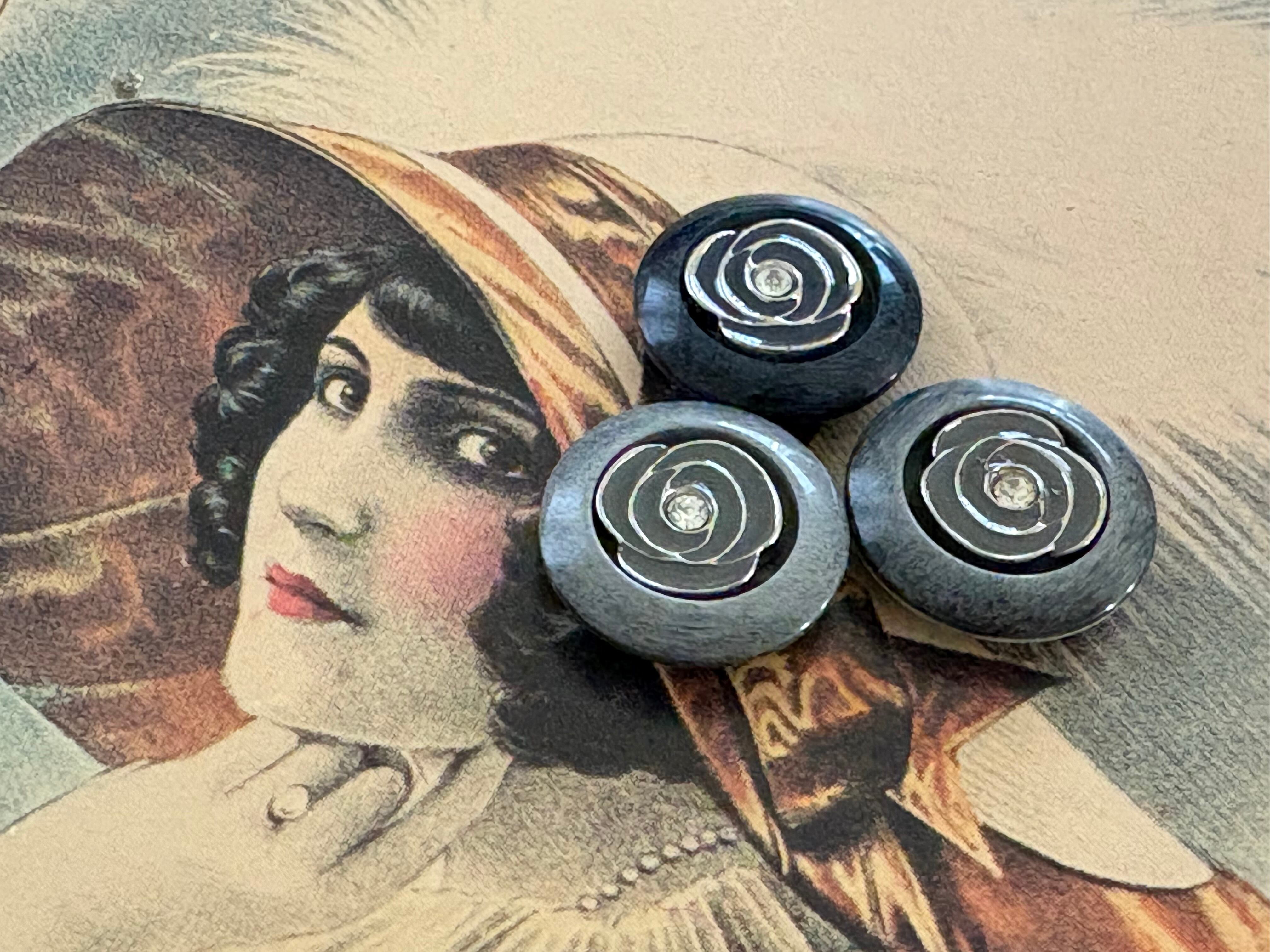 ネイビーブルー、グレーのボタンの中央にRoseフラワーパーツが設置されています。
