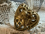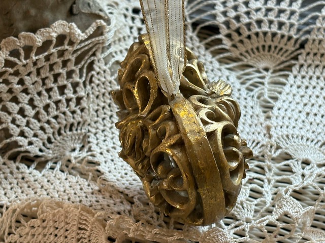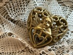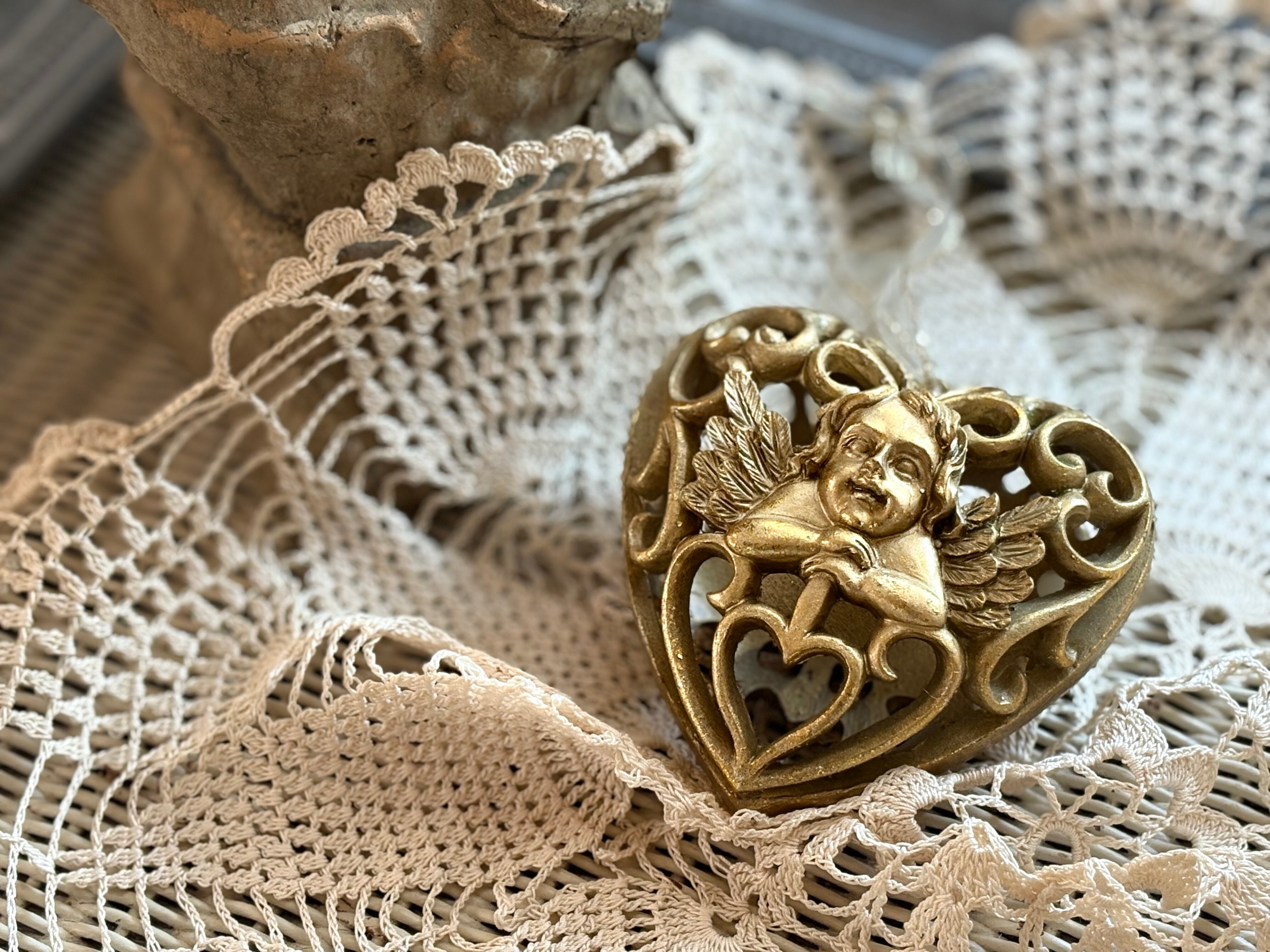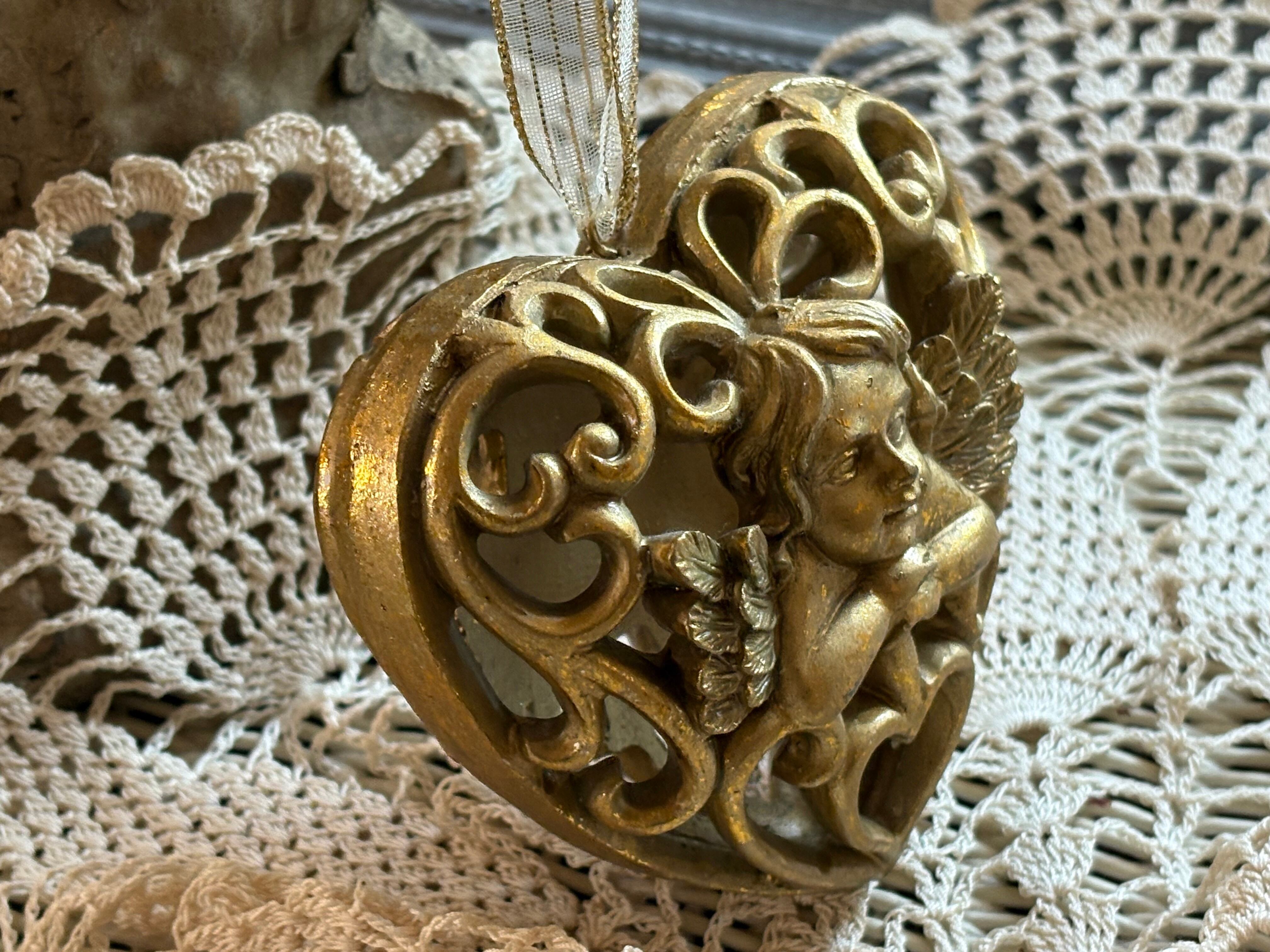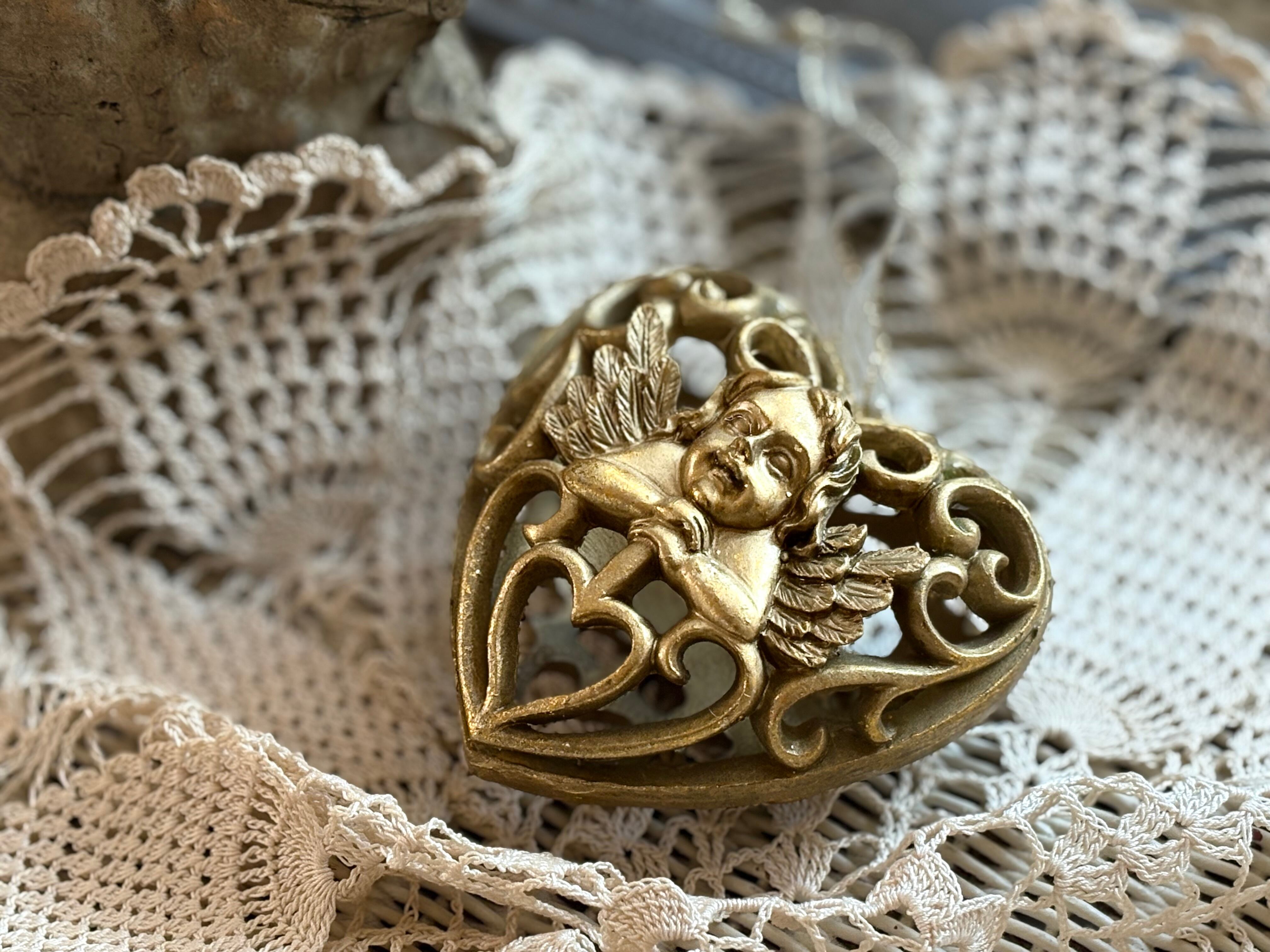 ゴージャスなゴールドカラー、ハート型の透かしの天使のオーナメントになります。
