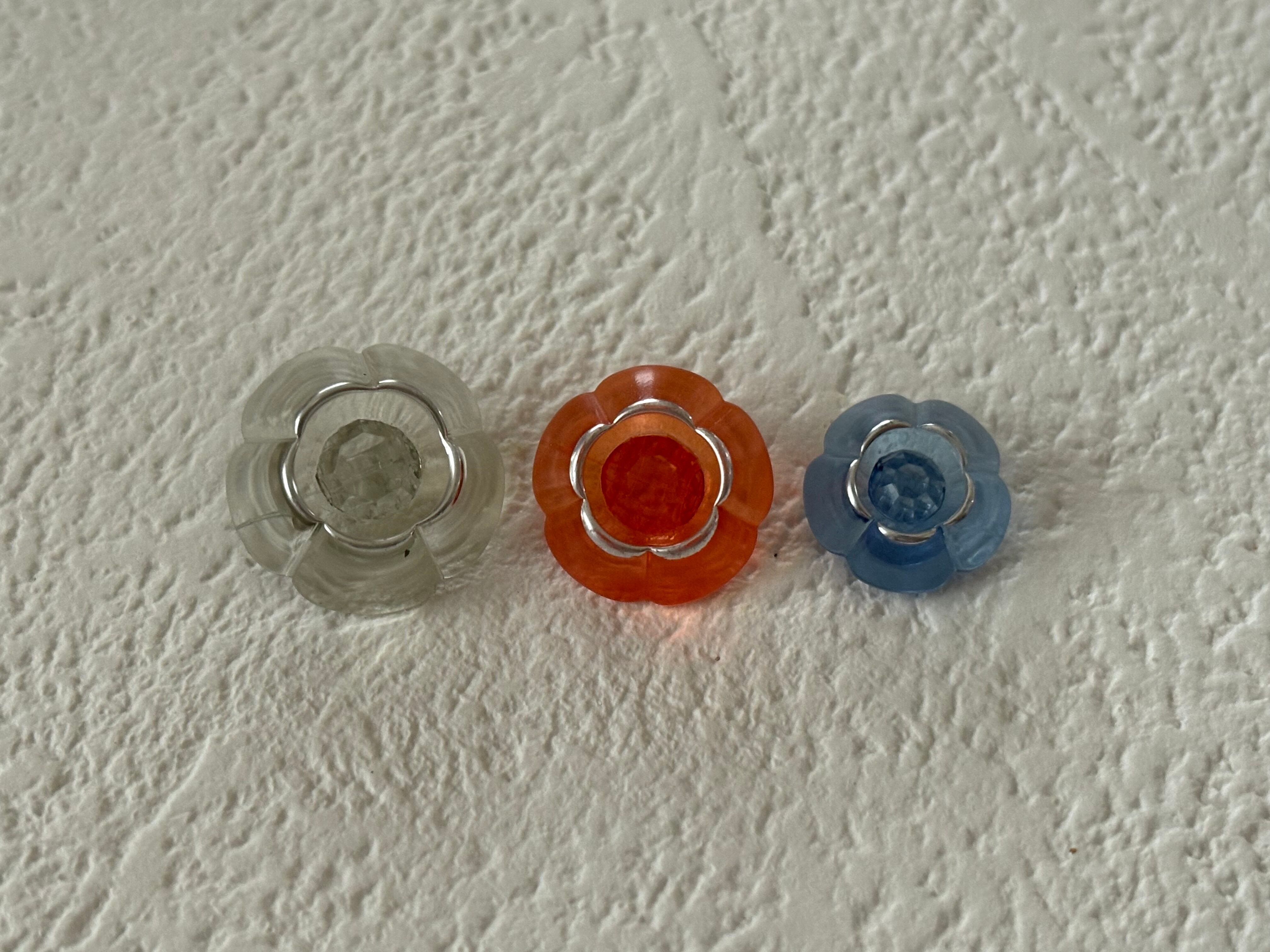 クリアなレッド、クリア、ライトグレー、ブルーグレー。光に当たるとレトロ可愛く輝きます。
