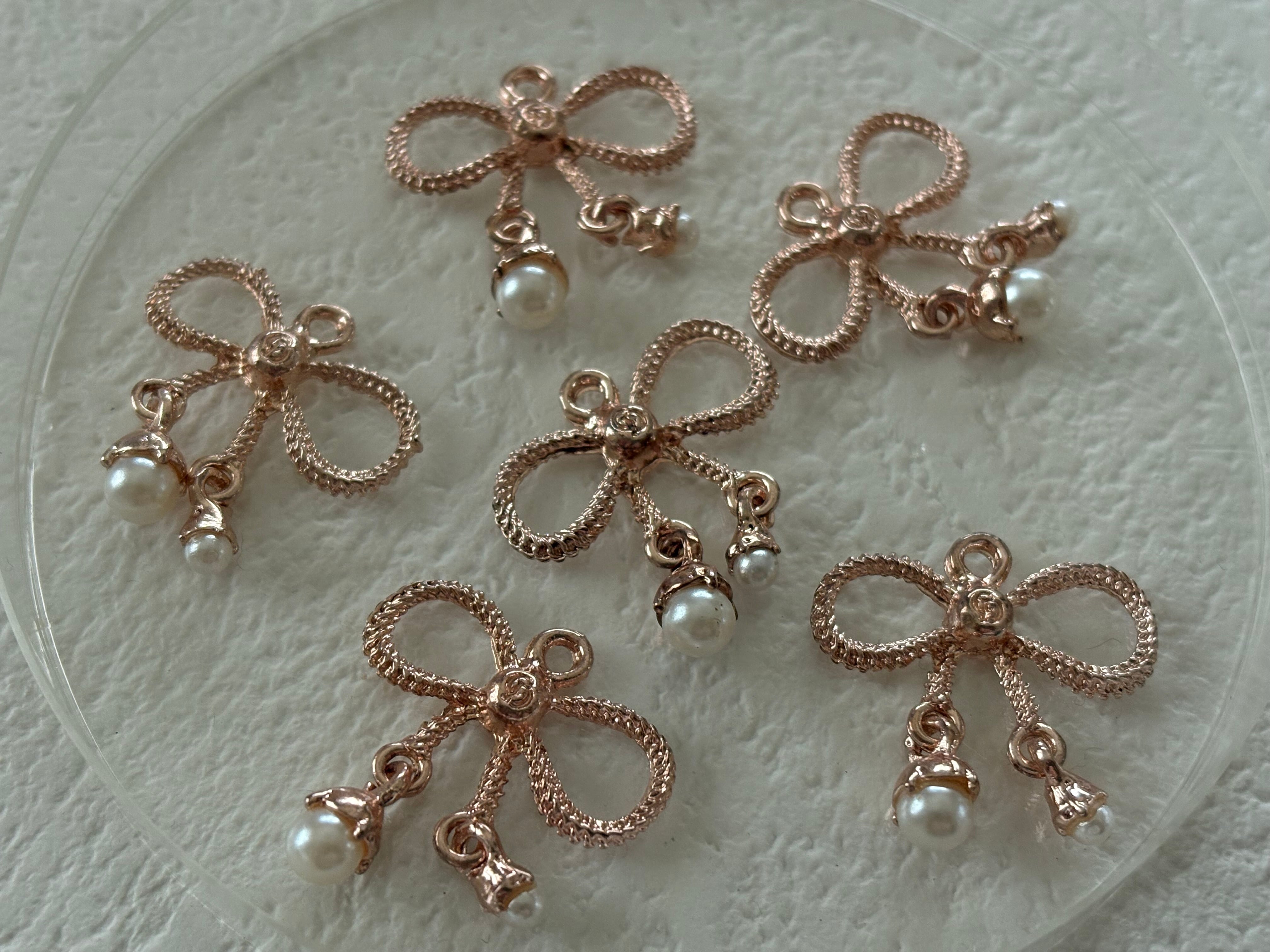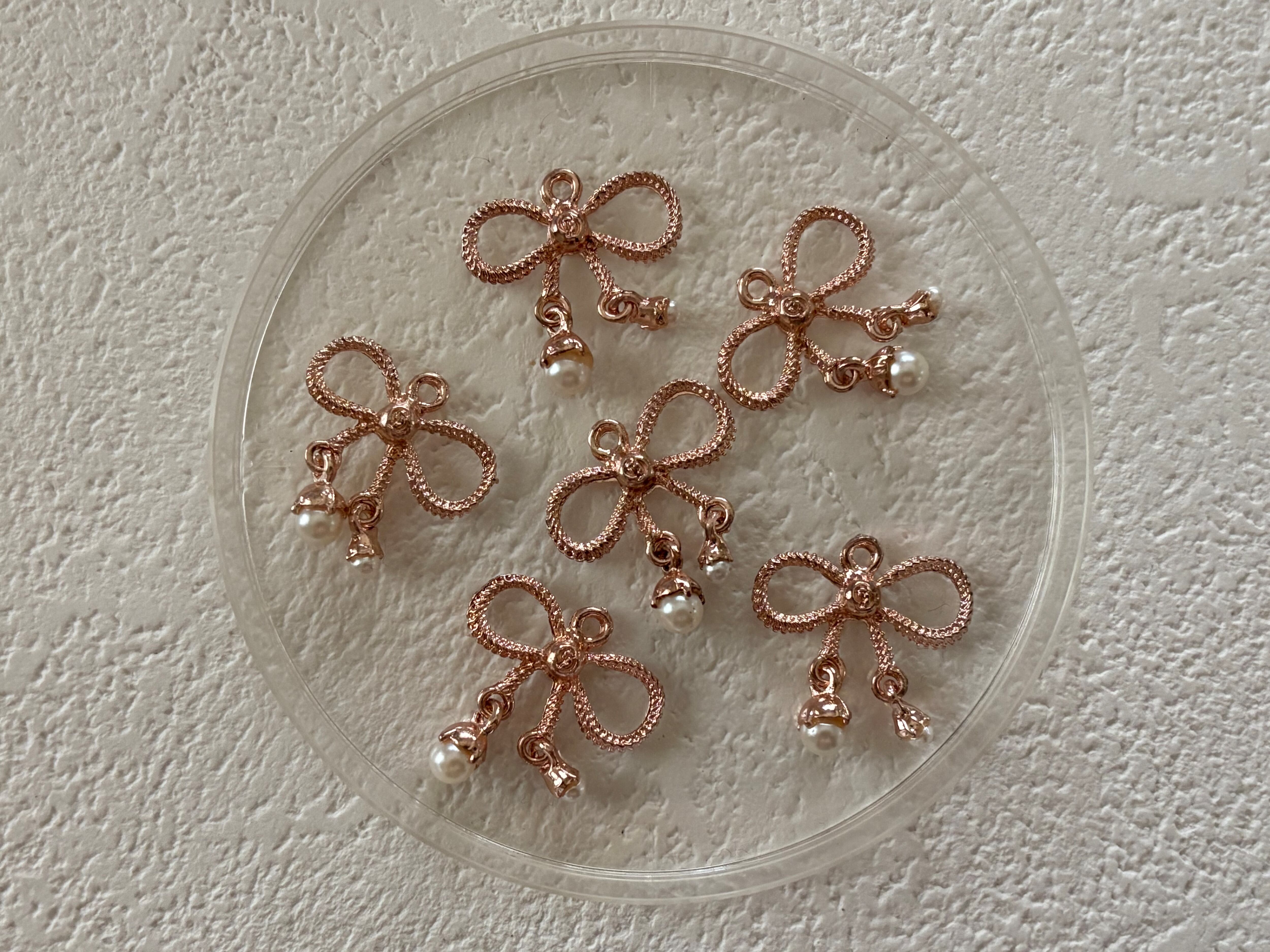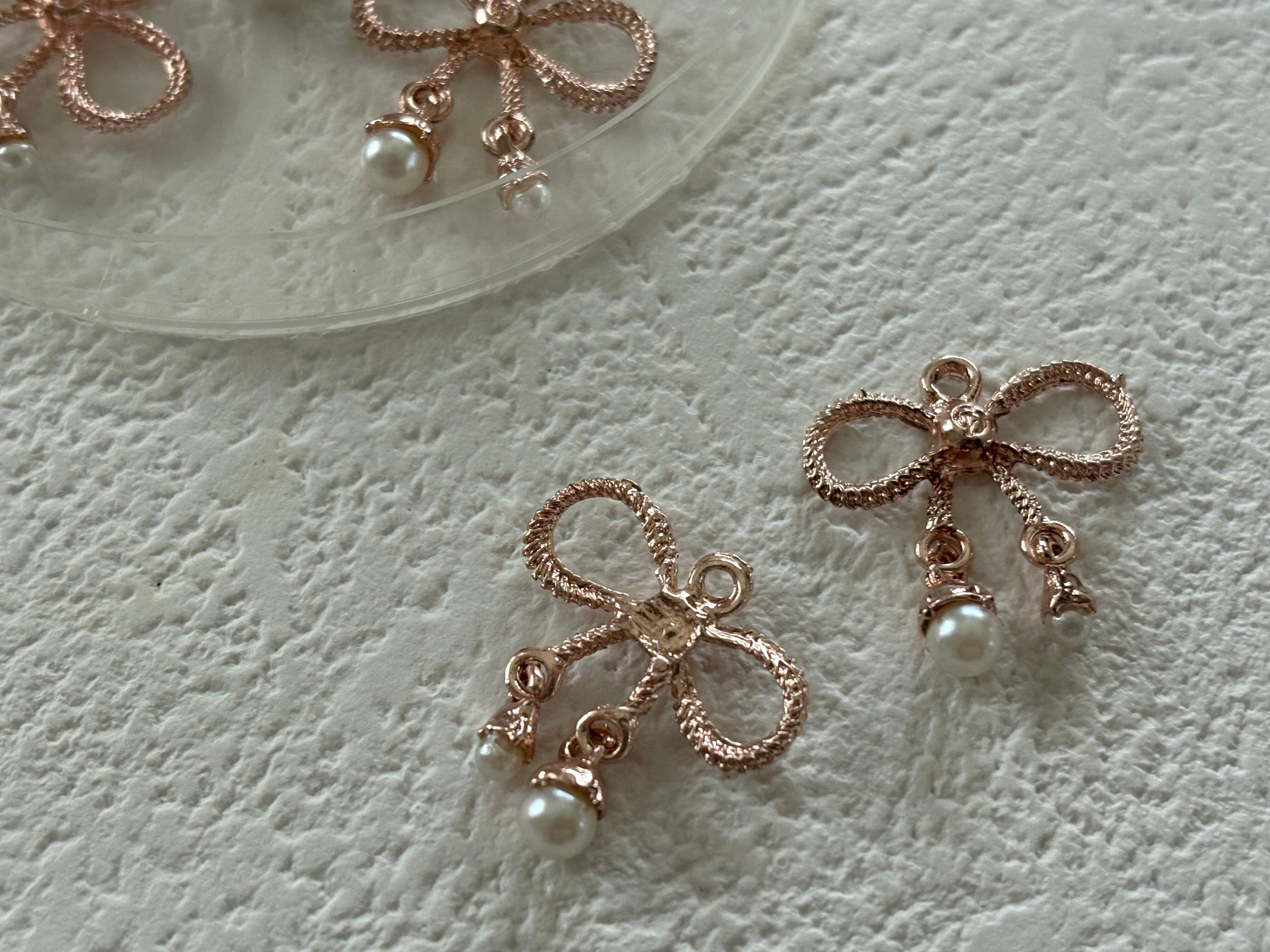 輸入デザインパーツ メタル製 リボン型チャーム Ruban. ピンクゴールド パール調ビーズ アクセサリーパーツ デコレーション材