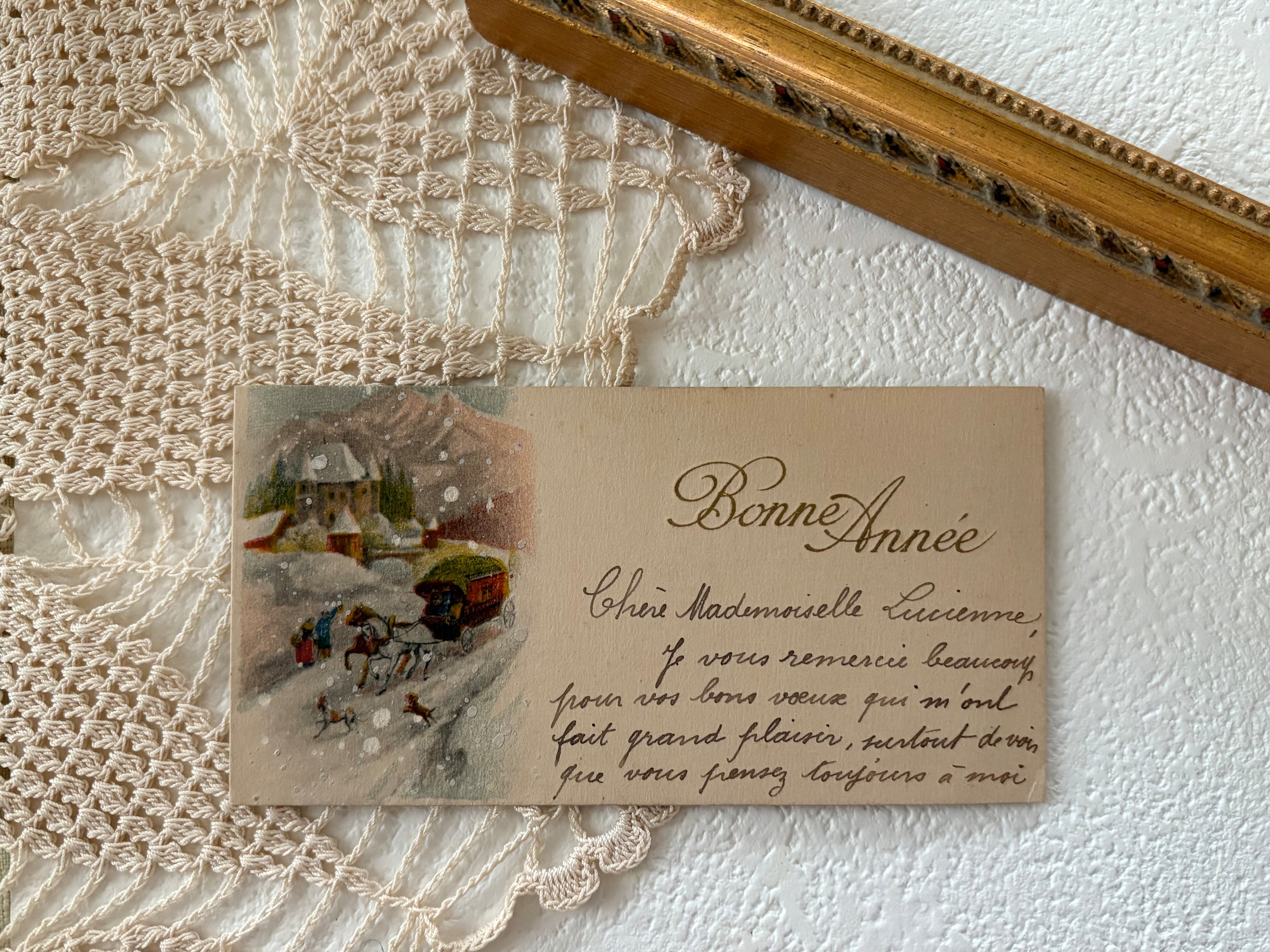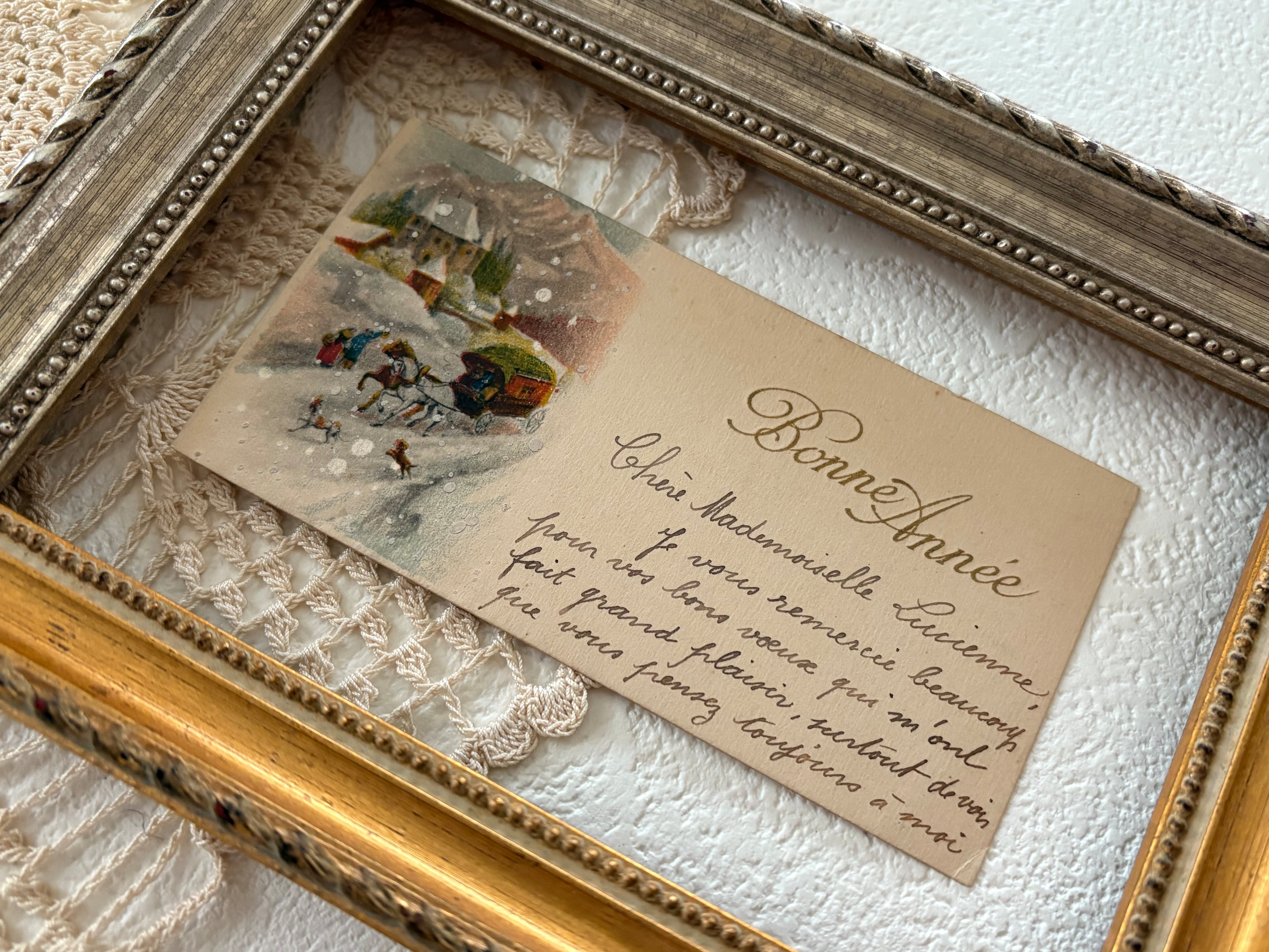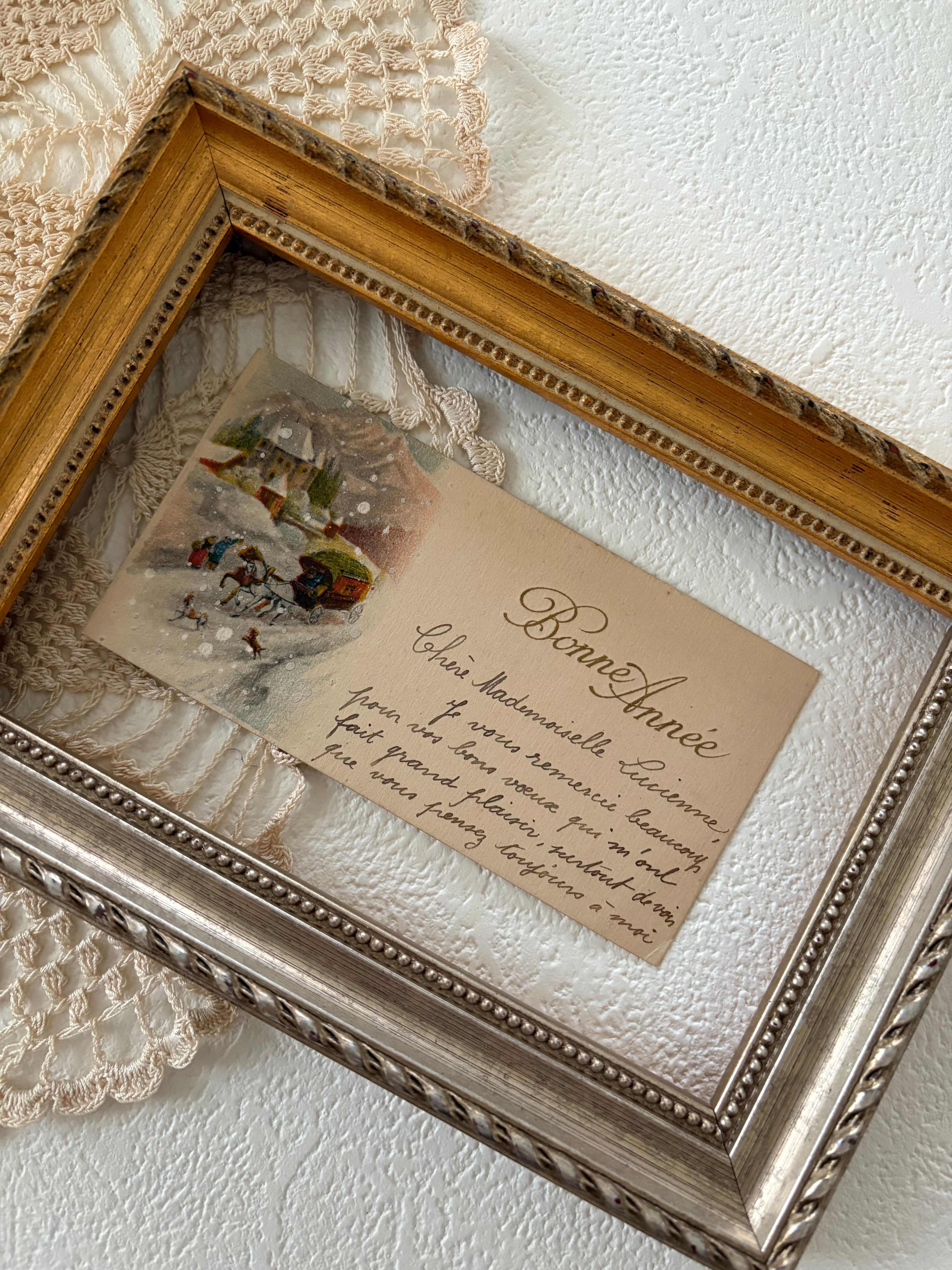 アンティークメッセージカード Bonne Anee 農村の雪景色 フランス 額装 インテリア小物 コレクション