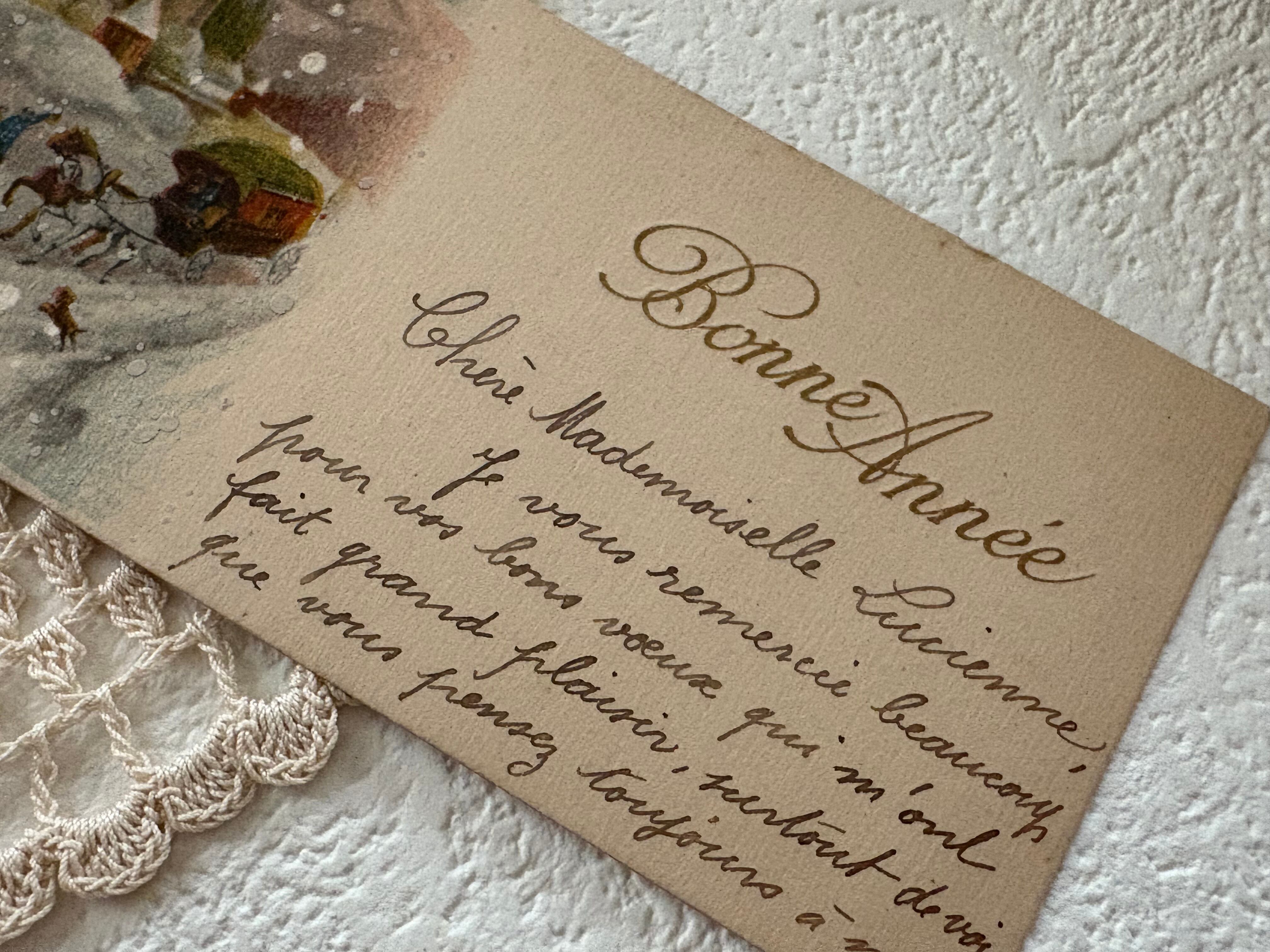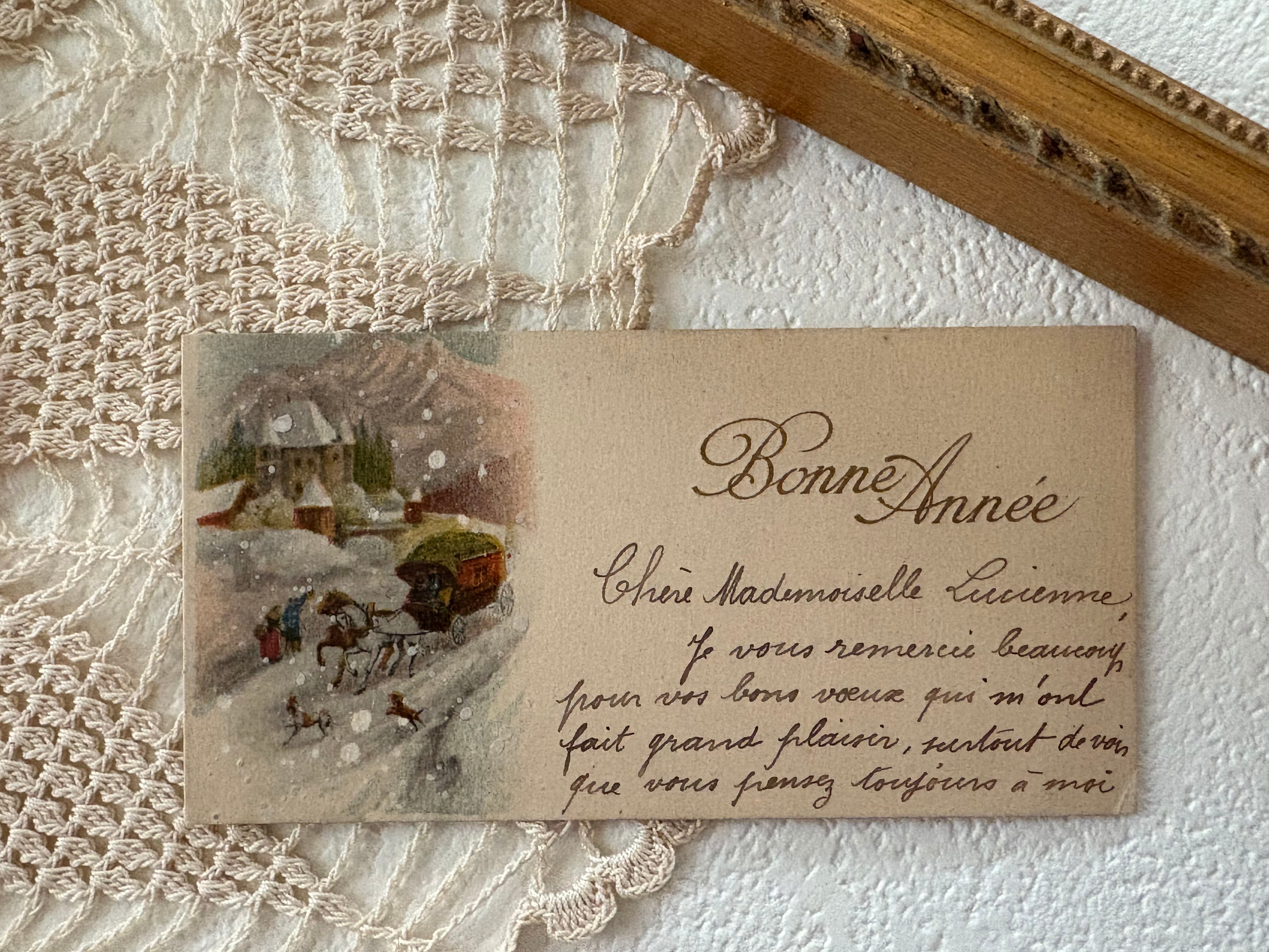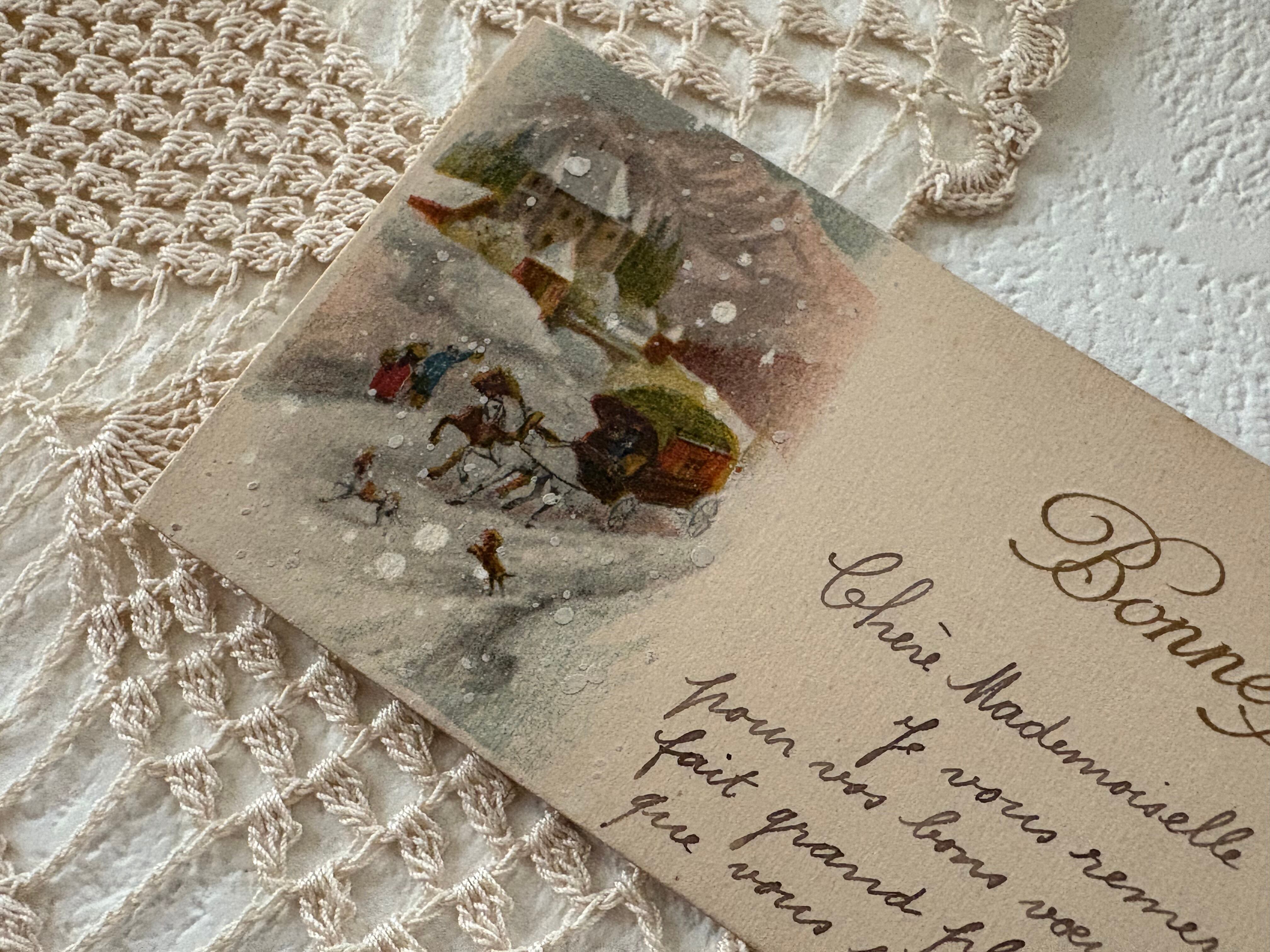 アンティークメッセージカード Bonne Anee 農村の雪景色 フランス 額装 インテリア小物 コレクション