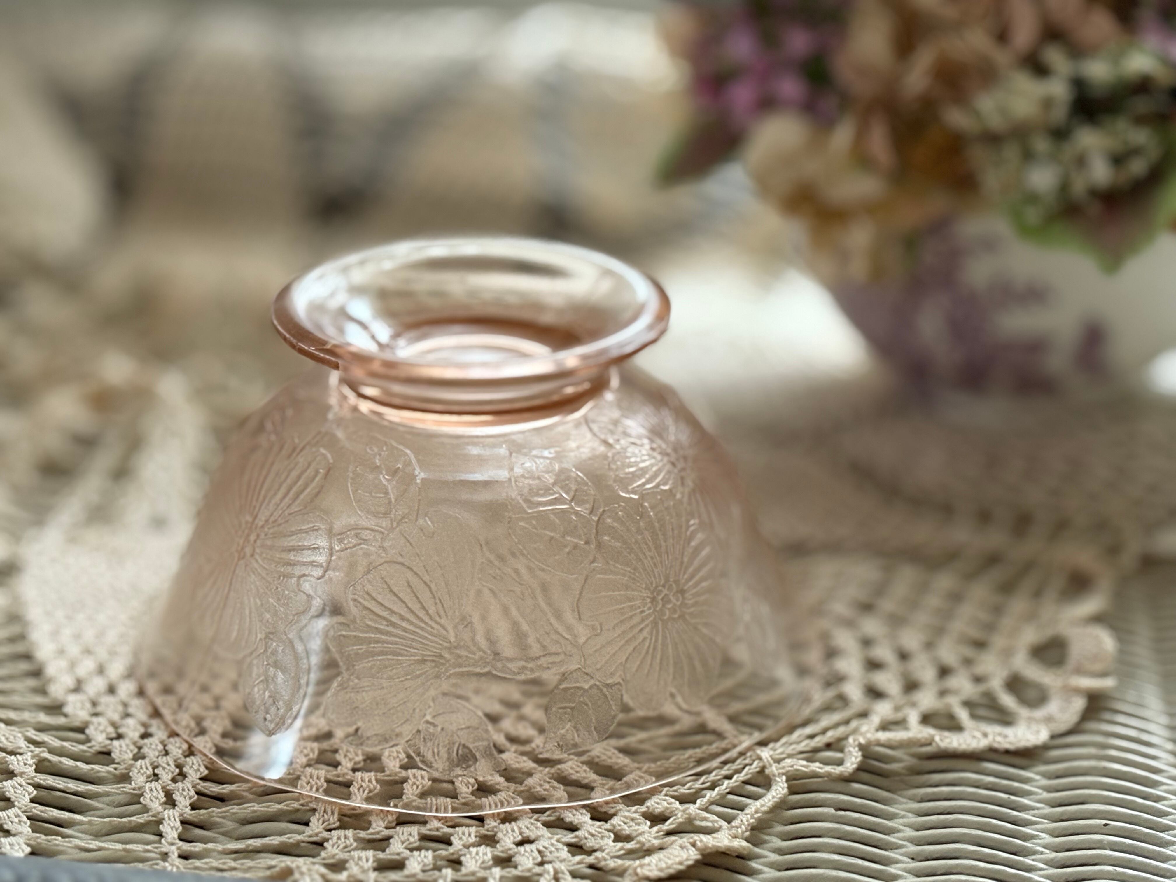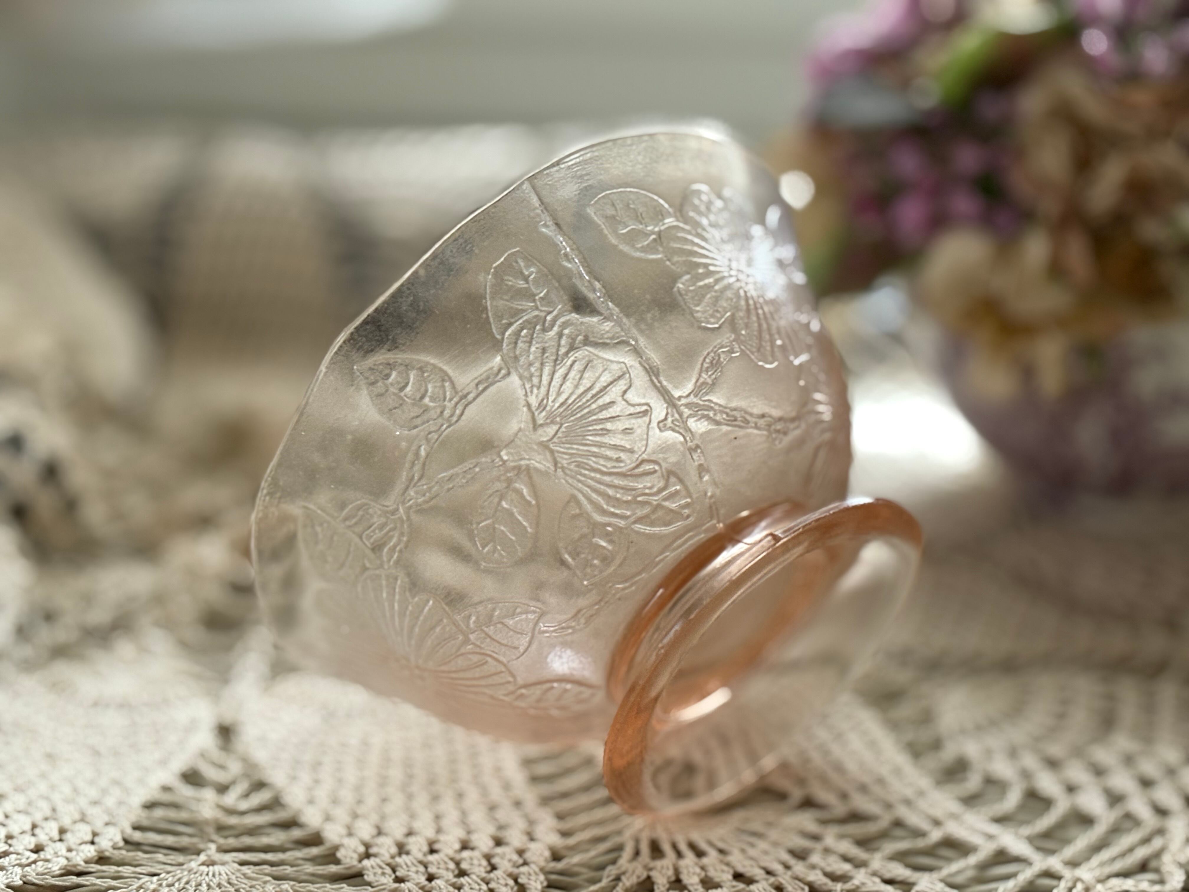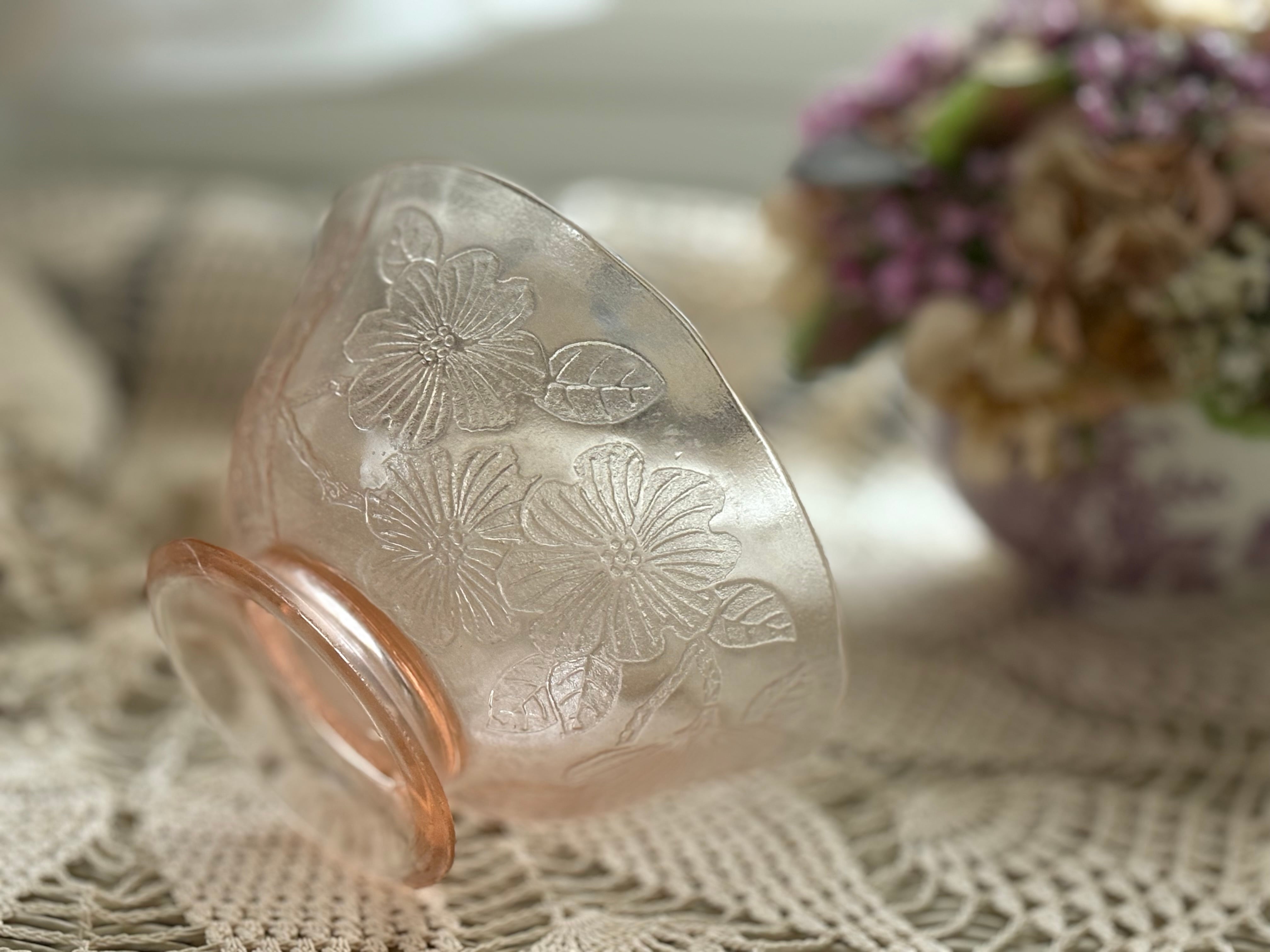 ディプレッションとは不況を意味する言葉ですが、そんな名前とは相反した美しいハナミズキの花柄がエンボス加工された可愛いピンク色のガラス器。