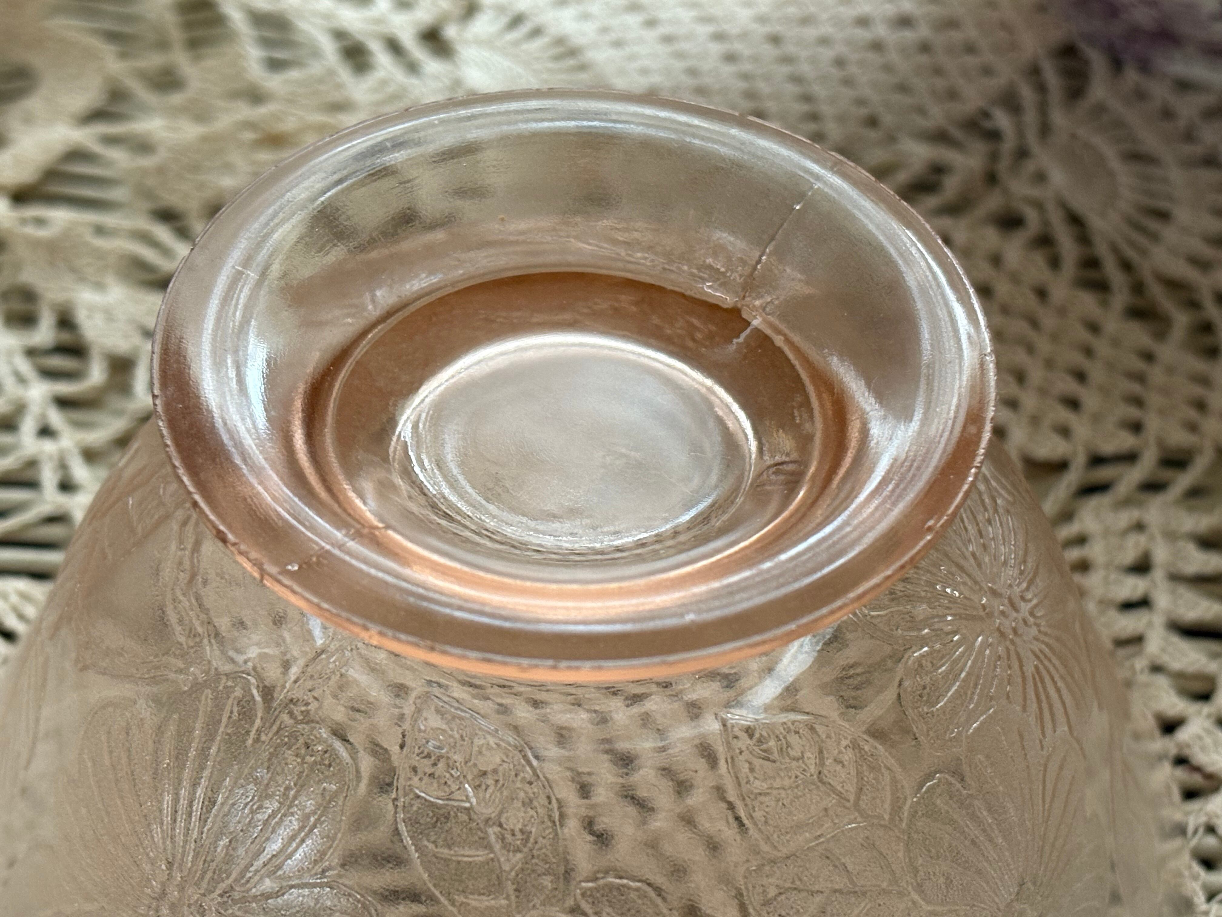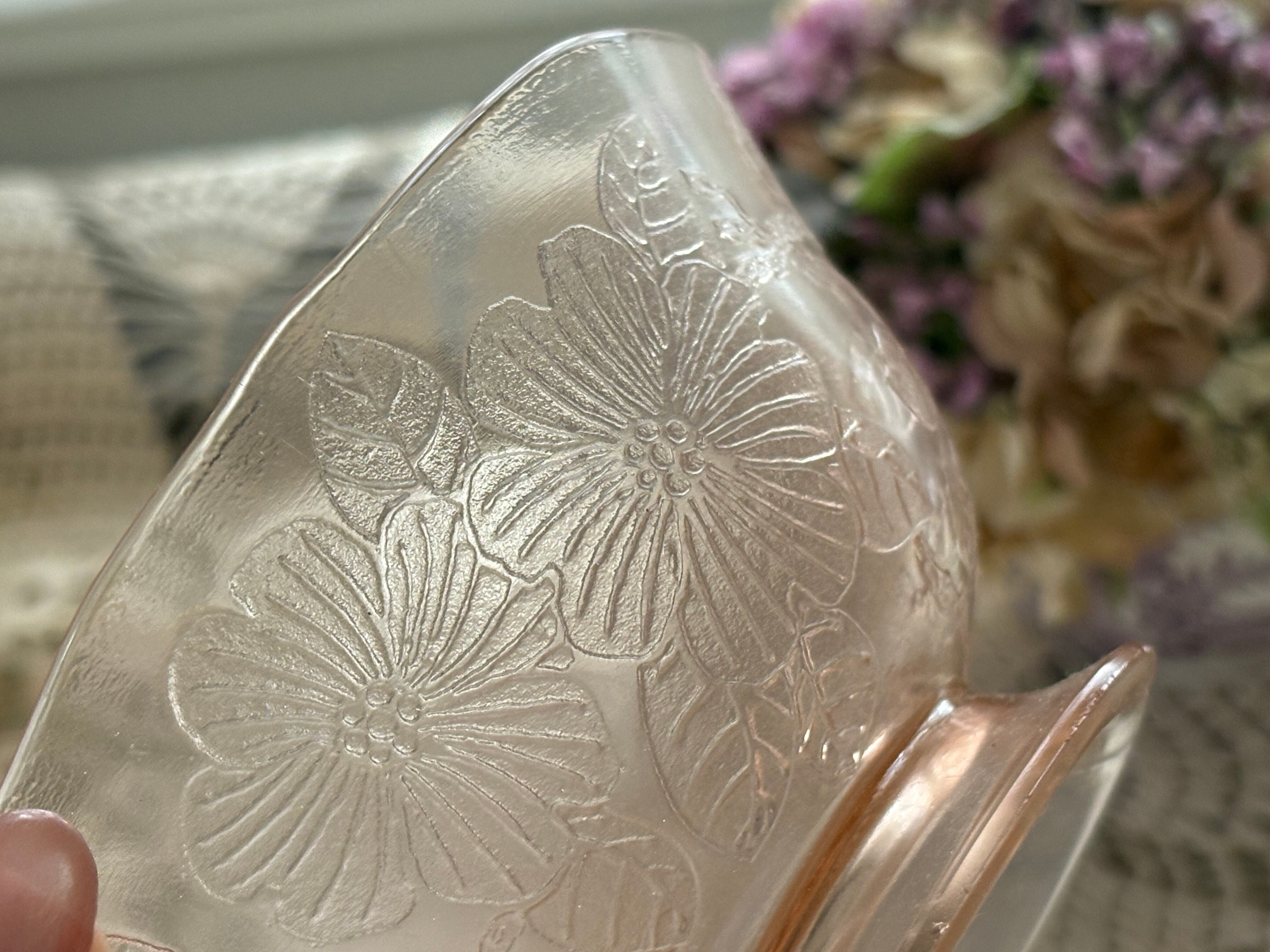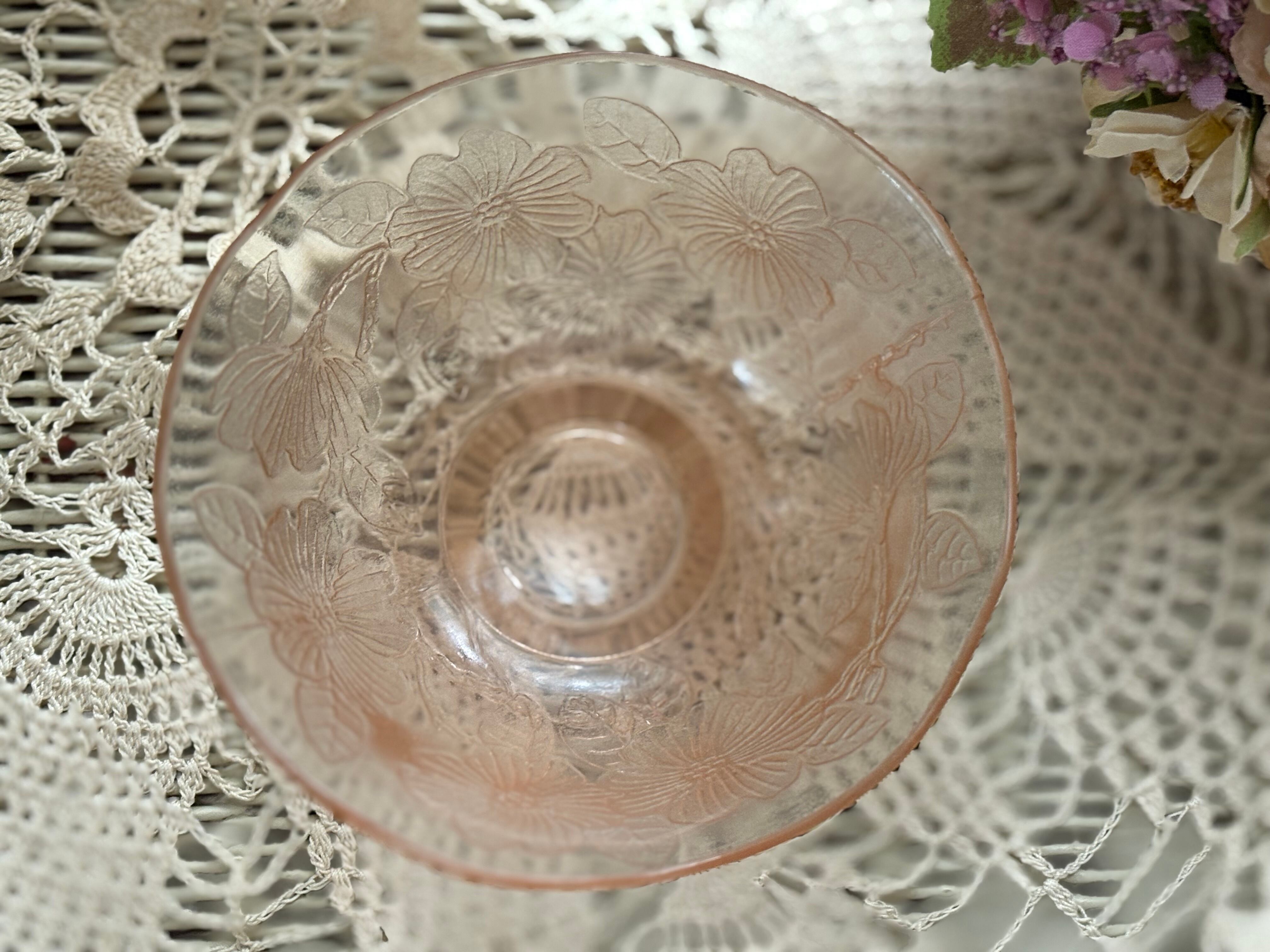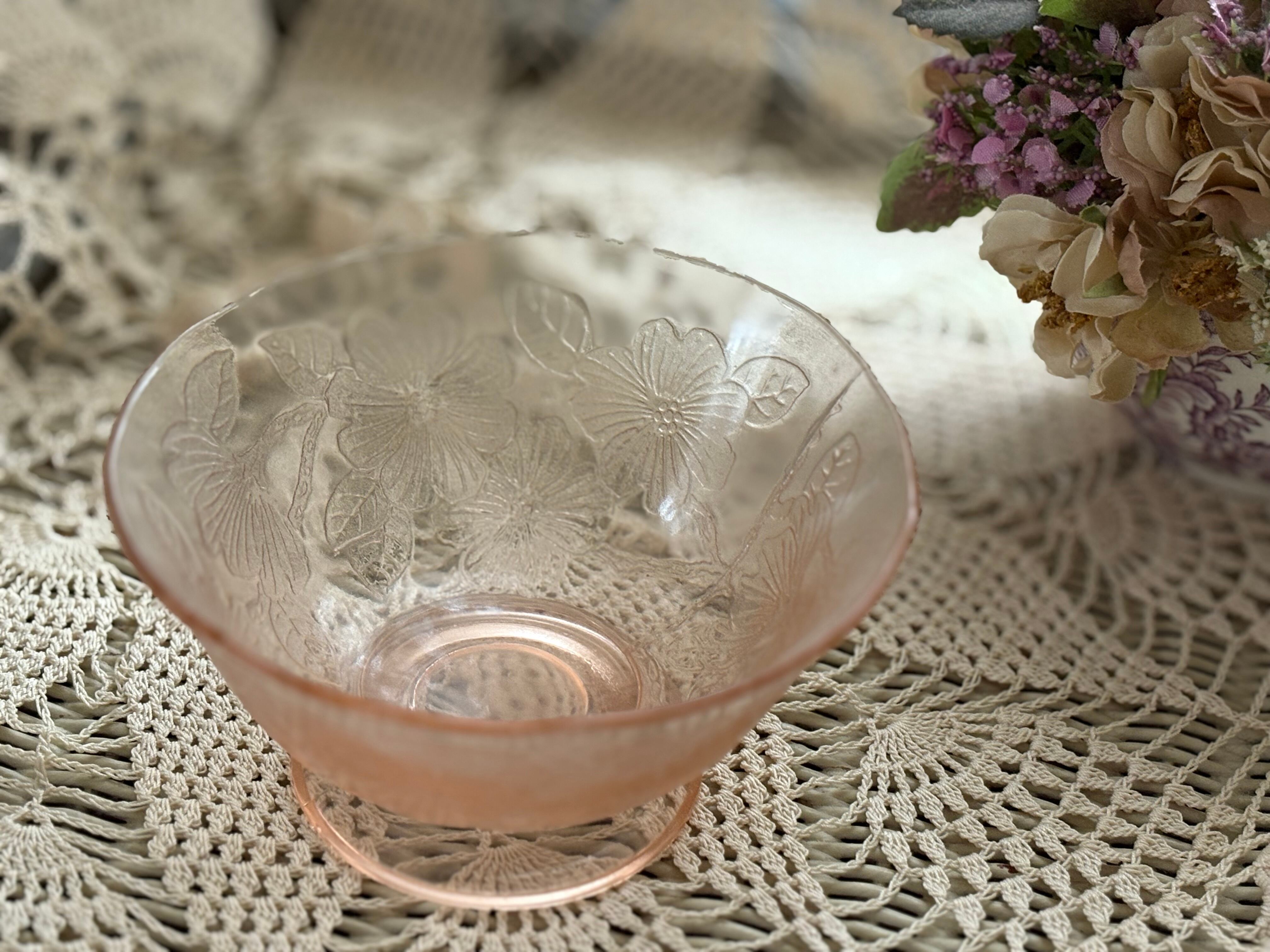 ディプレッションとは不況を意味する言葉ですが、そんな名前とは相反した美しいハナミズキの花柄がエンボス加工された可愛いピンク色のガラス器。