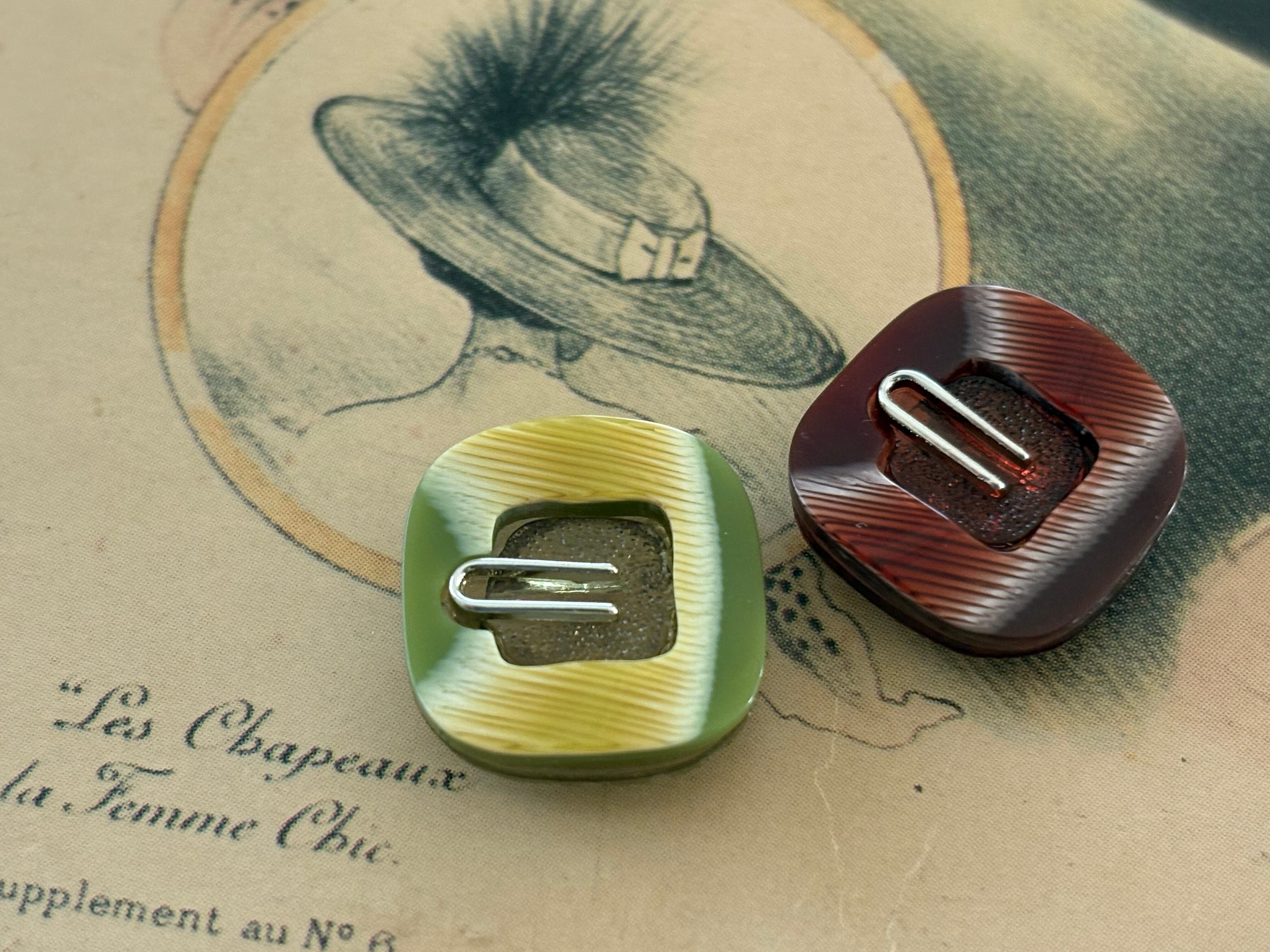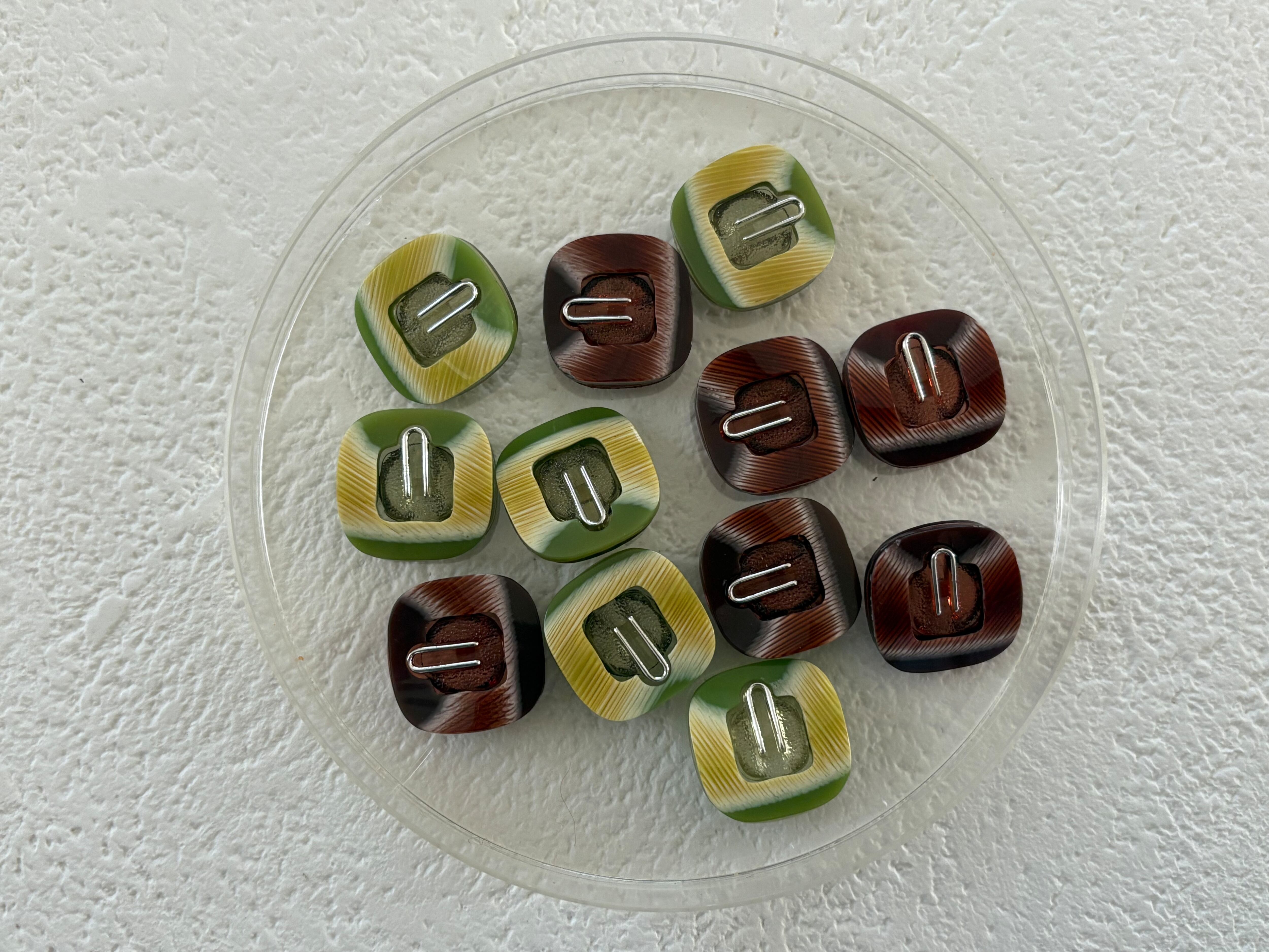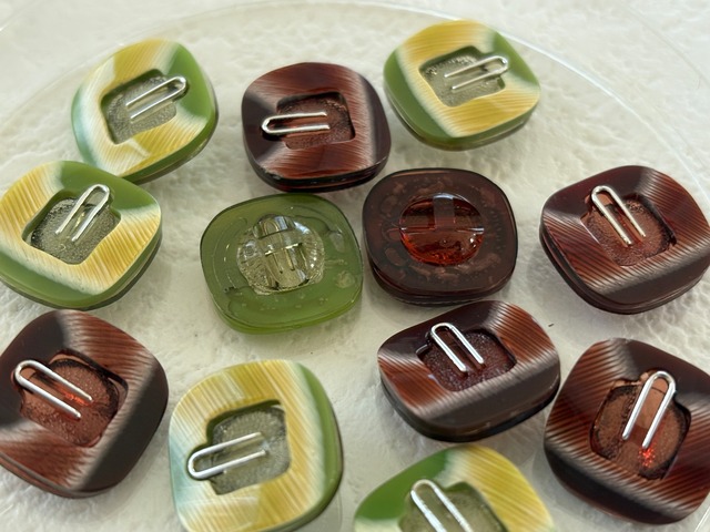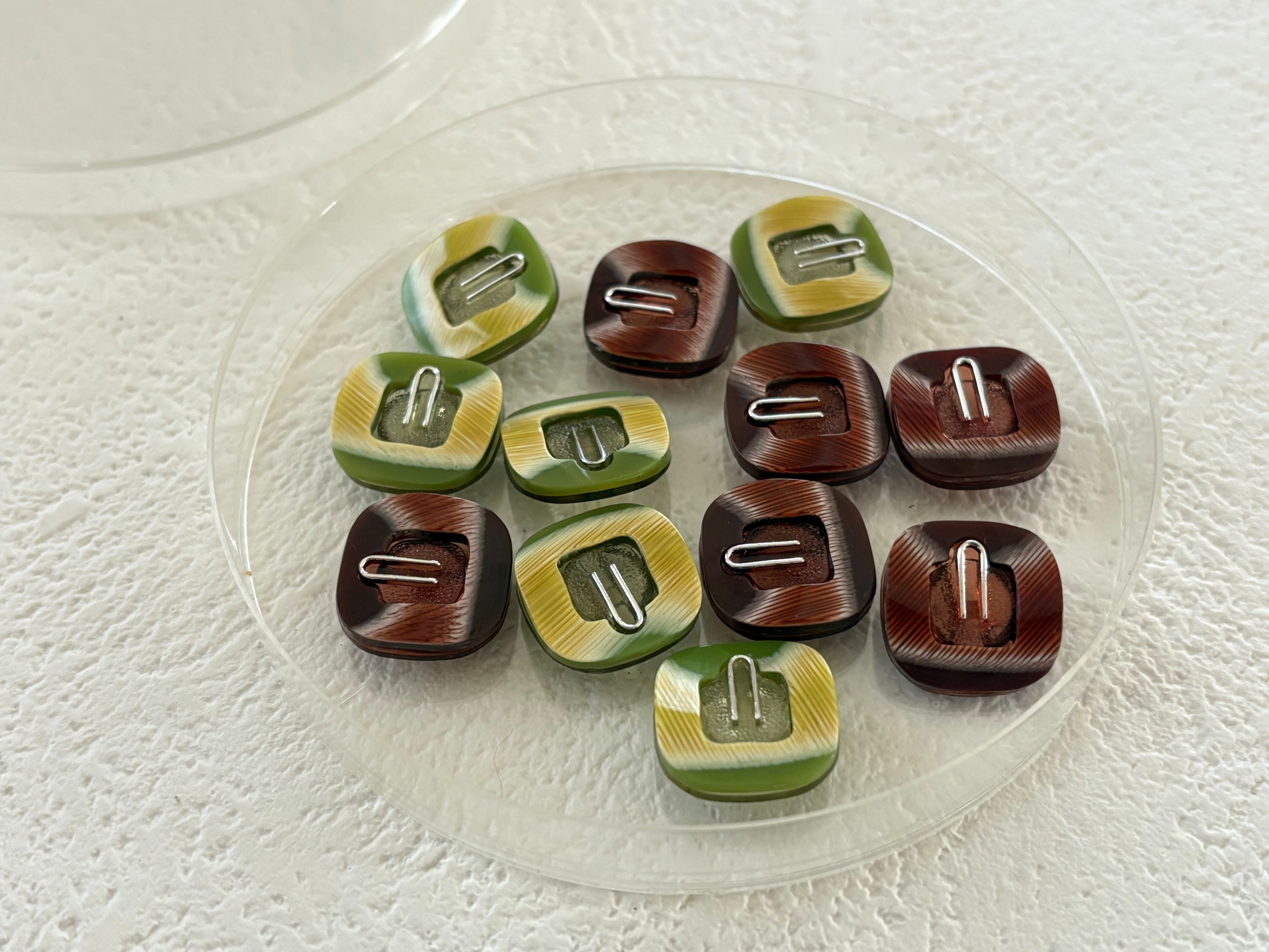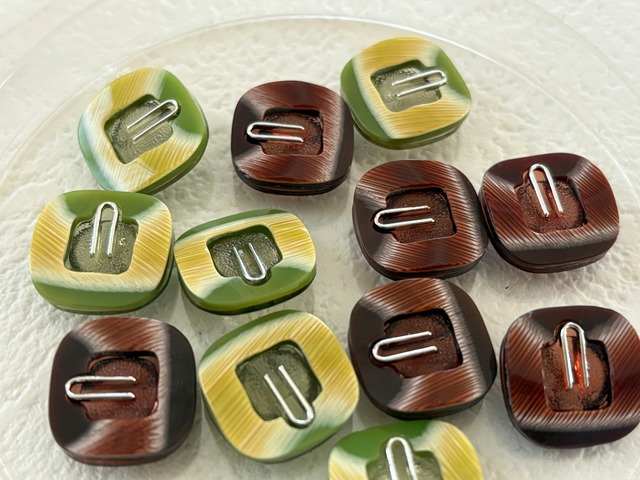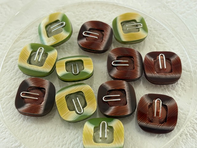Japanese Vintageボタン レトロボタン スクウェア 15mm ブラウン系/イエローグリーン系 ニット調 アクセサリーパーツ デコレーション材