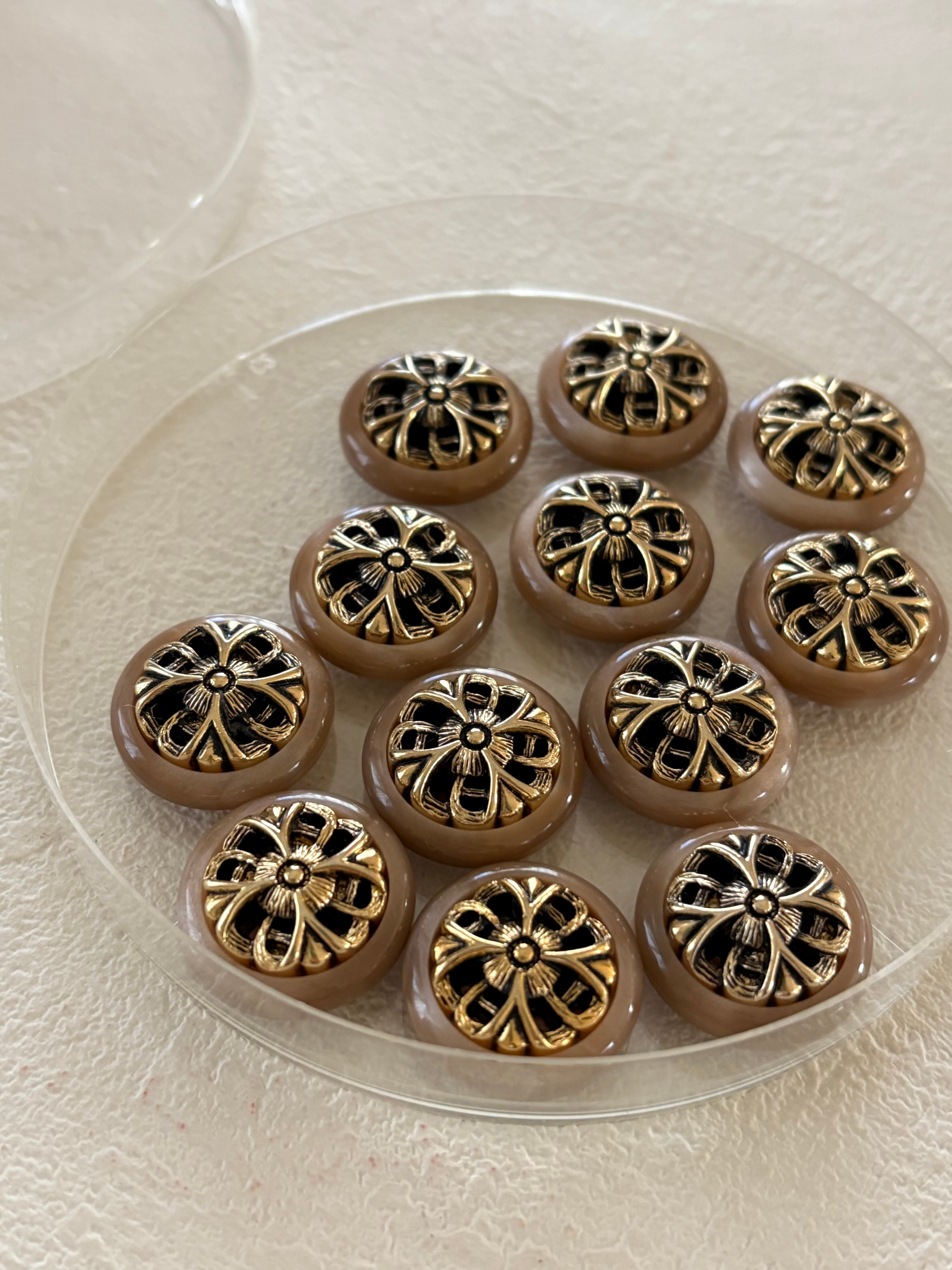 ピンクベージュカラー、マーブル調の上品なボタンの中央にアンティーク調なメダリオンのようなパーツが設置されています。