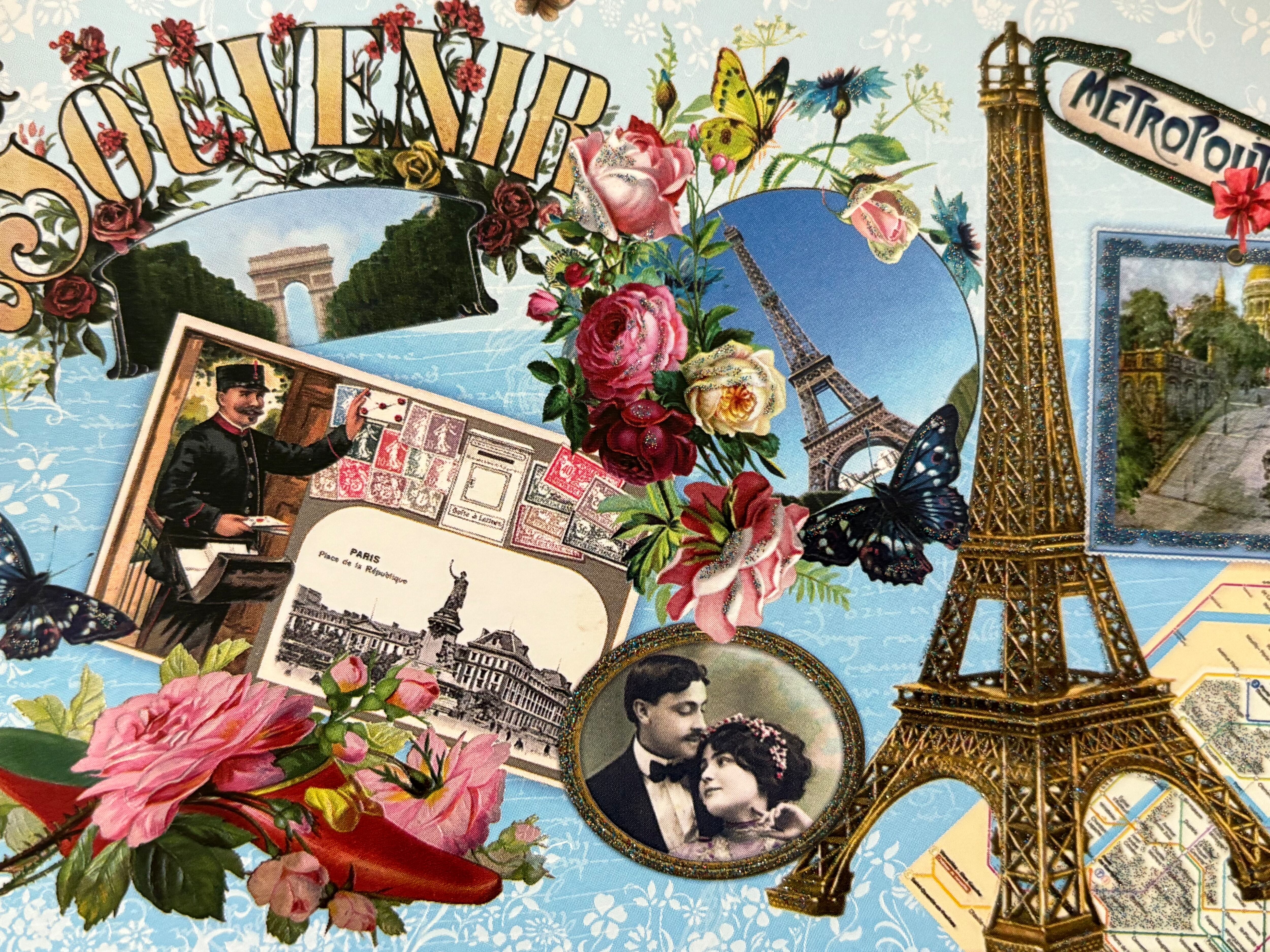 エッフェル塔、サクレクール寺、凱旋門などParisの名所、また華やかで美しいバラやパピヨンなど素敵なアイテムが詰まった1枚です。