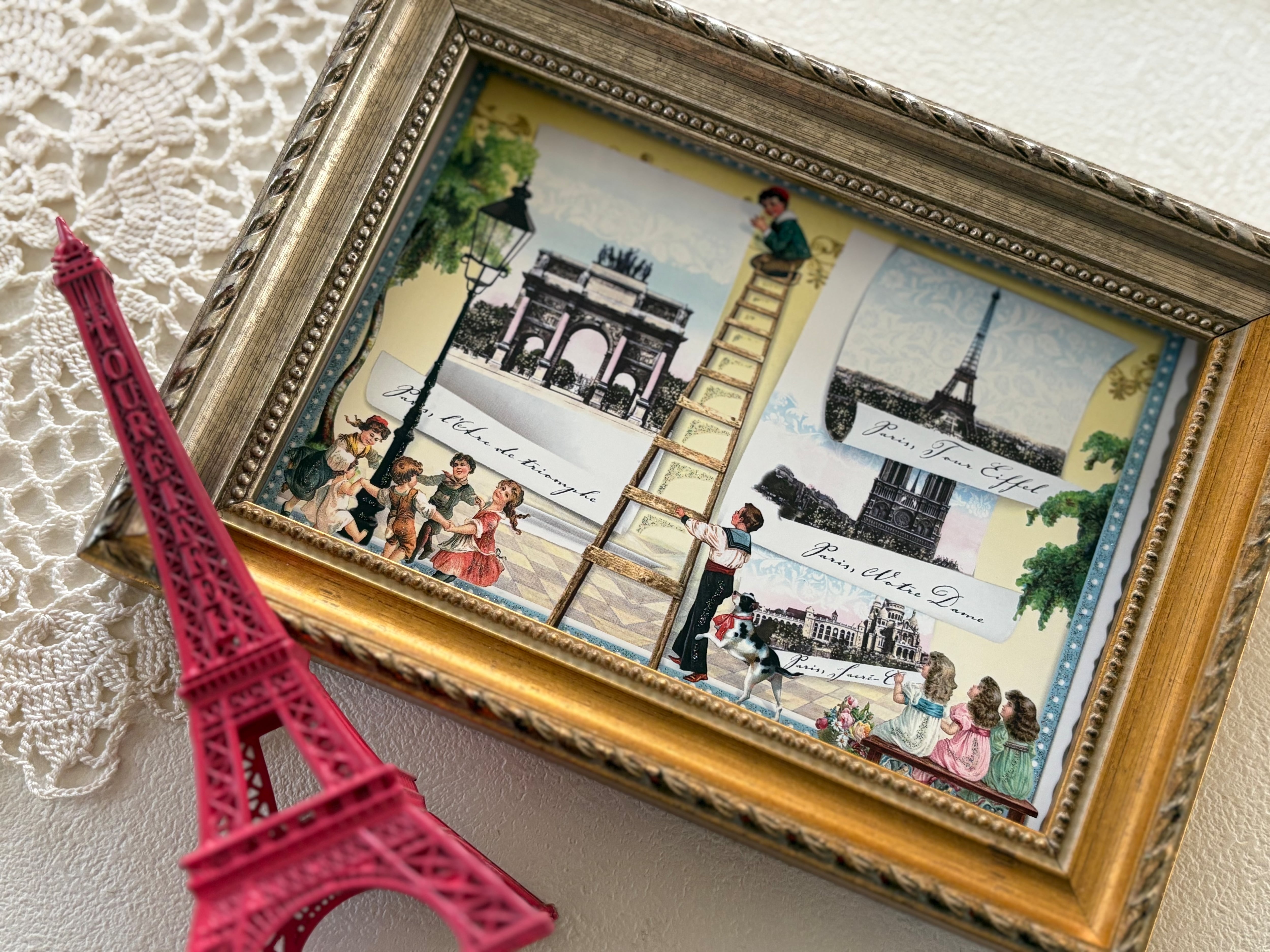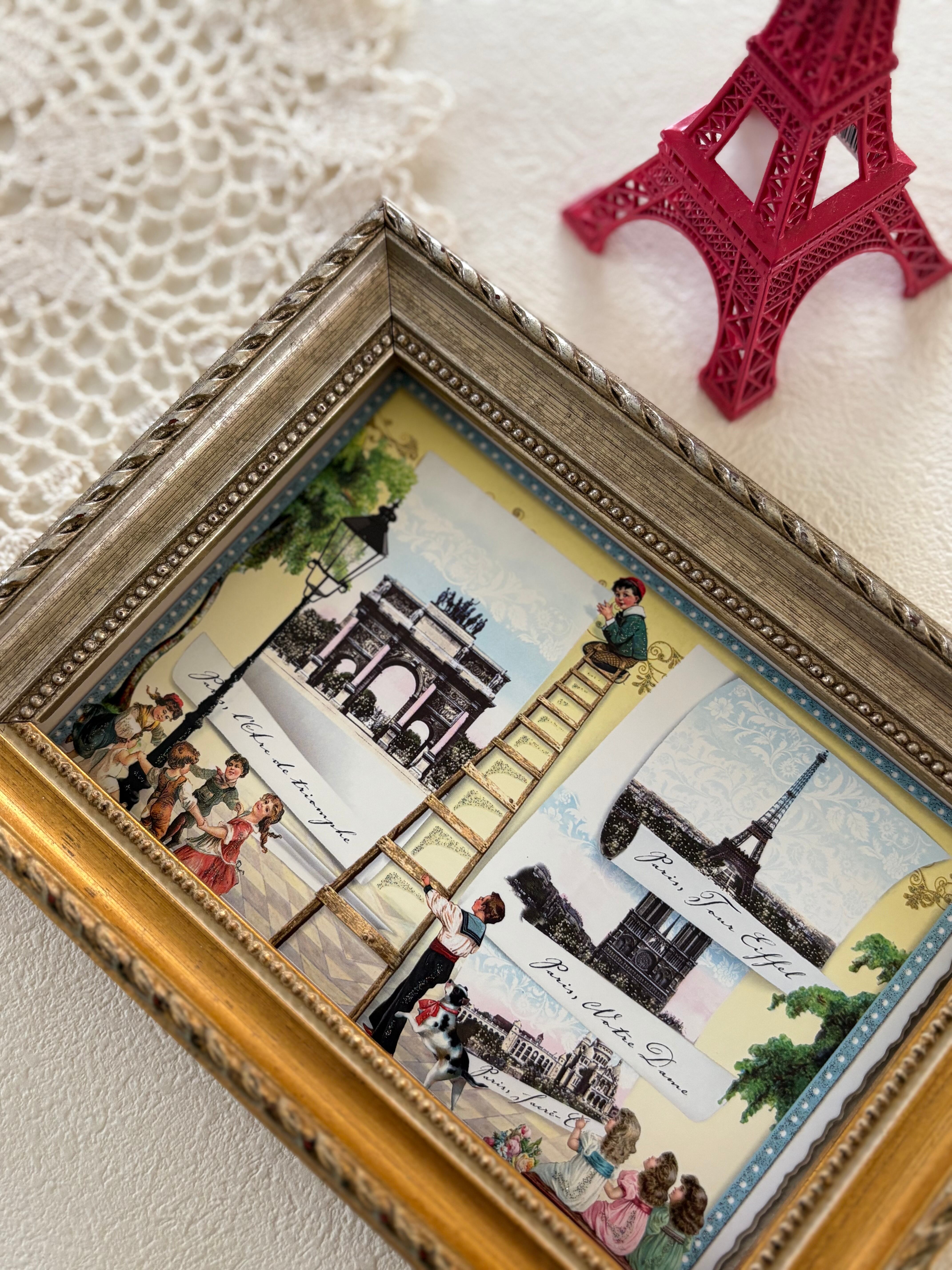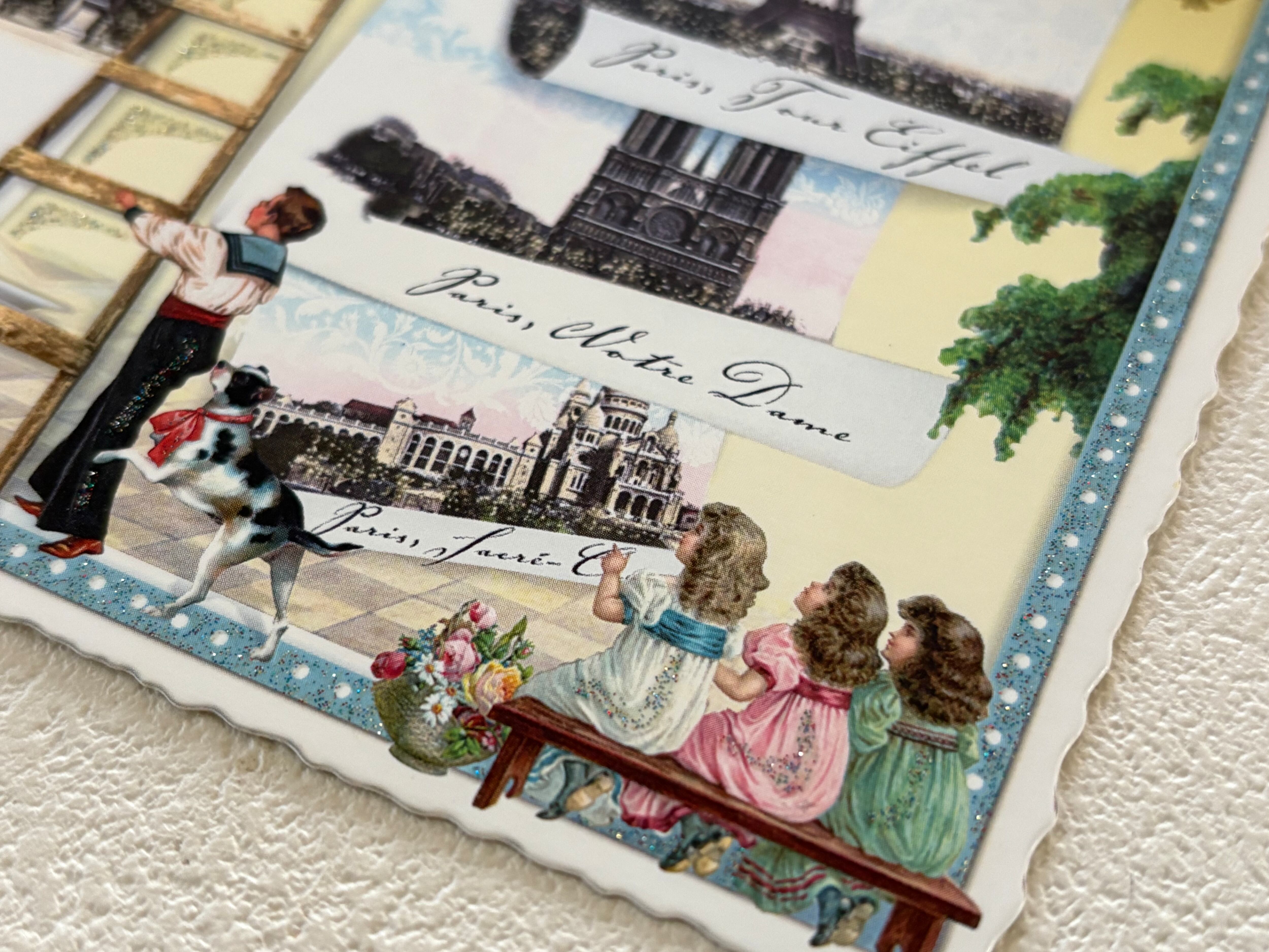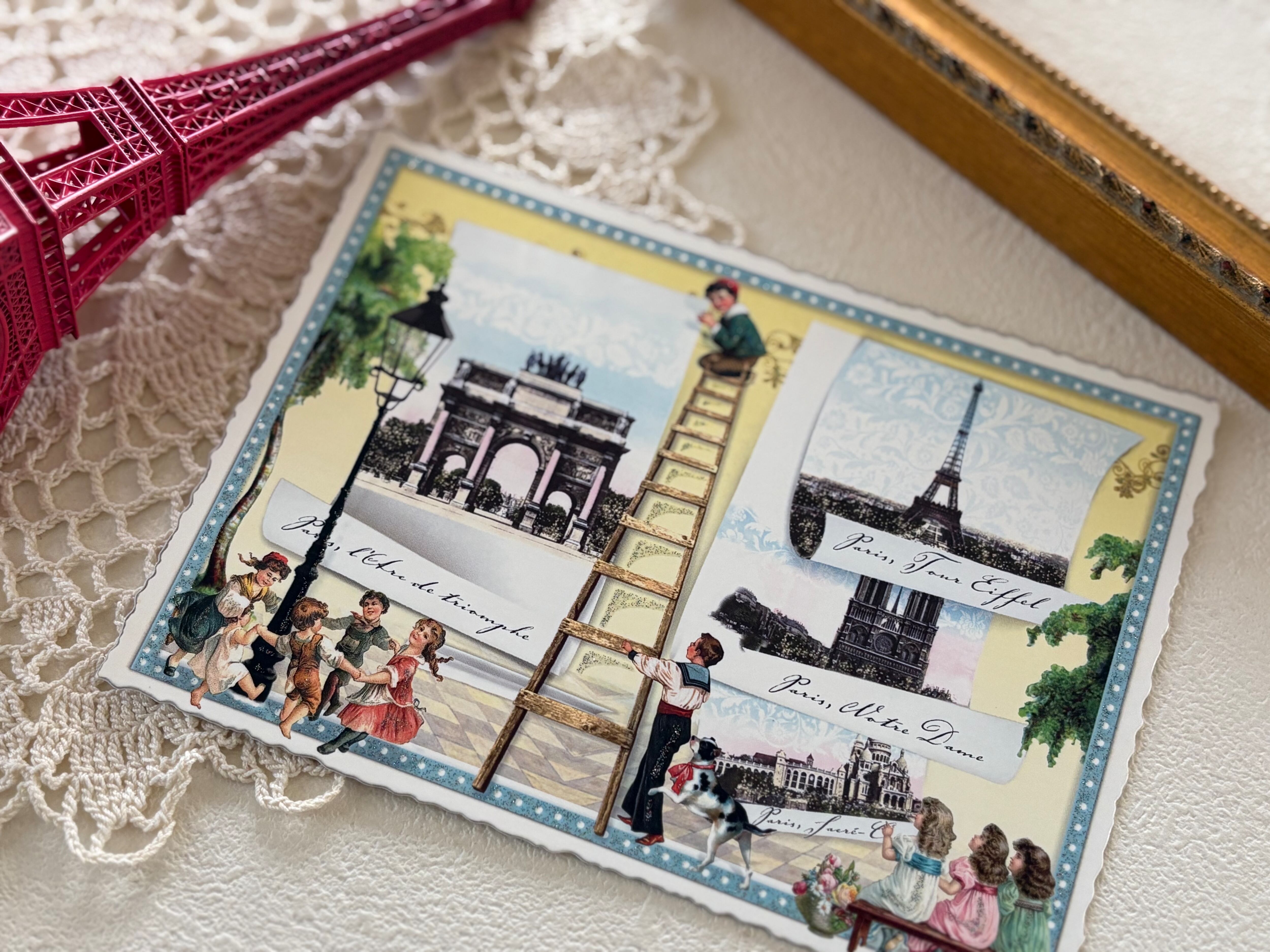 エッフェル塔、サクレクール寺院、カルーセル凱旋門、ノートルダムなどParisの名所、またヴィクトリアンな可愛い子供たちなど素敵なアイテムが詰まった1枚です。