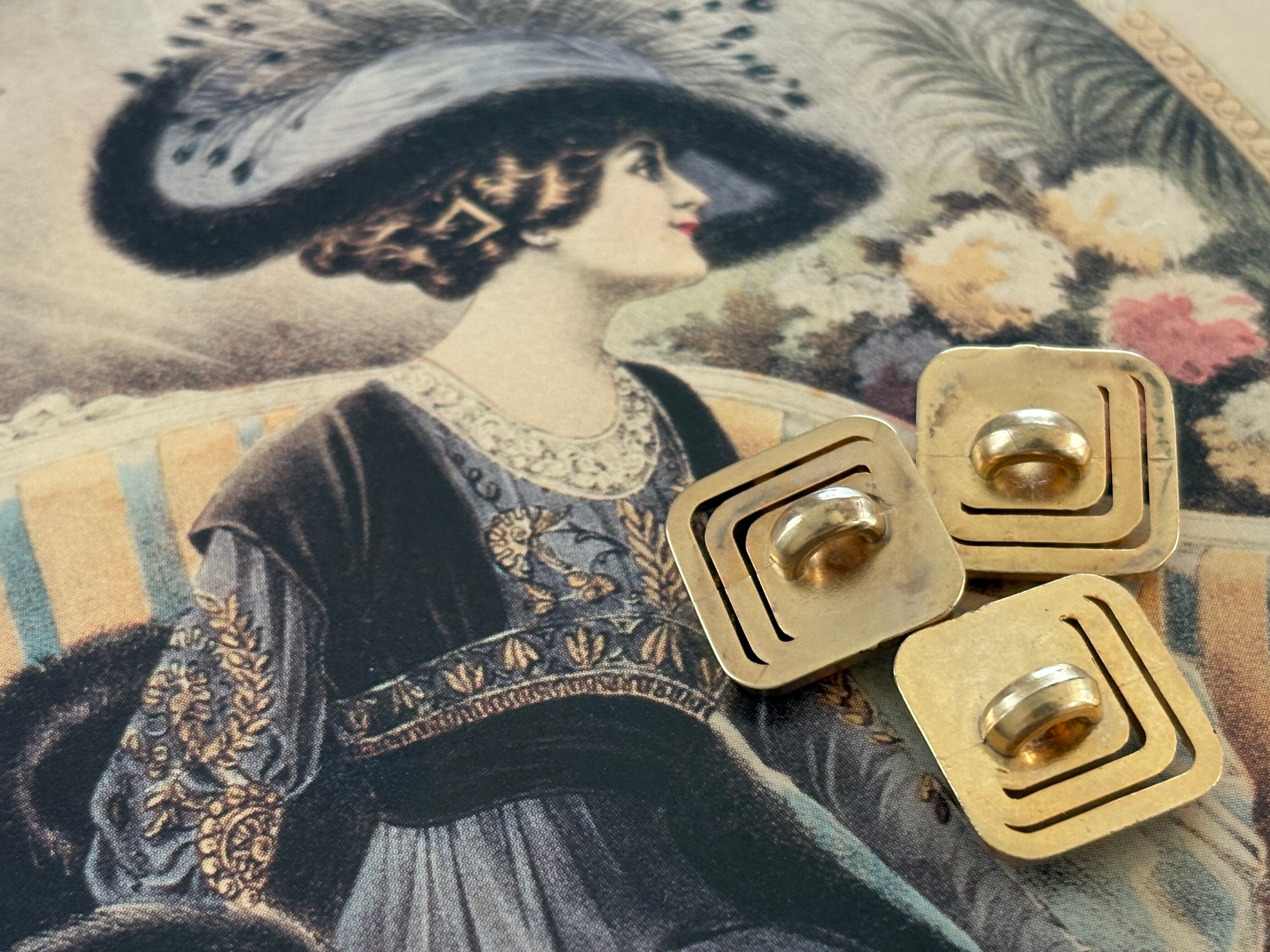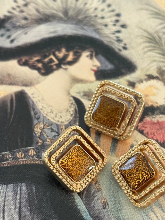 Japanese Vintage ボタン 14mm スクウェア 透かし アンバー×ゴールド アクセサリーパーツ 装飾材 カルトナージュ
