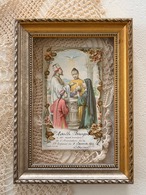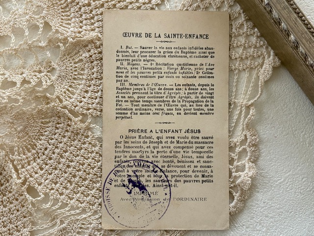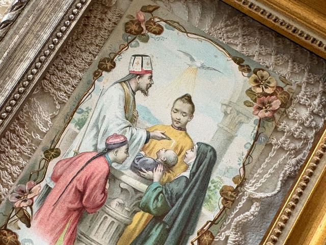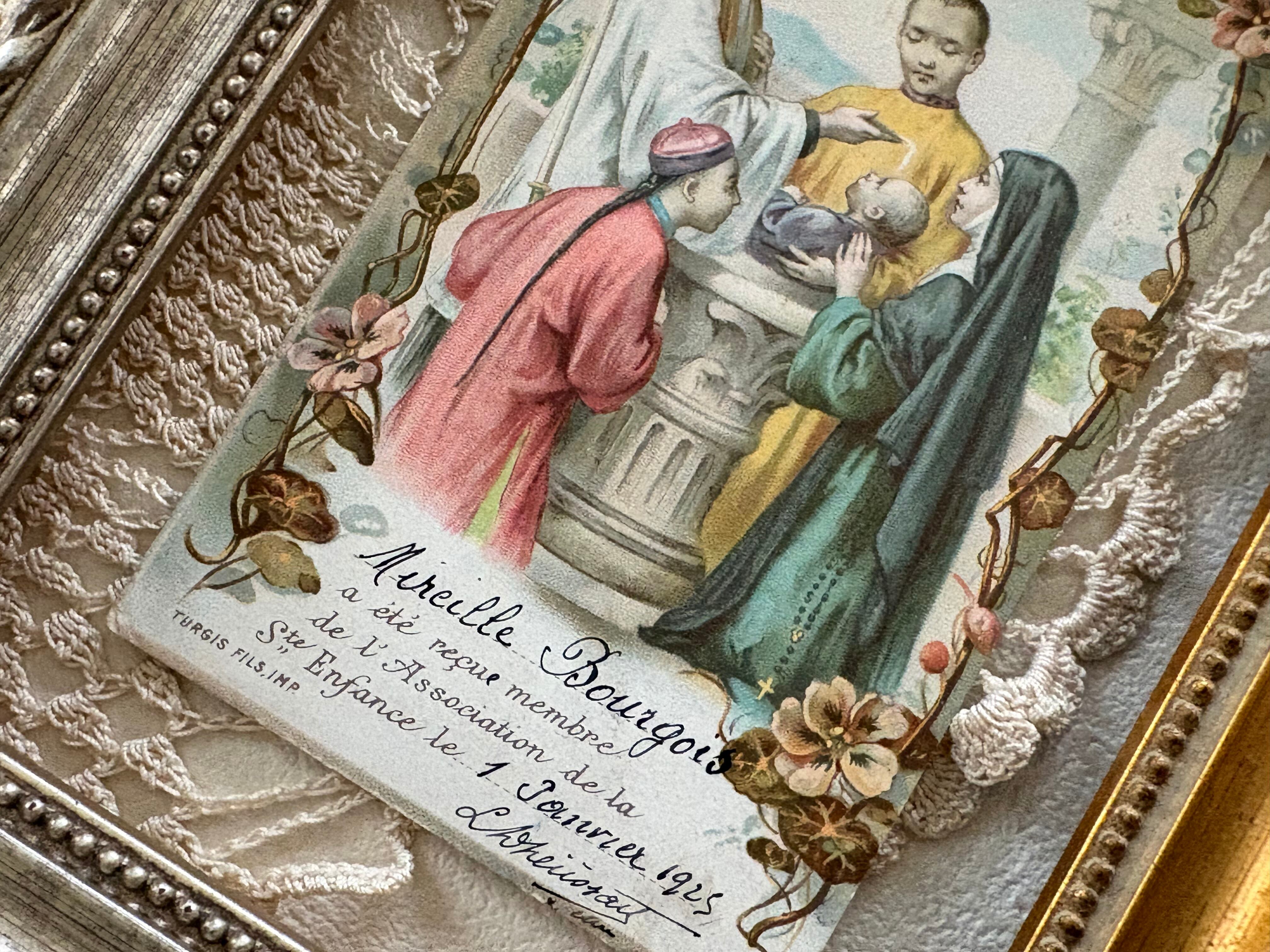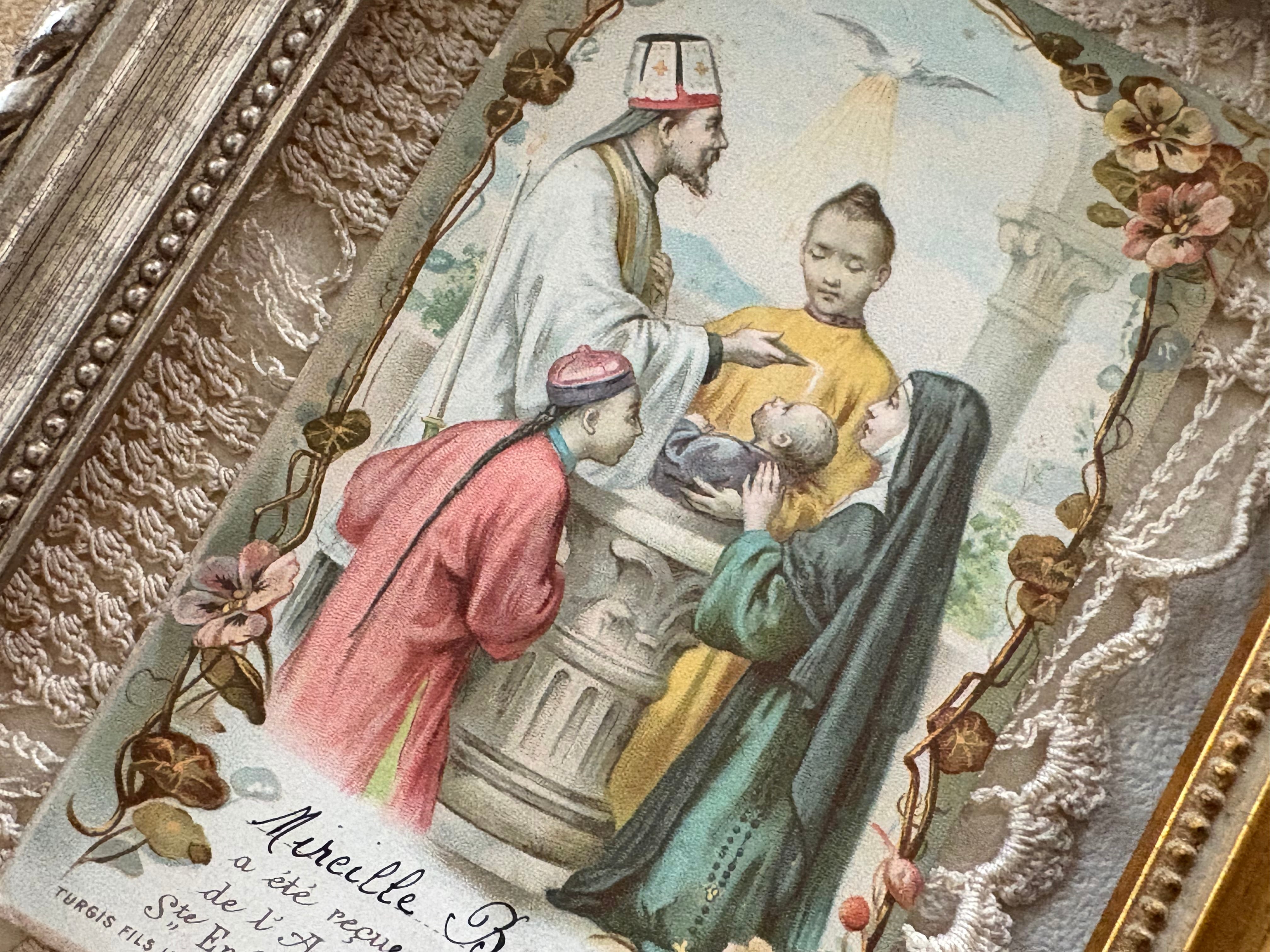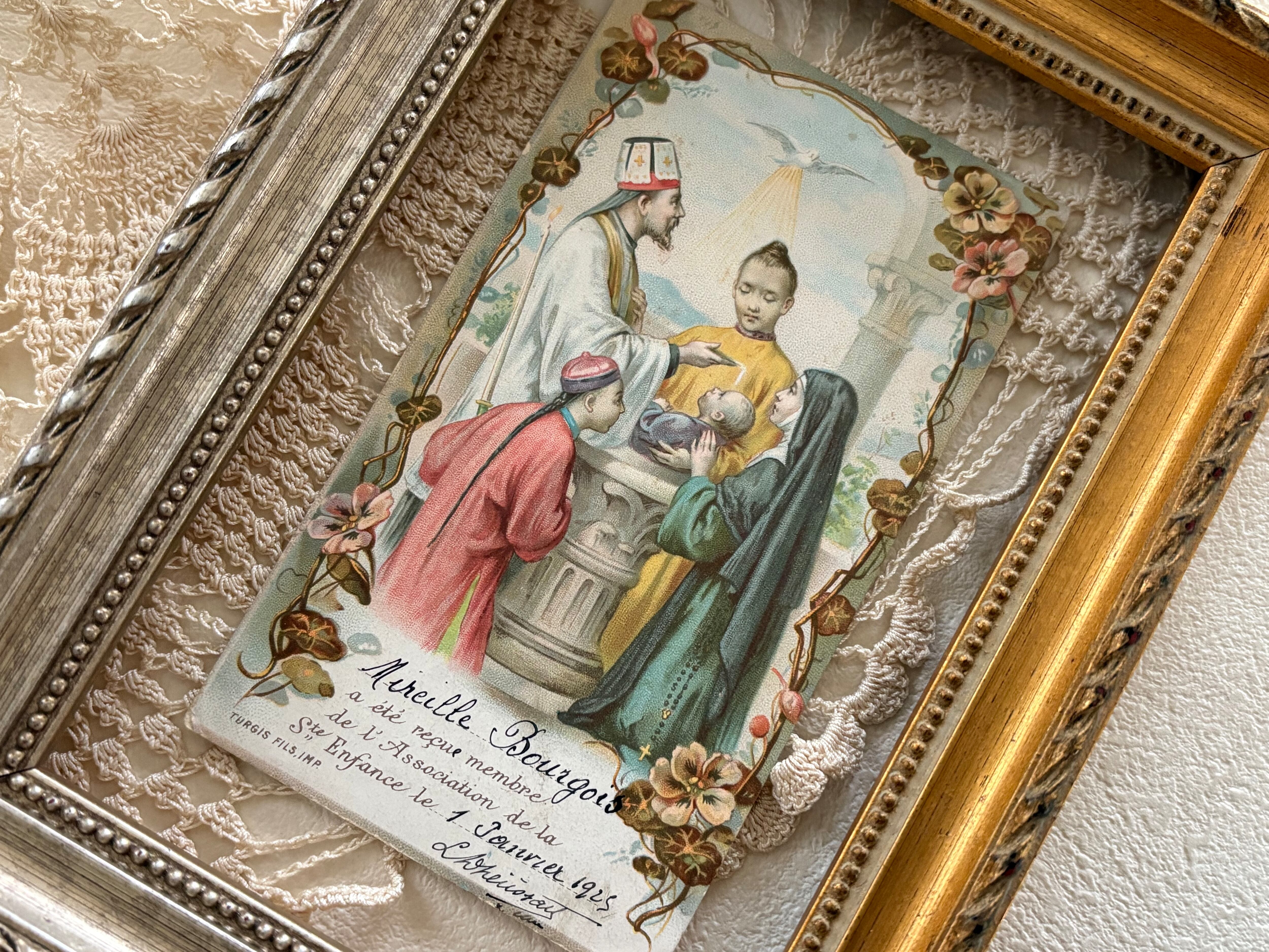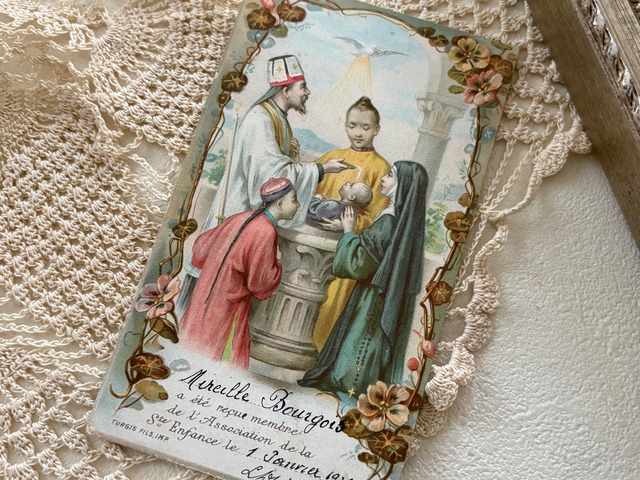フランスアンティーク Holy Card ホーリーカード communion 1925年 アジア人 白鳩 洗礼 額装 コレクション 撮影小物 Noel クリスマス