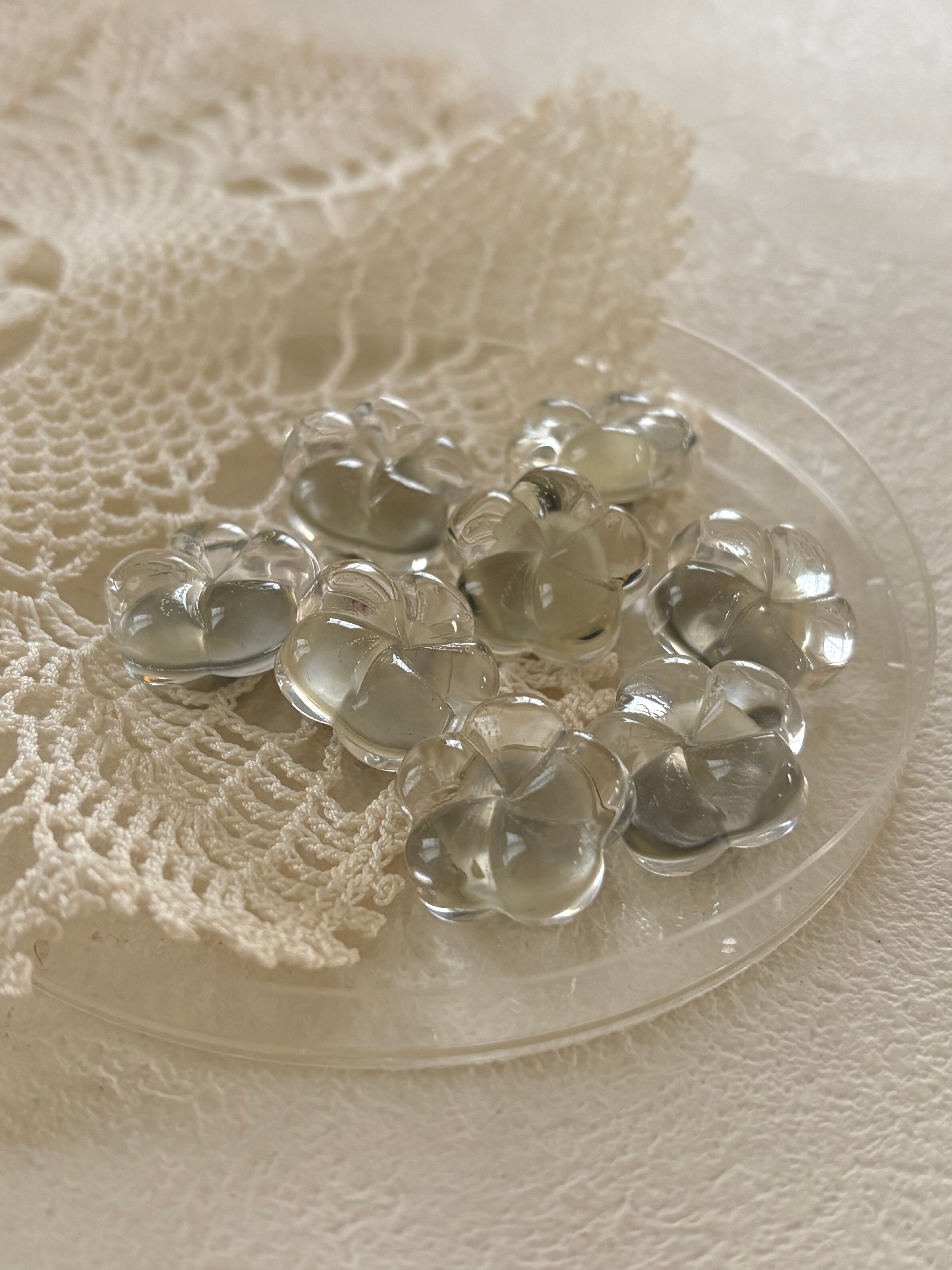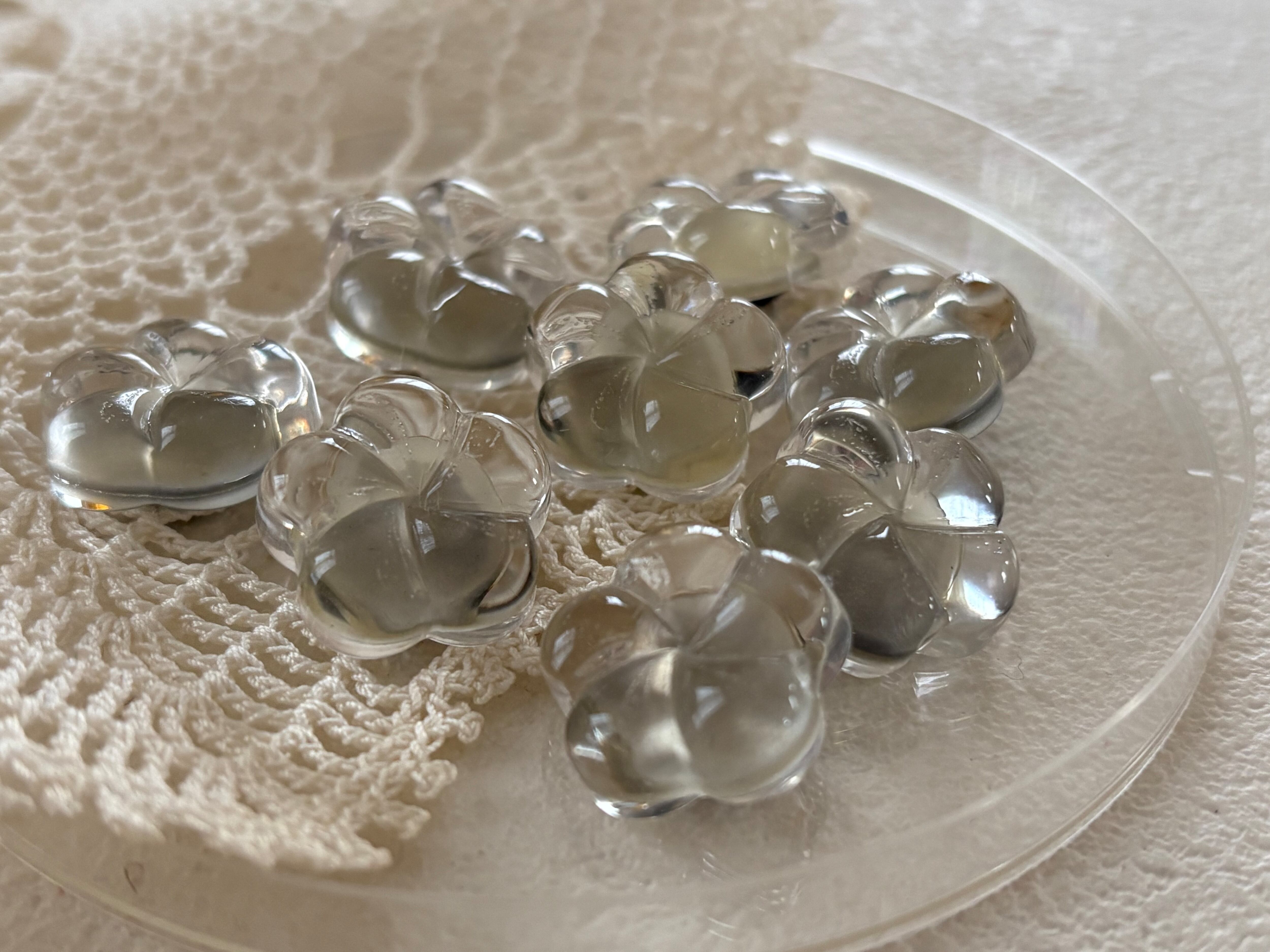 ぷっくりクリアなお花型の樹脂ボタンになります。
