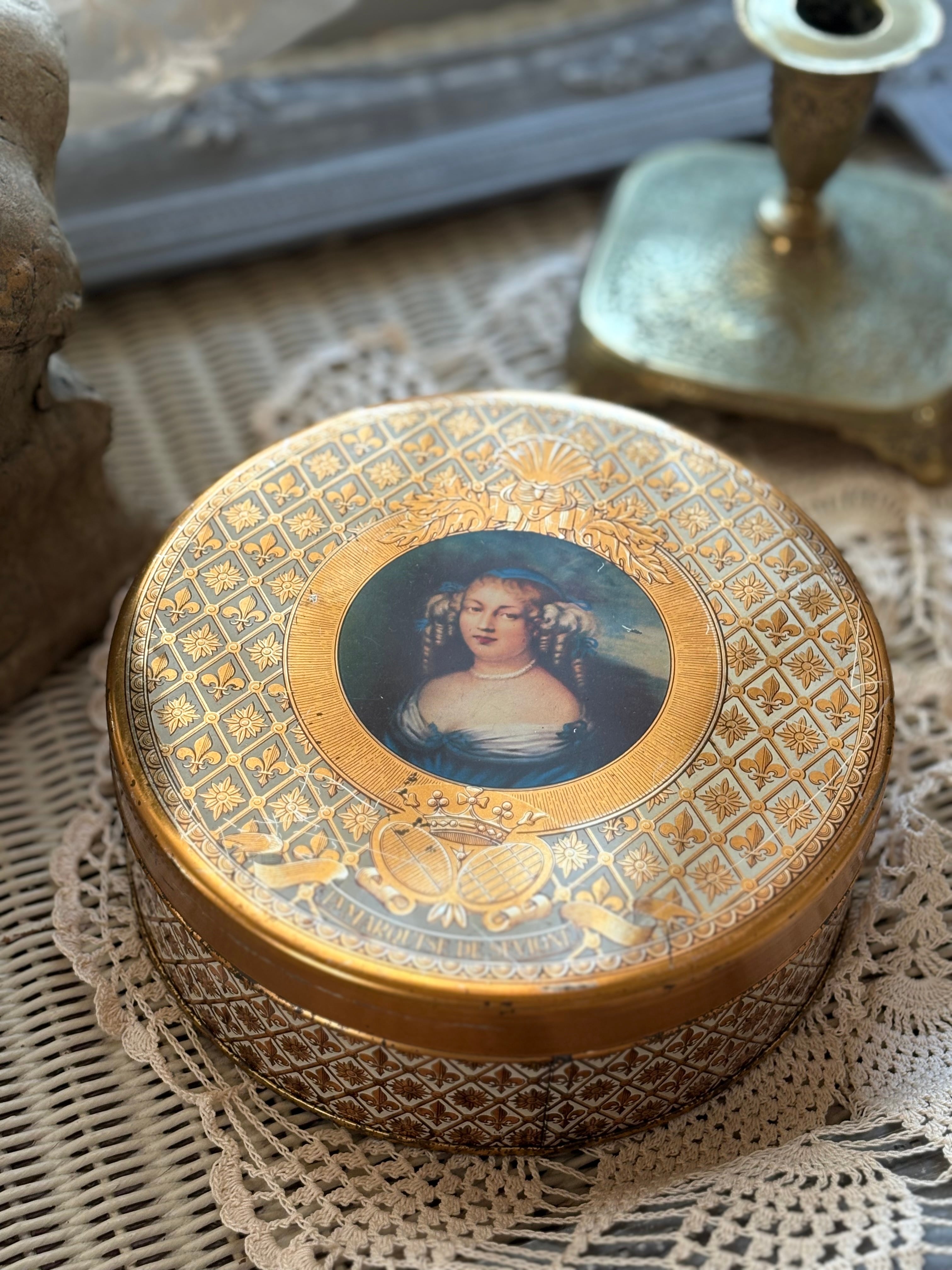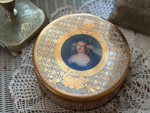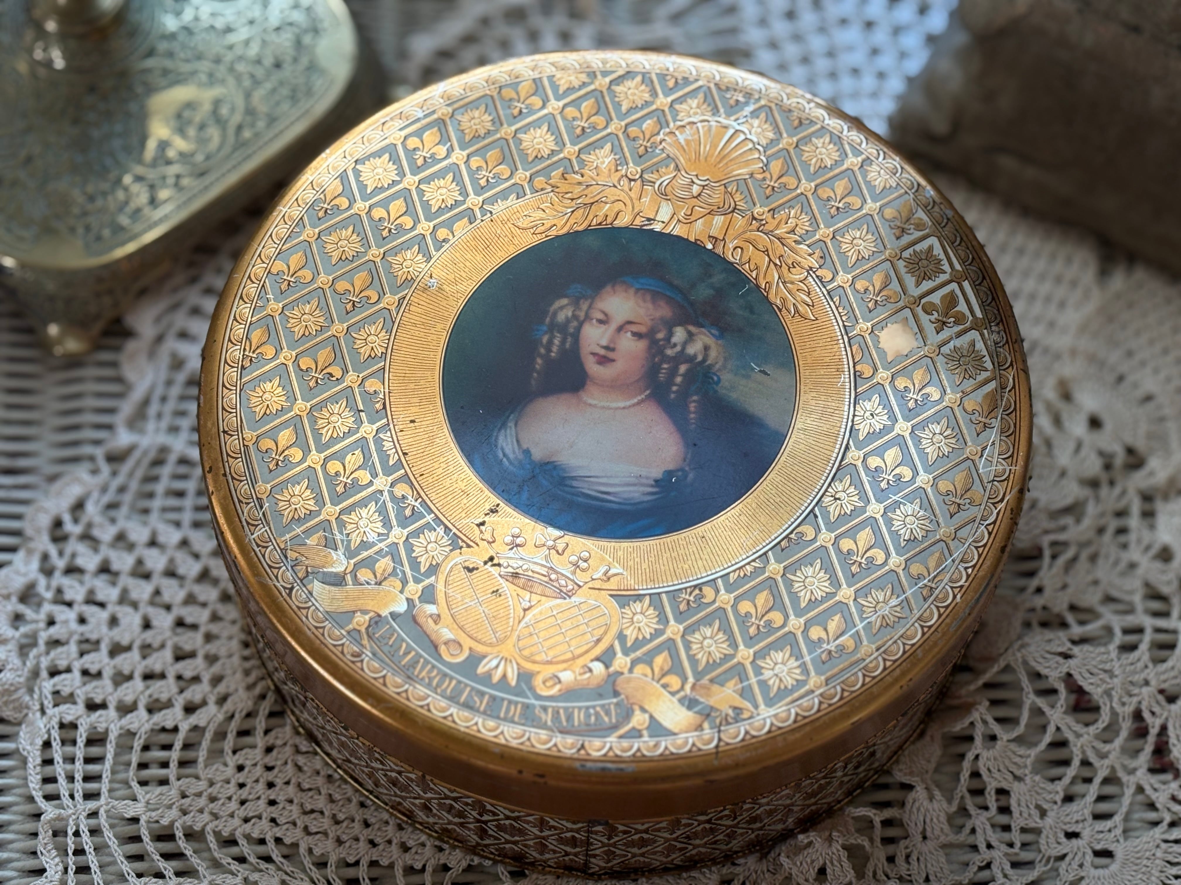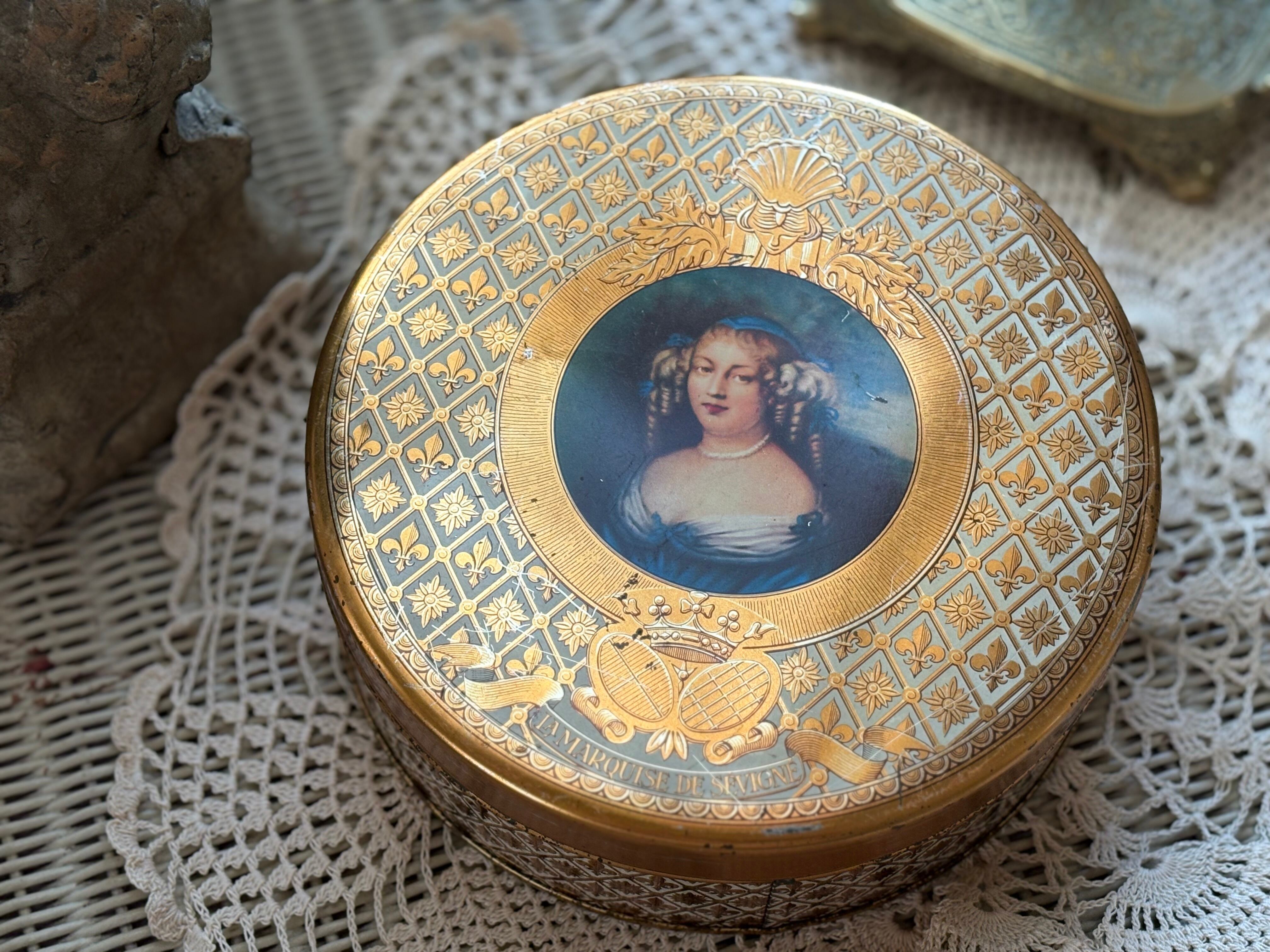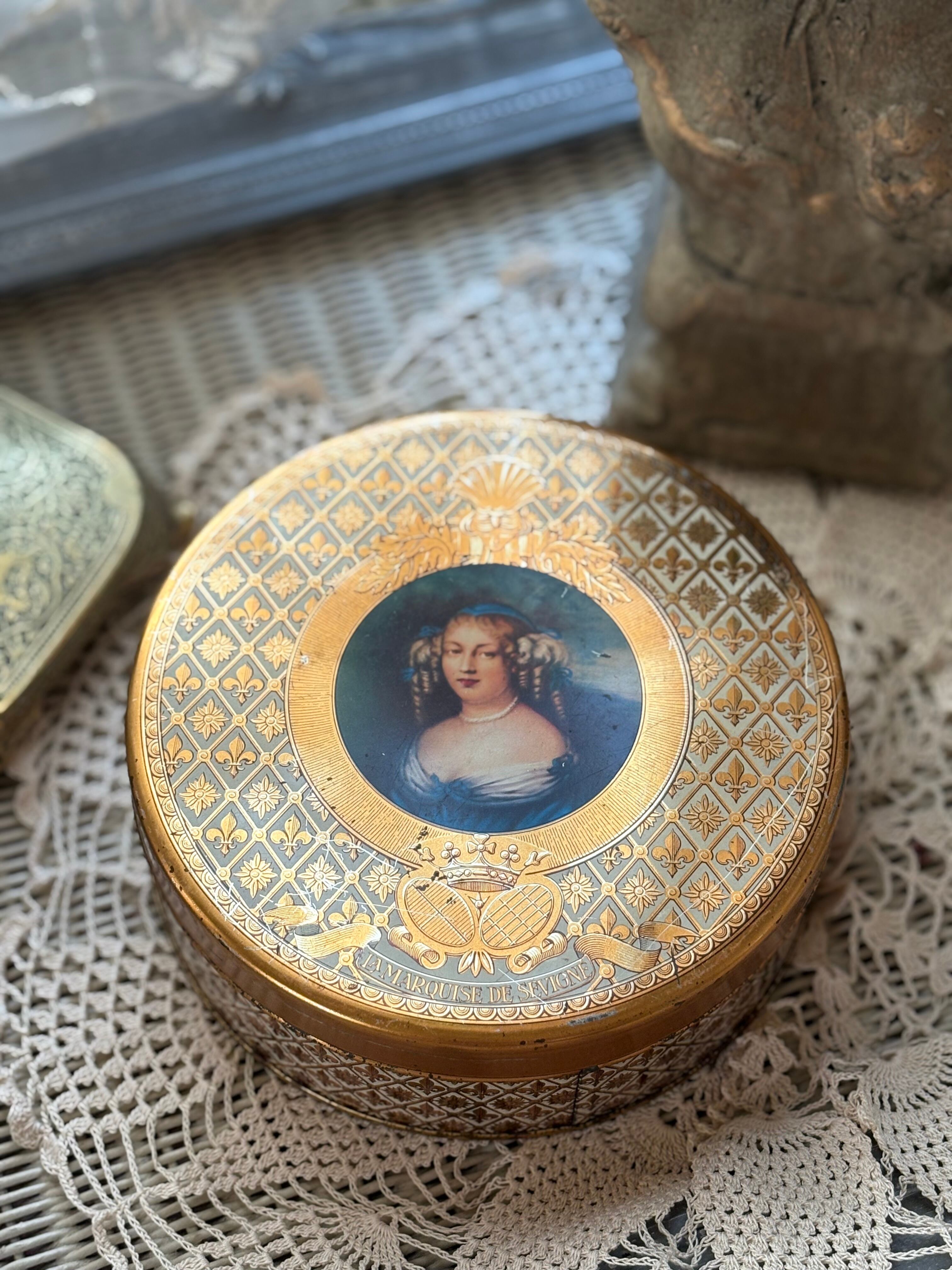 フランス Vintage トフィー缶 マルキーズ・ドゥ・セヴィニエ Marquise de Sevigne フラダリ 百合の紋章 インテリア 撮影小物