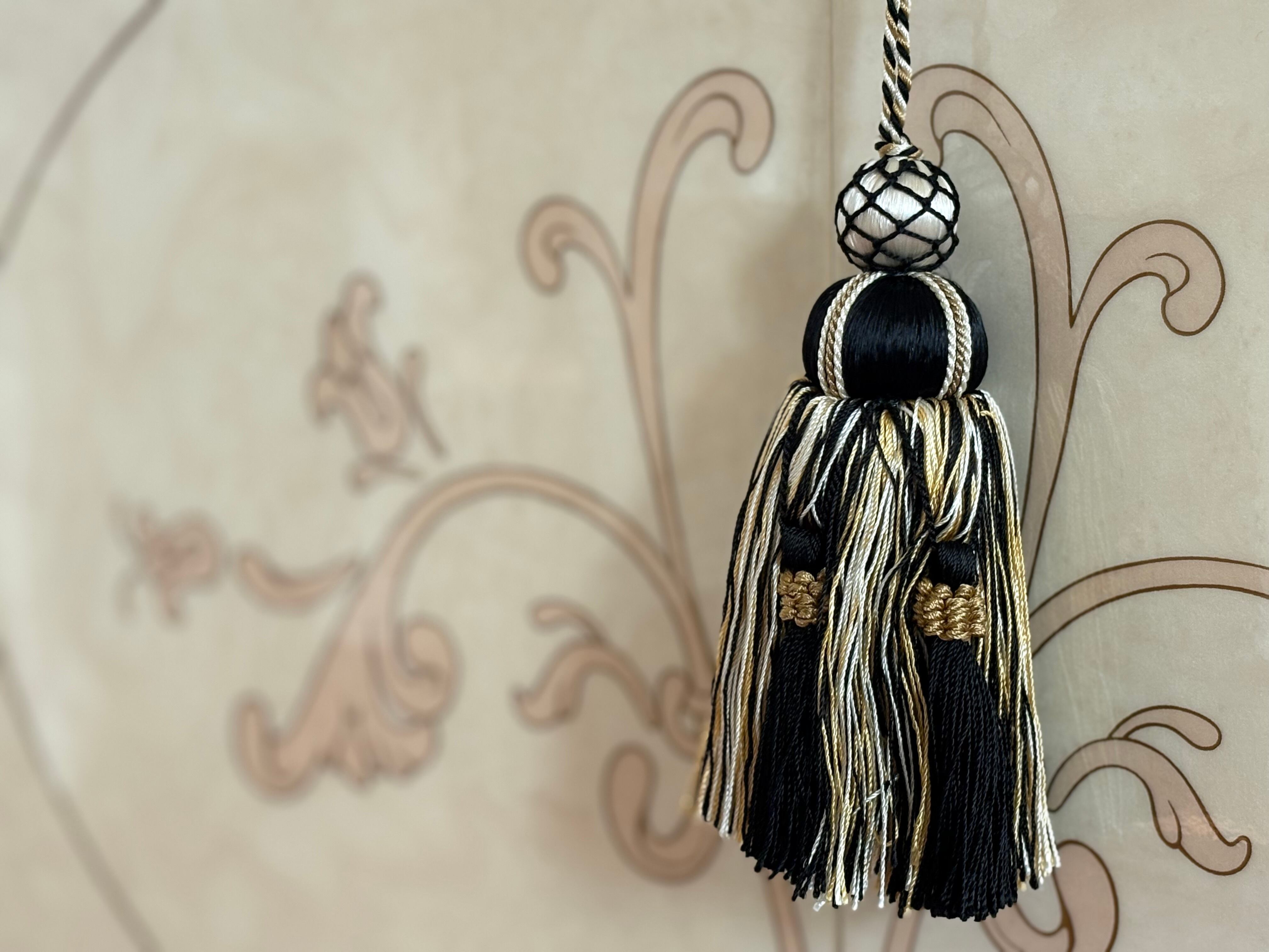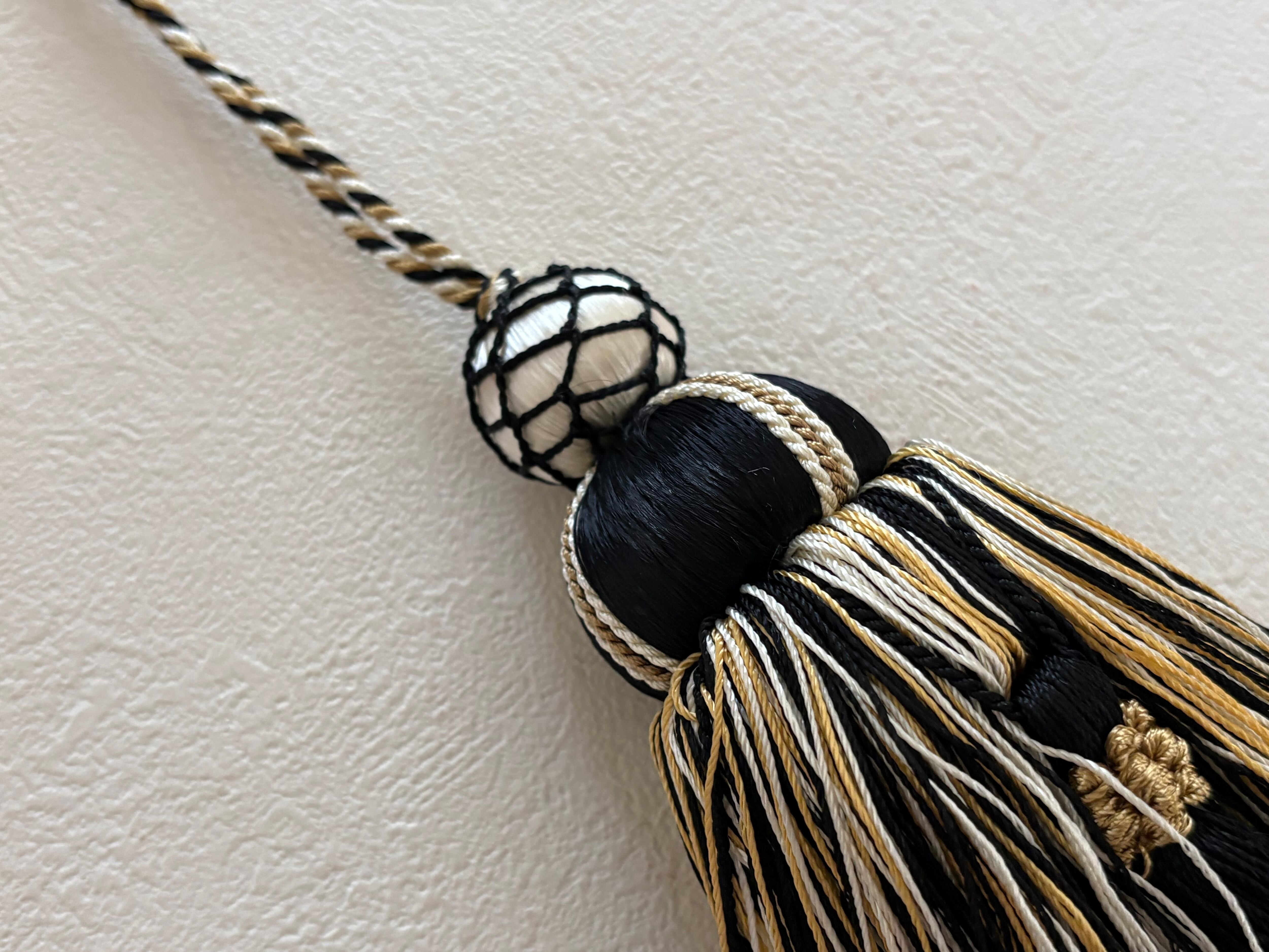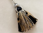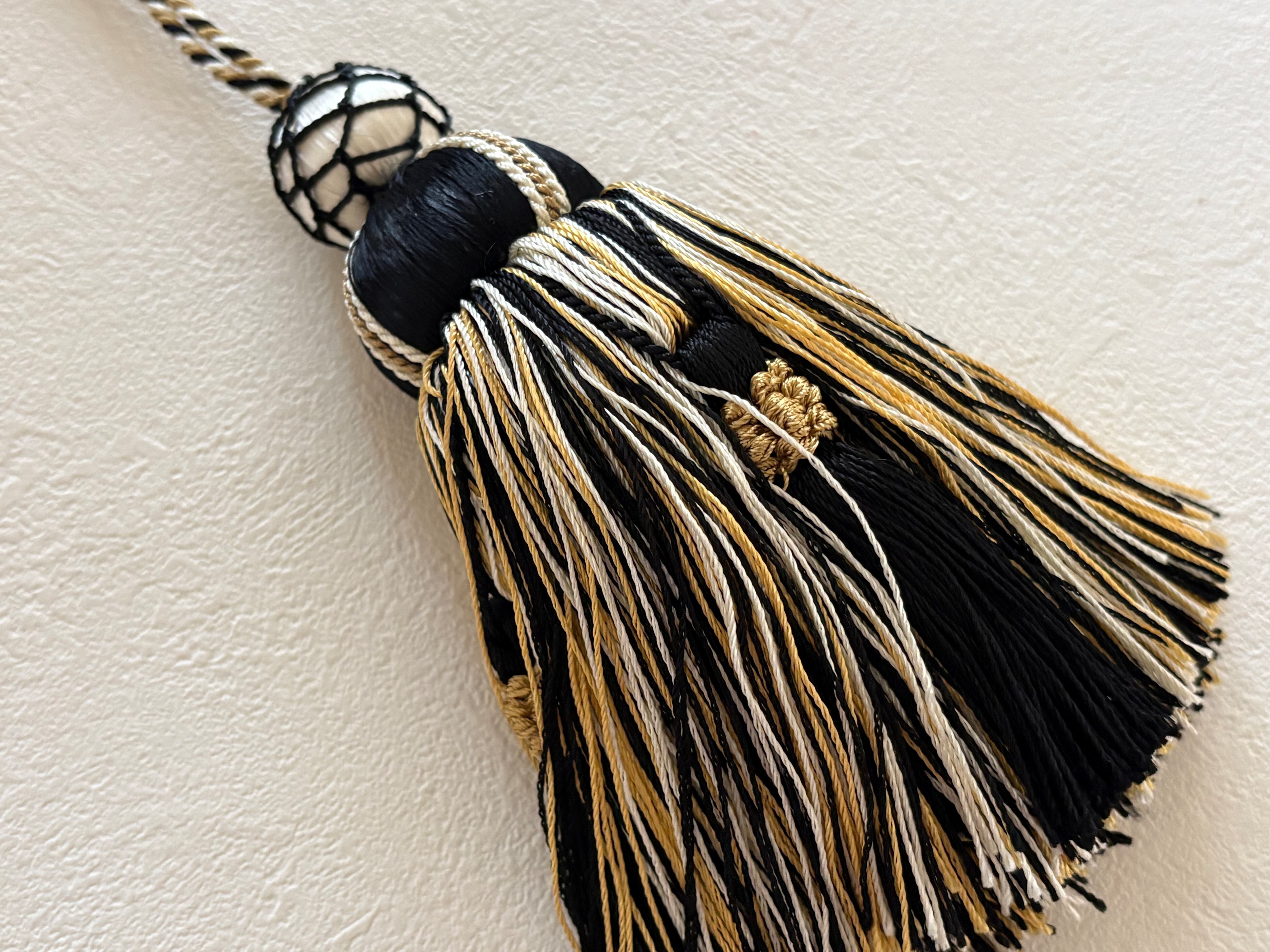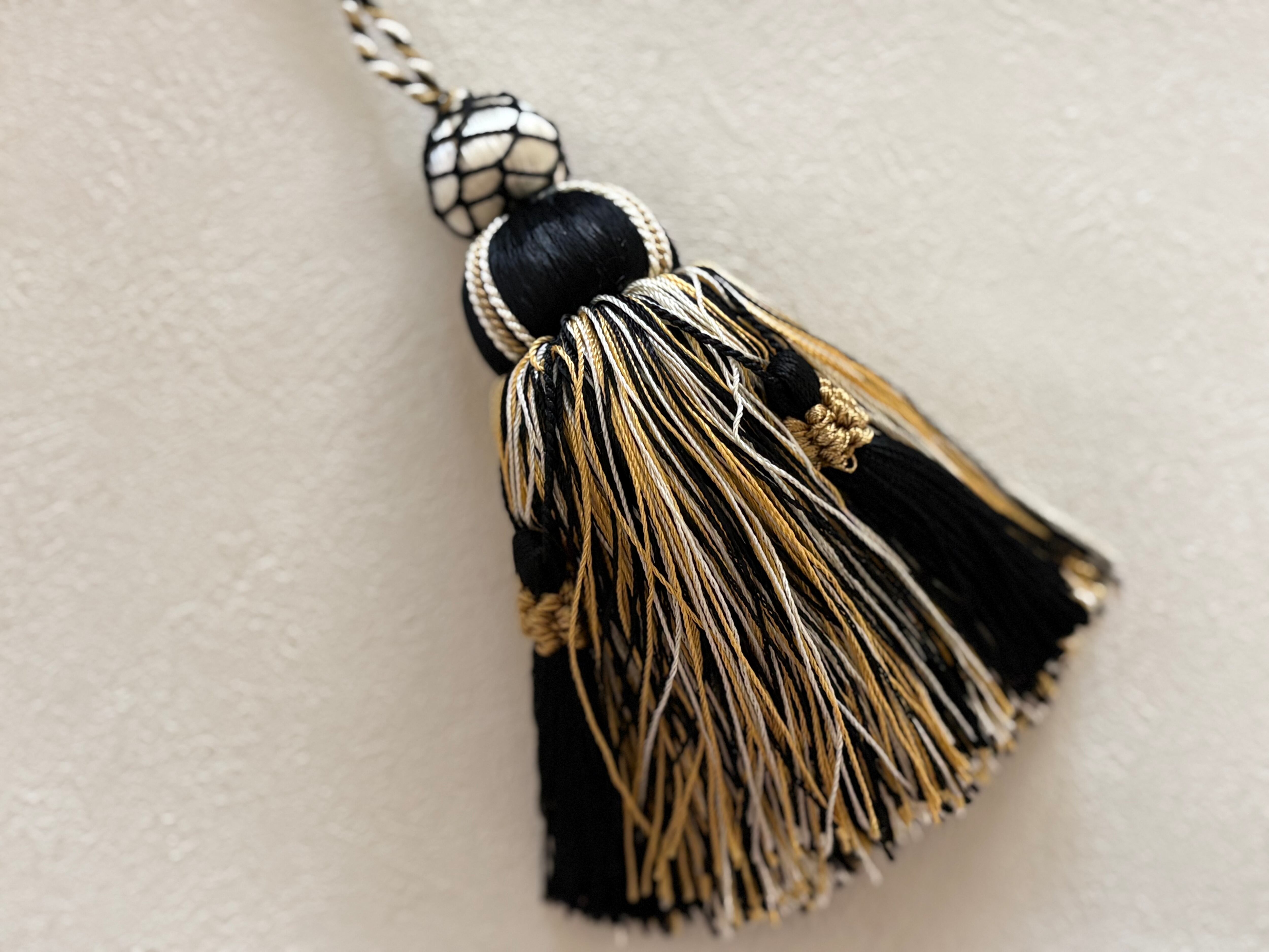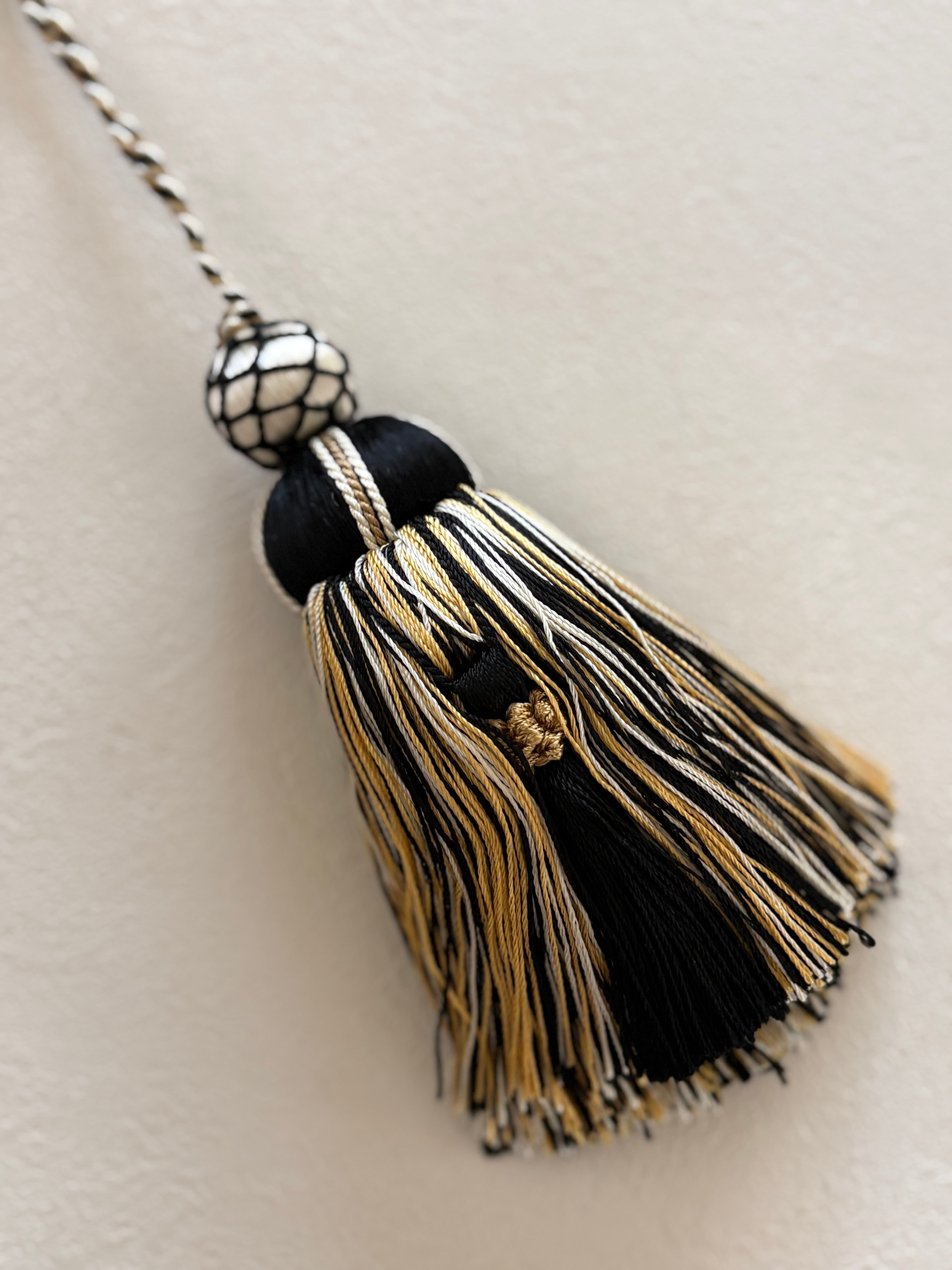 マットなブラック×アイボリー×イエローゴールドカラーの華やかなデザインのタッセルです。