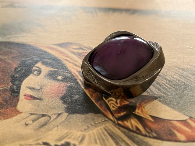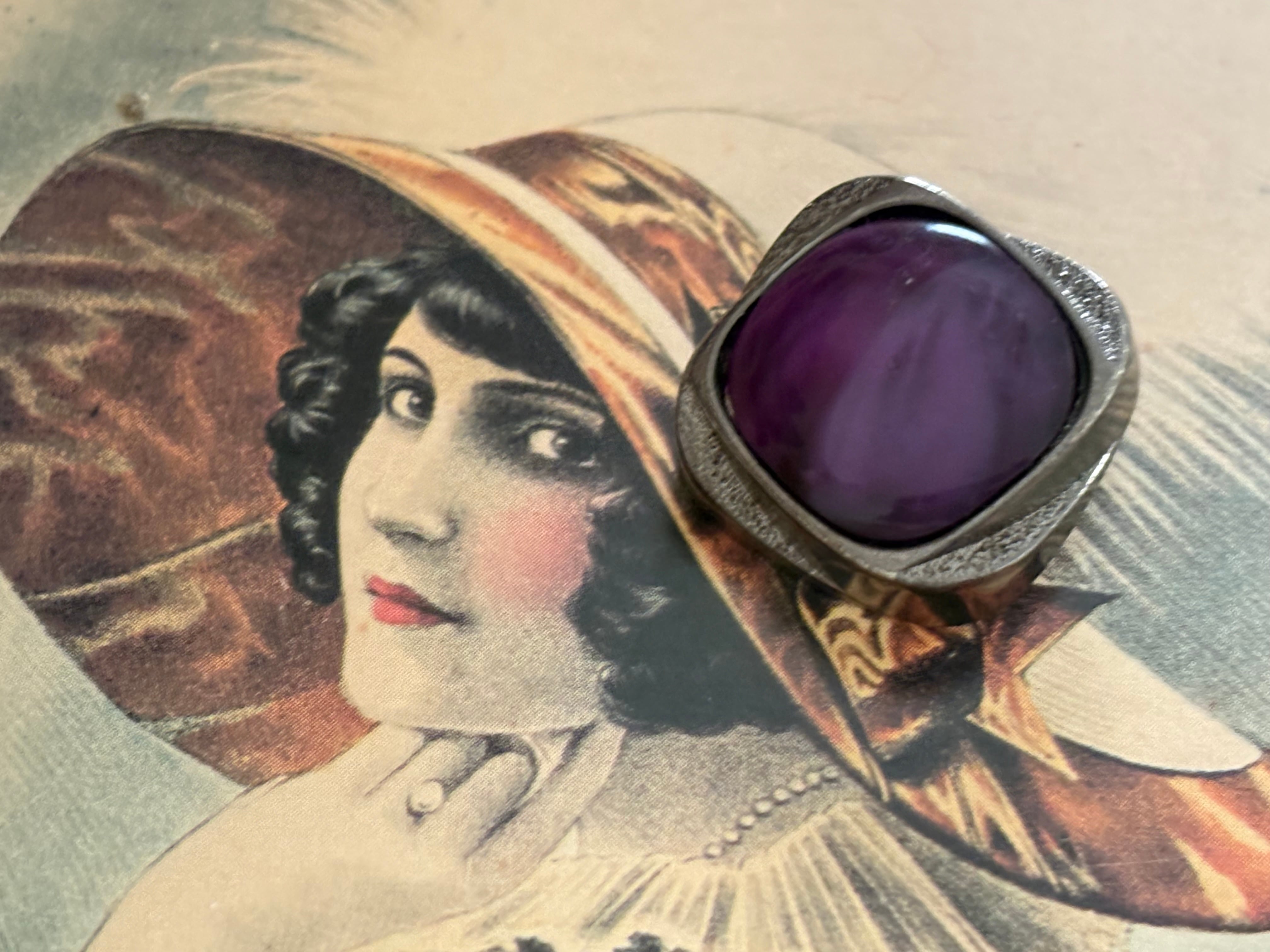 メタリックシルバーカラーの台座に艶やかなマーブル調のシックなパープルカラーのカボションが設置されています。