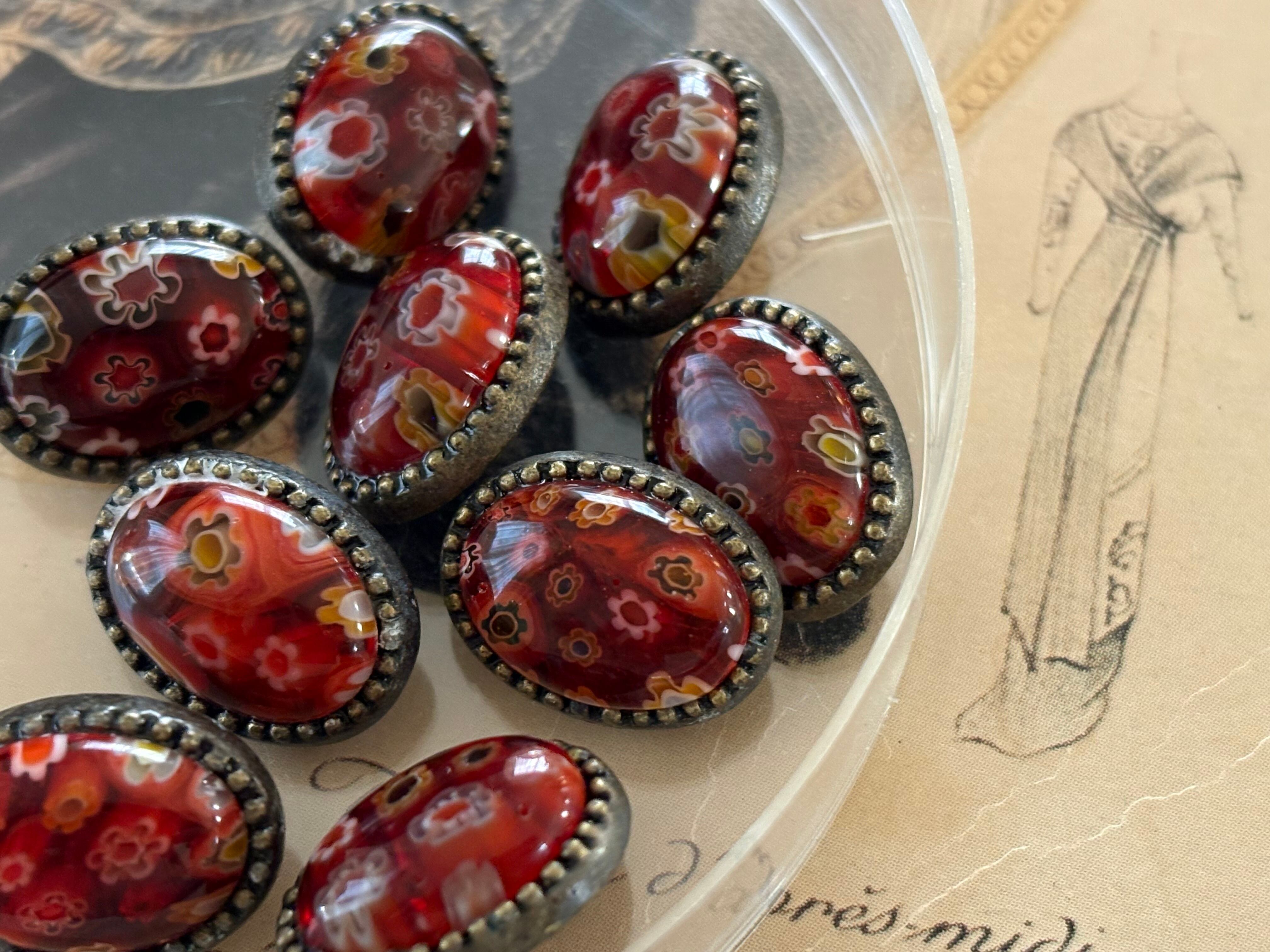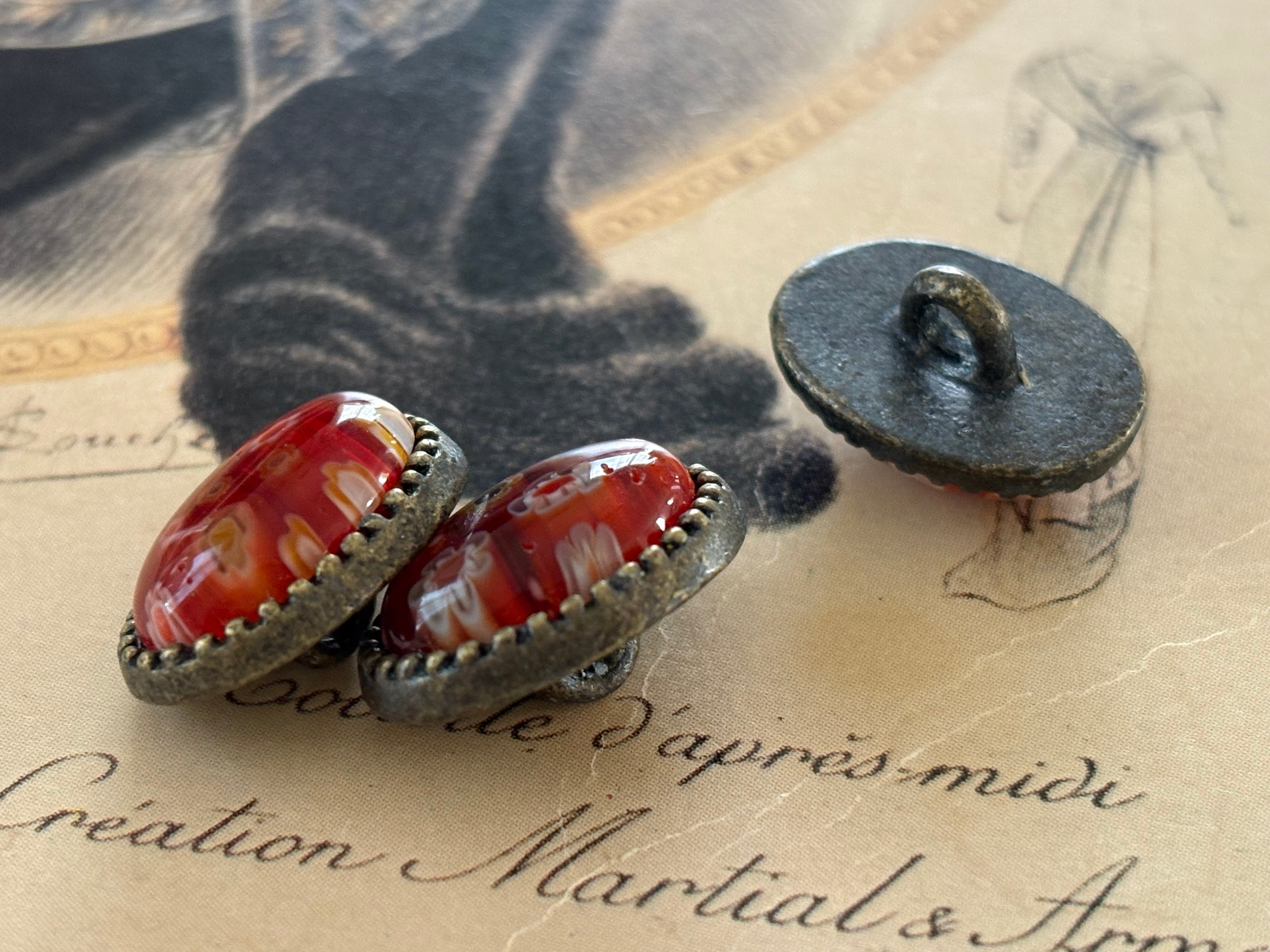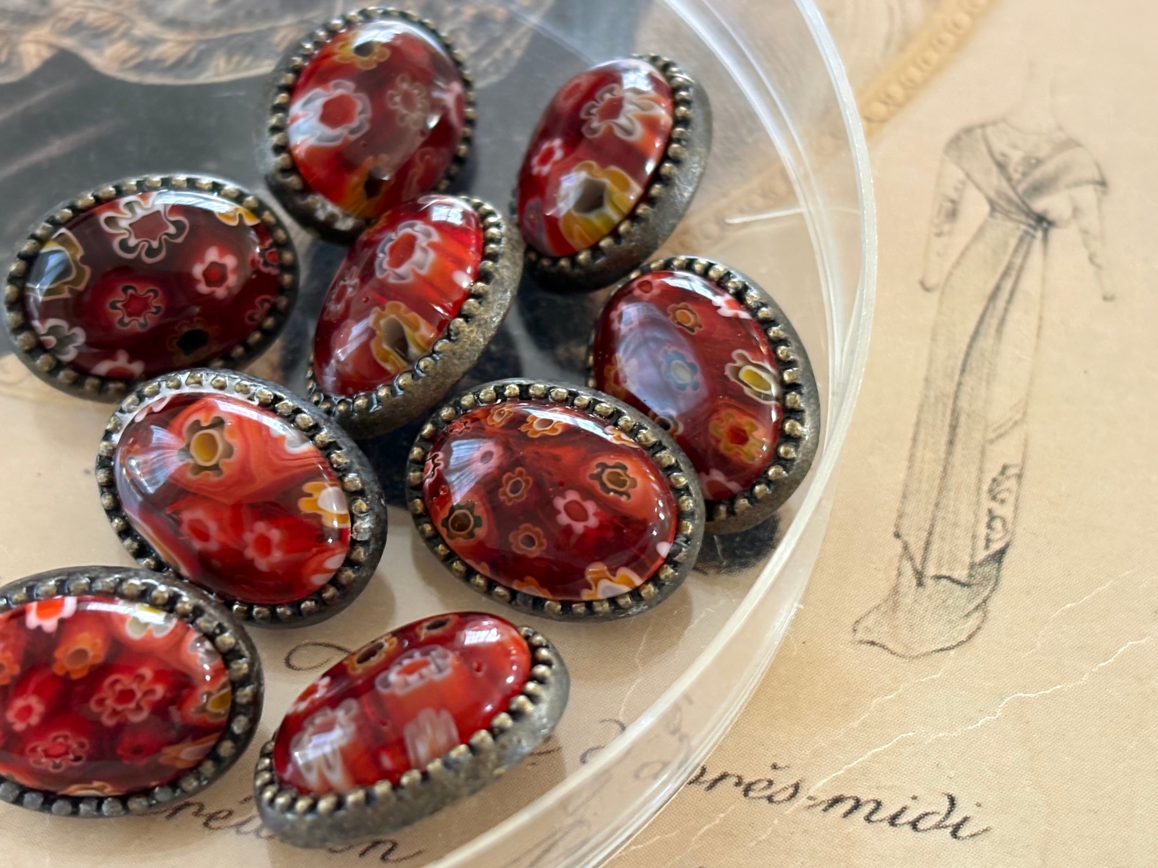 16mm×12mm 輸入デザインボタン レッド 金古美 メタル×ガラス アクセサリーパーツ デコレーション材 カルトナージュ
