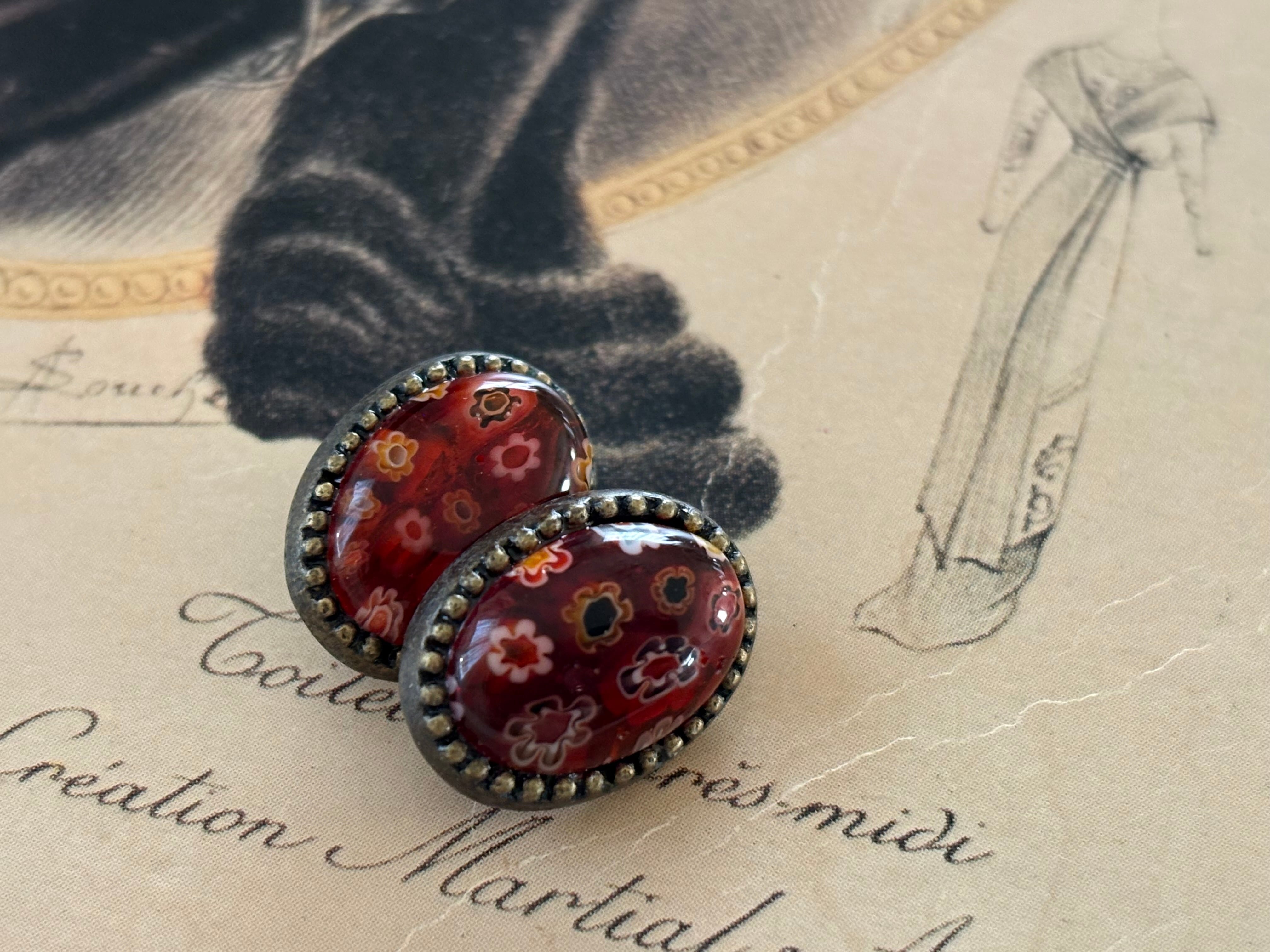 ベネチアンガラスのような風合いの深みのあるレッドに小花のデザインのカボション。