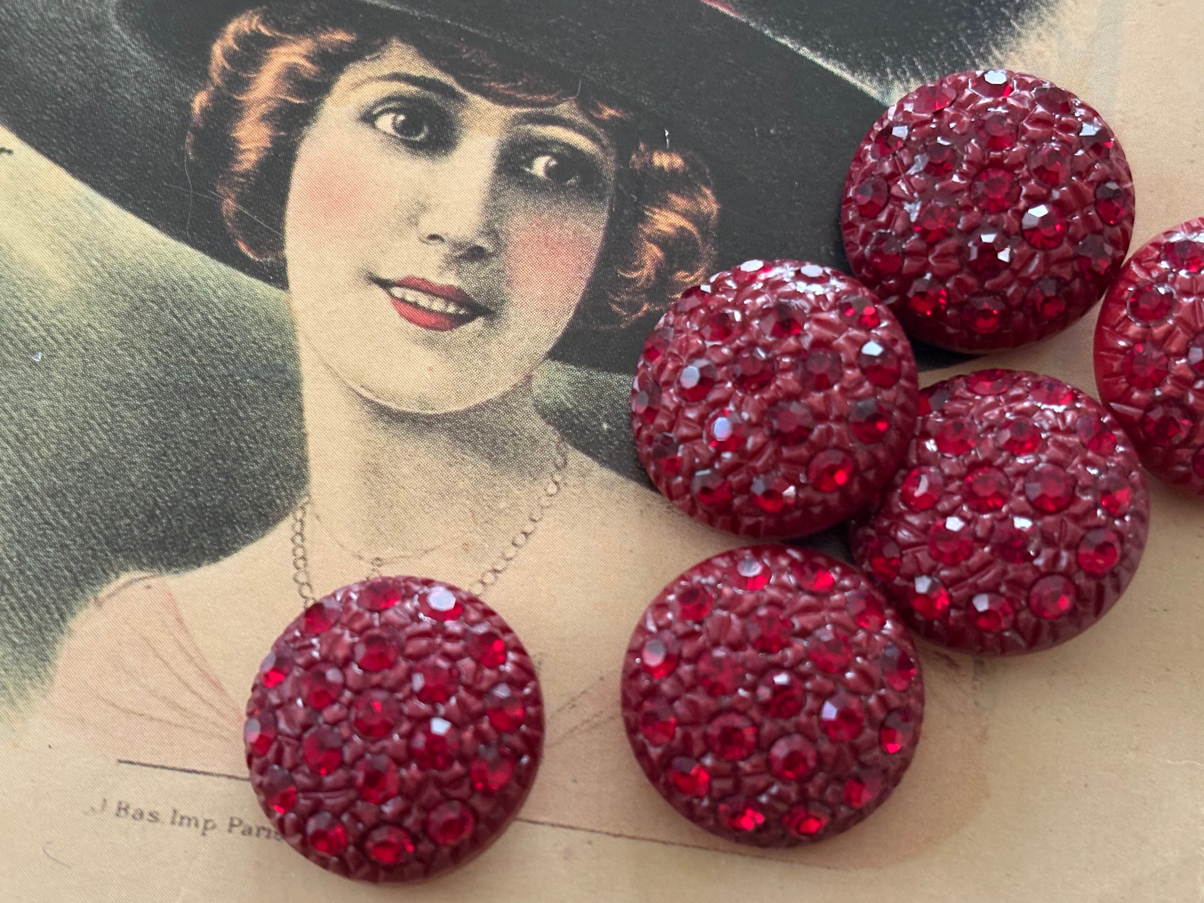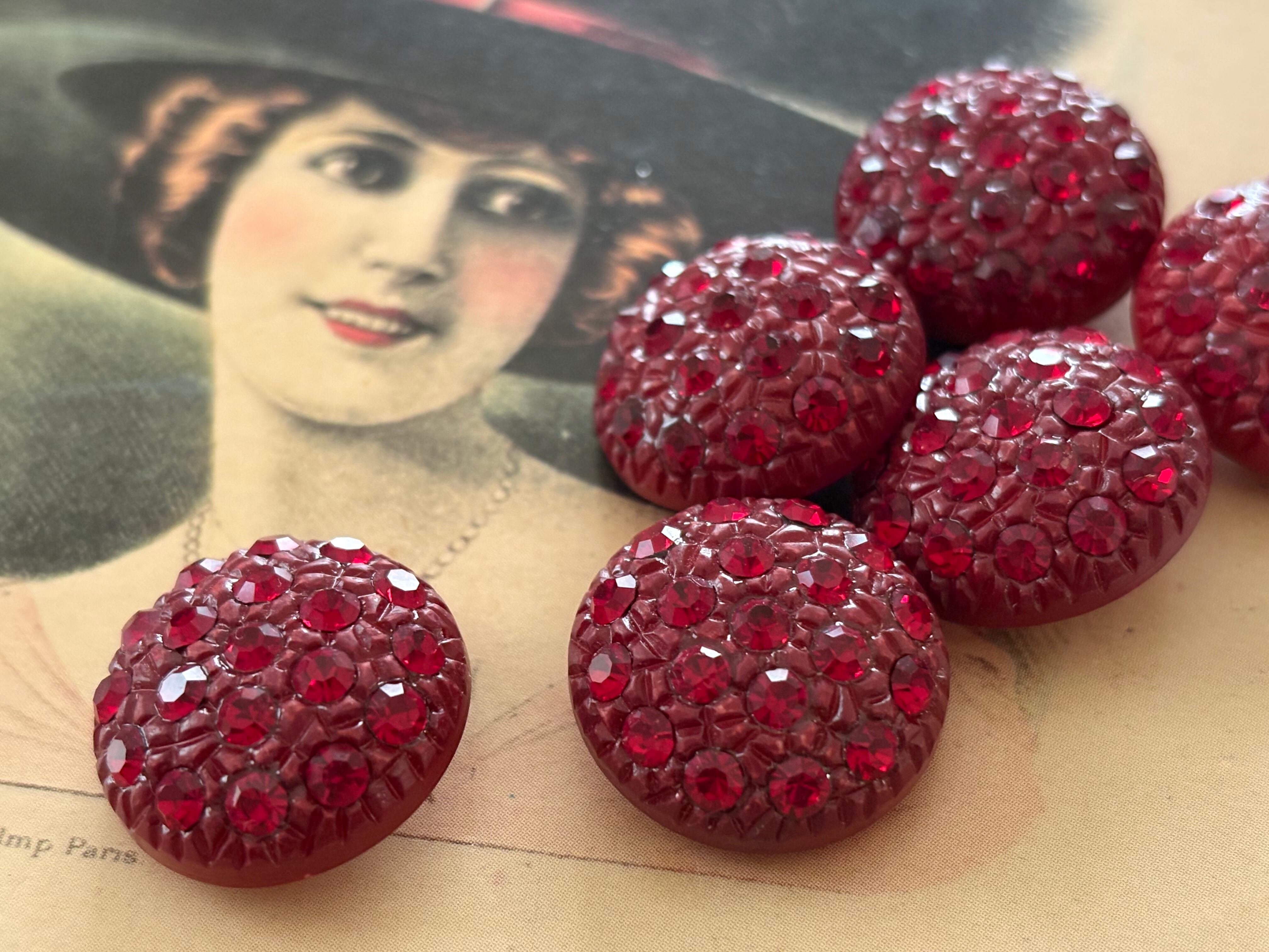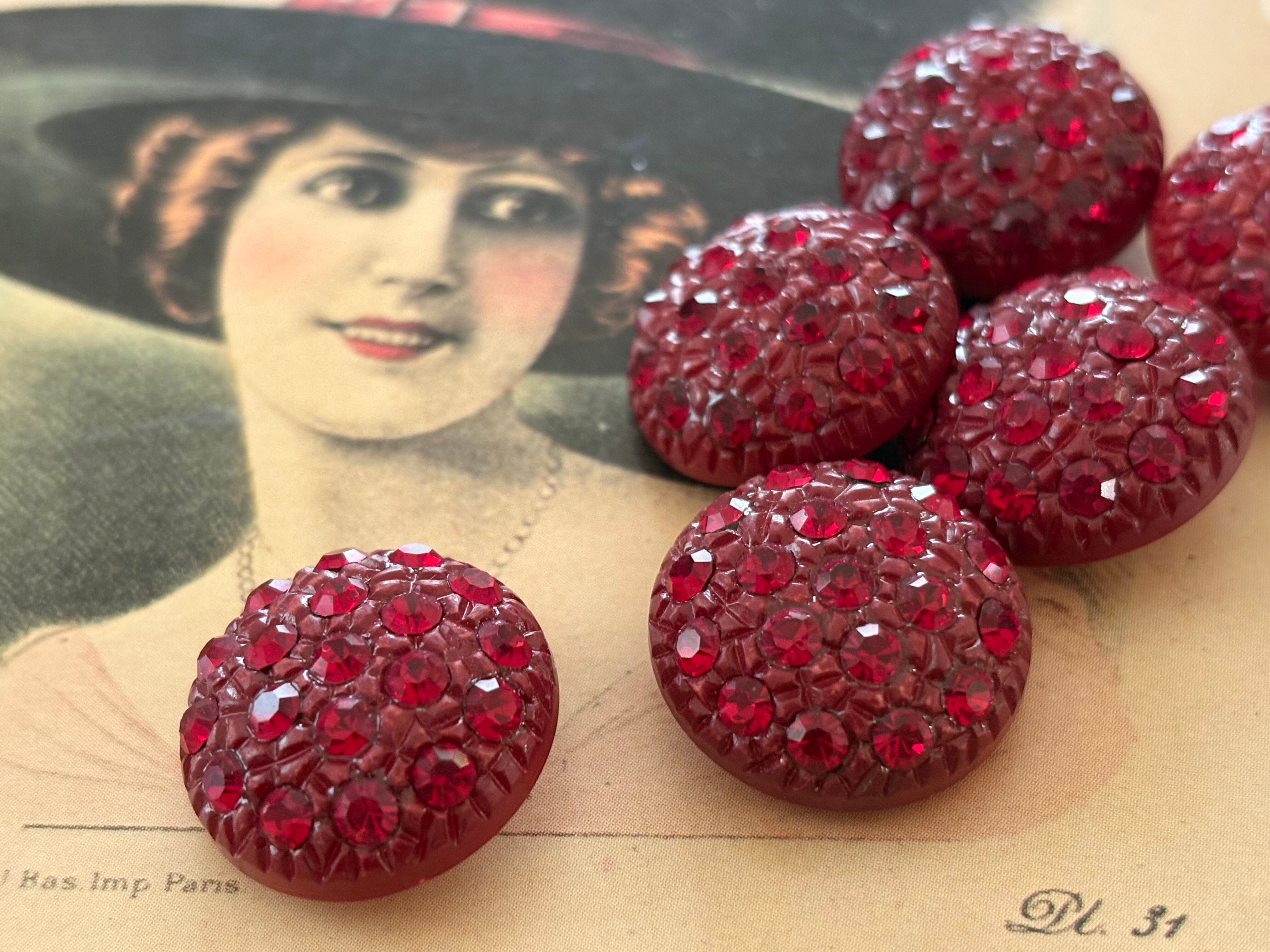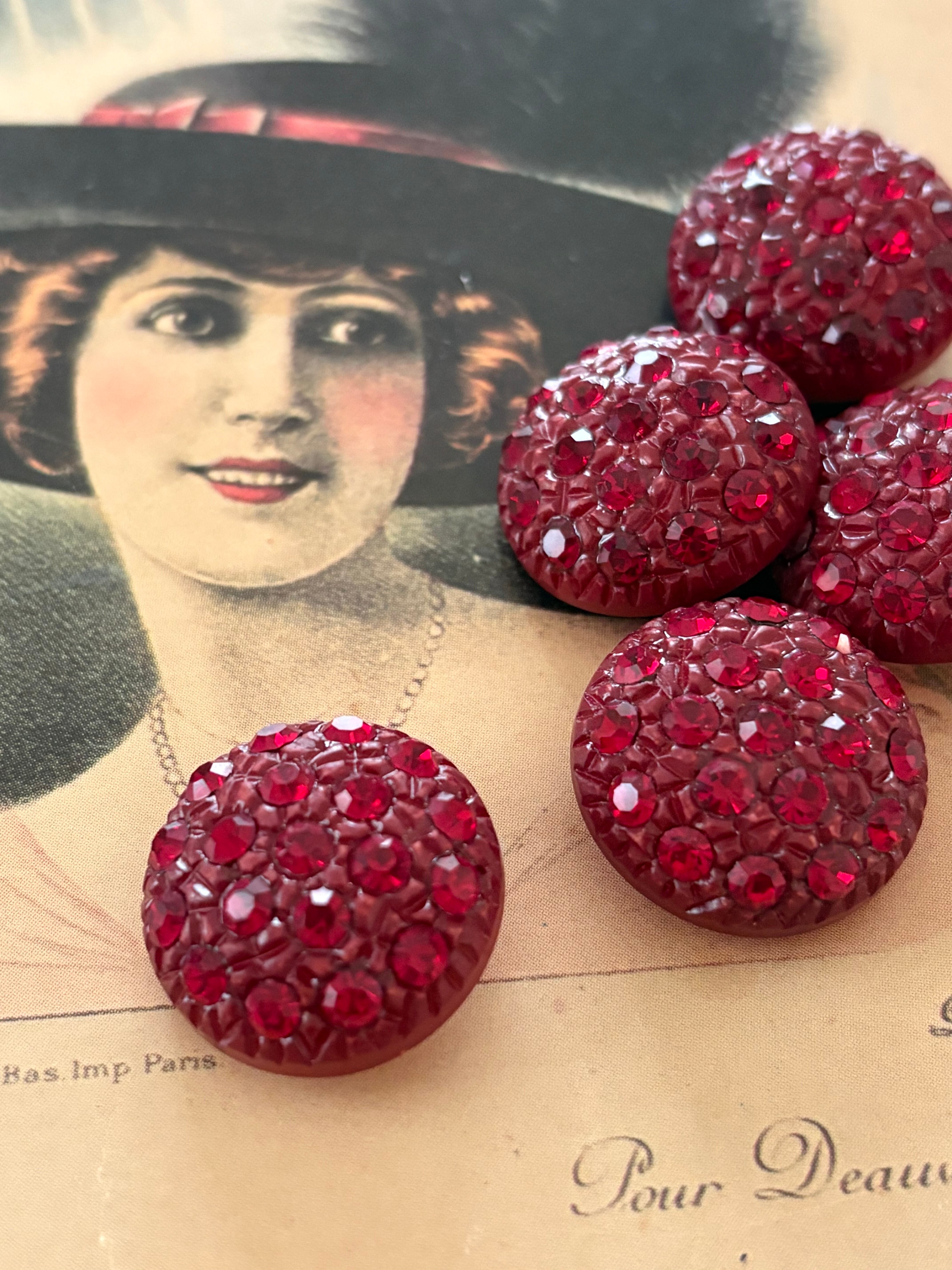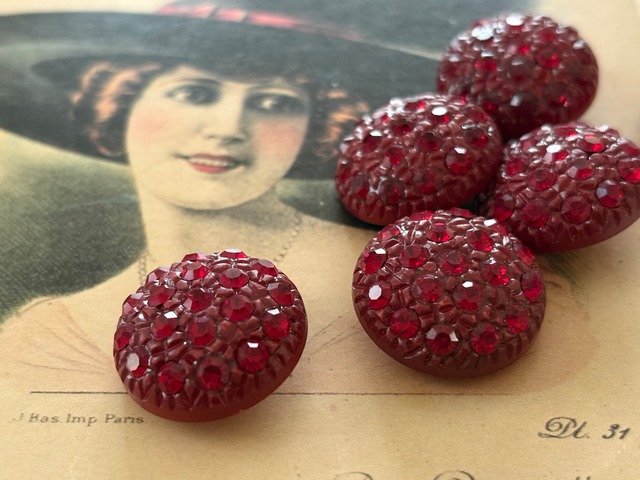 マットなレッドカラーのボタンの表面一面に19粒のストーン。