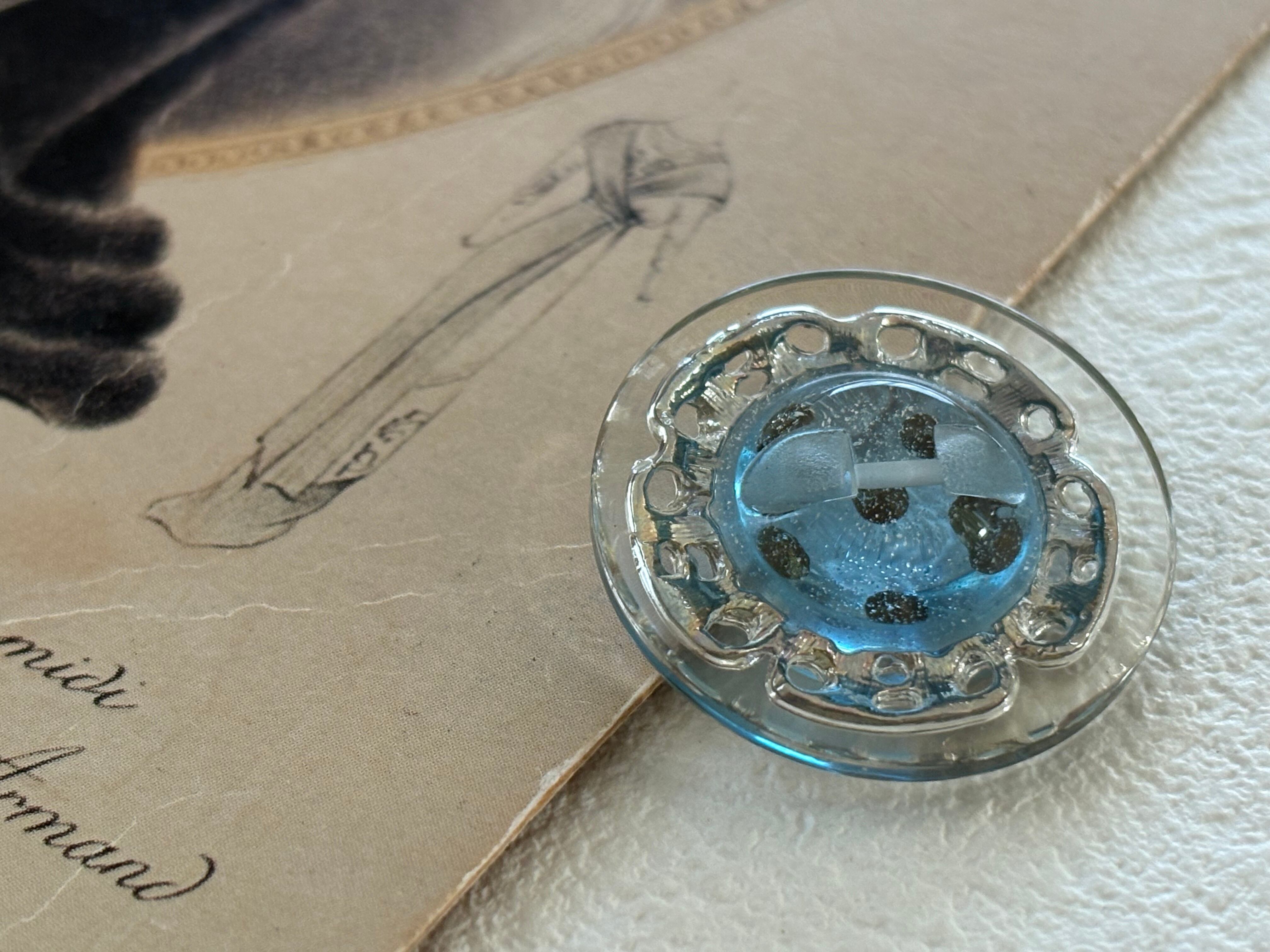 クリアカラーの樹脂ボタン。中央部分はグリッターが施されたライトブルーカラー。