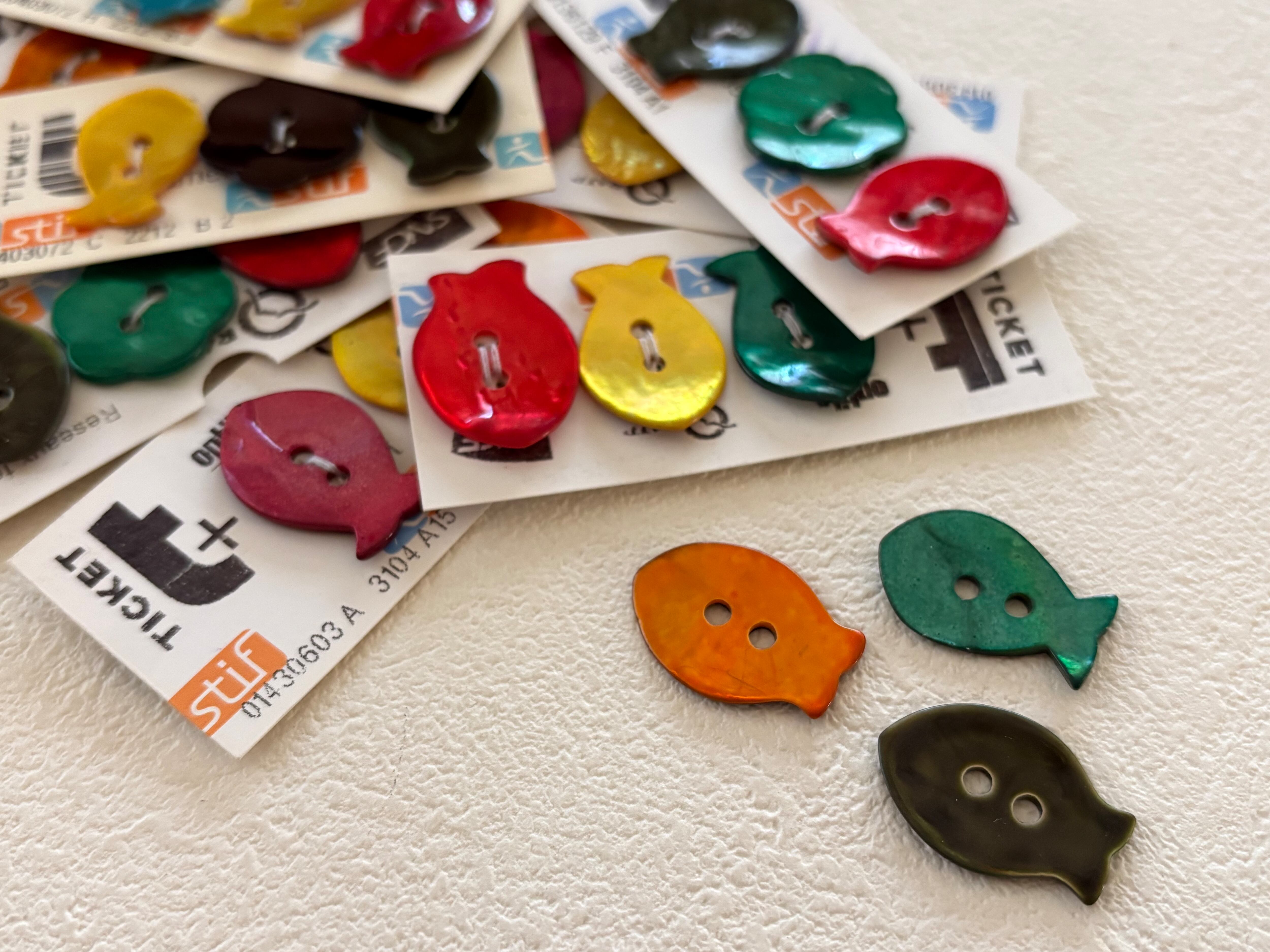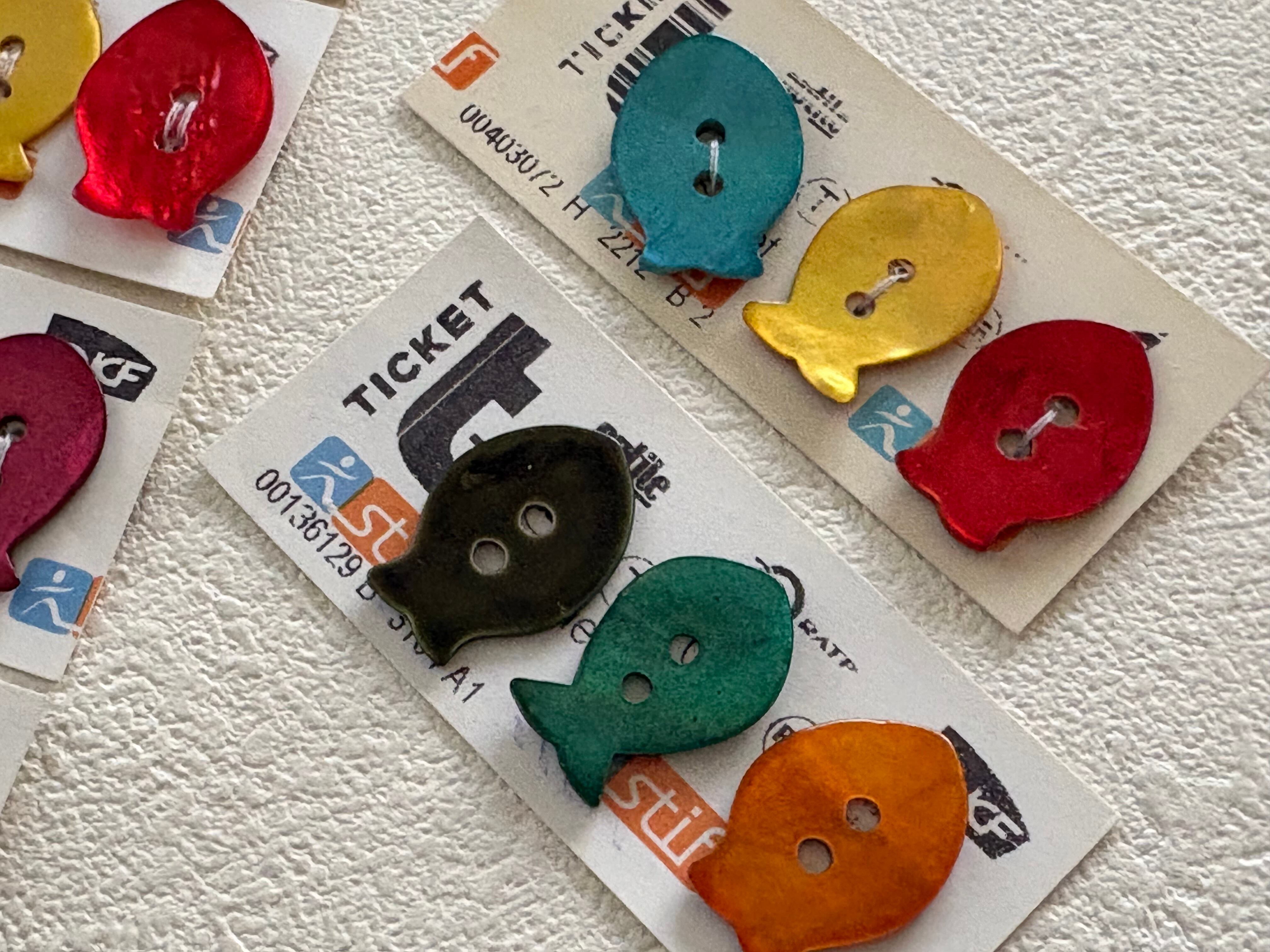 22mm前後 フランス ヴィンテージボタン ポワソン/フルール 3個セット シェルボタン シート付 魚 花 ハンドメイド 撮影小物