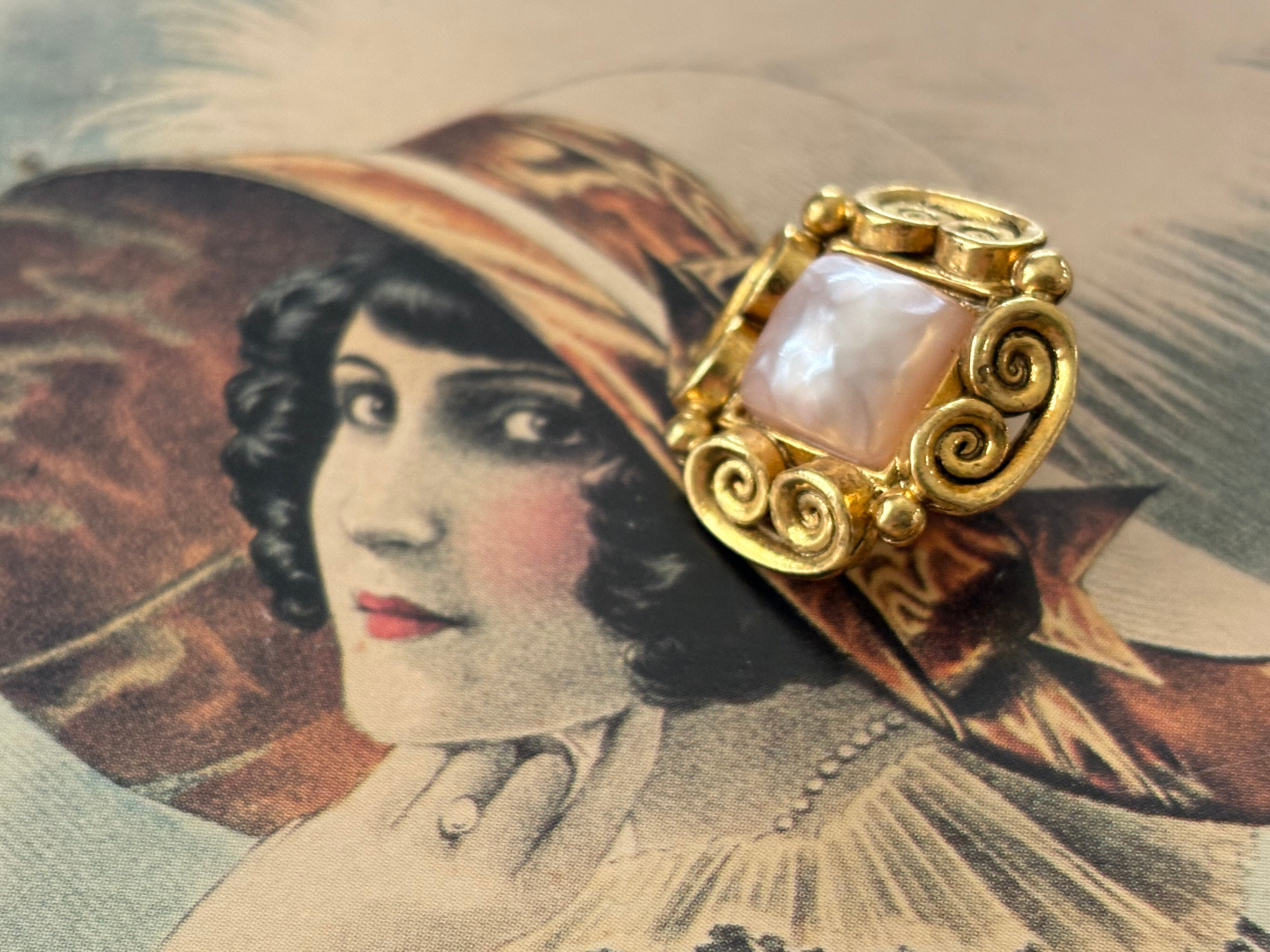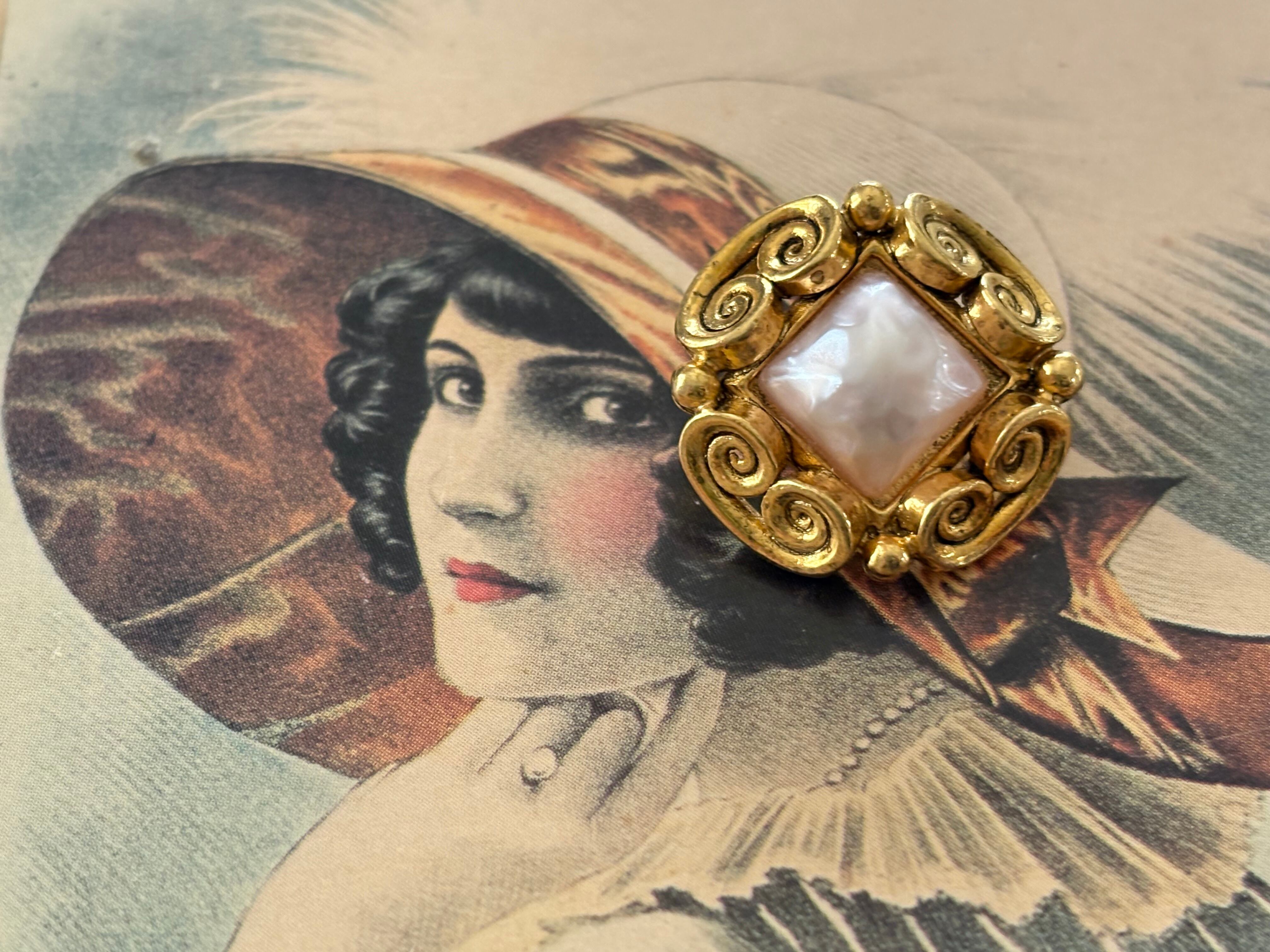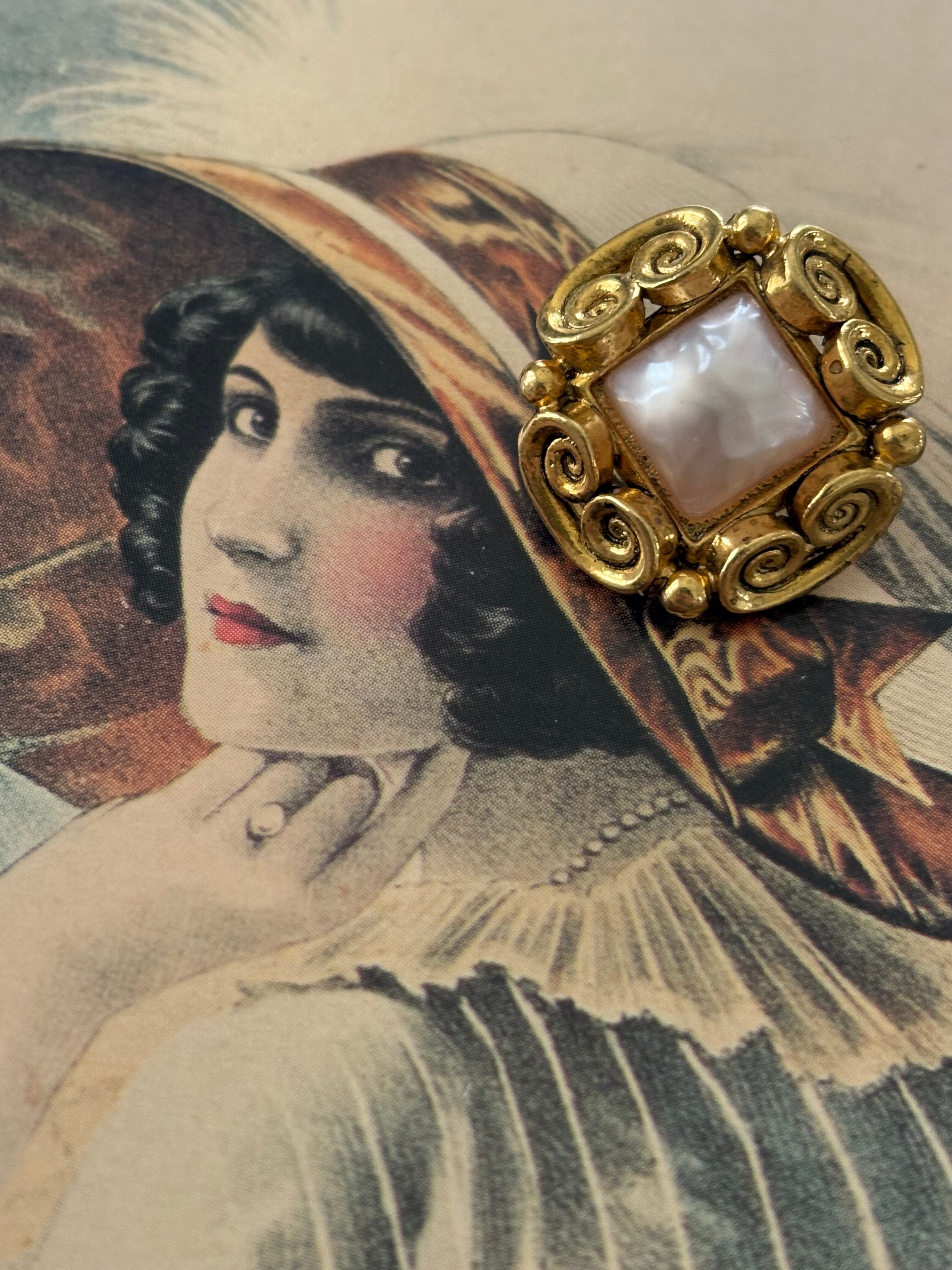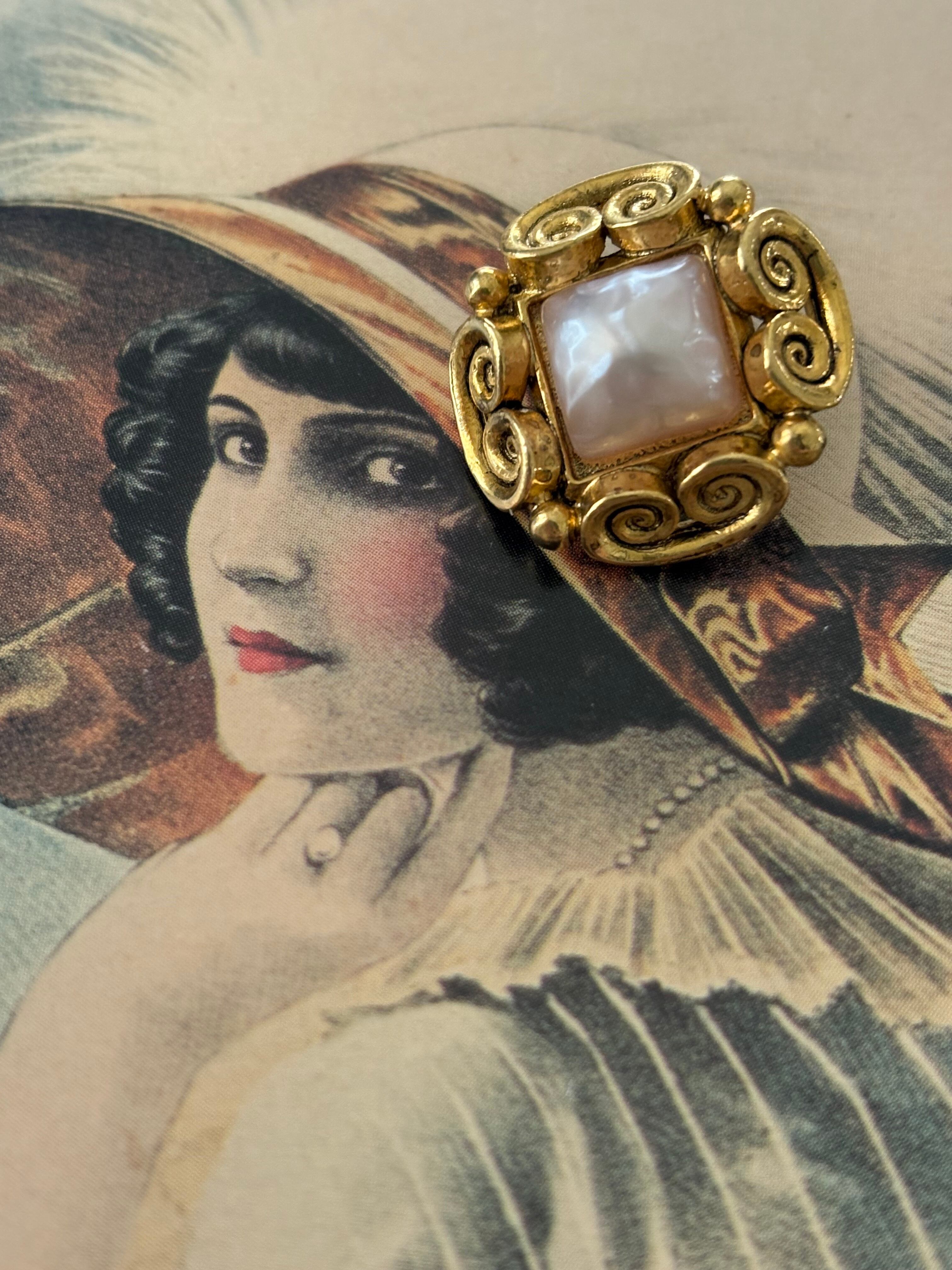 メタル製の台座の中央にドーム型の上品なパール調のカボションが設置されています。
