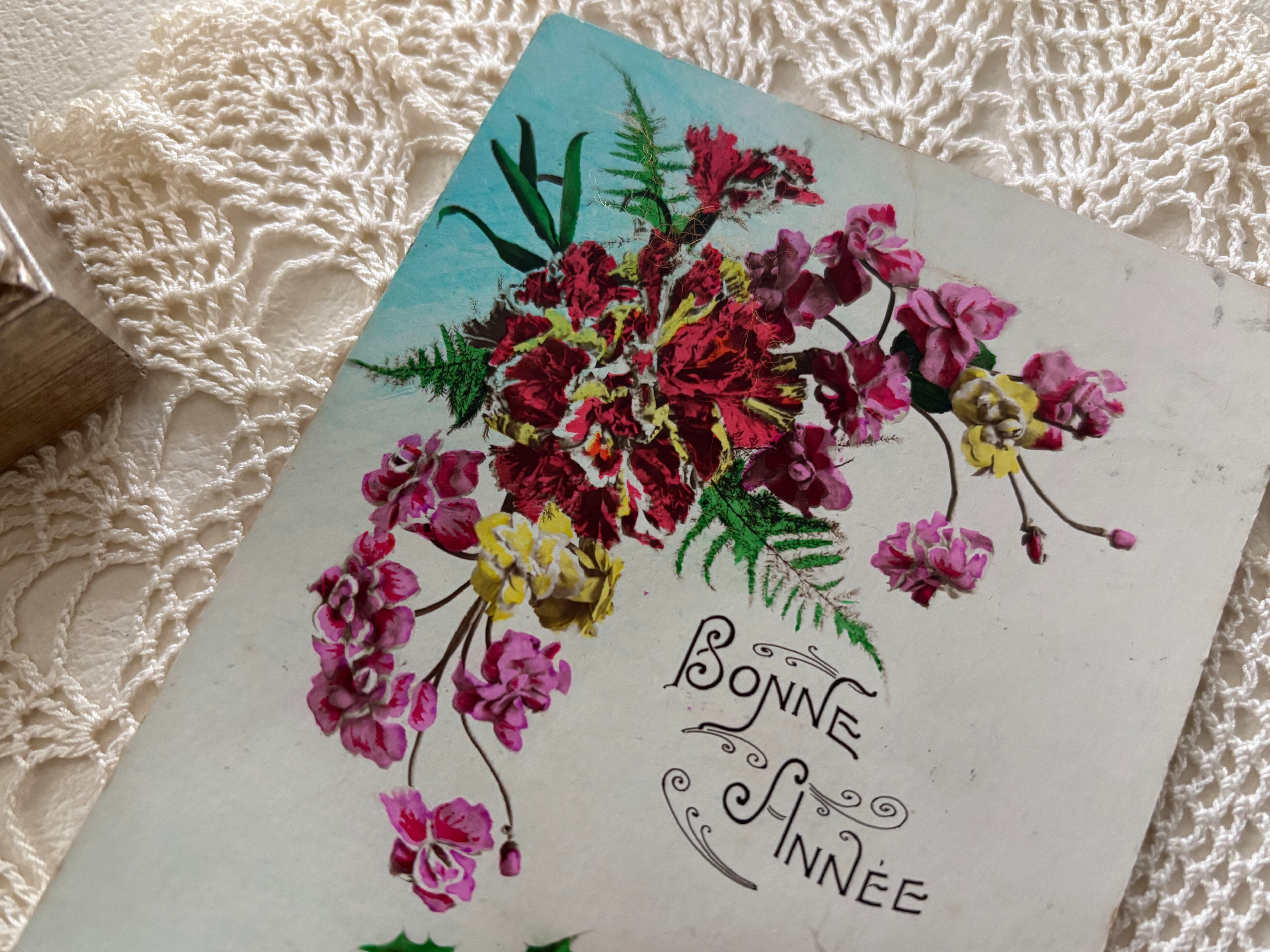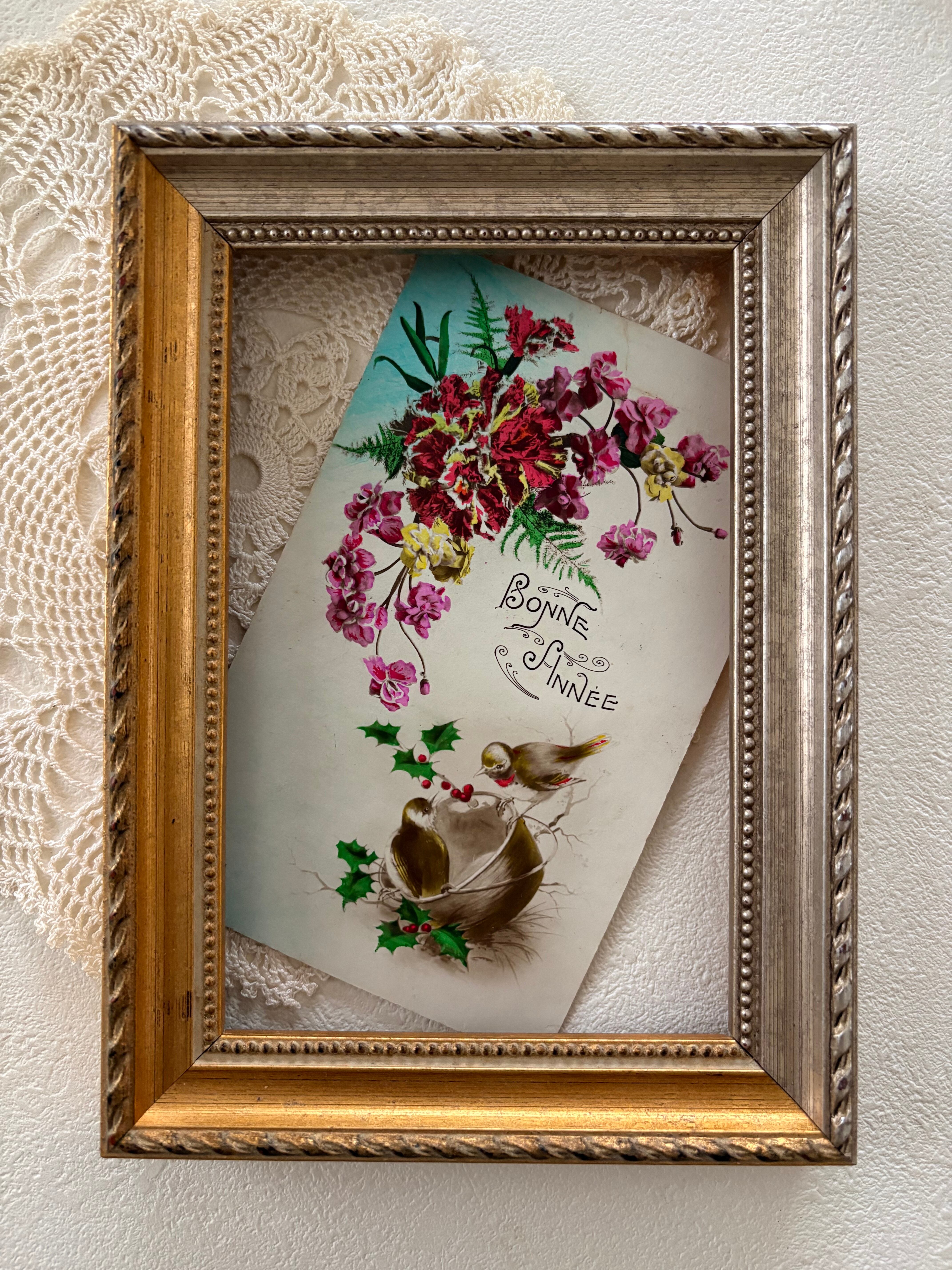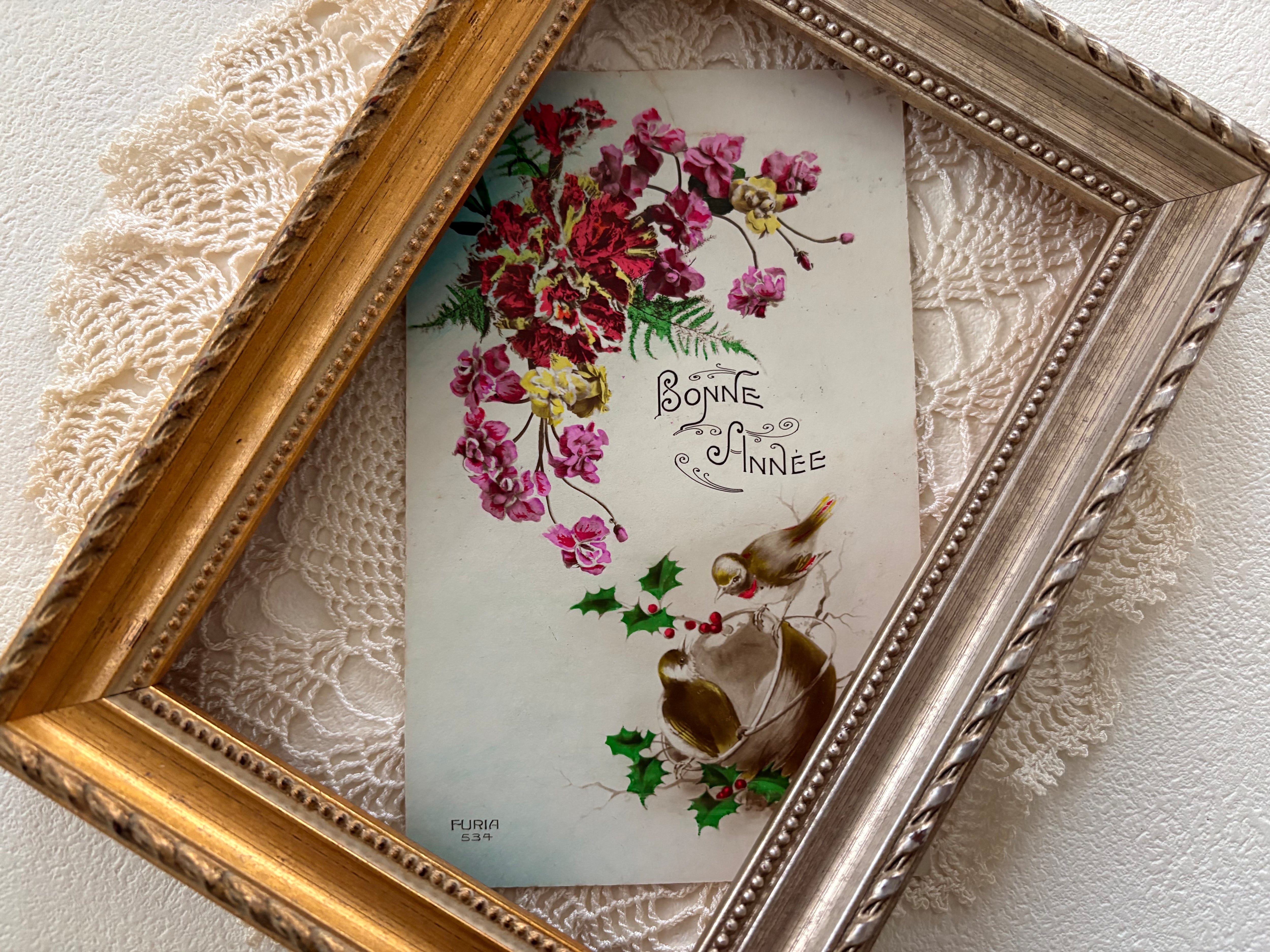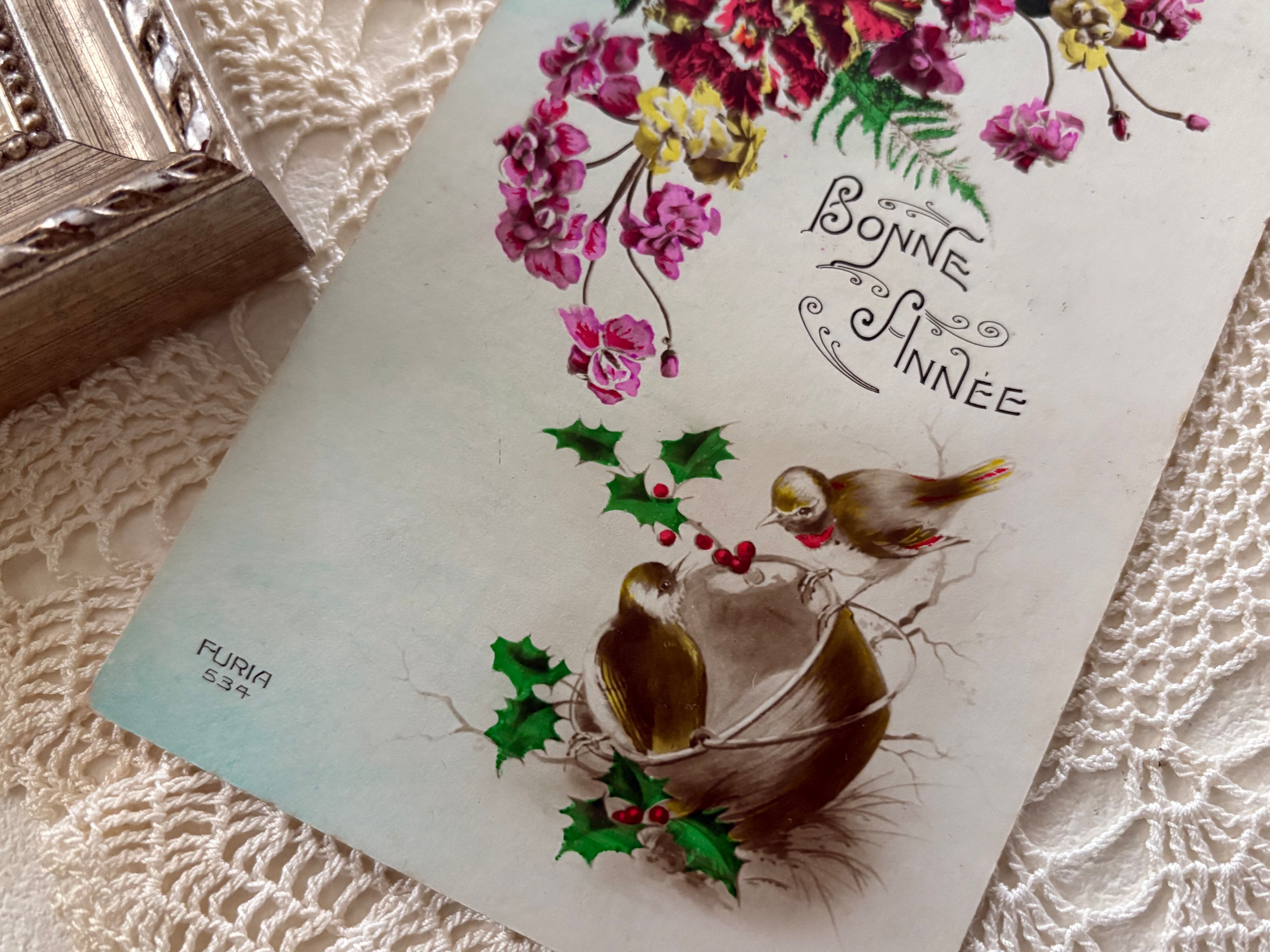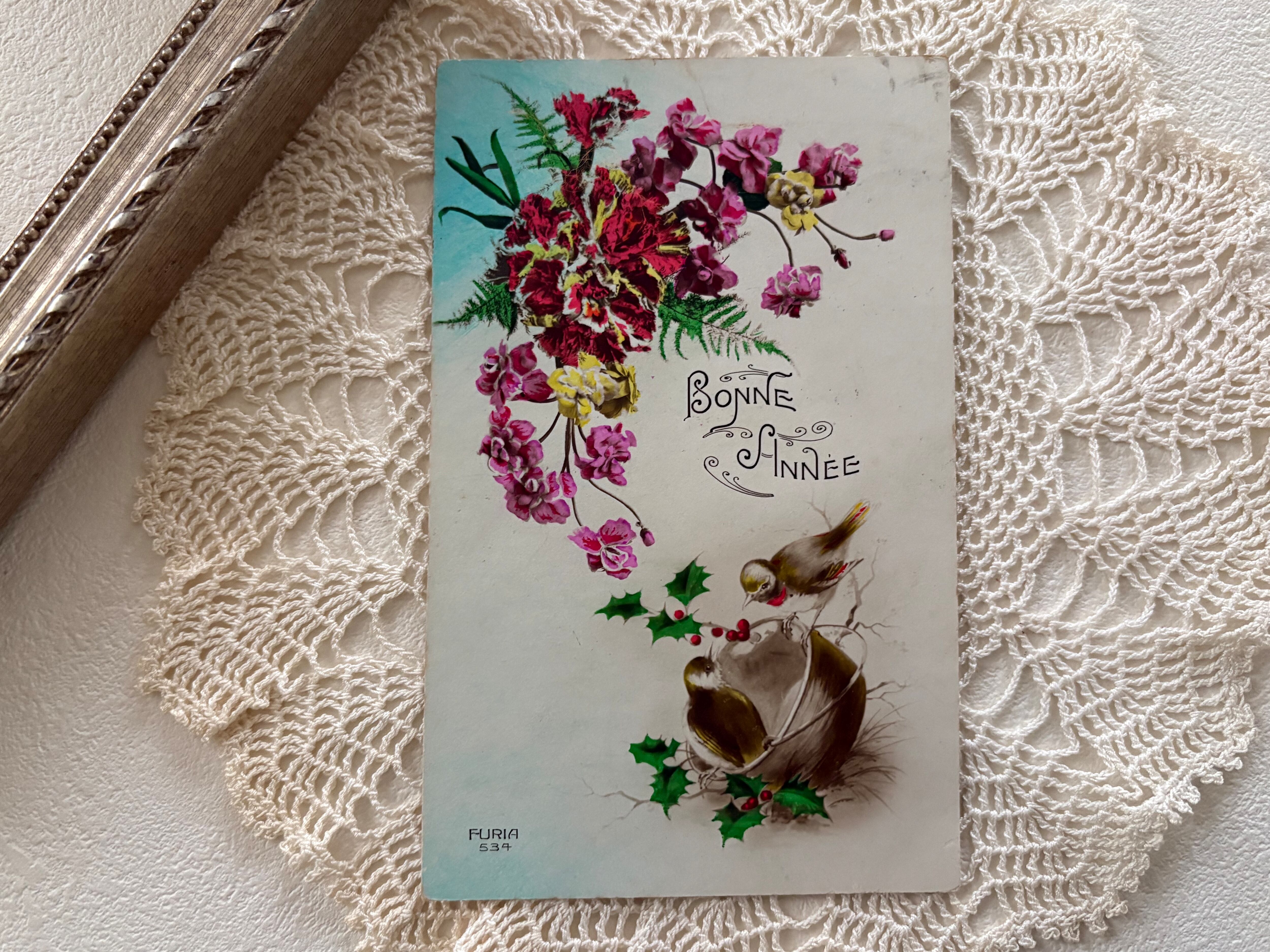 アンティークポストカード Bonne Anee 2羽の小鳥 柊 フラワー 新年〜クリスマス Noel フランス 額装 インテリア