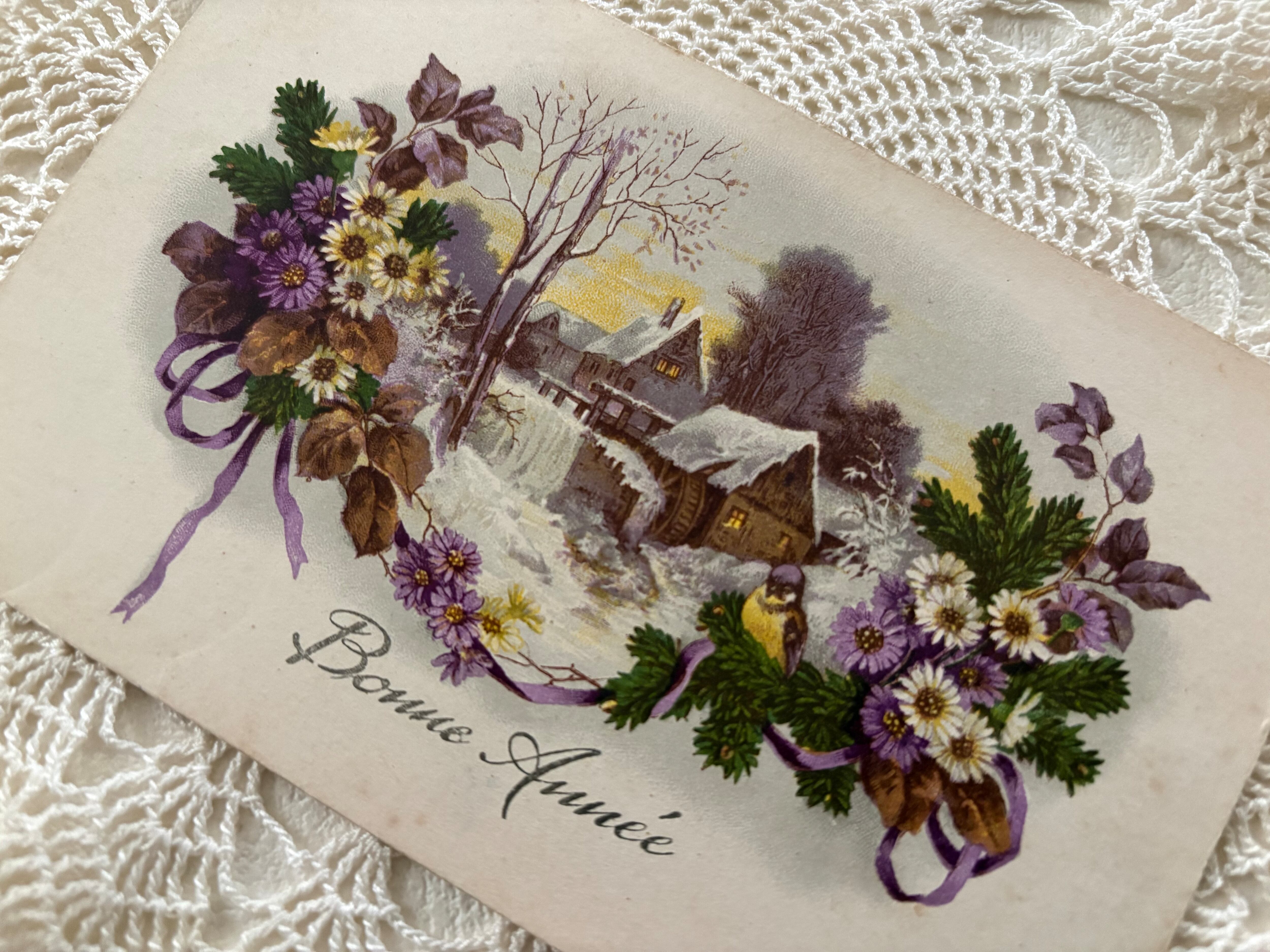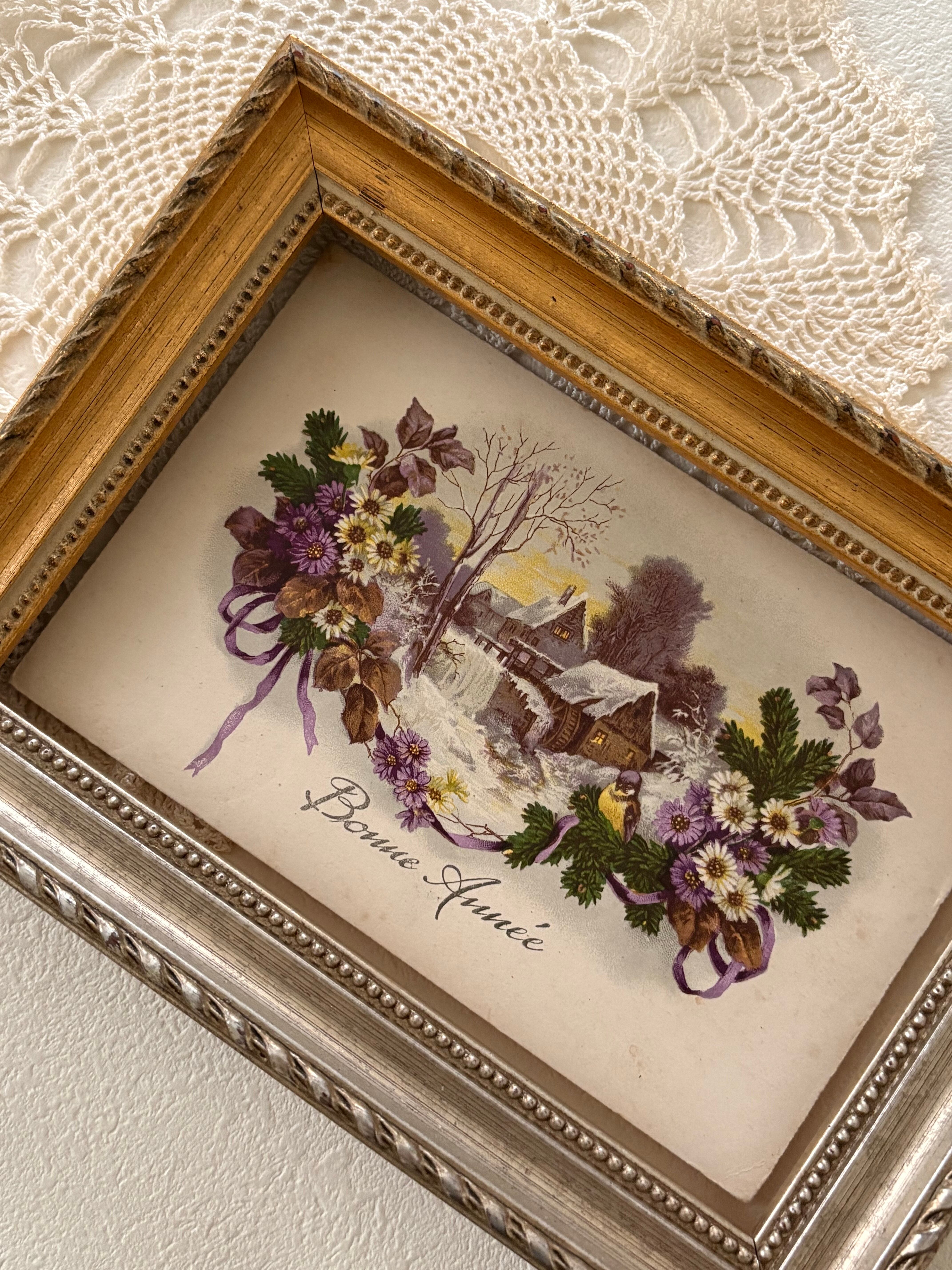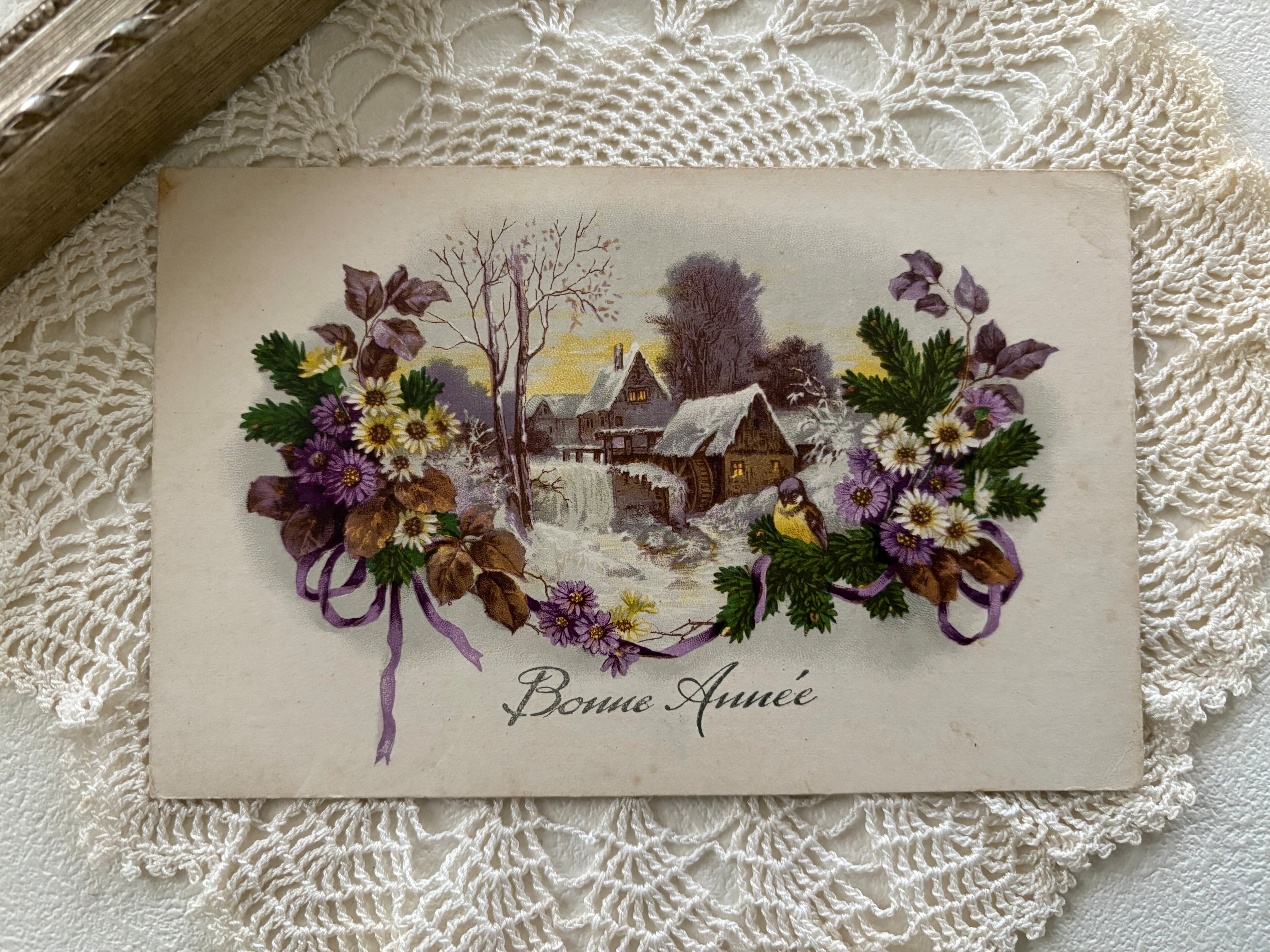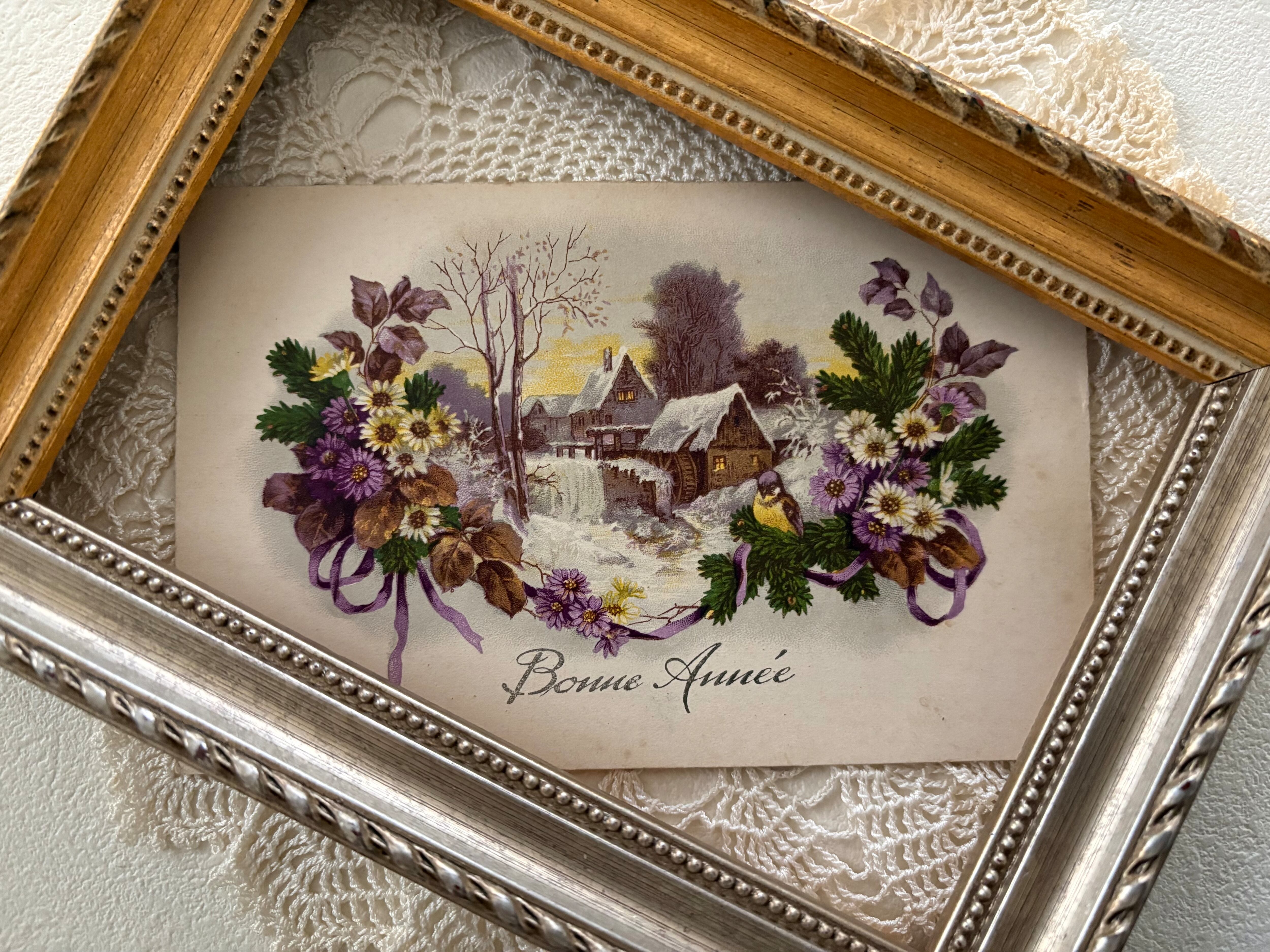 アンティークポストカード Bonne Anee 小鳥 ガーランド リボン 雪景色 フラワー 新年〜クリスマス Noel フランス 額装 インテリア