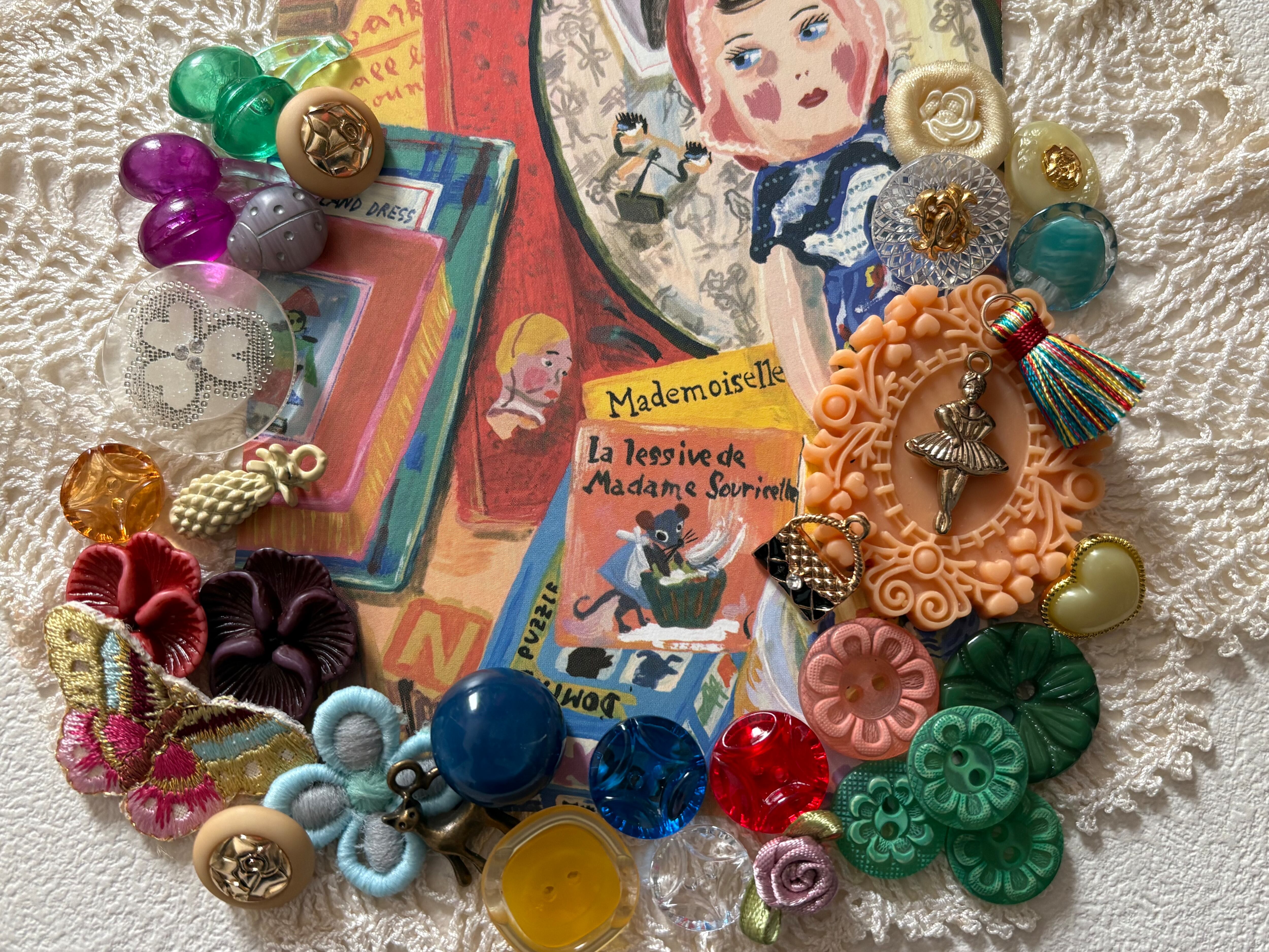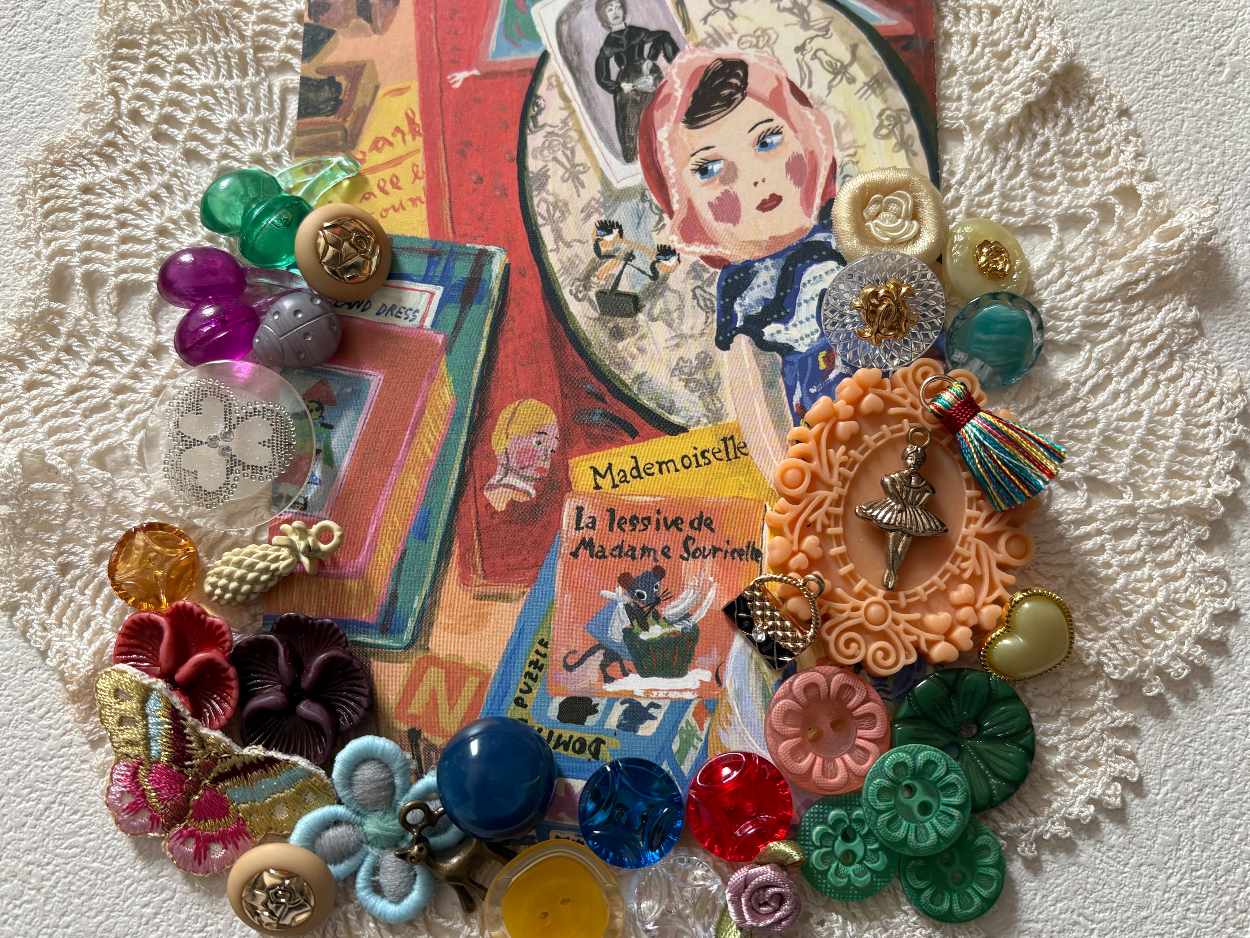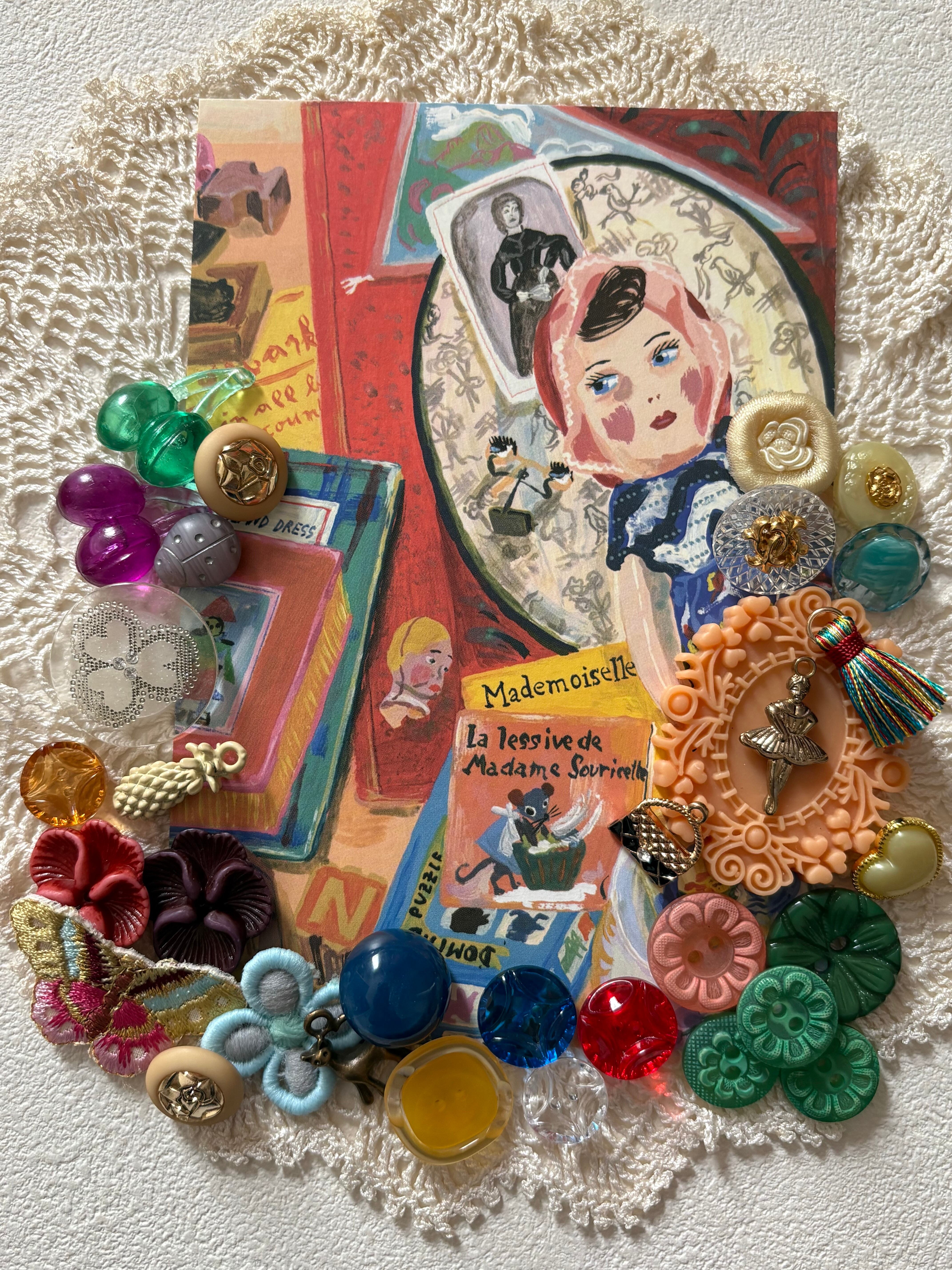 画像にございますレトロボタン、ヴィンテージボタン、ヴィンテージパーツ、輸入デザインパーツ、輸入デザインボタン、タッセル、ナタリーレテのポストカードのセットになります。