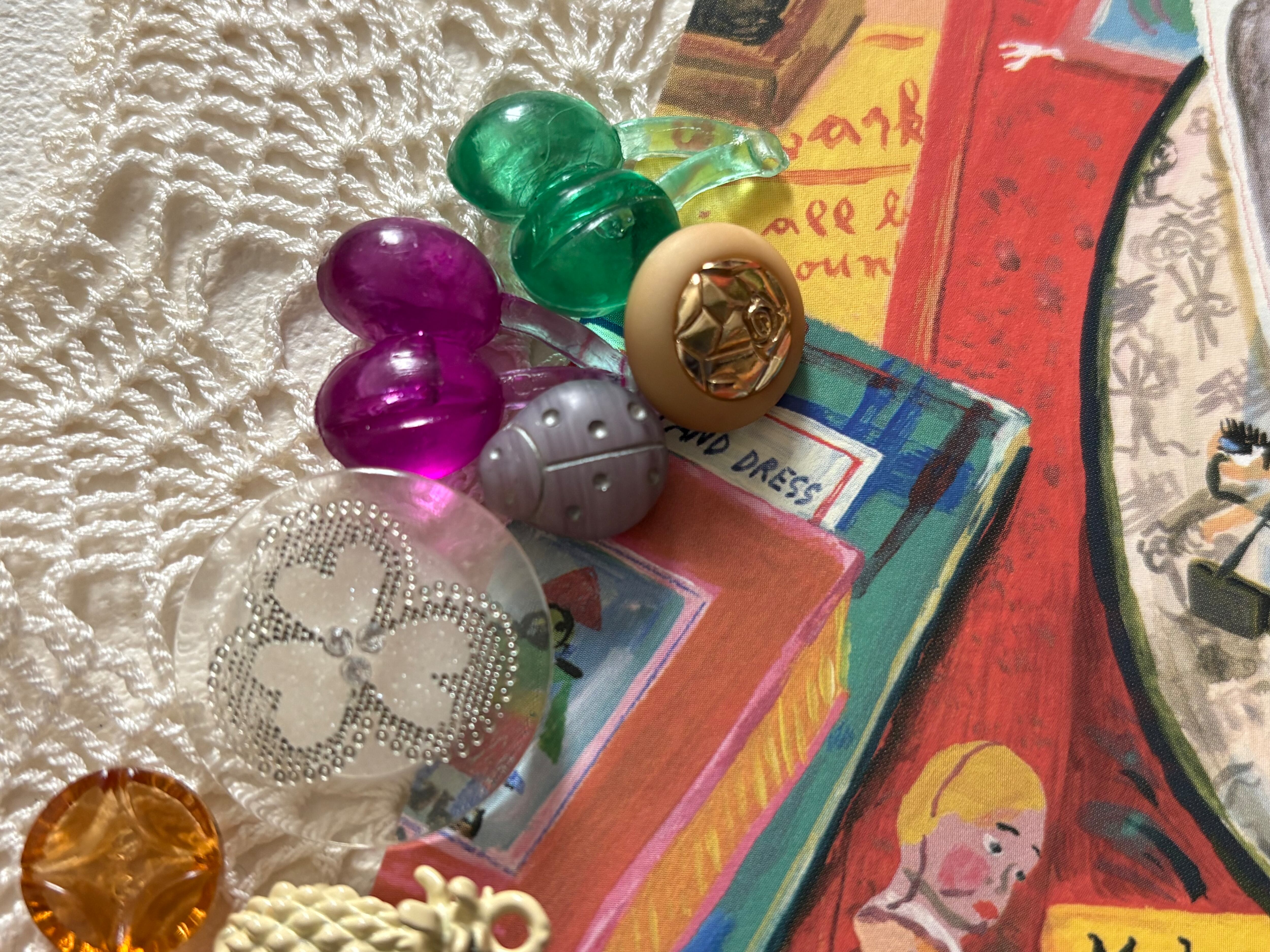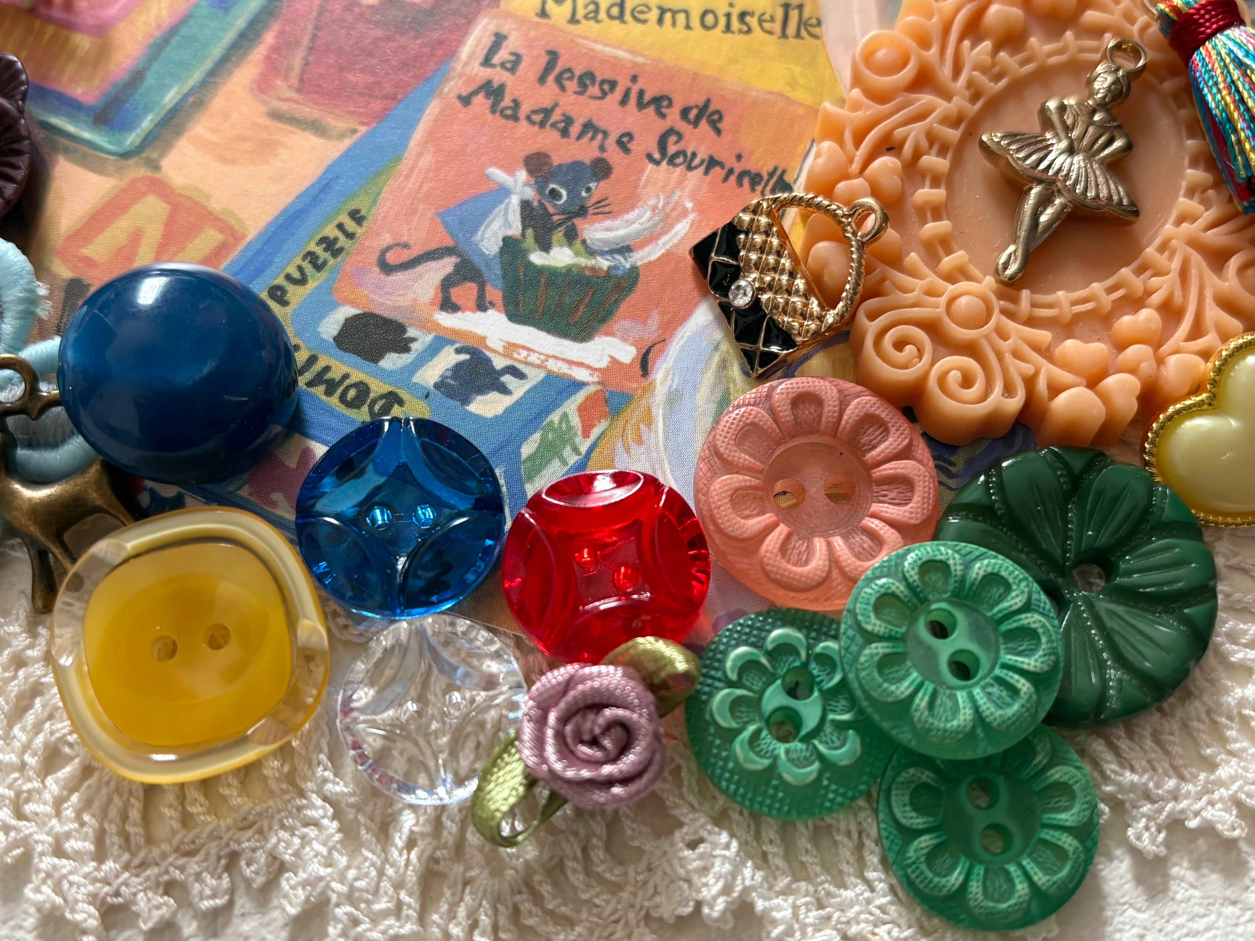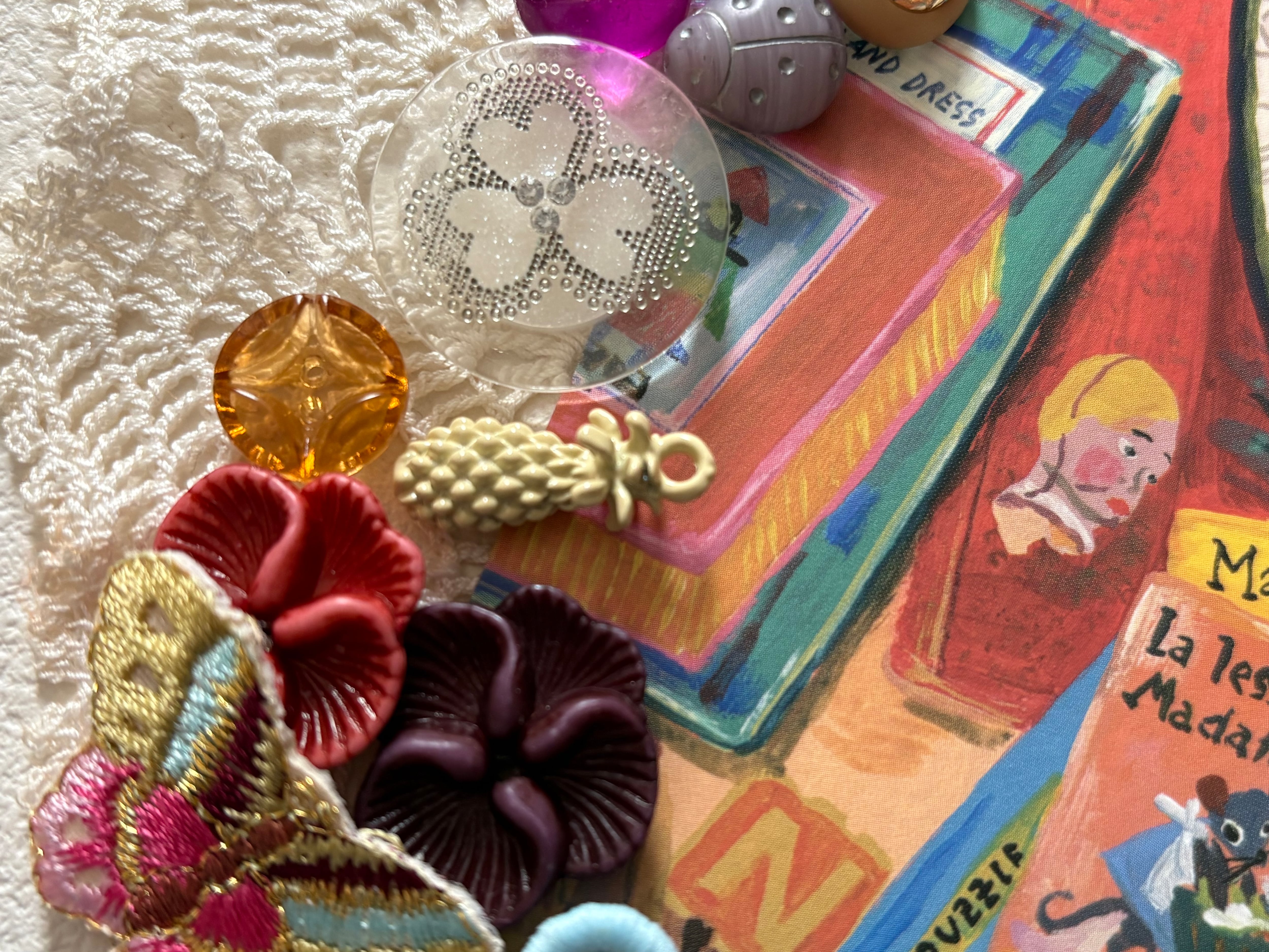 画像にございますレトロボタン、ヴィンテージボタン、ヴィンテージパーツ、輸入デザインパーツ、輸入デザインボタン、タッセル、ナタリーレテのポストカードのセットになります。