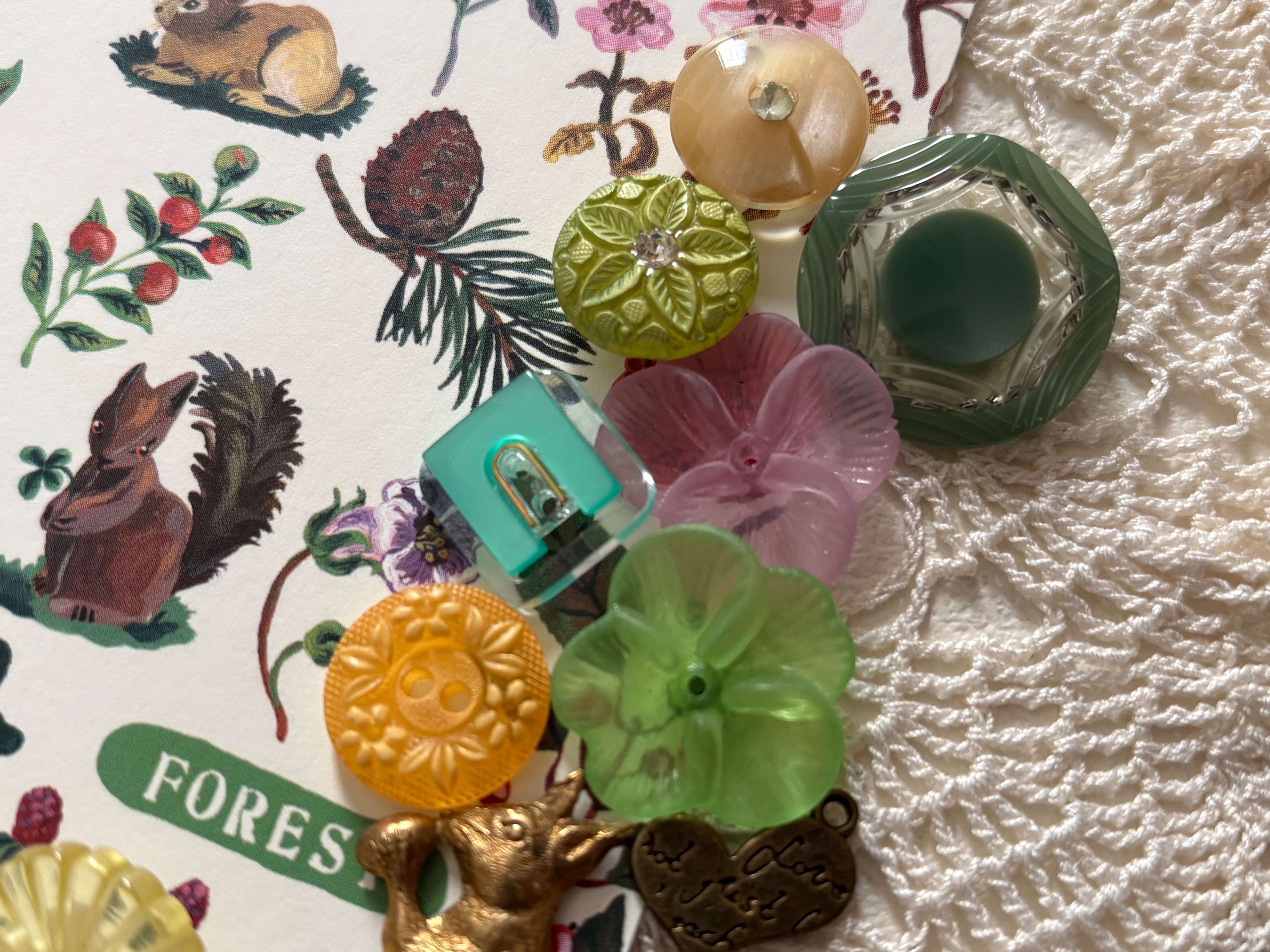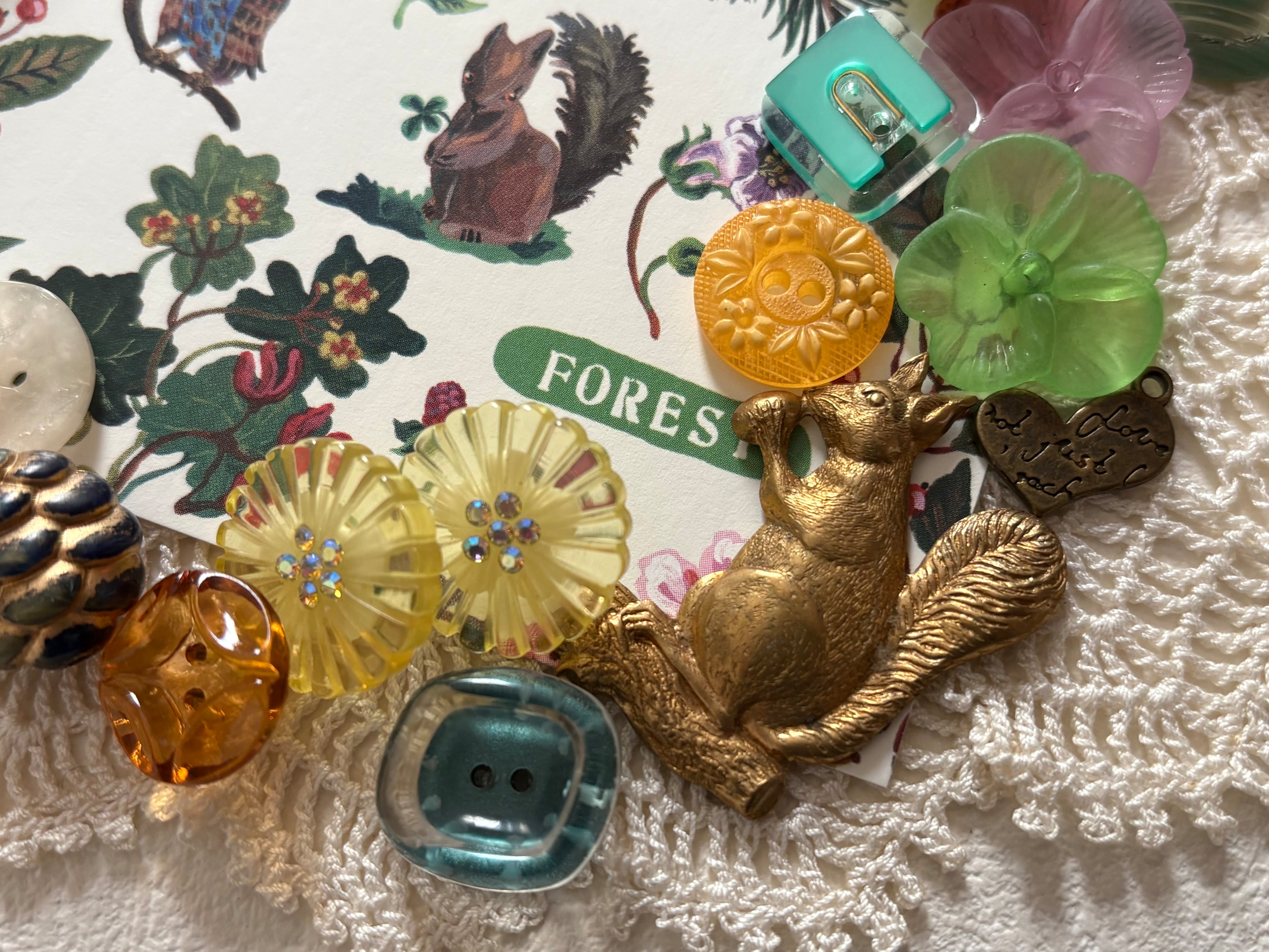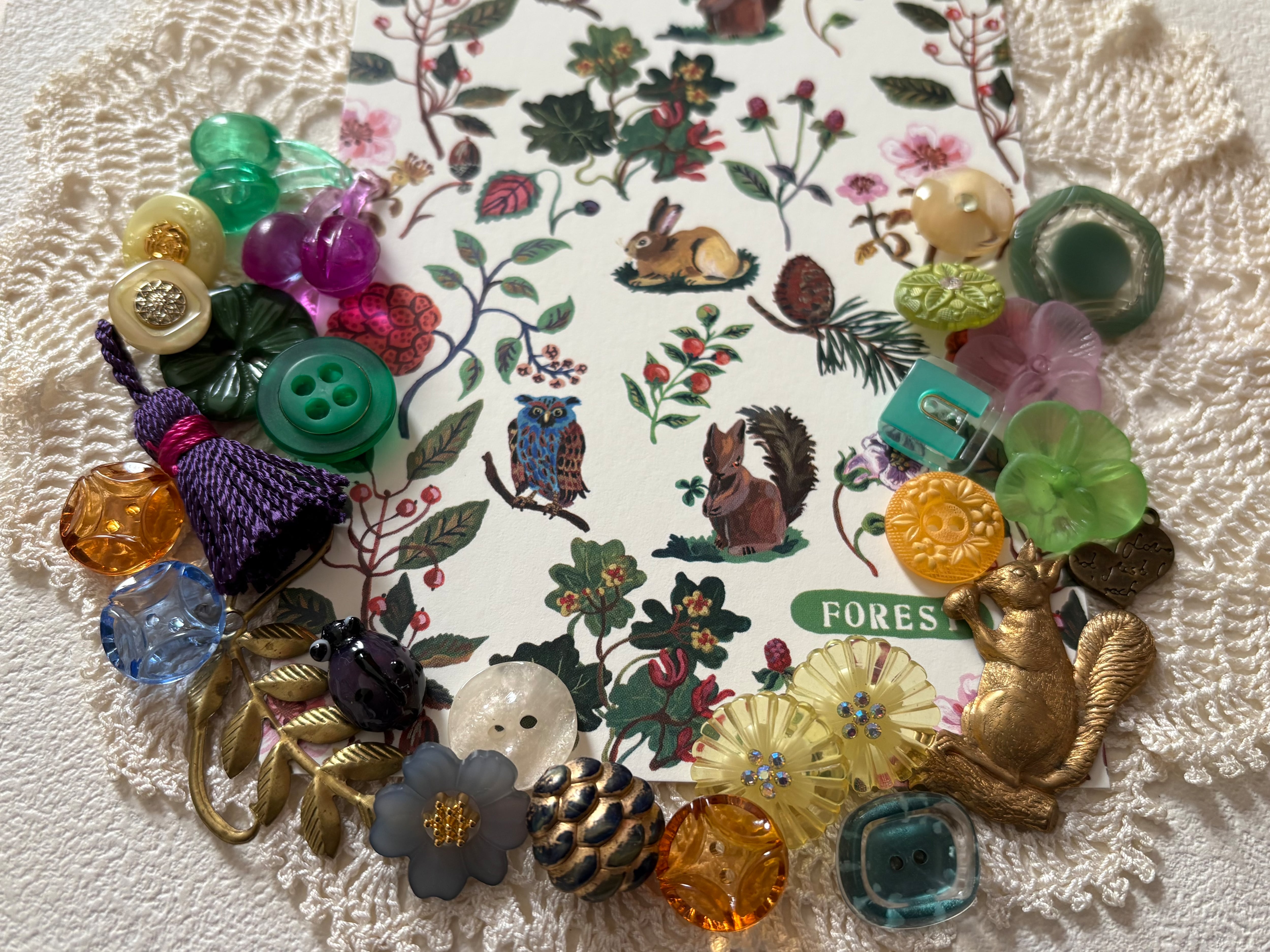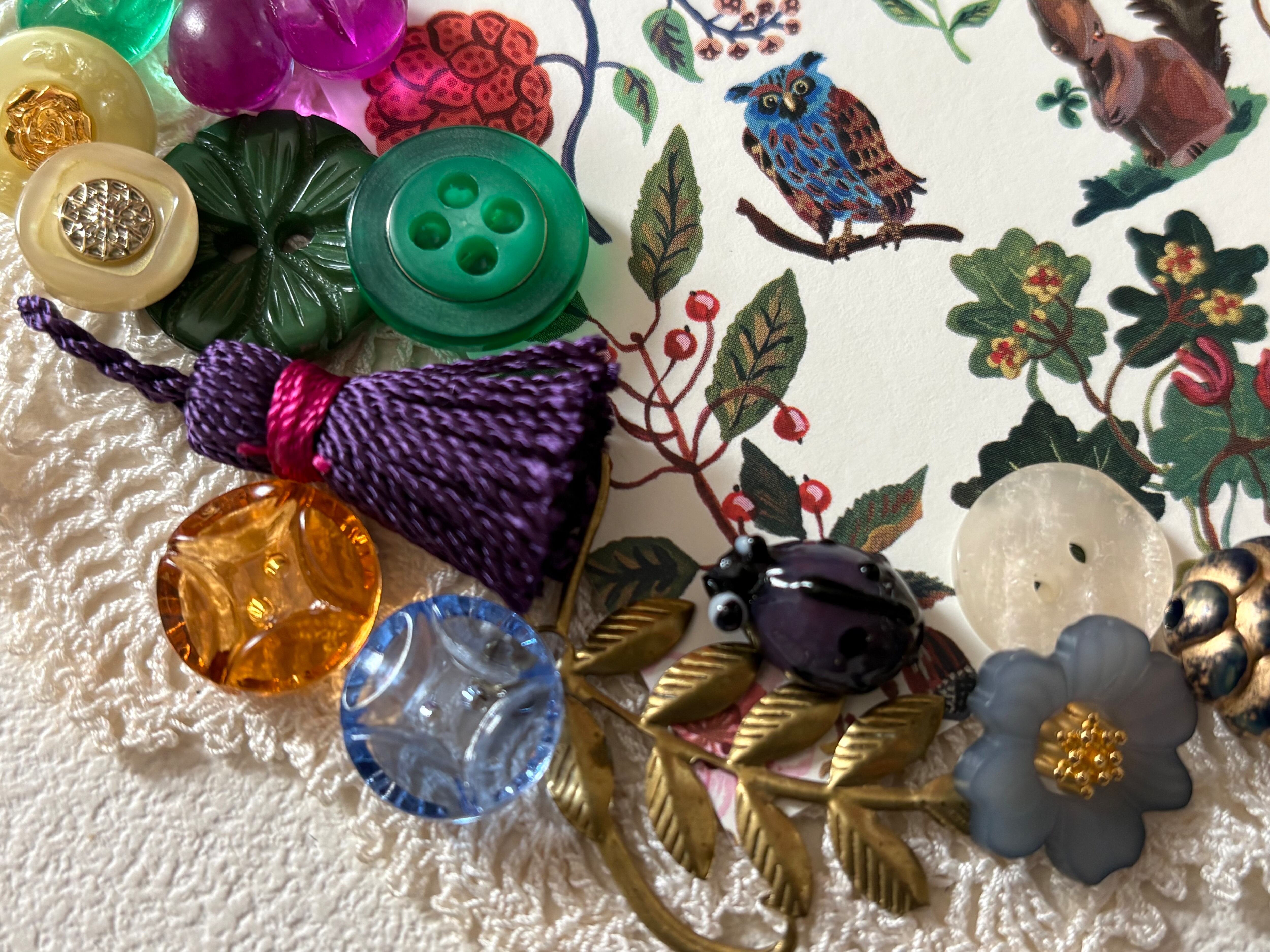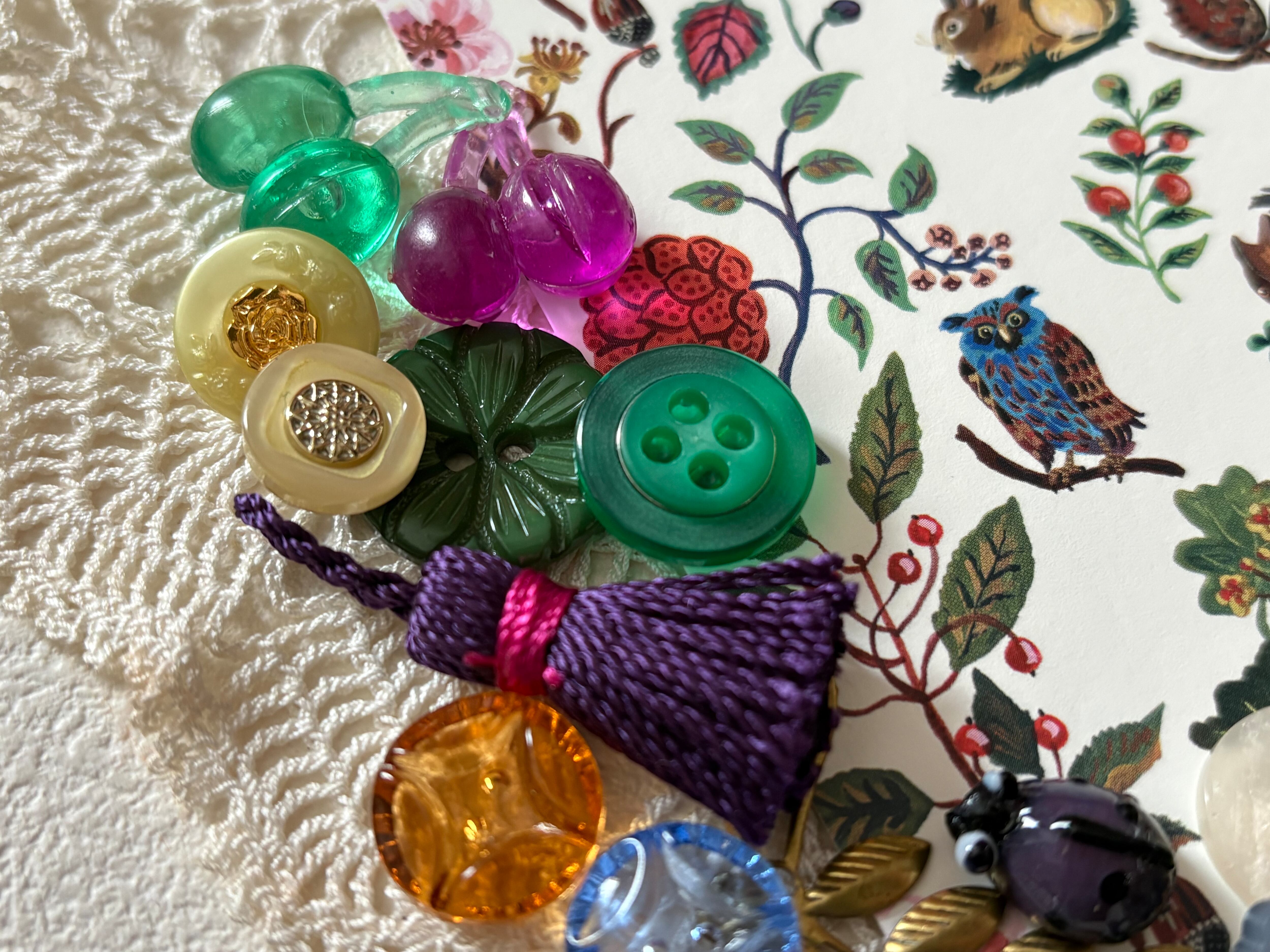 画像にございますレトロボタン、ヴィンテージパーツ、輸入デザインパーツ、輸入デザインボタン、タッセル、ナタリーレテのポストカードのセットになります。