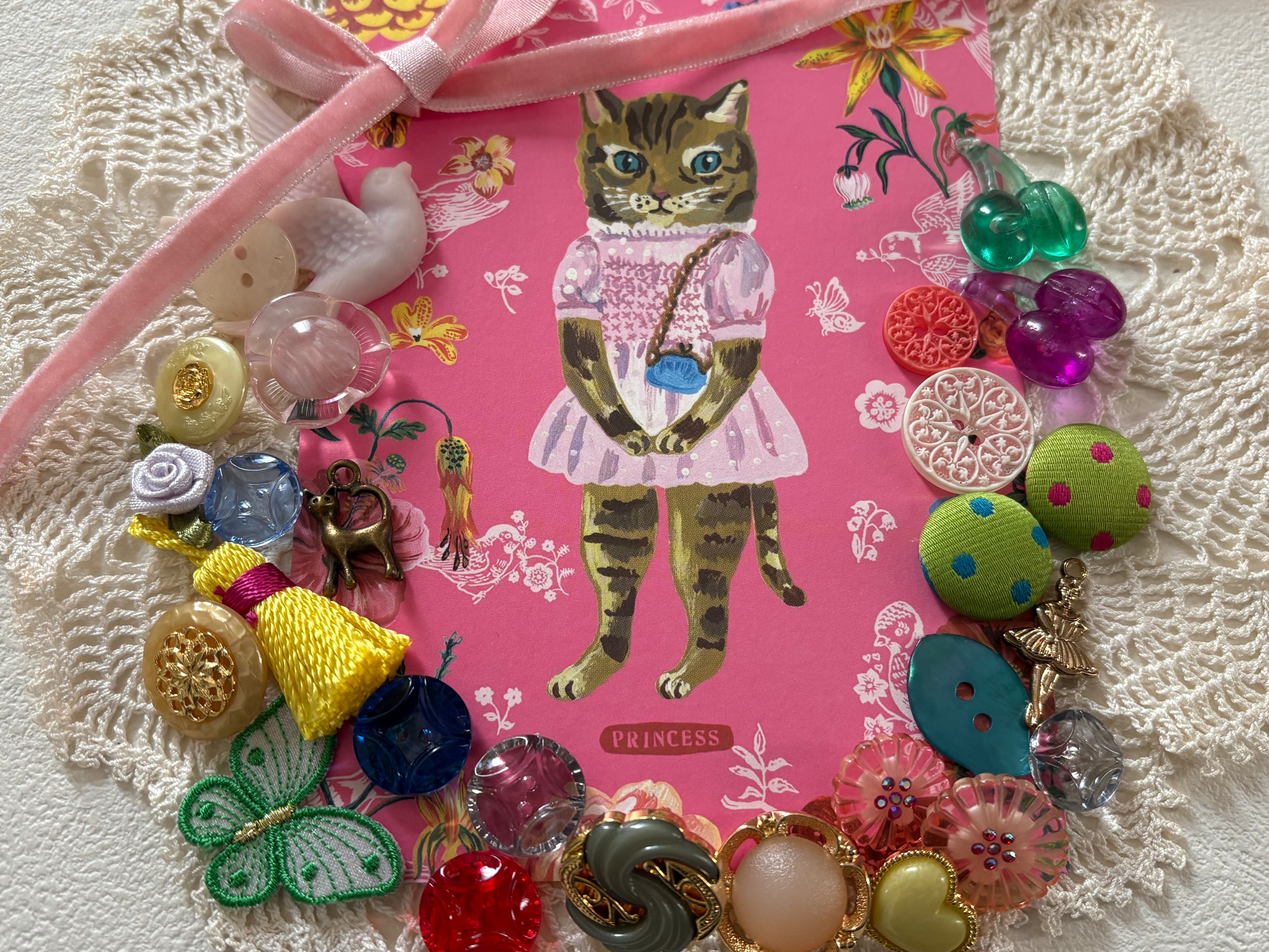 画像にございますヴィンテージボタン、レトロボタン、ヴィンテージパーツ、輸入デザインパーツ、輸入デザインボタン、タッセル、ナタリーレテのポストカードのセットになります。
