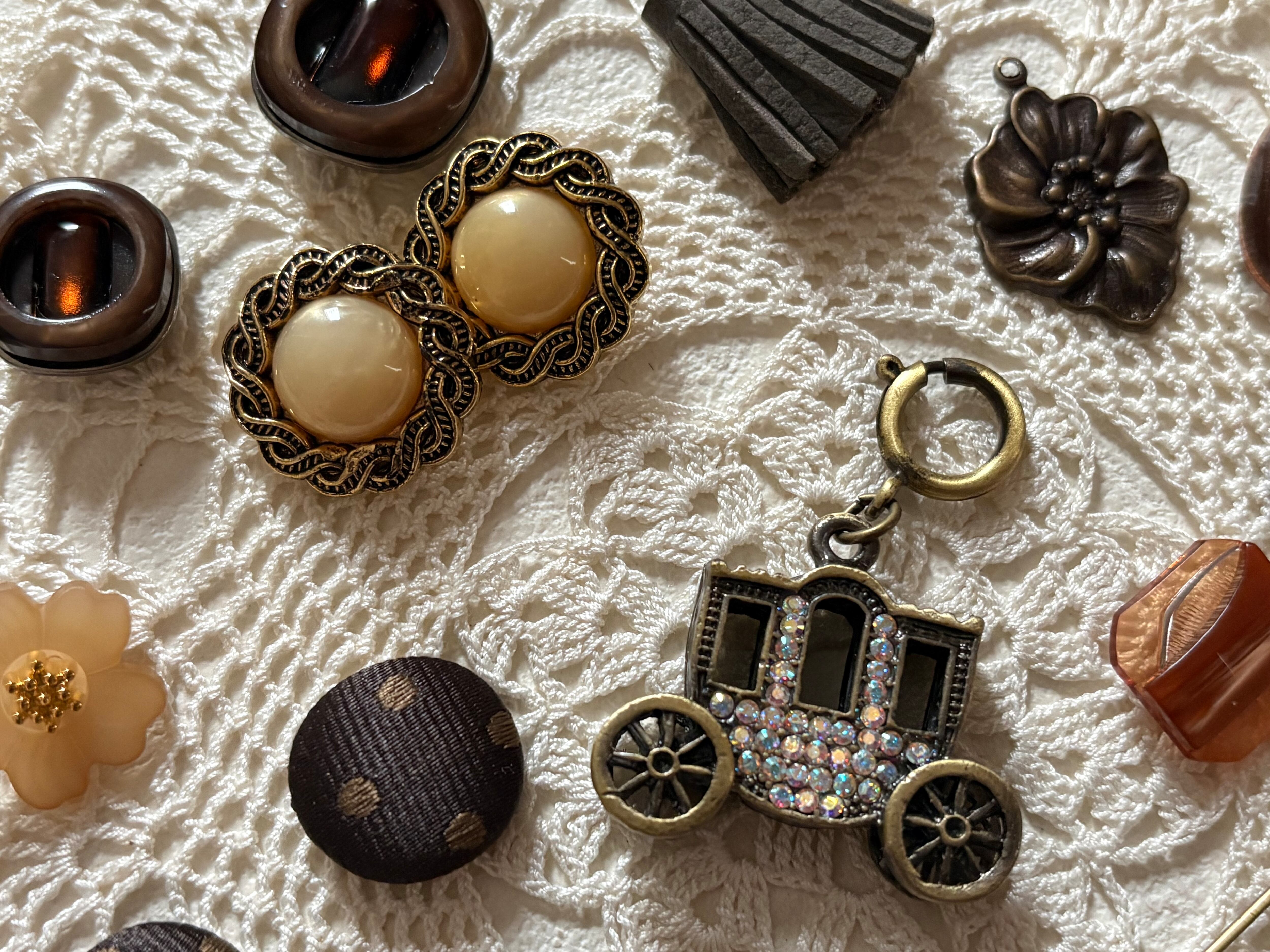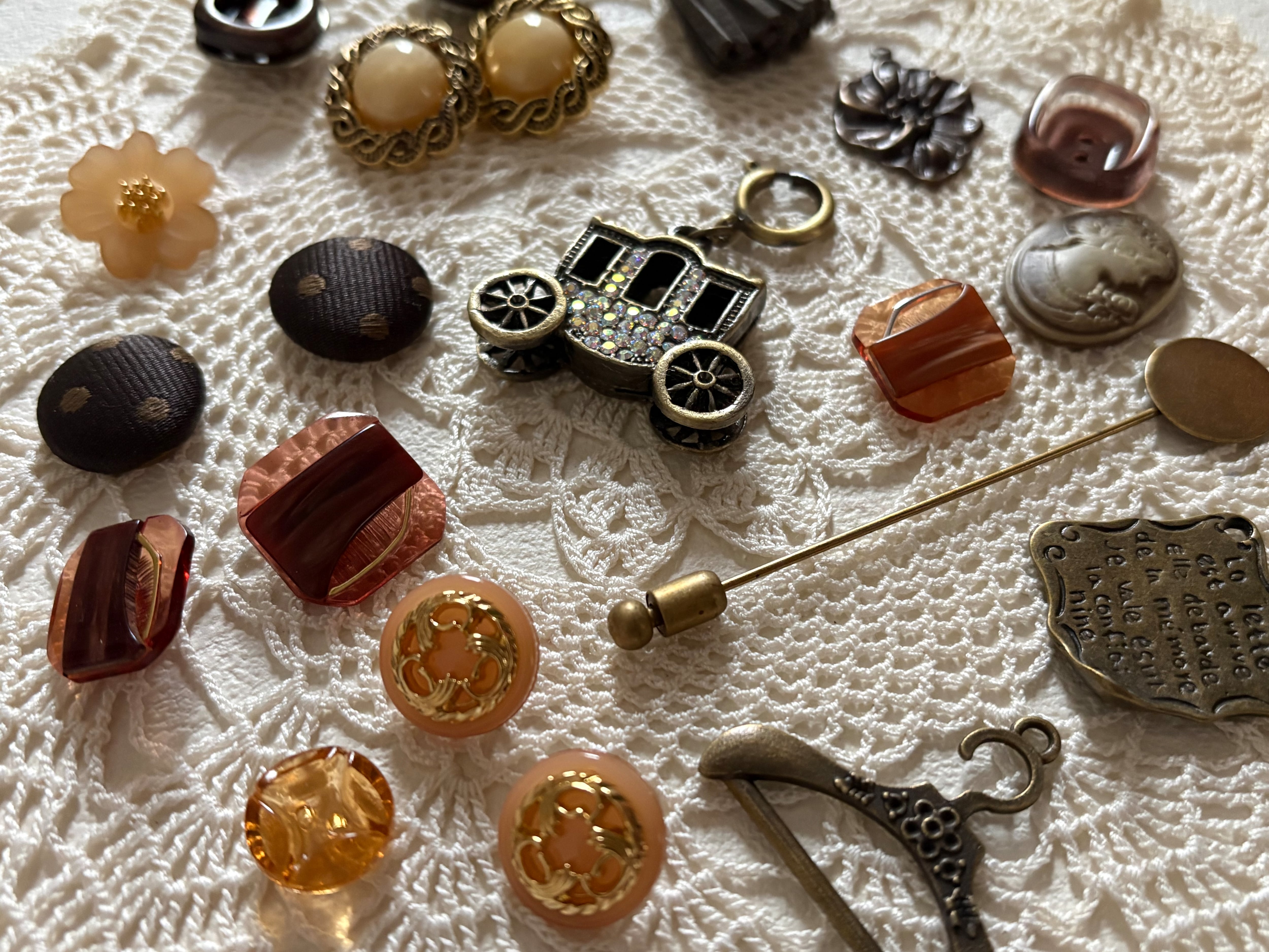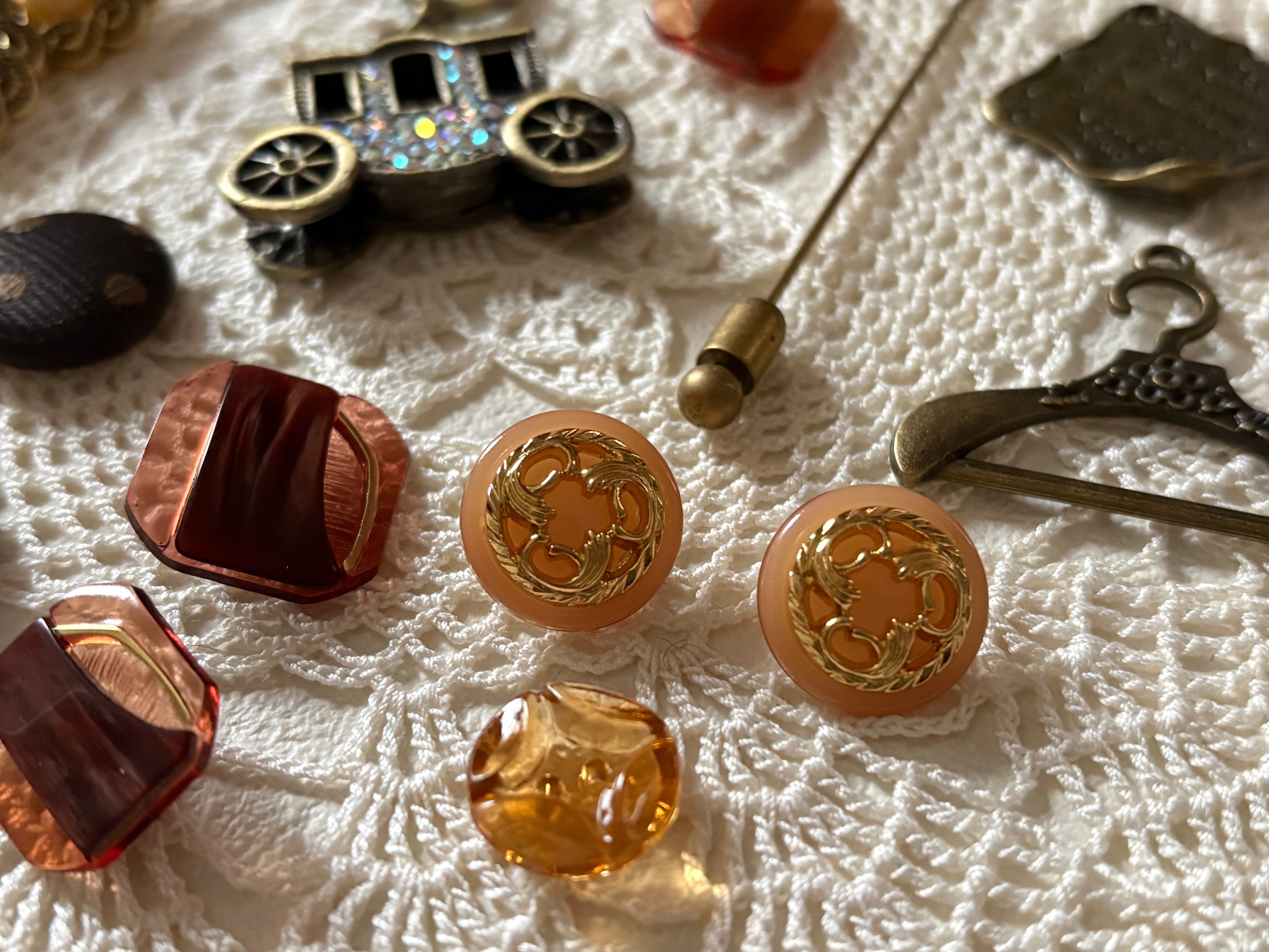 画像にございますレトロボタン、染めボタン、輸入デザインパーツ、カメオ、ナタリーレテのポストカードのセットになります。