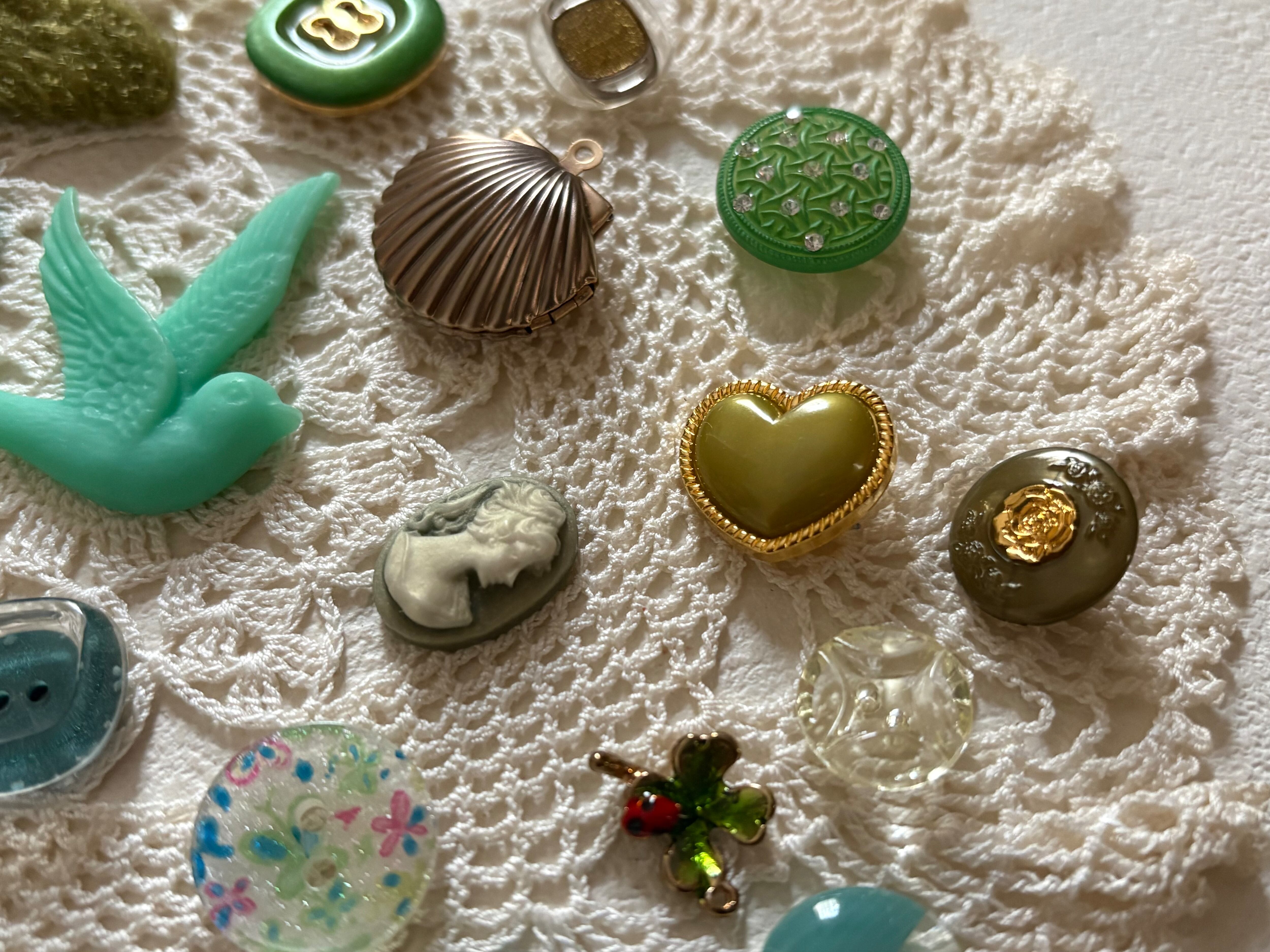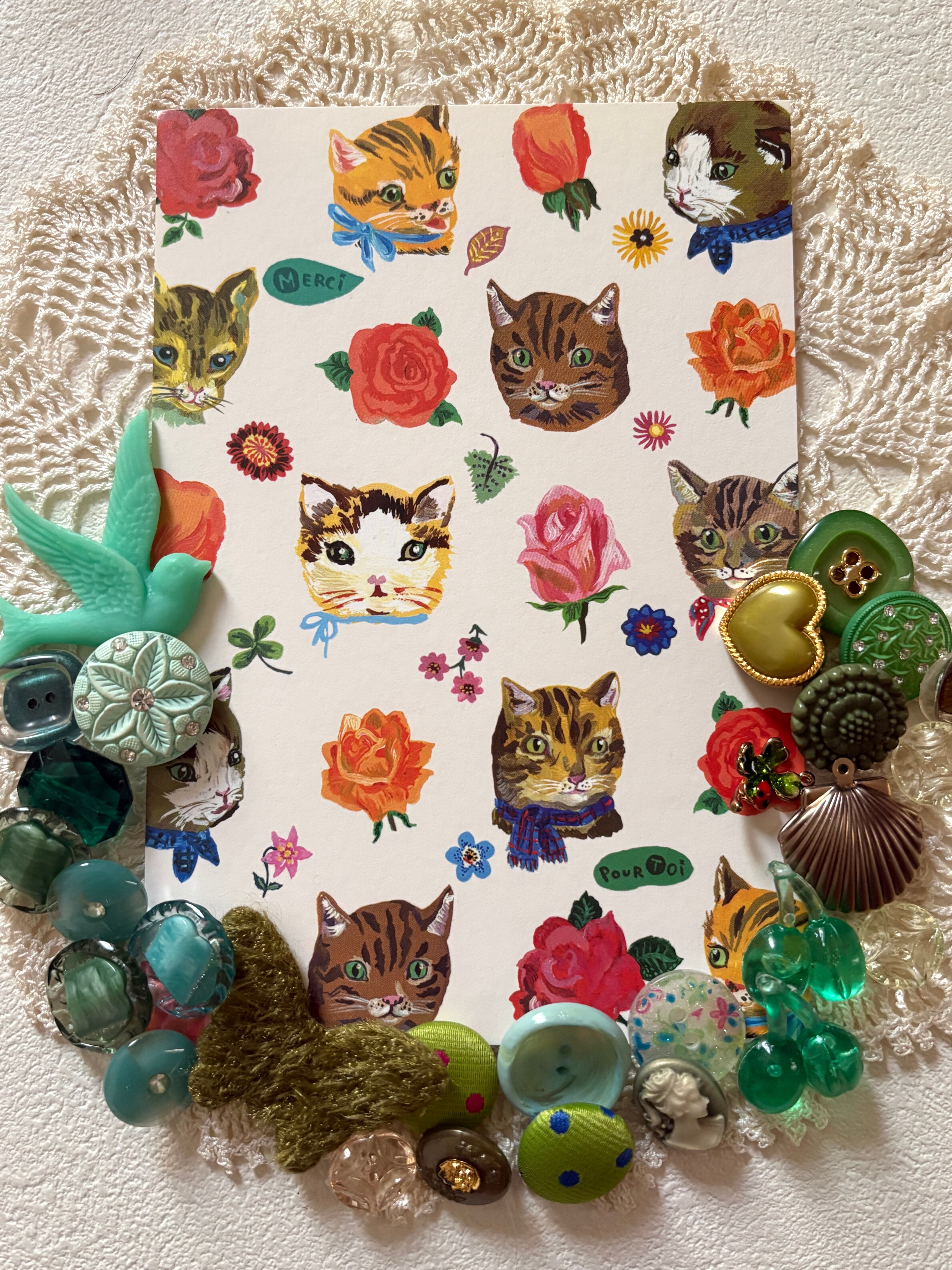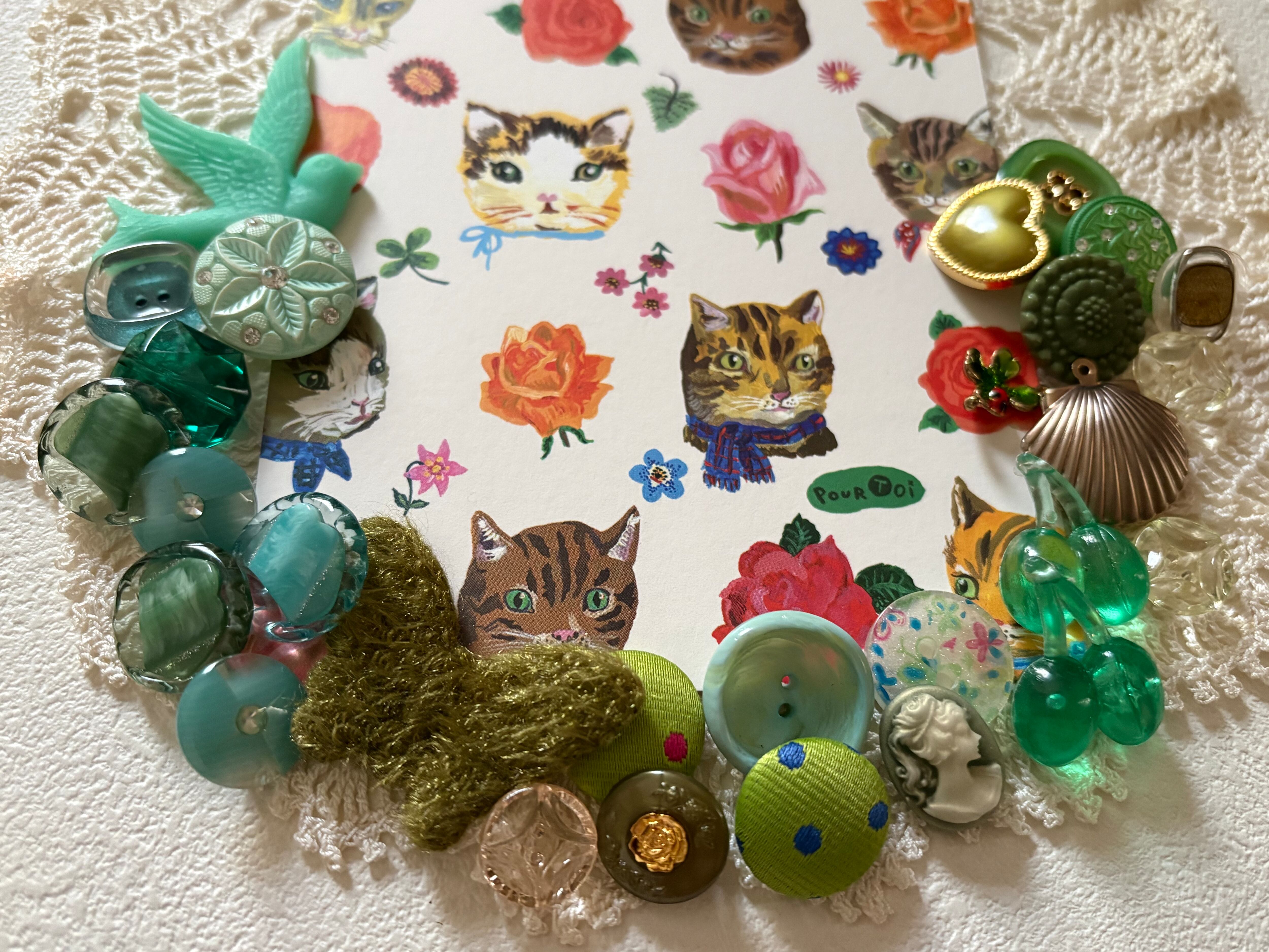 画像にございますレトロボタン、染めボタン、輸入デザインパーツ、輸入デザインボタン、カメオ、ナタリーレテのポストカードのセットになります。